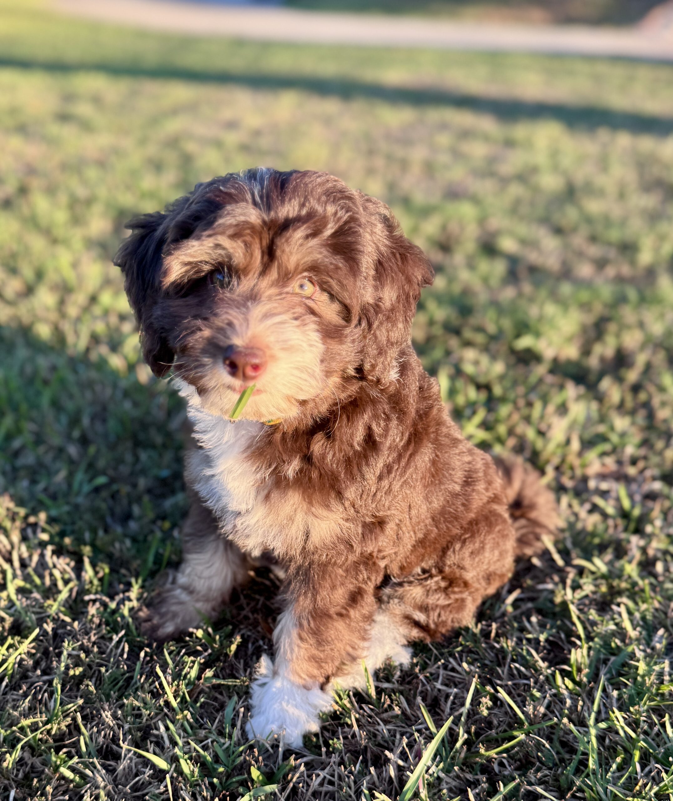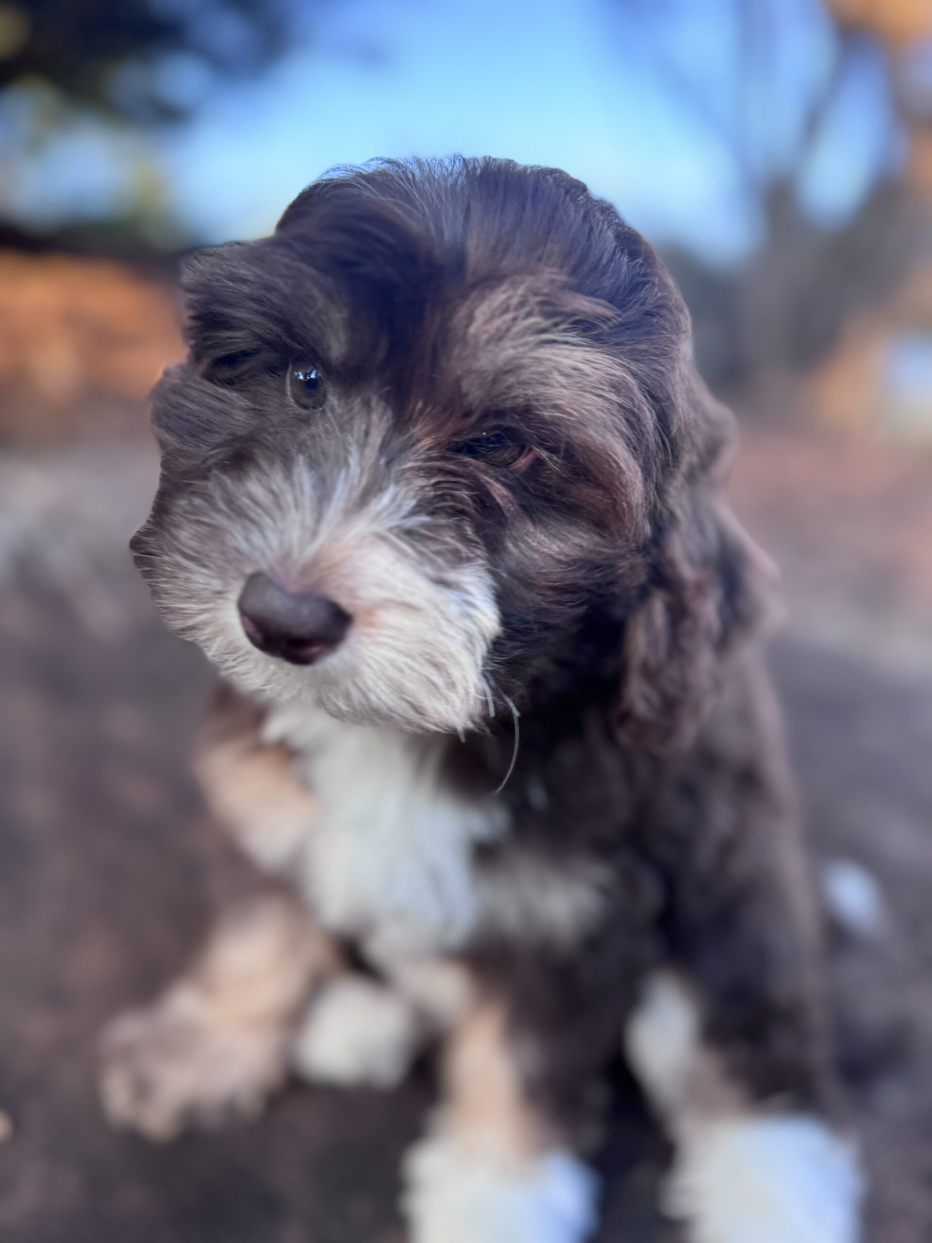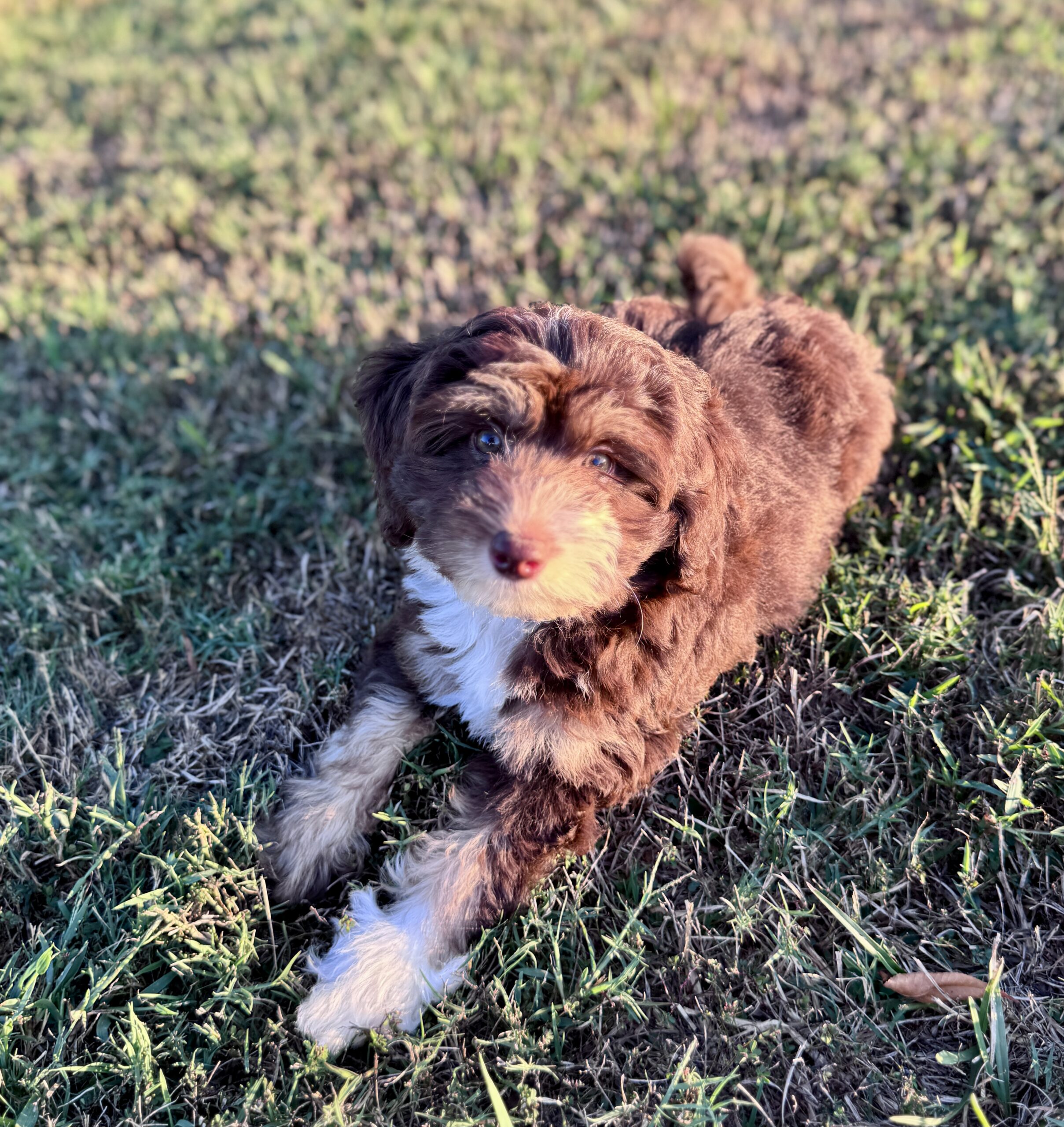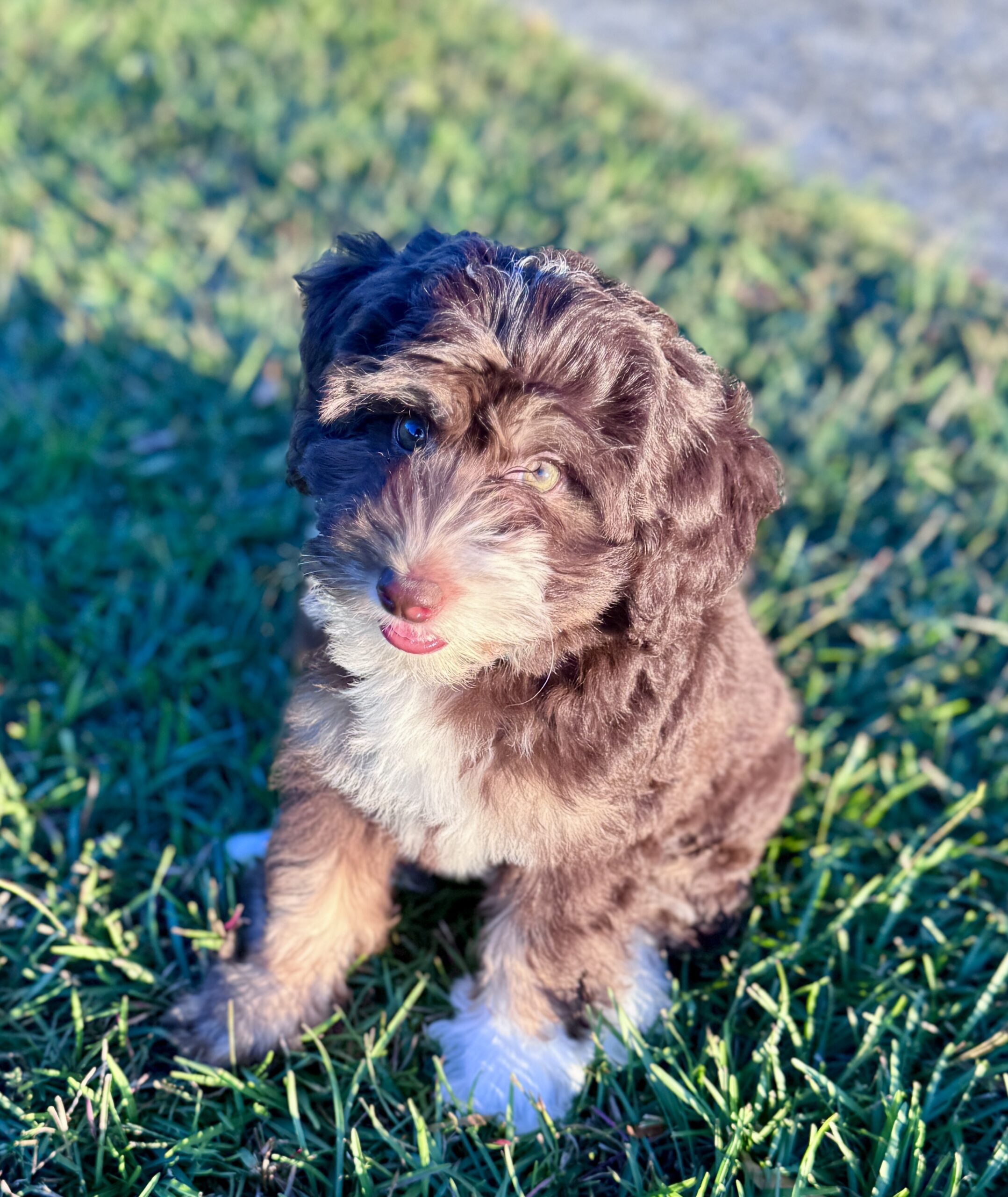 Aurora is that classic Bernese trim-color patter but the chocolate brown version! She is a small girl with lighter eyes and a wavy coat. This beautiful litter of mini bernedoodle puppies born August 3rd. Will be ready to go at the end of September early October. Both parents have two dominant furnishings which is the key ingredient to non shedding so we know all of these puppies will as well. Will mature ranging from 22 pounds to 35 pounds. We will have a better idea as they grow about which ones will be on the larger or smaller end of that range,