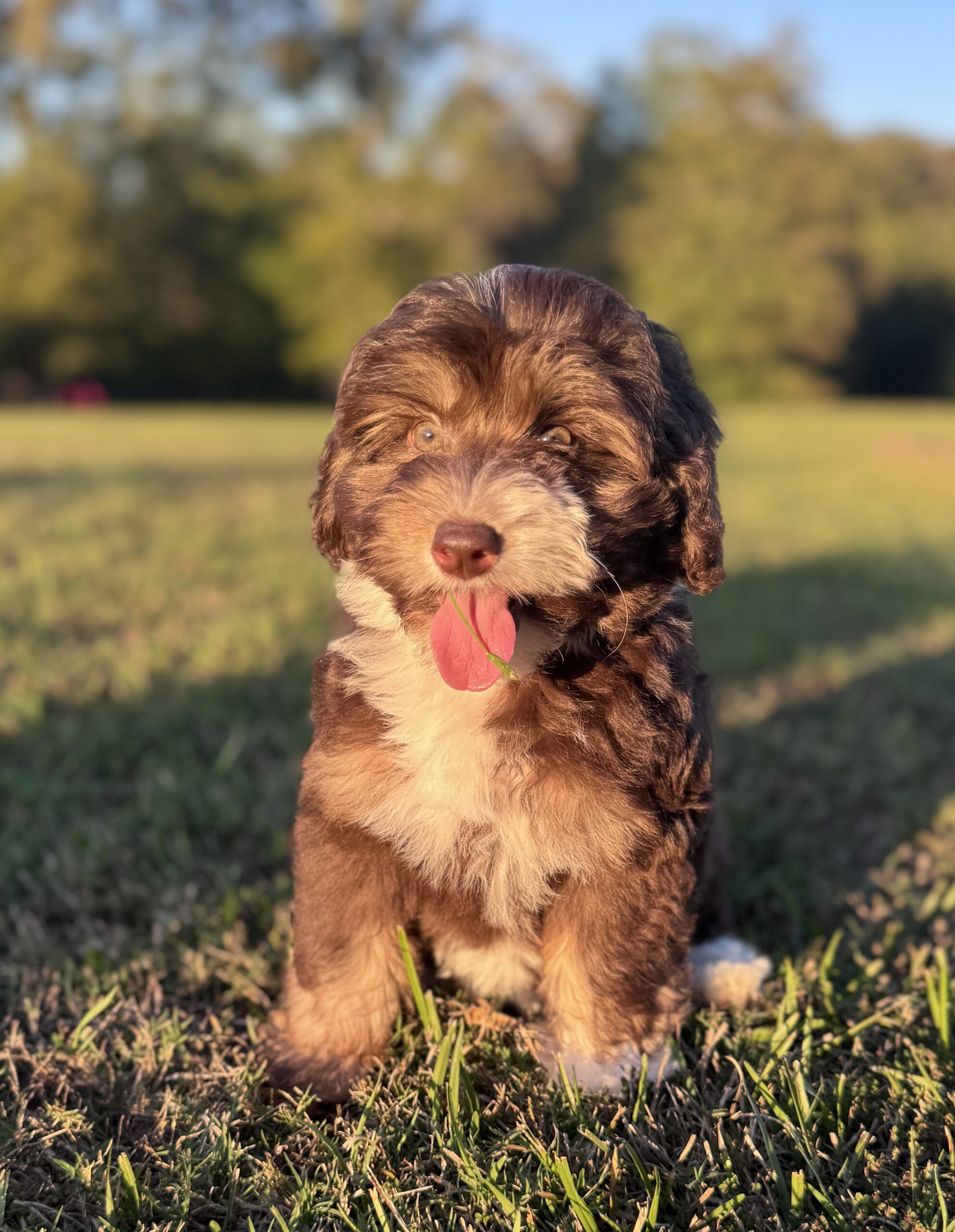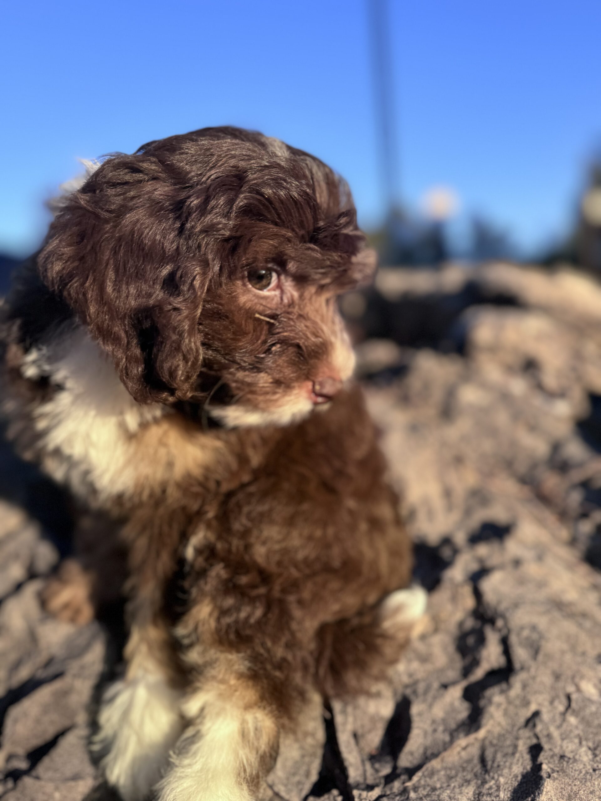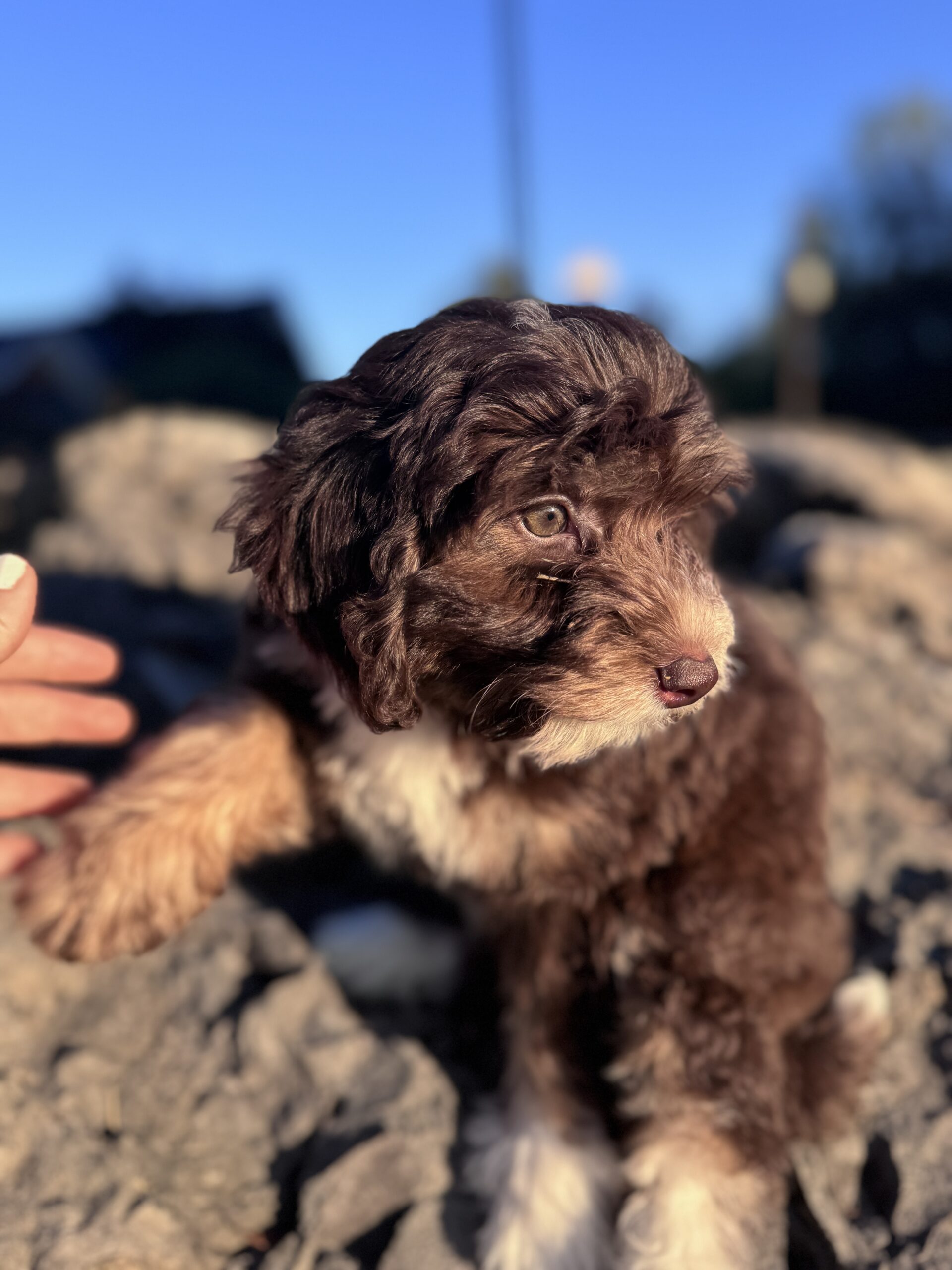 Aurora is that classic Bernese trim-color patter but the chocolate brown version! She is a small girl with lighter eyes and a wavy coat. This beautiful litter of mini bernedoodle puppies born August 3rd. Will be ready to go at the end of September early October. Both parents have two dominant furnishings which is the key ingredient to non shedding so we know all of these puppies will as well. Will mature ranging from 22 pounds to 35 pounds. We will have a better idea as they grow about which ones will be on the larger or smaller end of that range,