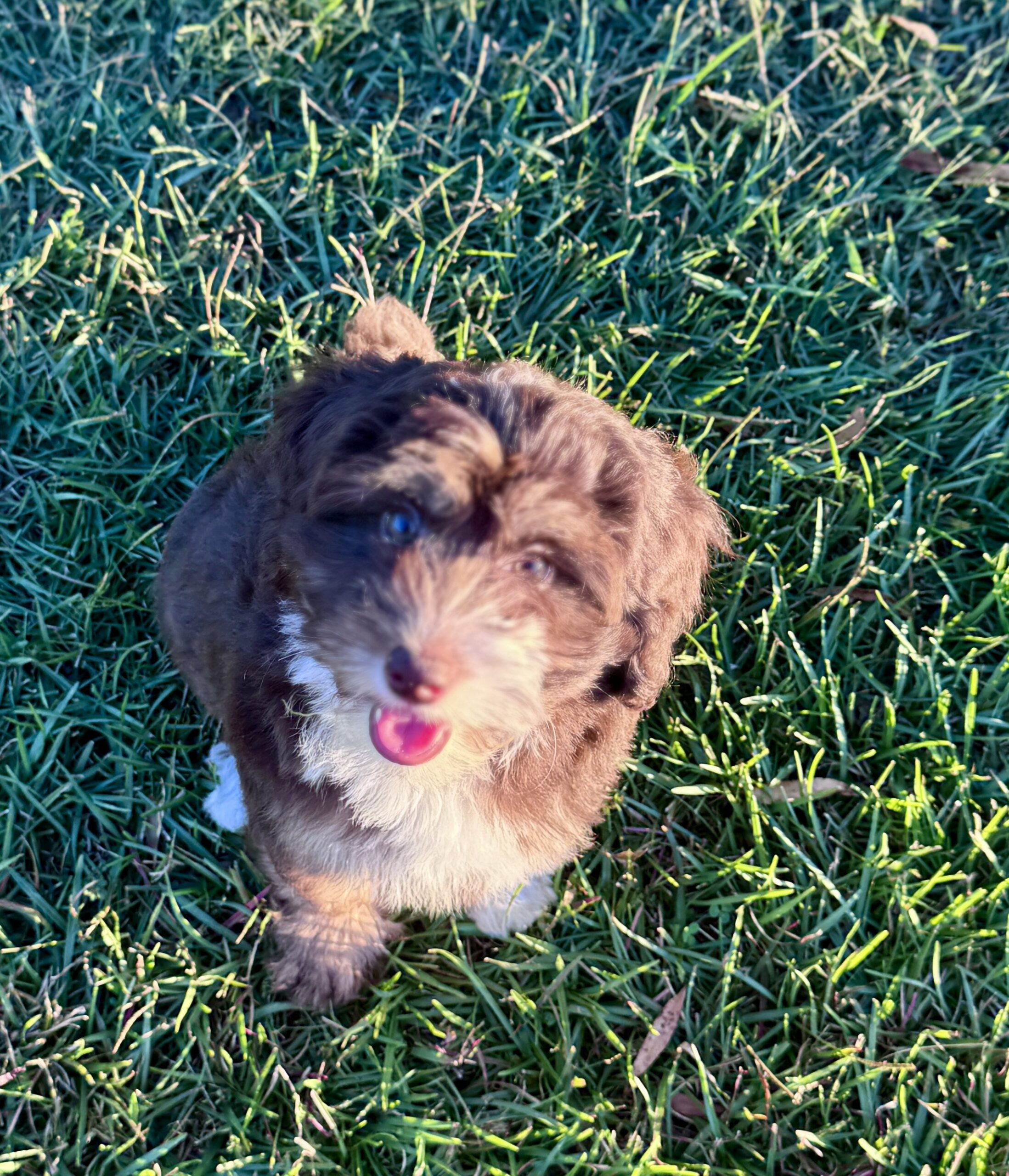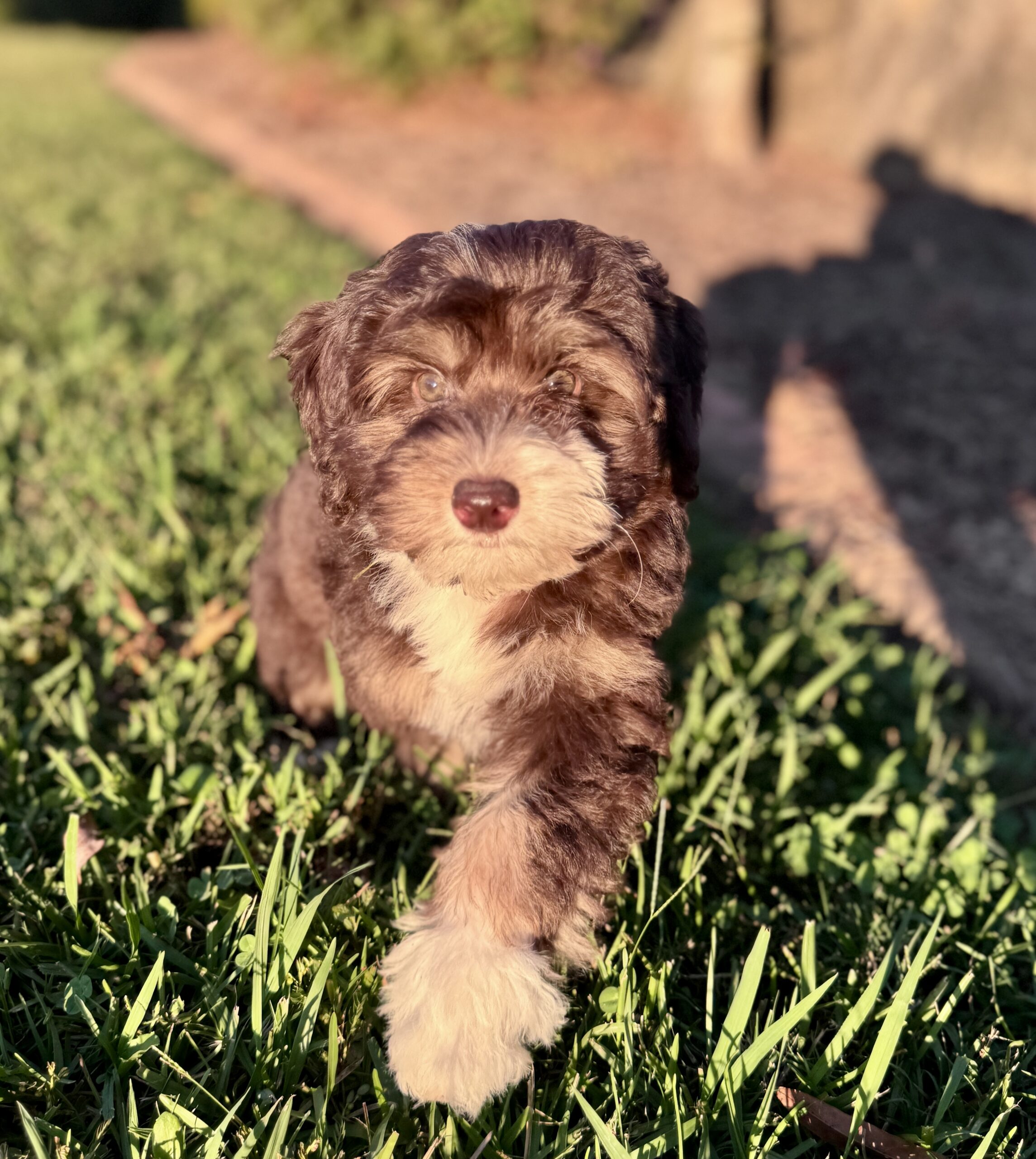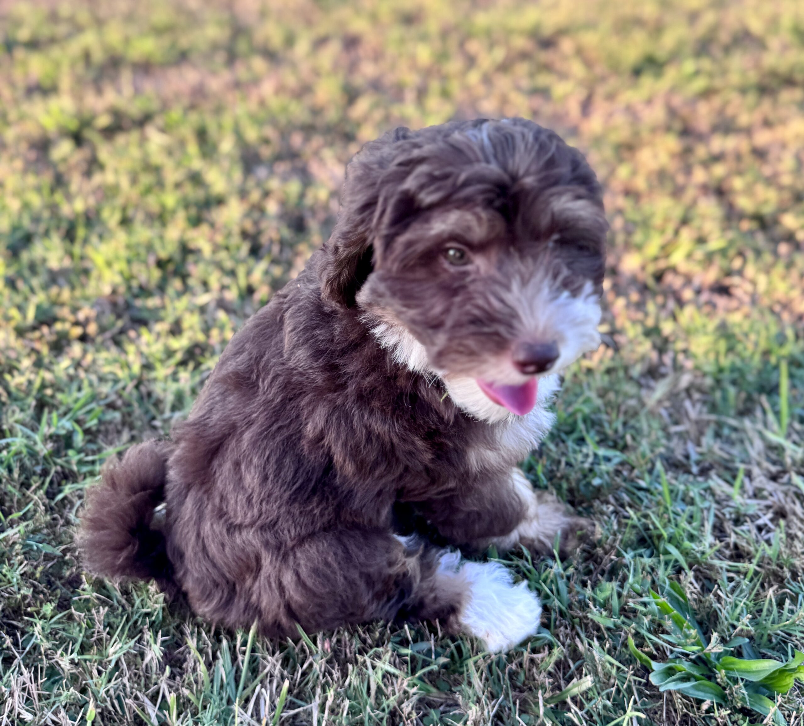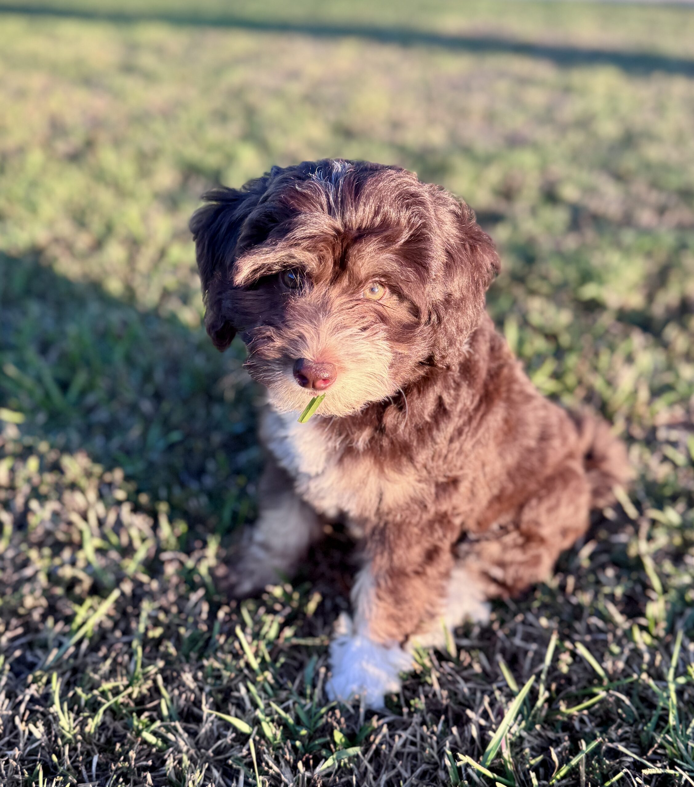 Aurora is that classic Bernese trim-color patter but the chocolate brown version! She is a small girl with lighter eyes and a wavy coat. This beautiful litter of mini bernedoodle puppies born August 3rd. Will be ready to go at the end of September early October. Both parents have two dominant furnishings which is the key ingredient to non shedding so we know all of these puppies will as well. Will mature ranging from 22 pounds to 35 pounds. We will have a better idea as they grow about which ones will be on the larger or smaller end of that range,