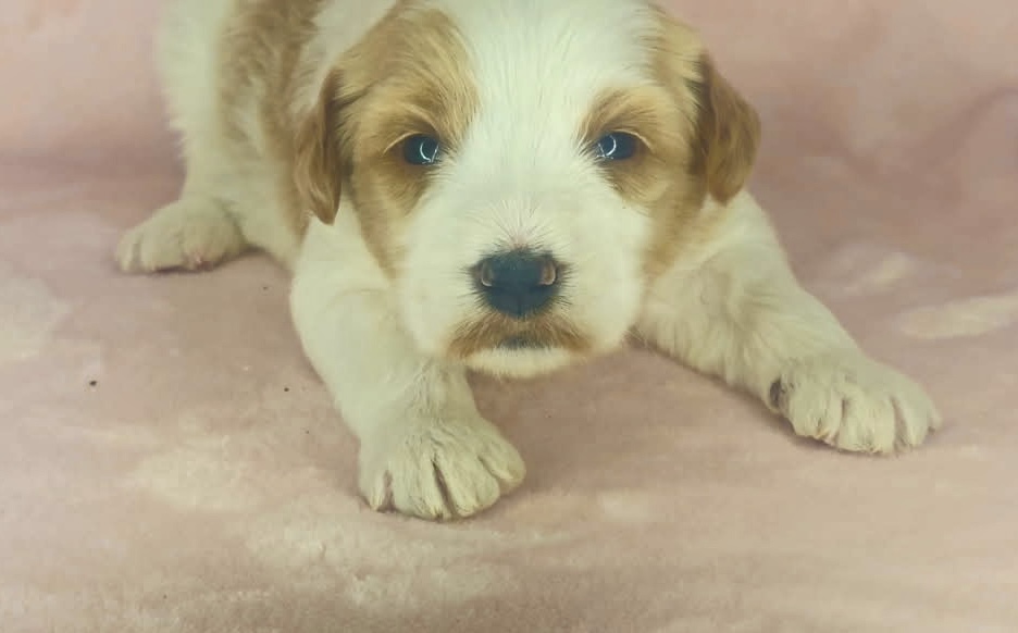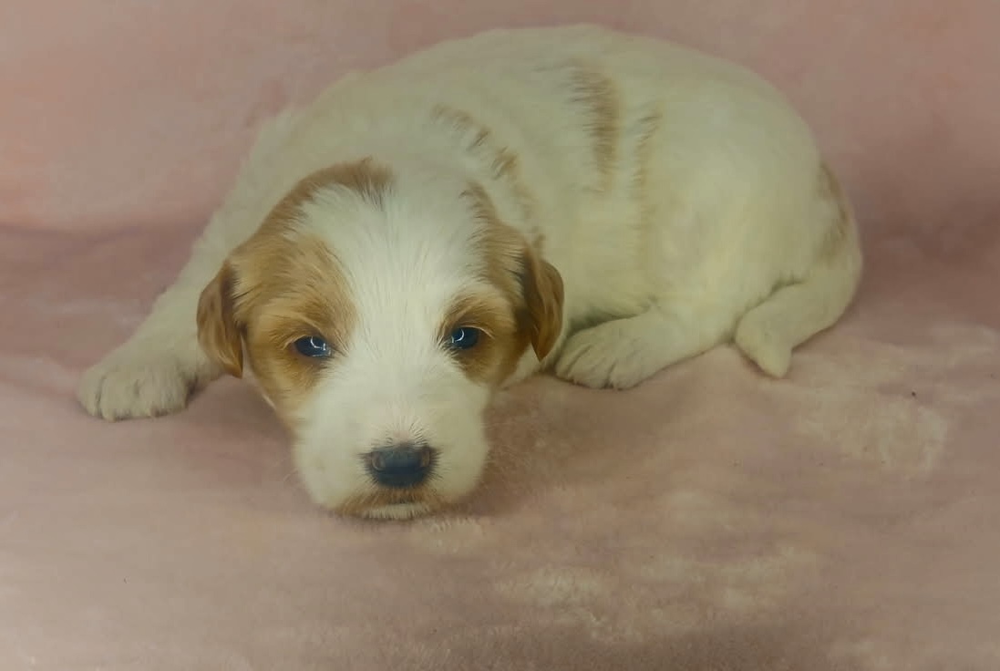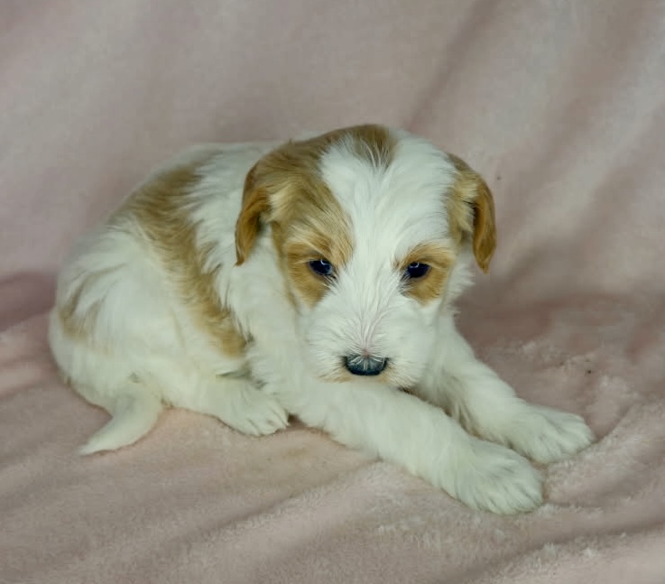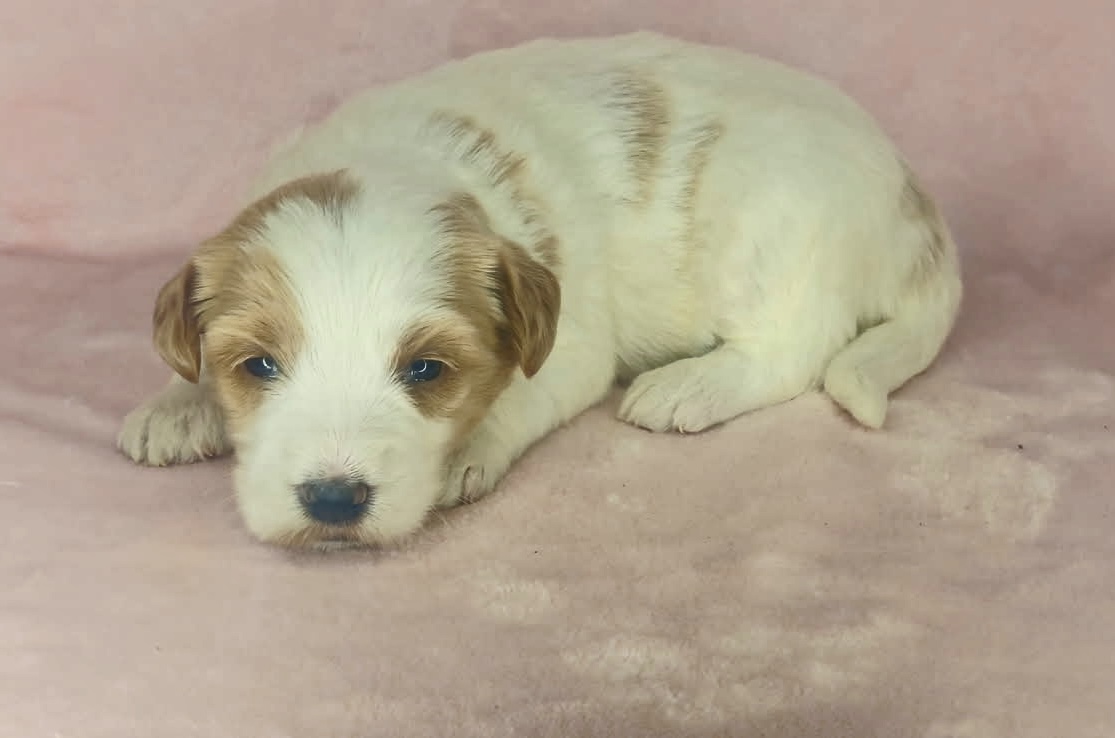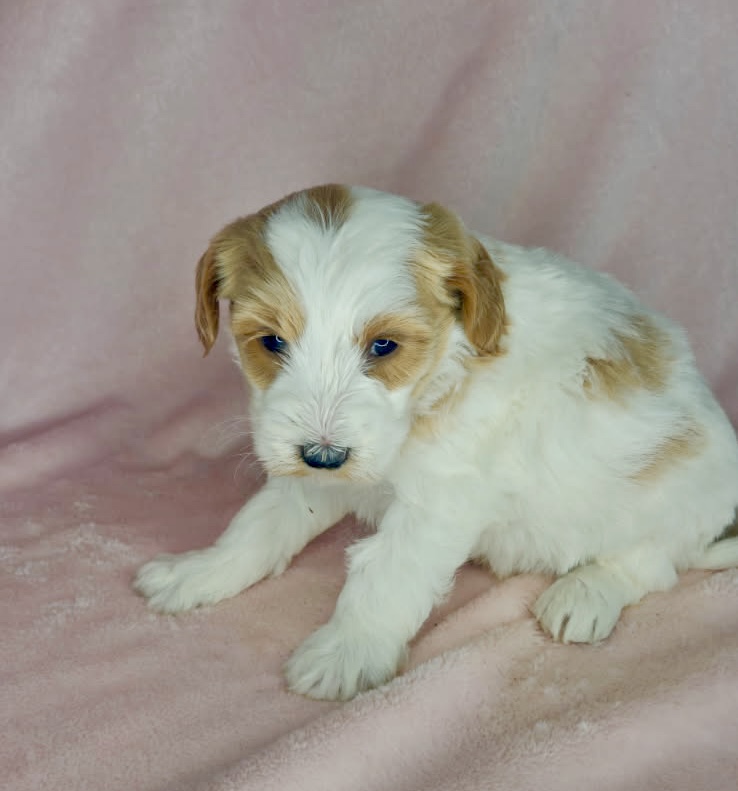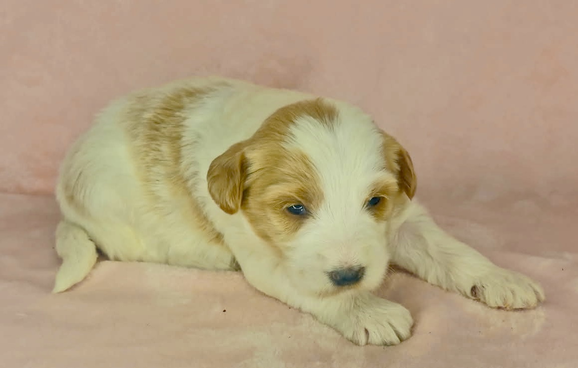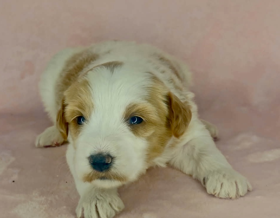 Binos is a parti color mini goldendoodle. Parti means she is white with in her case apricot or golden spots. She looks to have a wavy coat and will mature around 25 pounds. As an F2b that means her mom is an f1 generation and her dad is F1b or higher. That will give her a higher percentage of golden retriever, which equals great dog! She will still be low shedding. This litter was born December 17th and will be 8 weeks old February 11th.