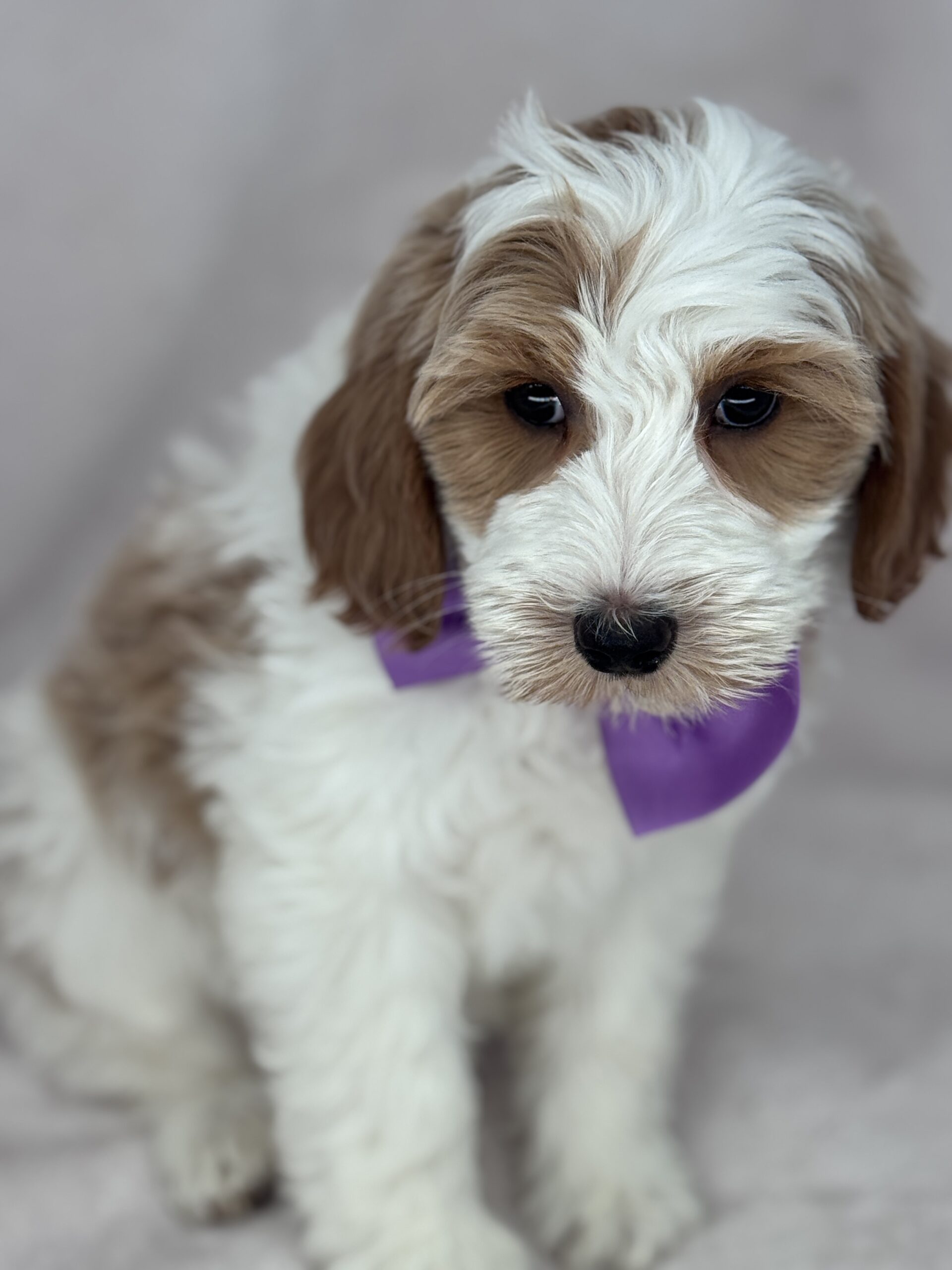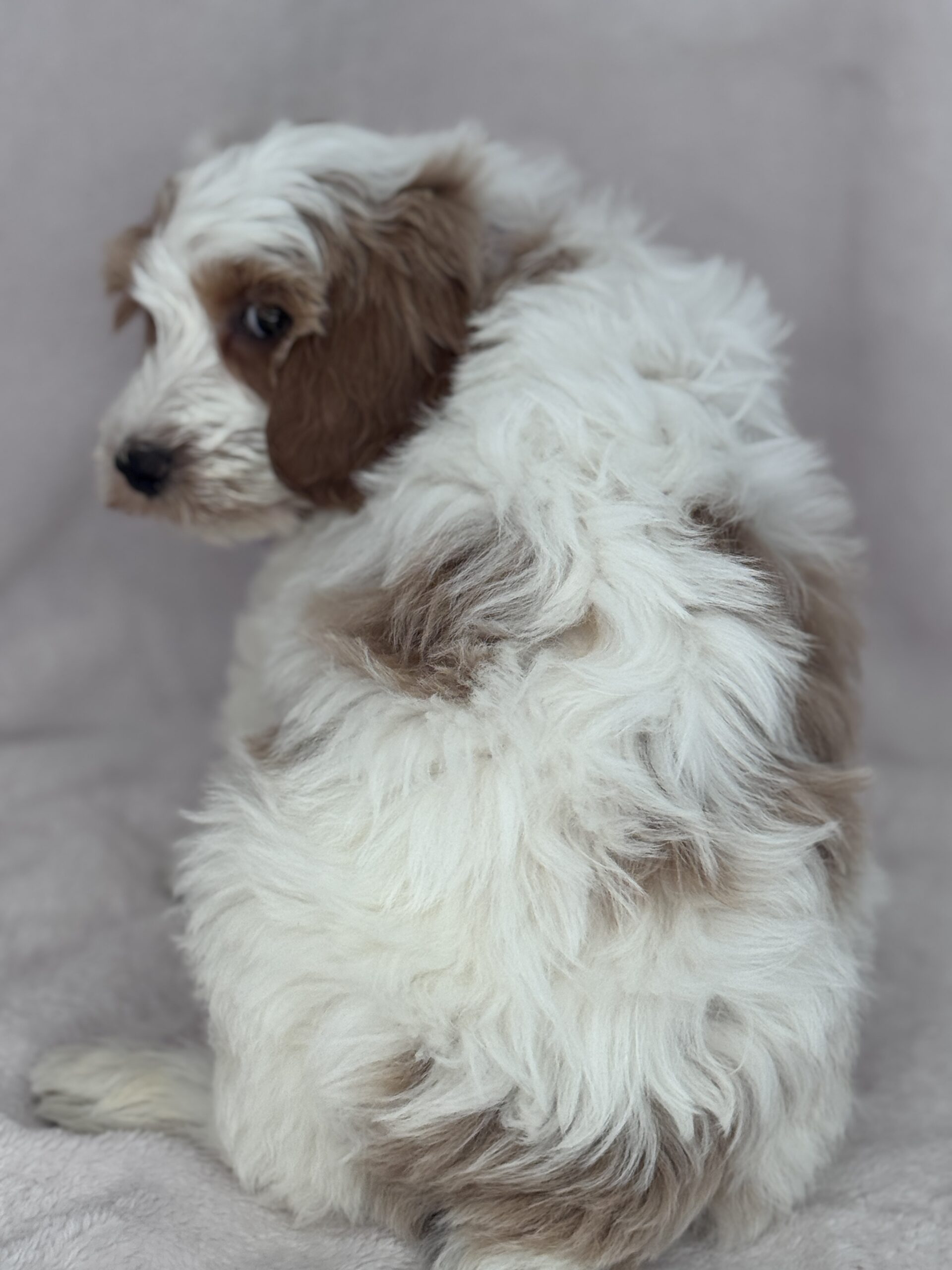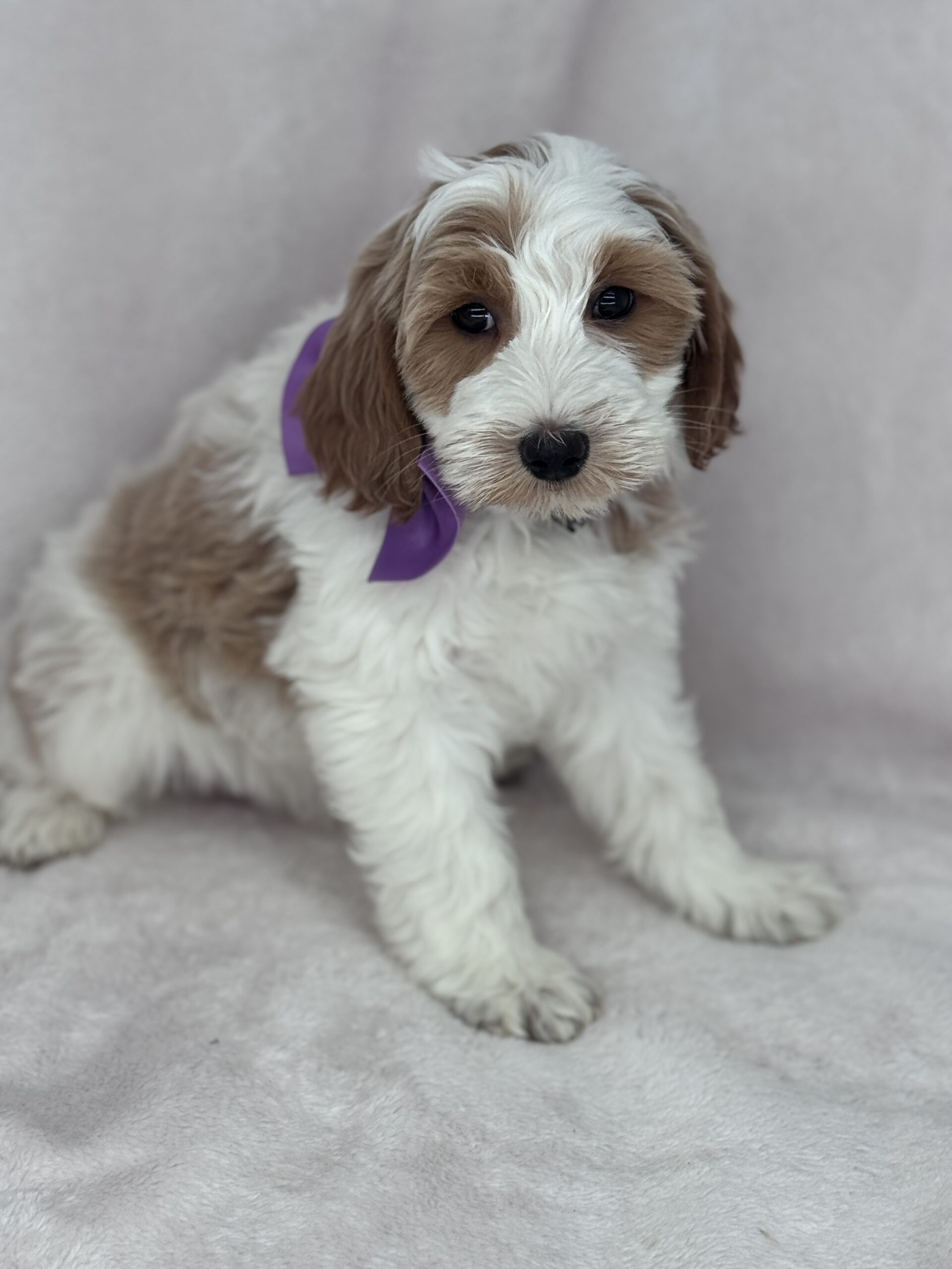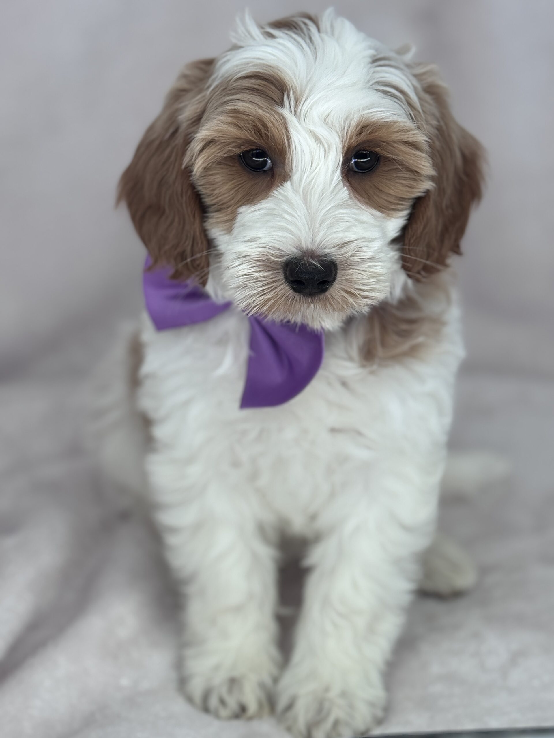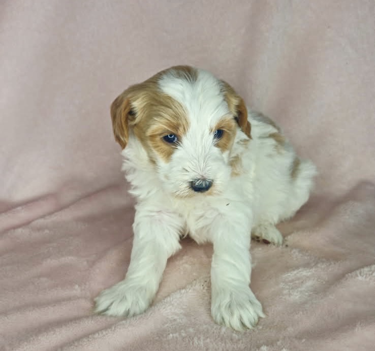 Binos is a parti color mini goldendoodle. Parti means she is white with in her case apricot or golden spots. She looks to have a wavy coat and will mature around 25 pounds. As an F2b that means her mom is an f1 generation and her dad is F1b or higher. That will give her a higher percentage of golden retriever, which equals great dog! She will still be low shedding. This litter was born December 17th and will be 8 weeks old February 11th.