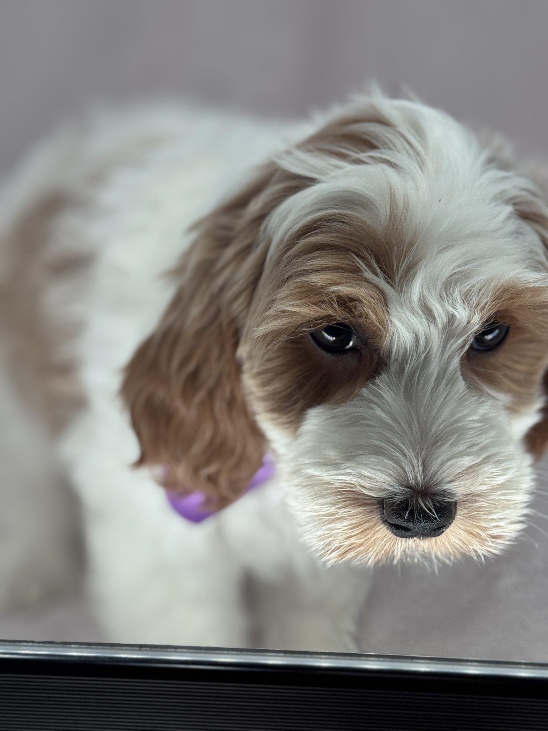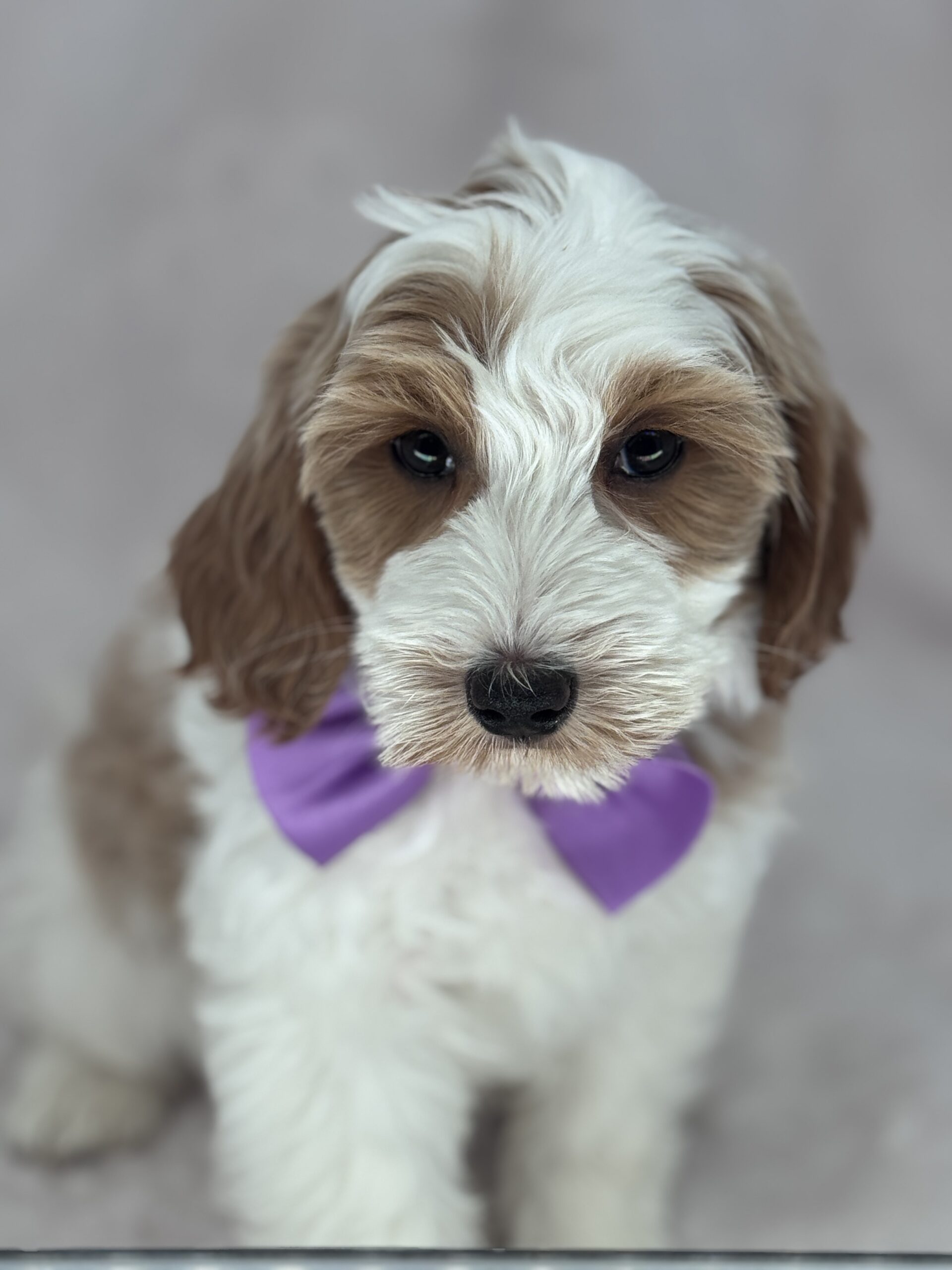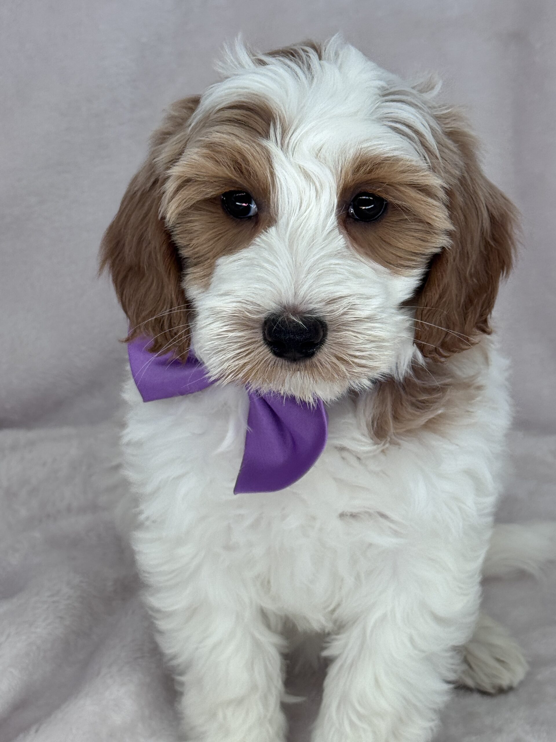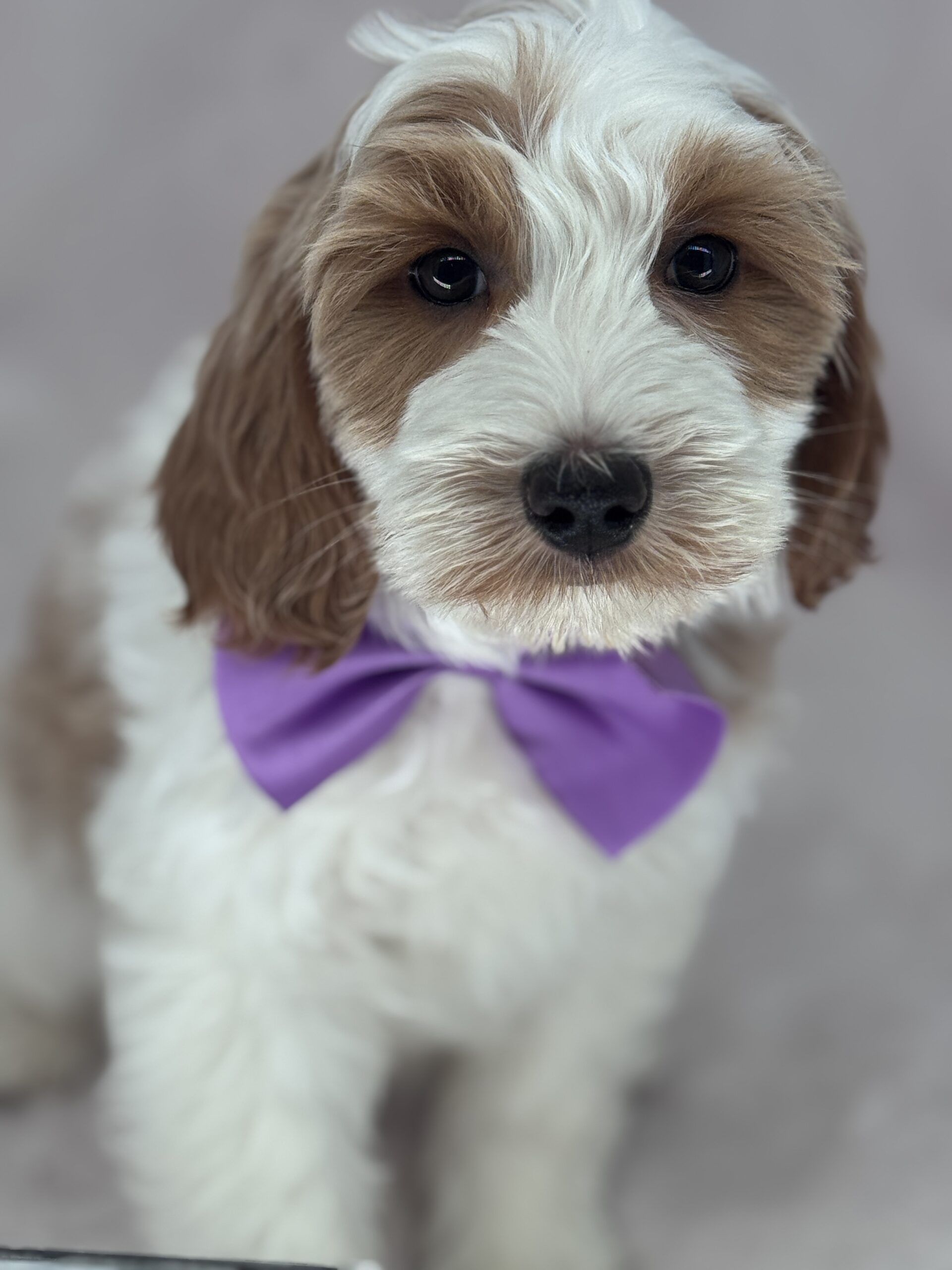 Binos is a parti color mini goldendoodle. Parti means she is white with in her case apricot or golden spots. She looks to have a wavy coat and will mature around 25 pounds. As an F2b that means her mom is an f1 generation and her dad is F1b or higher. That will give her a higher percentage of golden retriever, which equals great dog! She will still be low shedding. This litter was born December 17th and will be 8 weeks old February 11th.