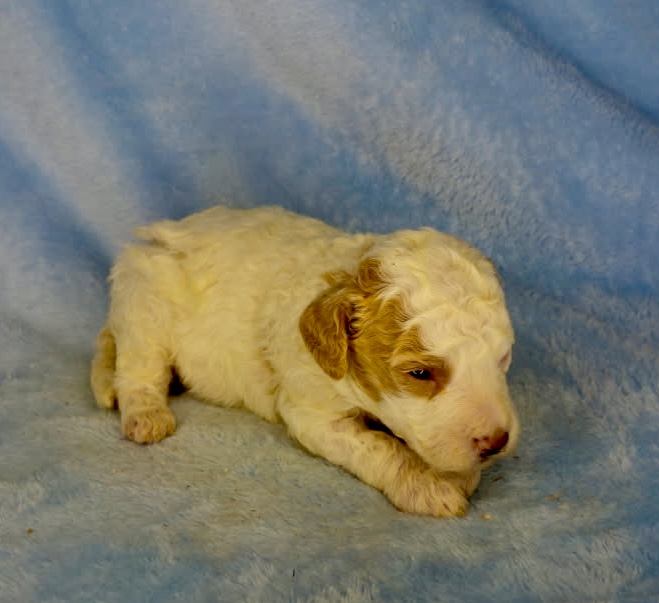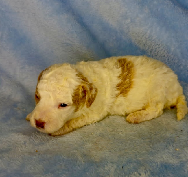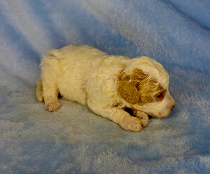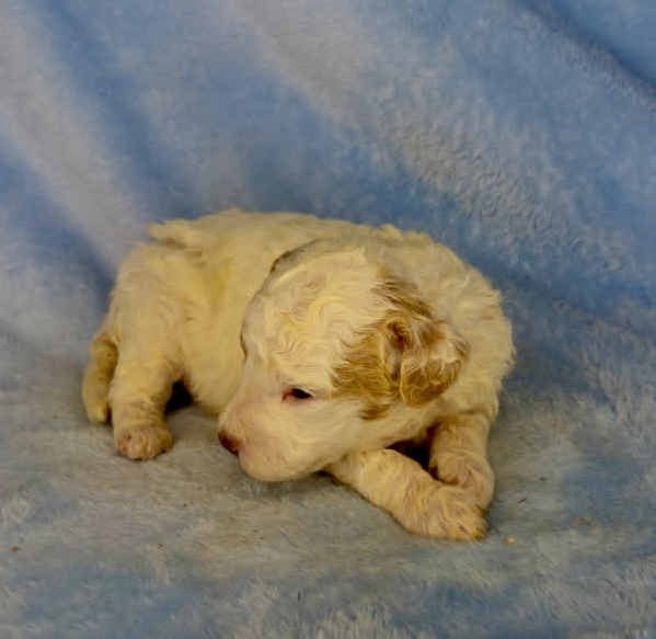 Blanks is from our Mahjong Litter.  He is a bright red parti.  He has red spots.  He has a curly coat.  Both parents are sweet tempered calm dogs and all of these puppies are good choices for allergy suffers.  They were born December 5th and ready to go early February.
