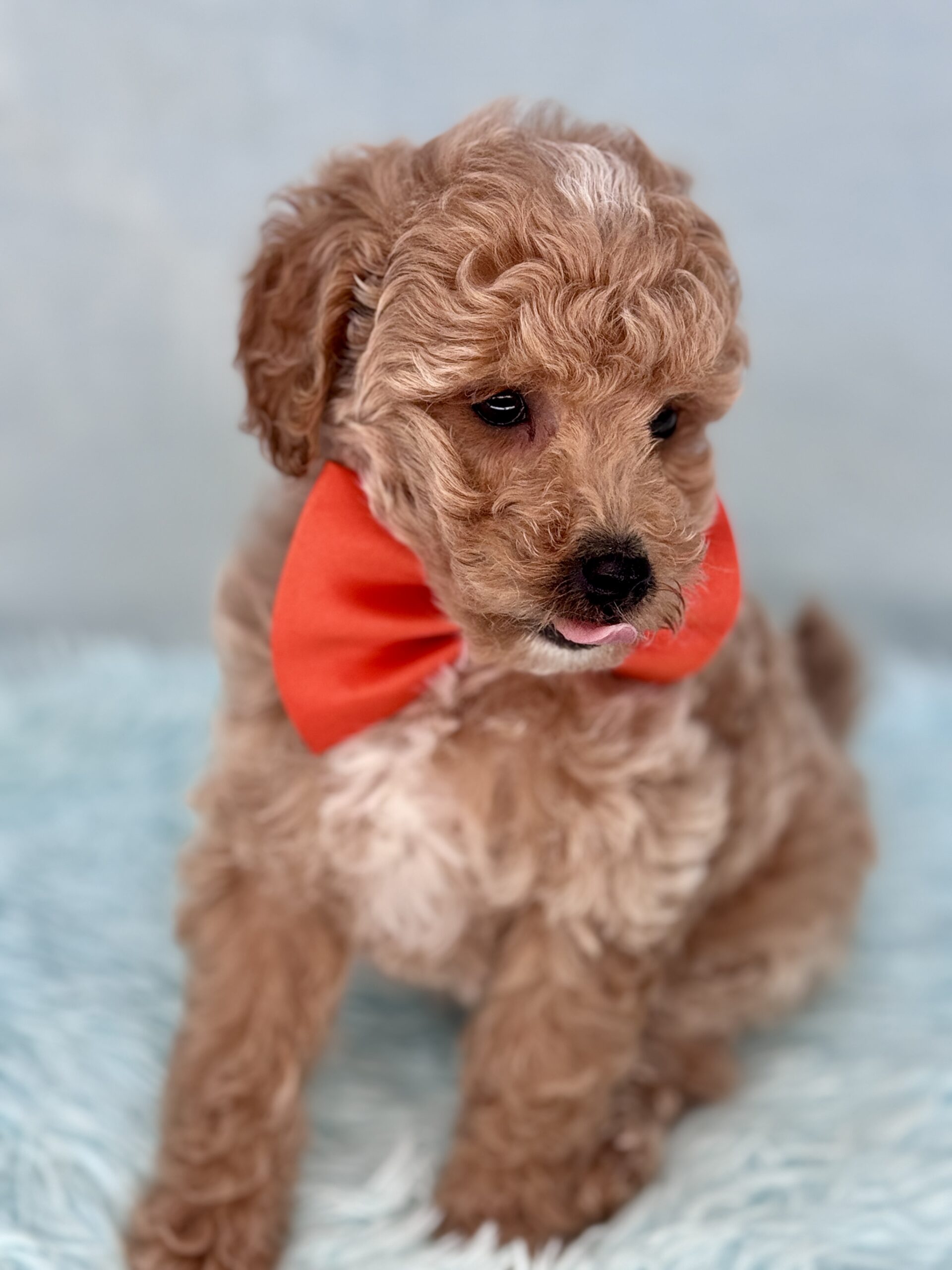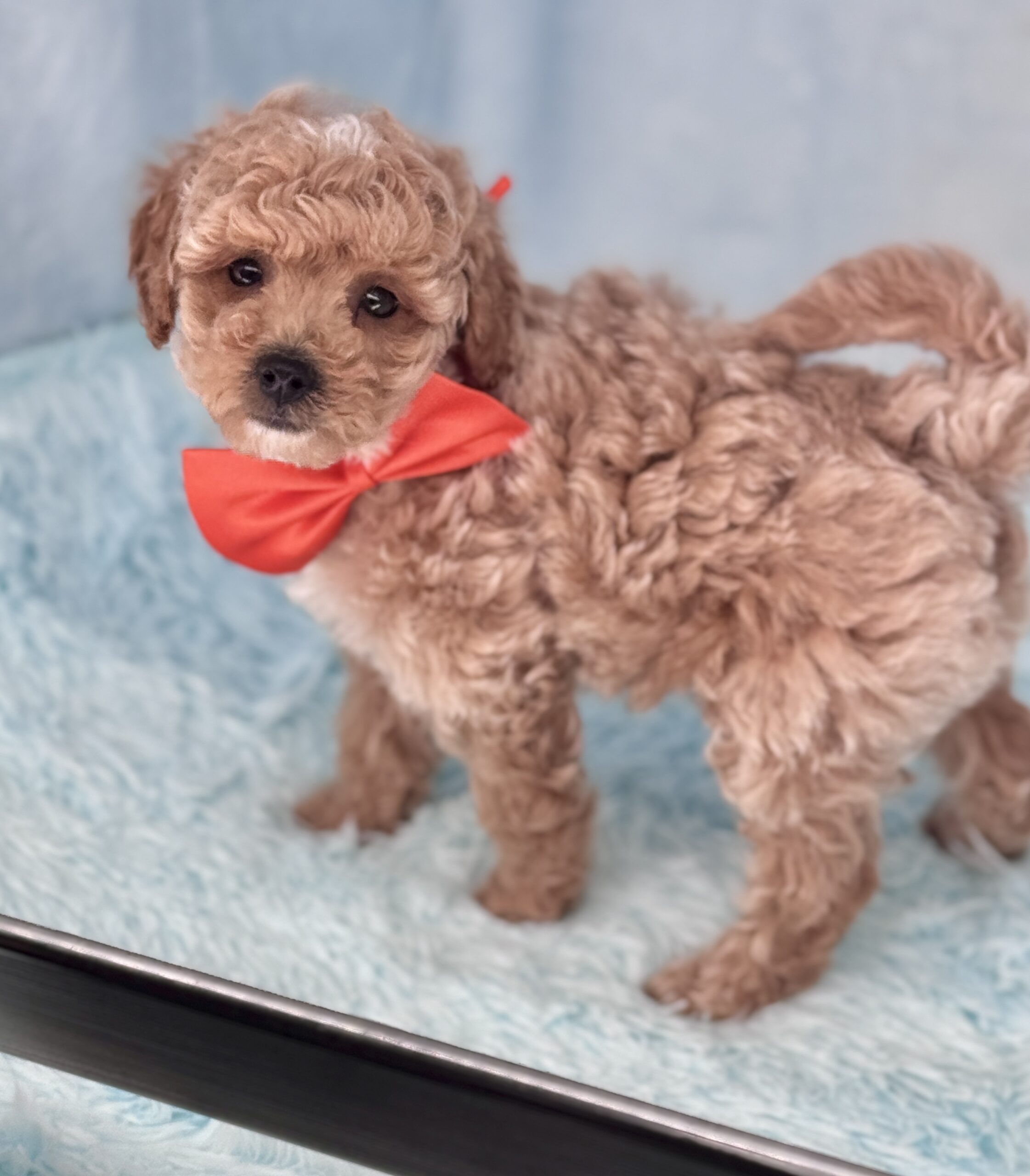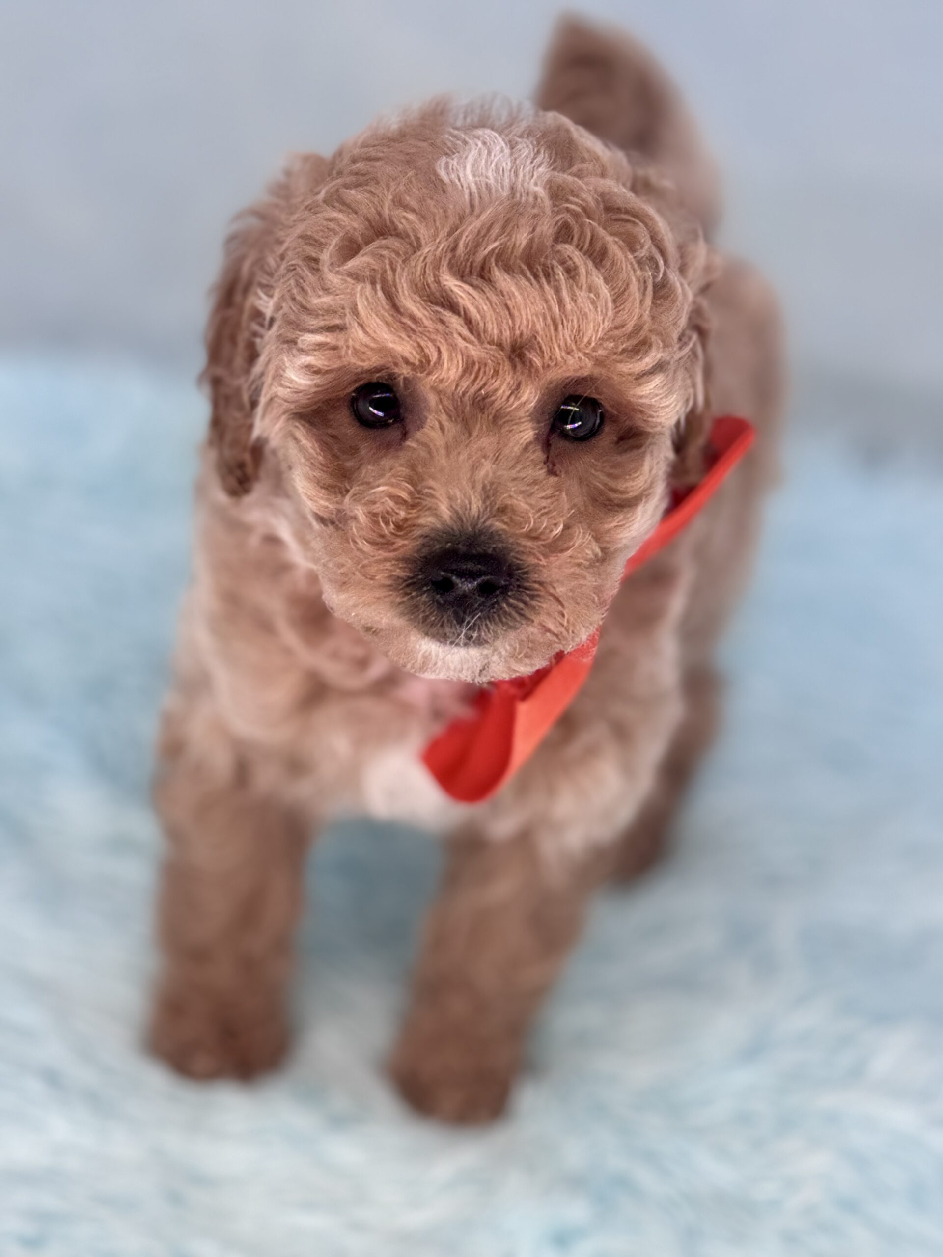 Blanton is from our Bourbon themed F1b generation litter. He is a neat frosty color. His dad often has puppies like this and they usually become a little richer in color with the adult coat. He will look like a tan teddy bear. He was born December 23rd and will be 8 weeks old February 17th. He has a curly coat and is a tiny guy trending to mature around 20 pounds.