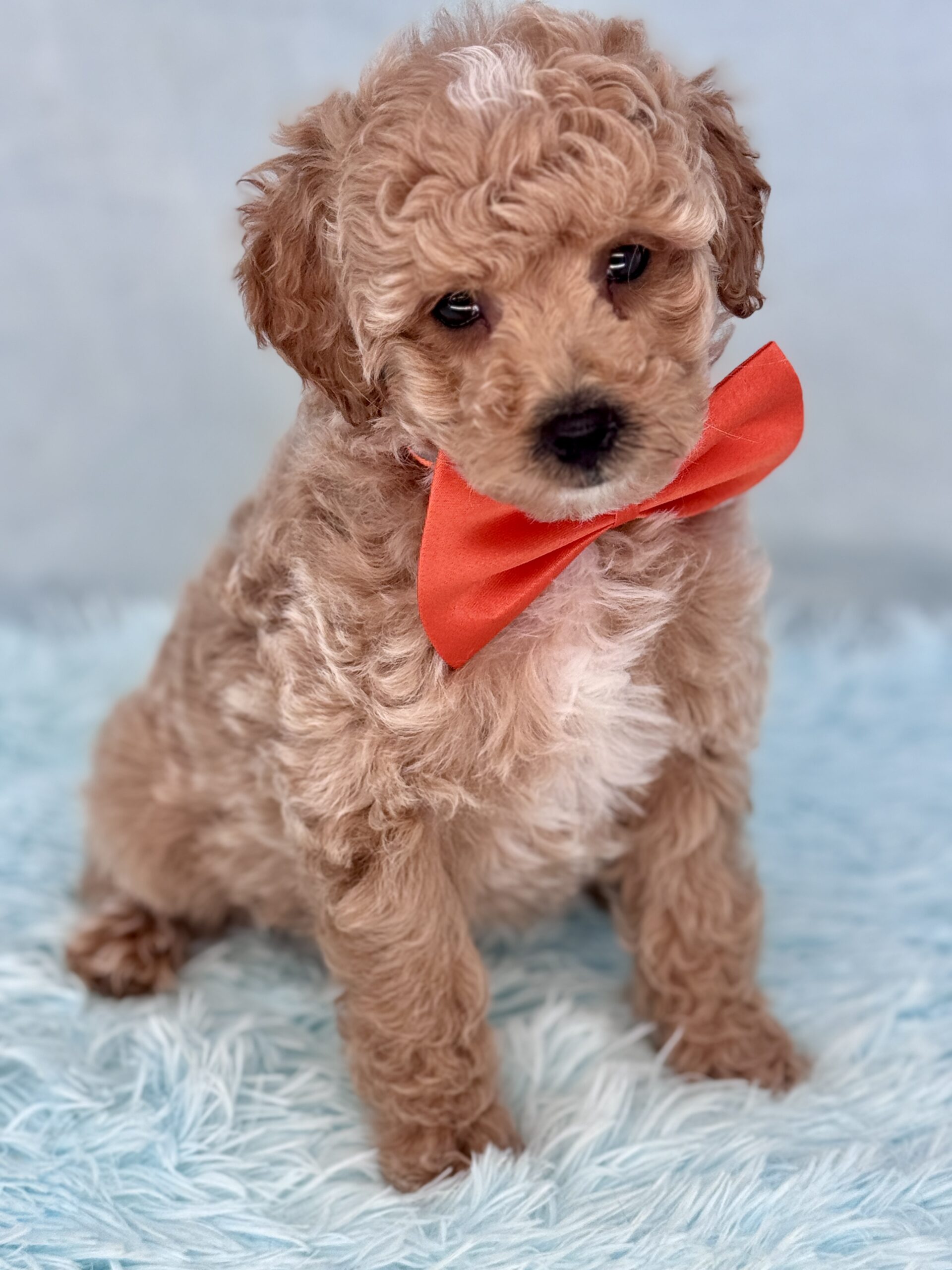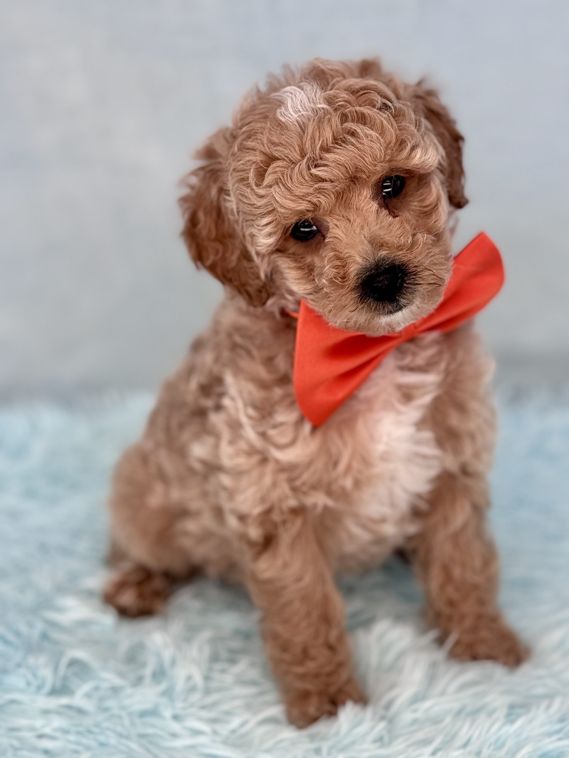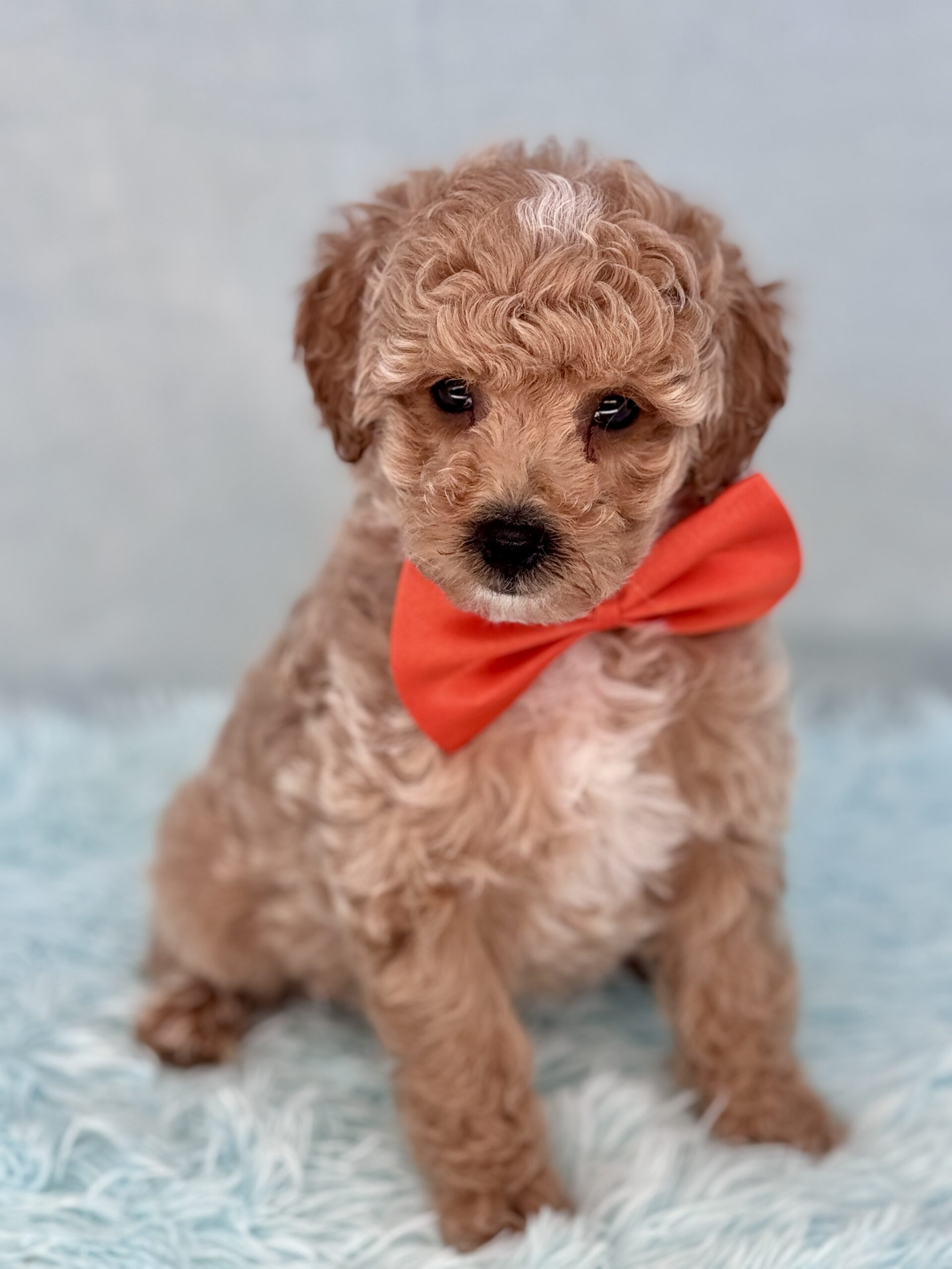 Blanton is from our Bourbon themed F1b generation litter. He is a neat frosty color. His dad often has puppies like this and they usually become a little richer in color with the adult coat. He will look like a tan teddy bear. He was born December 23rd and will be 8 weeks old February 17th. He has a curly coat and is a tiny guy trending to mature around 20 pounds.