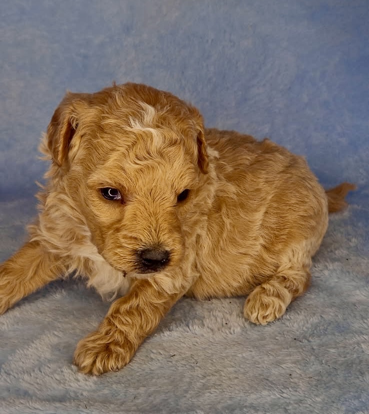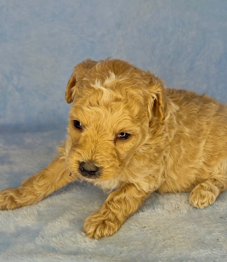 Blanton is from our Bourbon themed F1b generation litter.  He is an apricot colored mini goldendoodle and will look like a tan teddy bear.  He was born December 23rd and will be 8 weeks old February 17th.  He has a curly coat and is one of the smaller boys so he should mature around 25 pounds.
