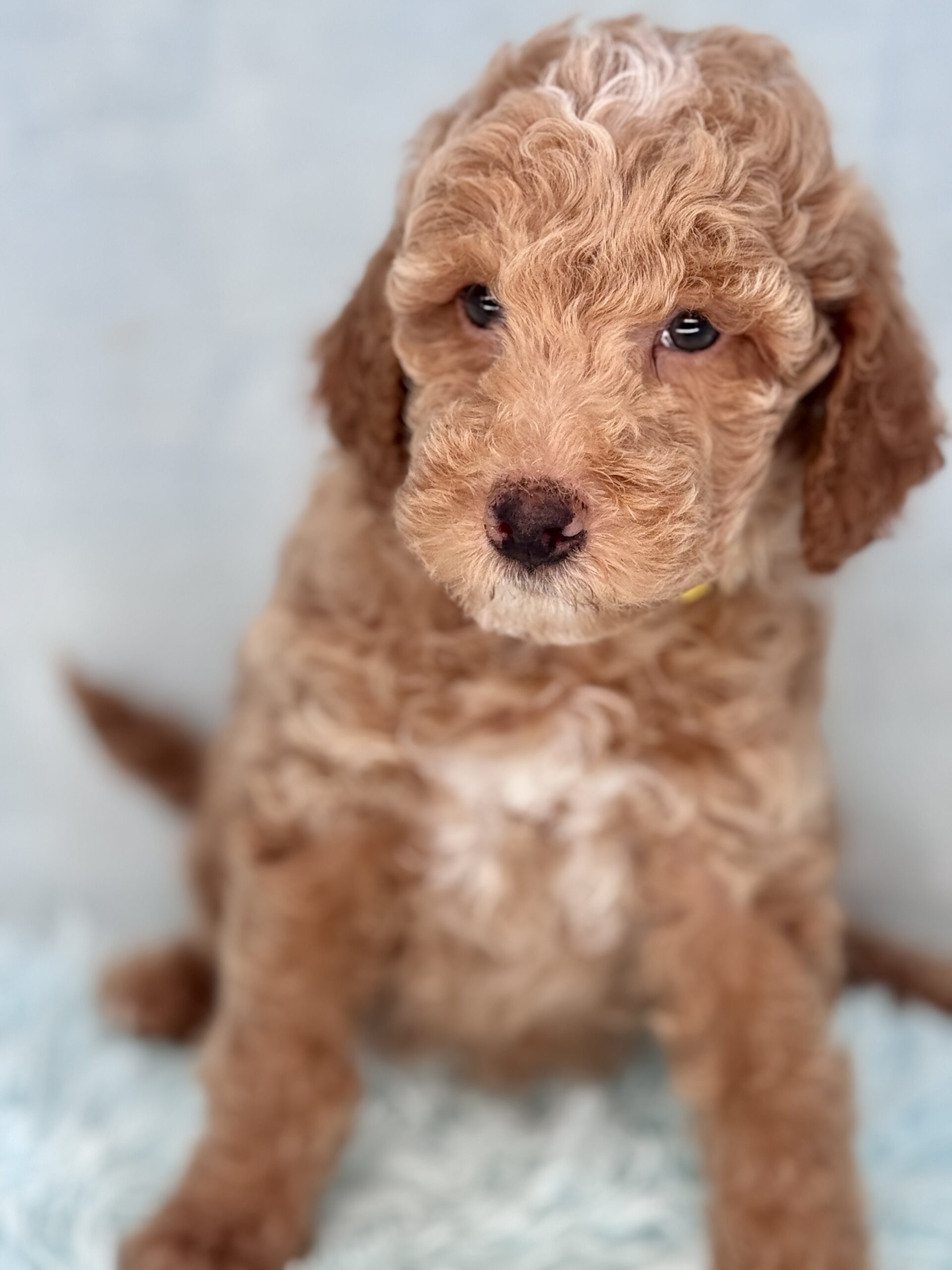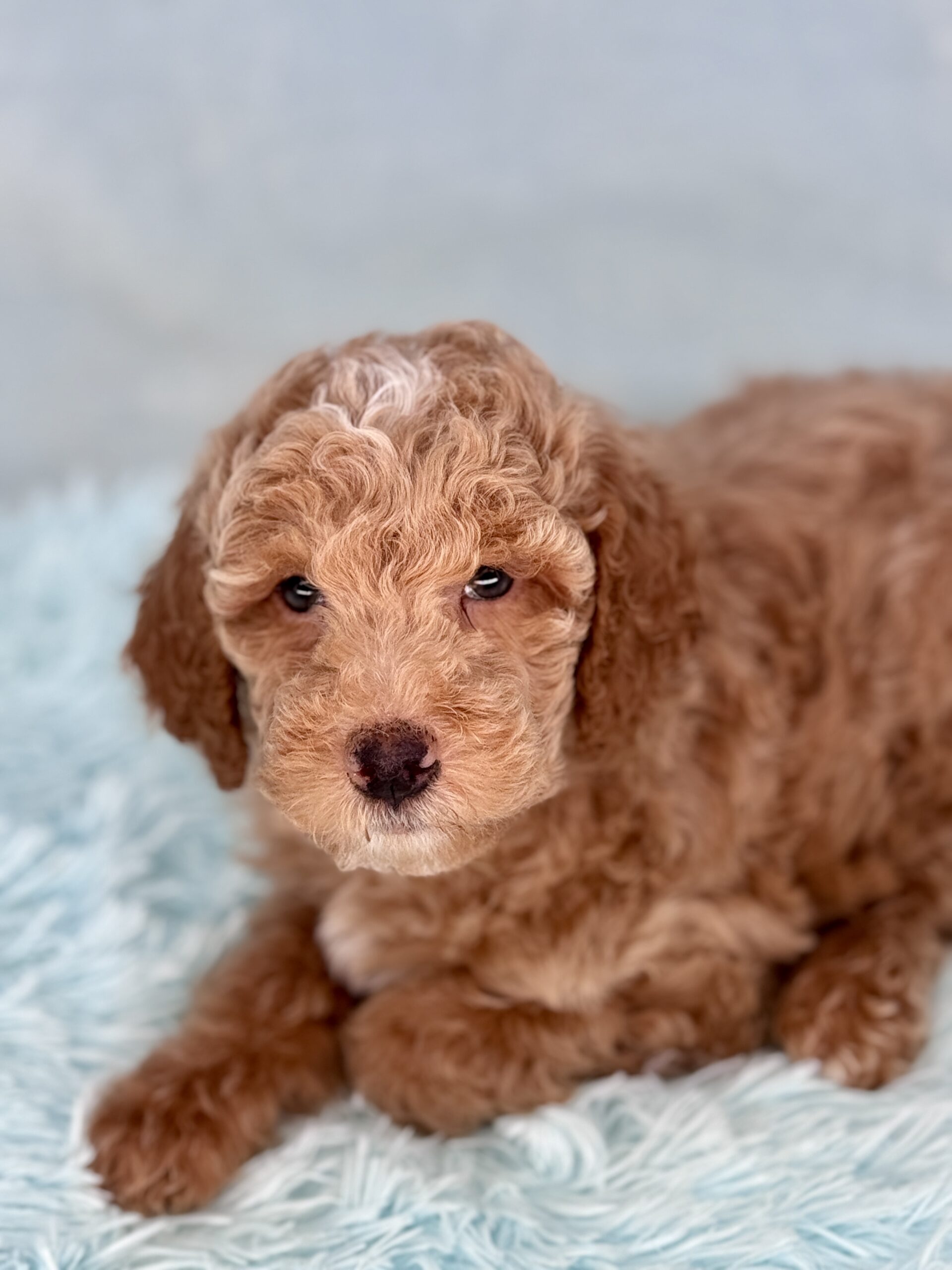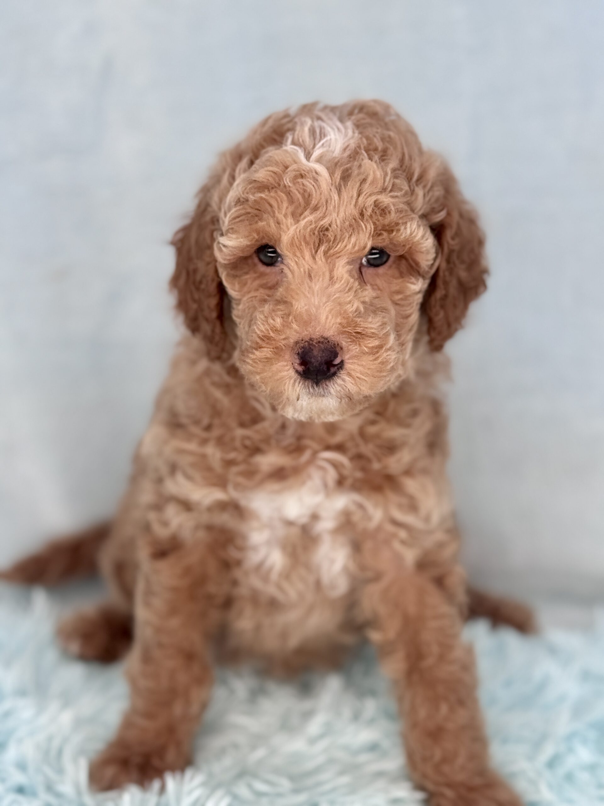Booker is from our Bourbon themed F1b generation litter. He is an apricot colored mini goldendoodle and will look like a tan teddy bear. He was born December 23rd and will be 8 weeks old February 17th. He has a curly coat and was born the largest boy in the litter and still is. He does have a great little personality and is pretty chill and confident. He has very pretty lighter color eyes but thats hard to see in his photos. Based on Jade’s larger boys he may mature more of a medium sized guy at 35-40 pounds.