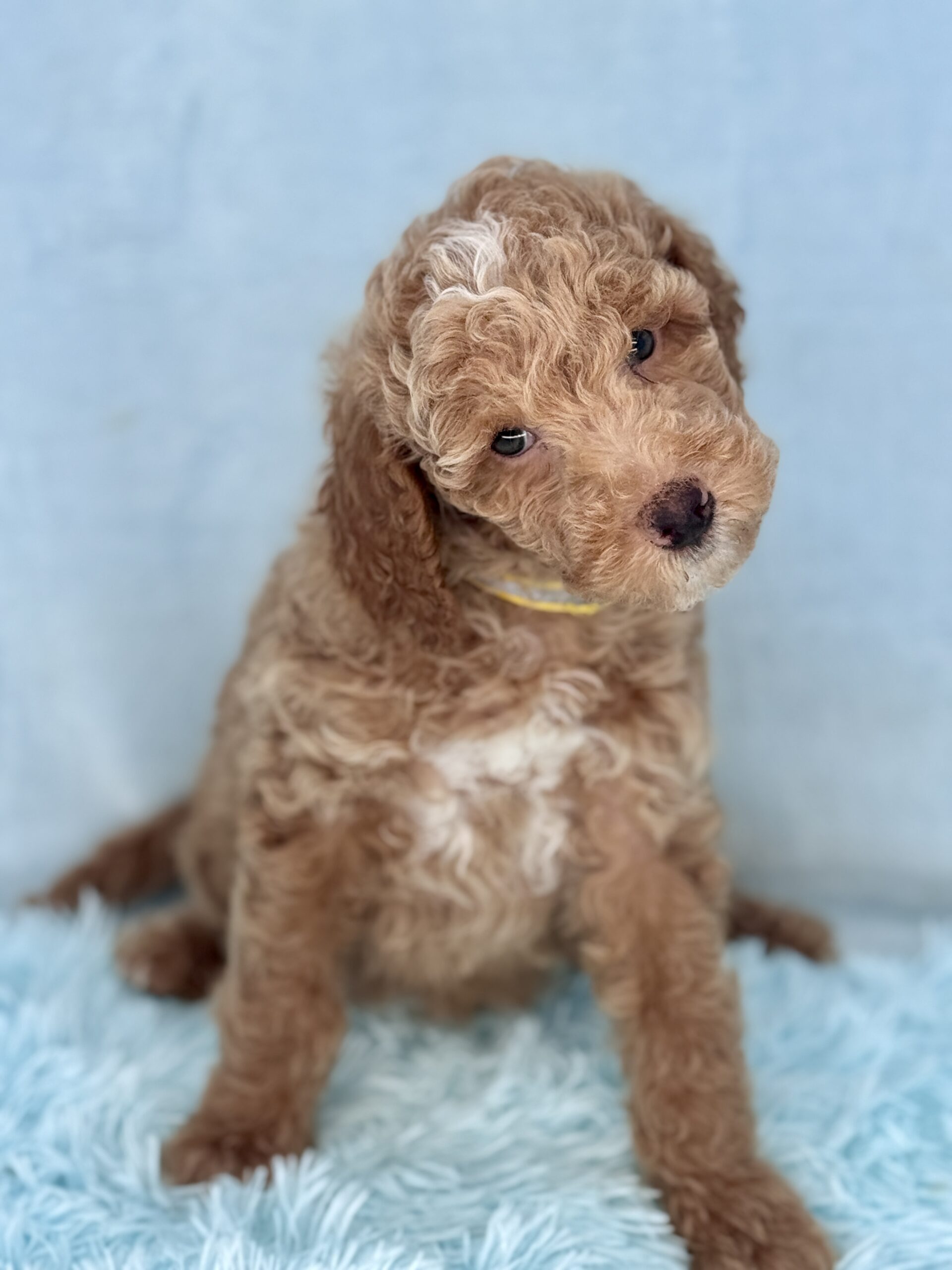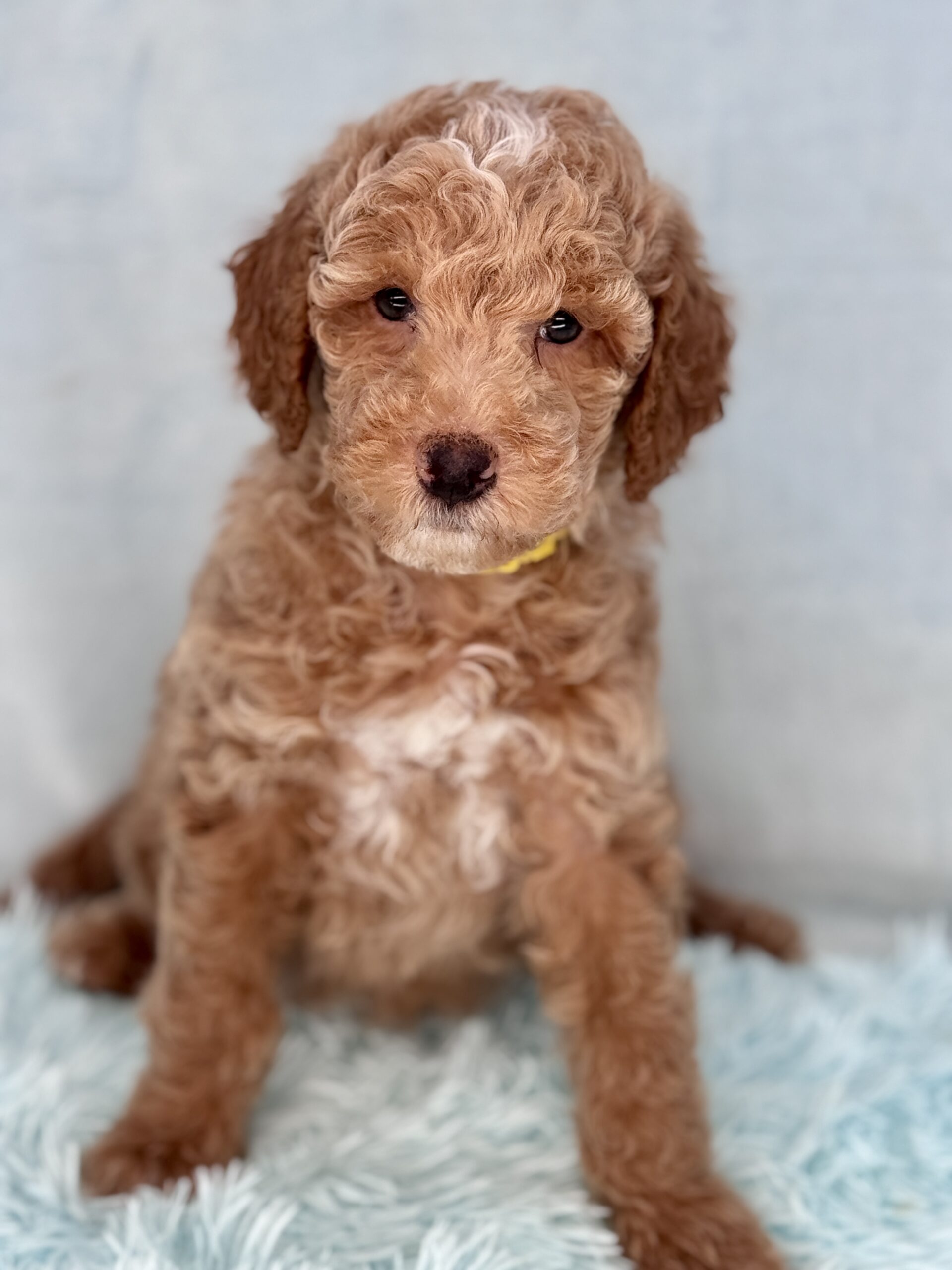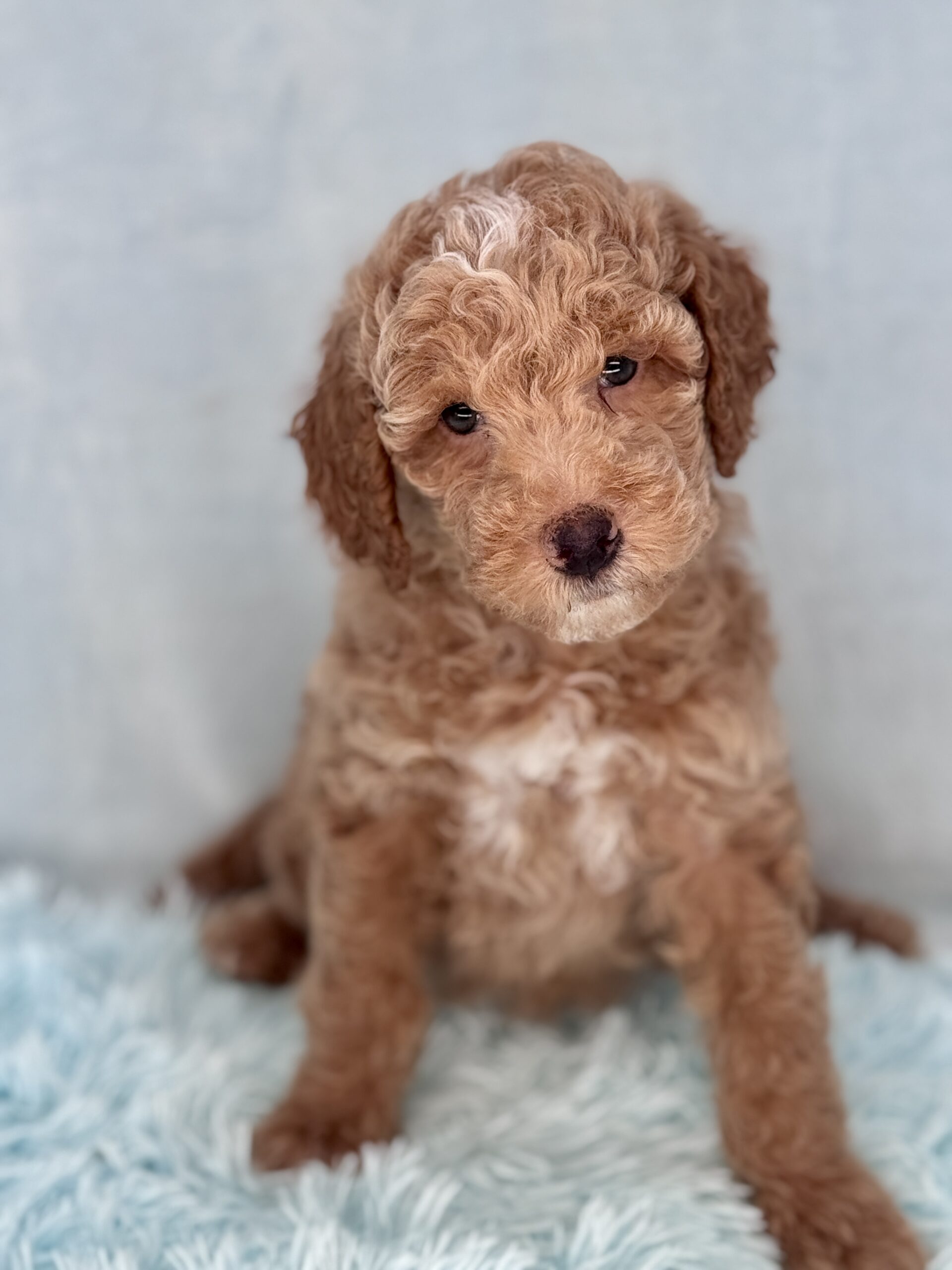 Booker is from our Bourbon themed F1b generation litter. He is an apricot colored mini goldendoodle and will look like a tan teddy bear. He was born December 23rd and will be 8 weeks old February 17th. He has a curly coat and was born the largest boy in the litter and still is. He does have a great little personality and is pretty chill and confident. He has very pretty lighter color eyes but thats hard to see in his photos. Based on Jade’s larger boys he may mature more of a medium sized guy at 35-40 pounds.