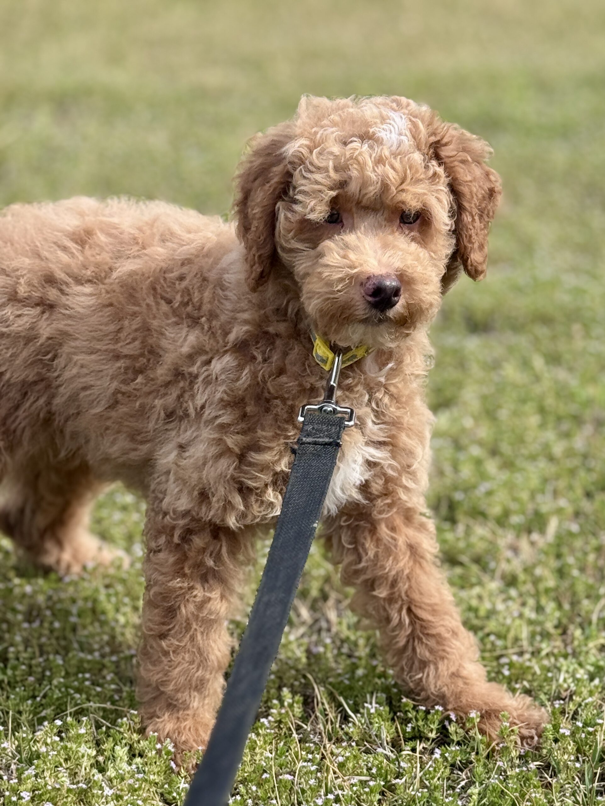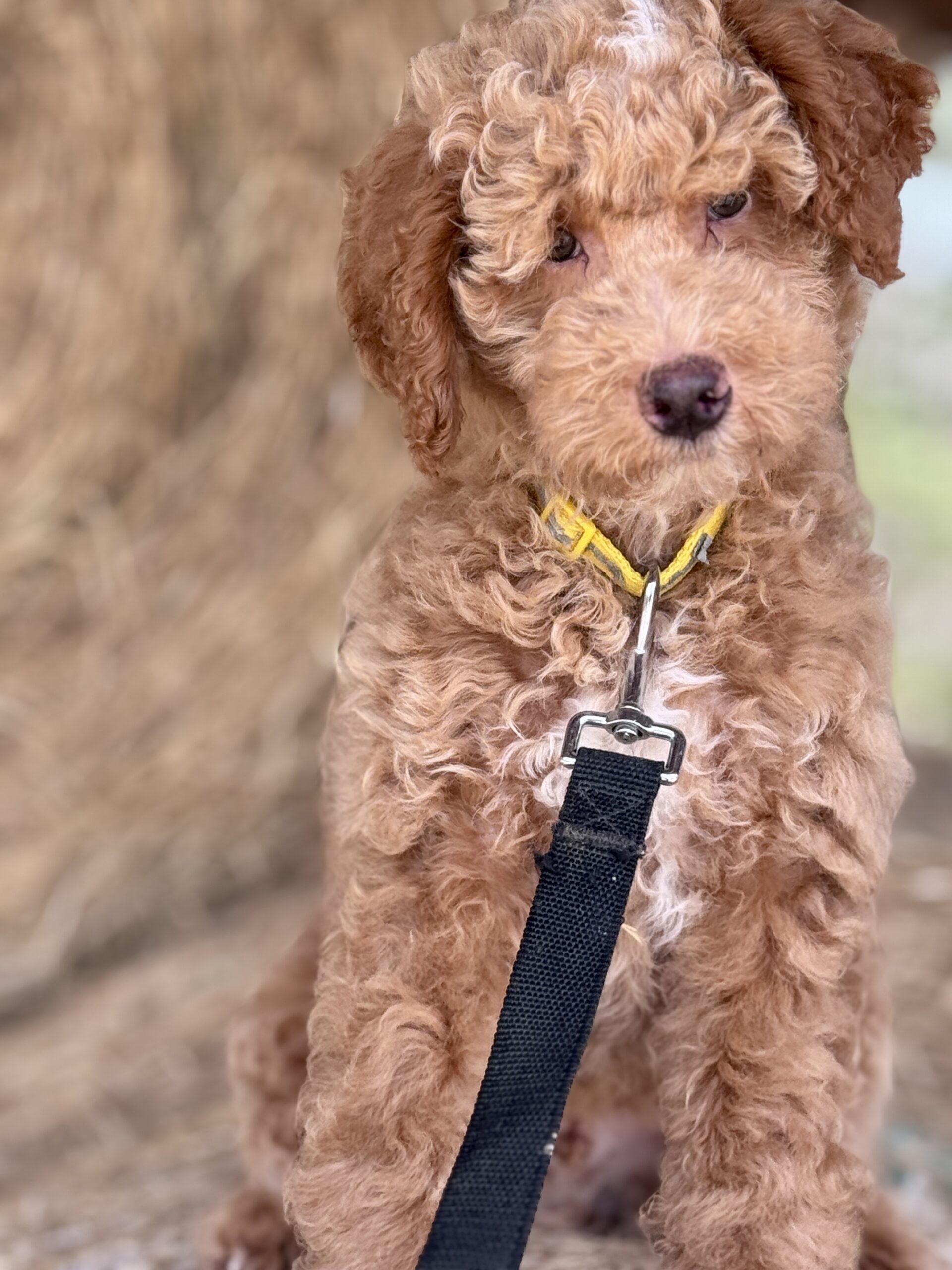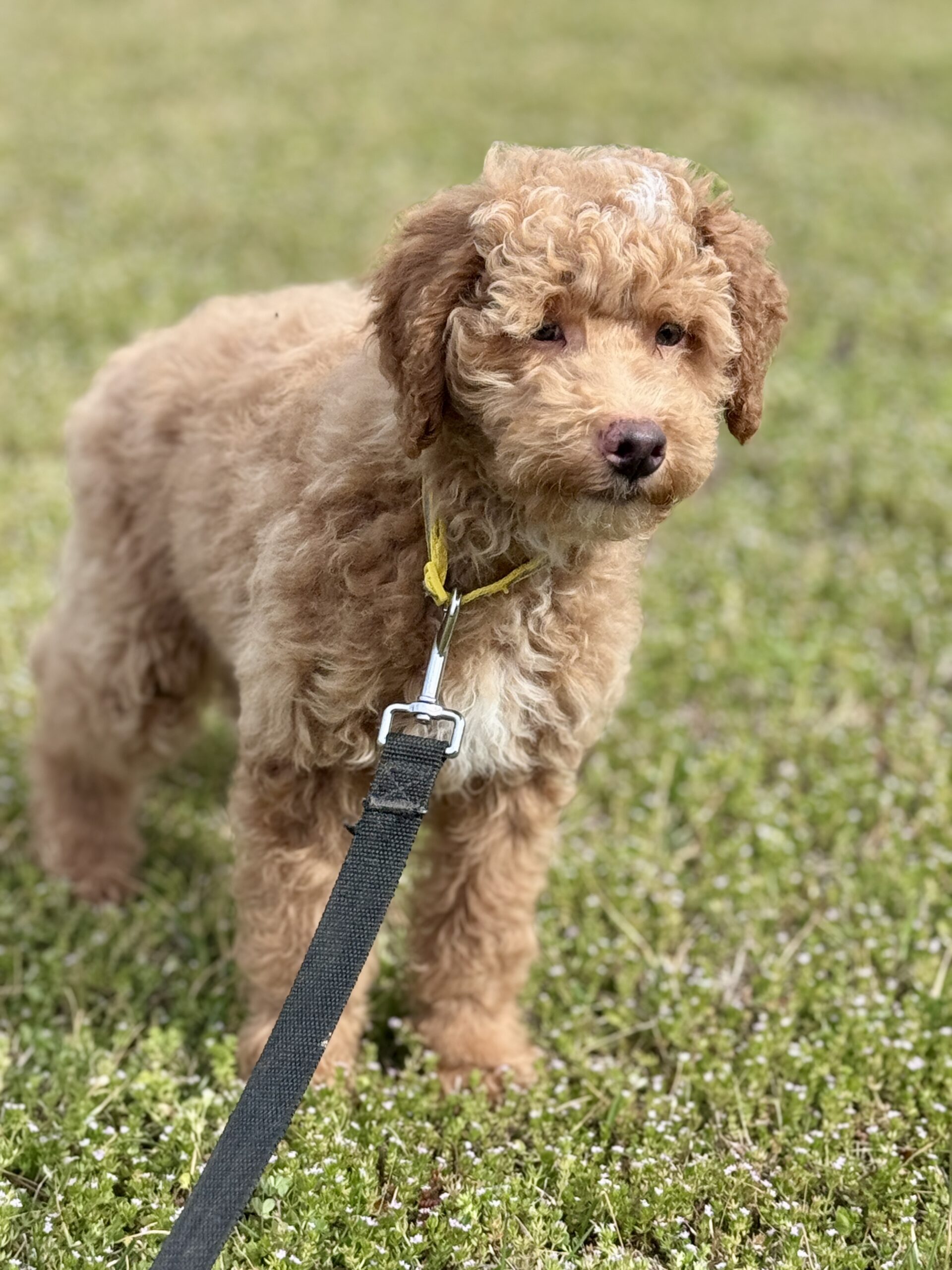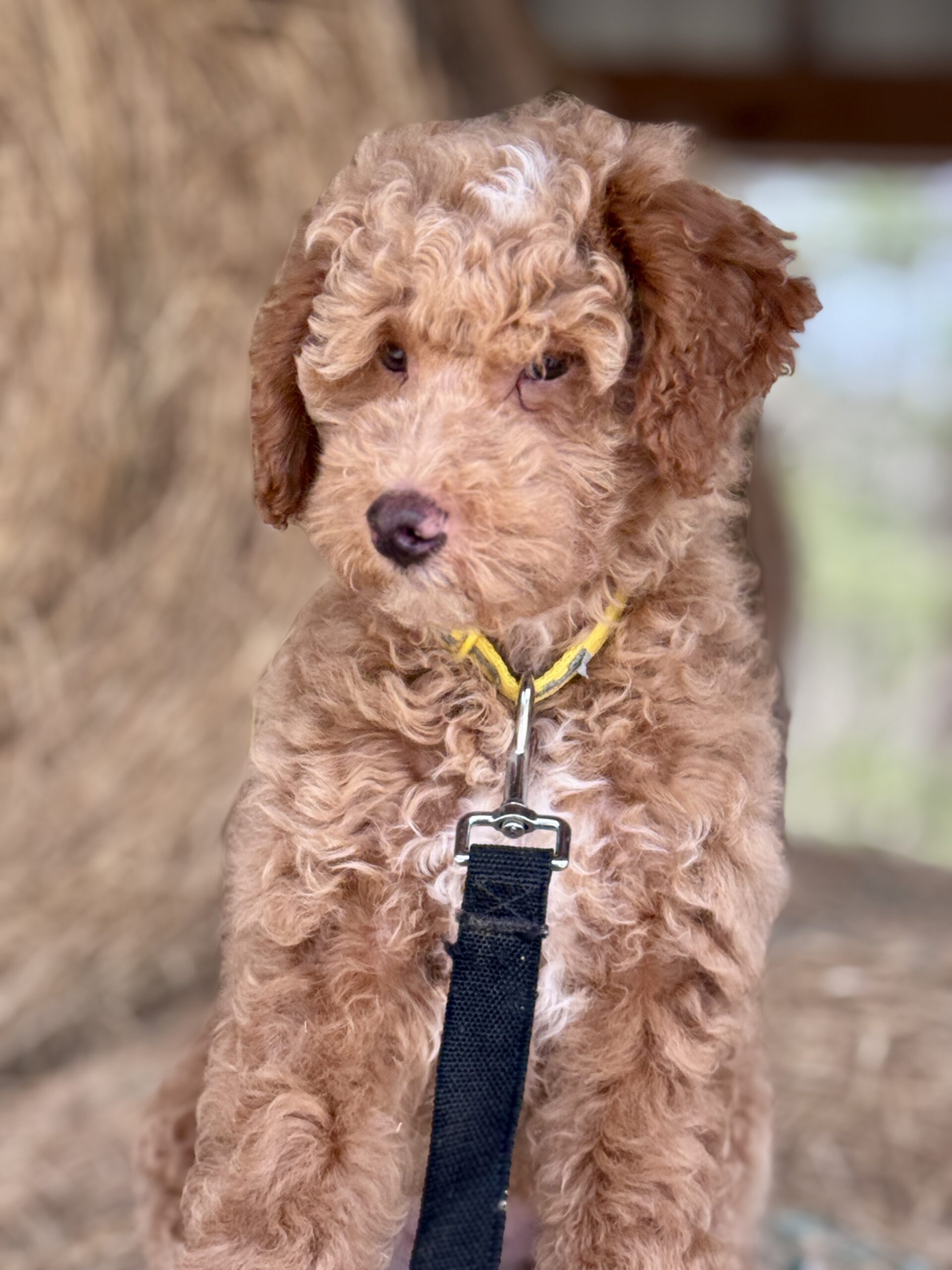Booker is from our Bourbon themed F1b generation litter.  He is an apricot colored mini goldendoodle and will look like a tan teddy bear.  He was born December 23rd and will be 8 weeks old February 17th.  He has a curly coat and was born the largest boy in the litter and still is.  He does have a great little personality and is pretty chill and confident.  He has very pretty lighter color eyes but thats hard to see in his photos.  Based on Jade’s larger boys he may mature more of a medium sized guy at 35-40 pounds.  An update on that is he is just not that large and is 9 pounds at 12 weeks of age.  So he would be a max of 30 pounds.