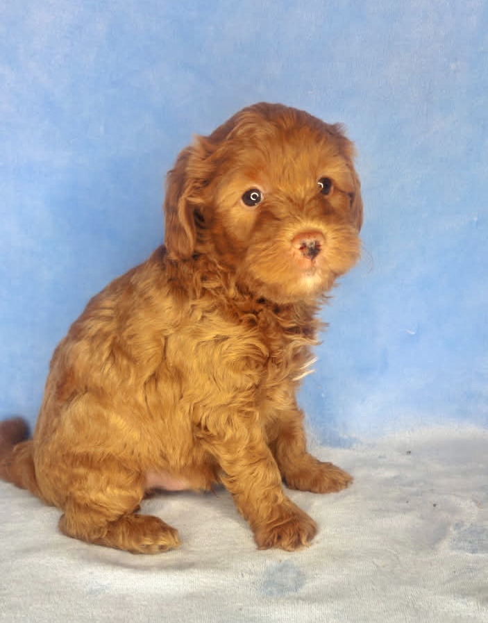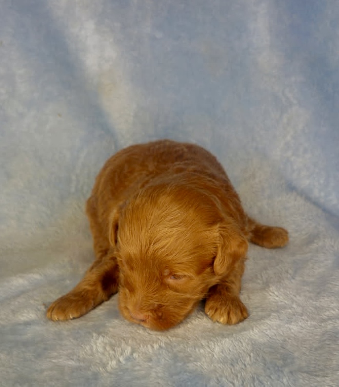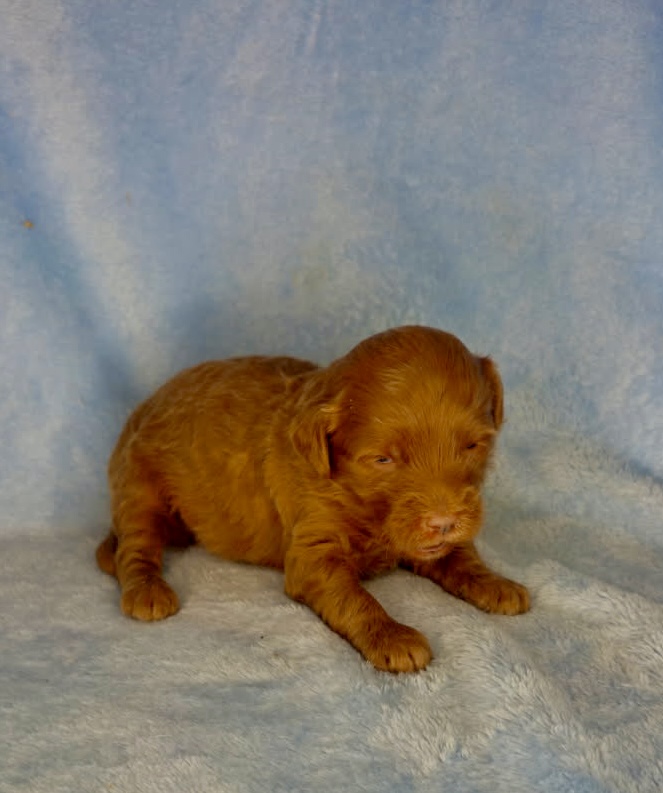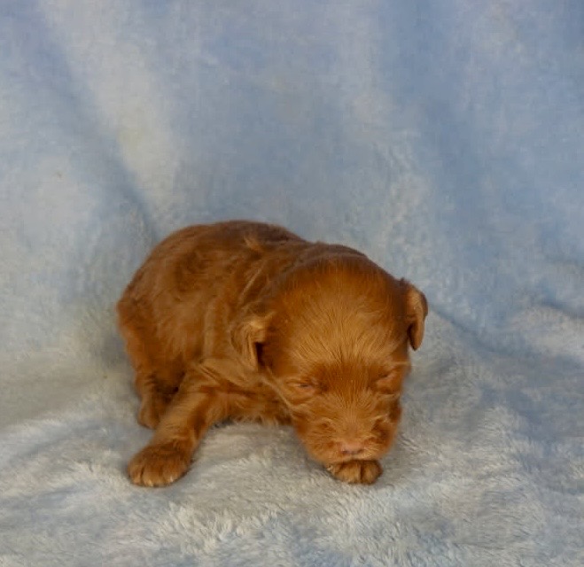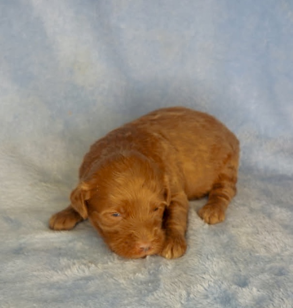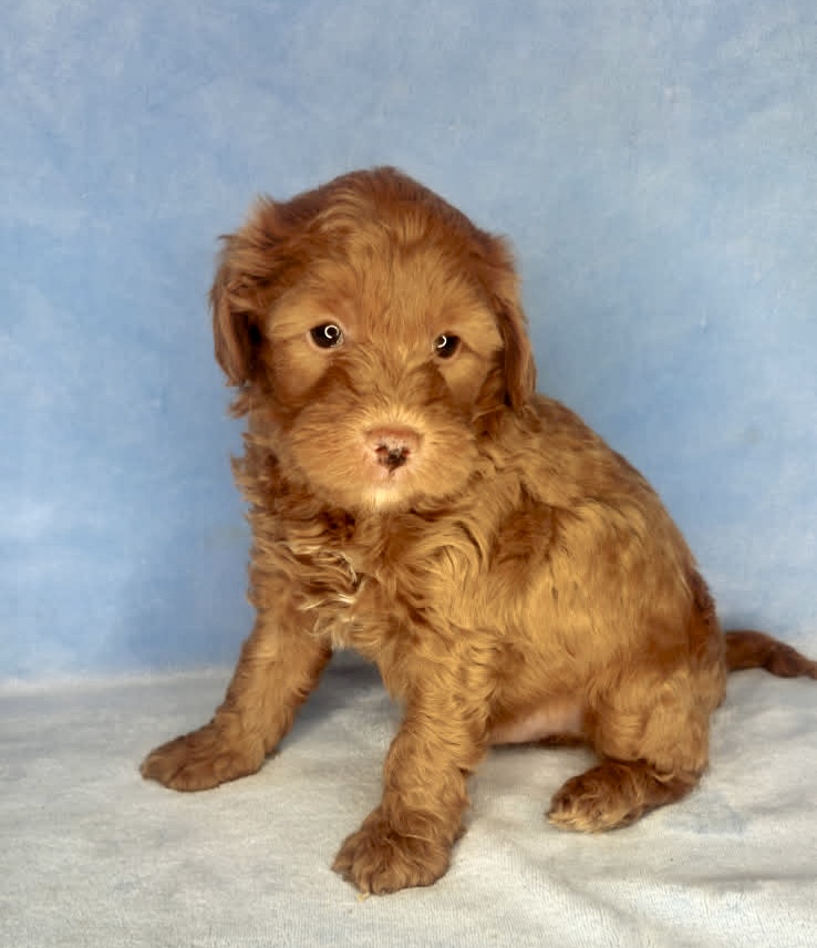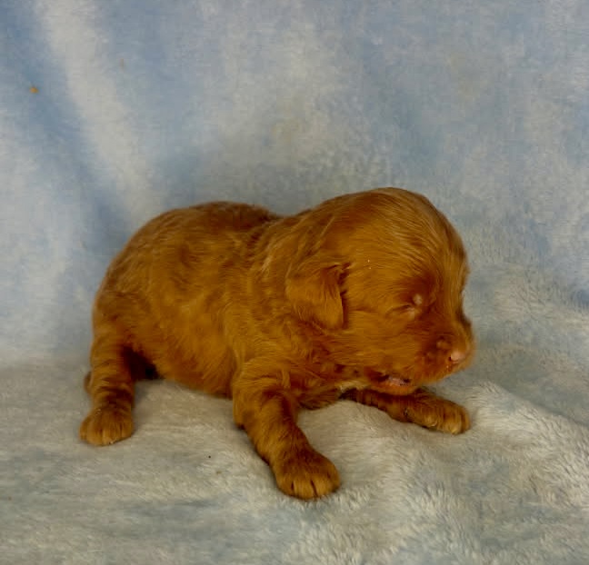 Cannon is from our Tannehill themed F1bb generation litter. He is a dark red mini goldendoodle with a wavy coat. Both parents of this litter have two dominant furnishings so they are all great choices for allergy sufferers and will not shed. They were born February 10th and 8 weeks old April 7th.