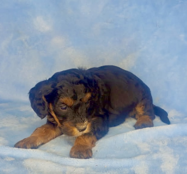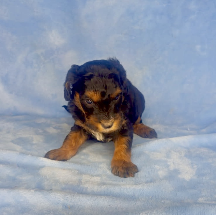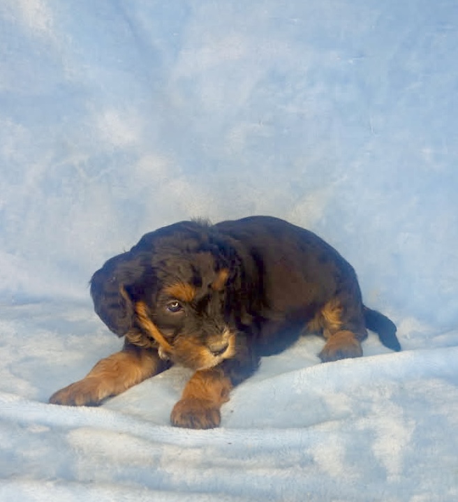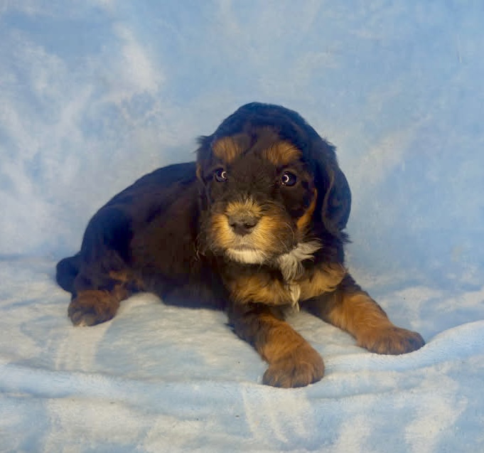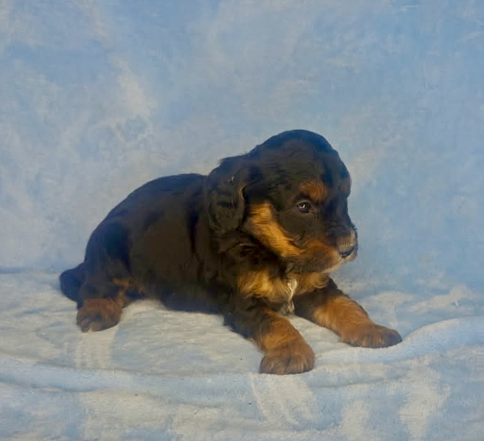 Charleston is from our Mahjong Litter. He is a rich mahogany black phantom color. We have had a few black phantoms and can show you some pictures of similar past puppies that are very pretty dogs. It is really a neat pattern on a long haired dog. He has a wavy coat. Both parents are sweet tempered calm dogs and all of these puppies are good choices for allergy suffers. They were born December 5th and ready to go early February.