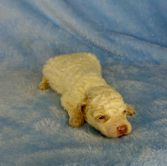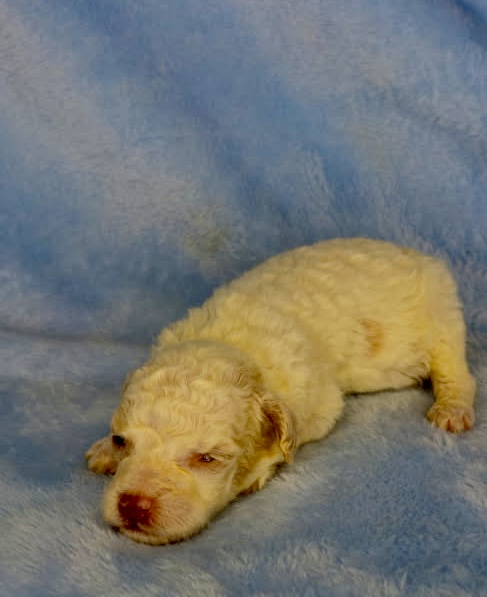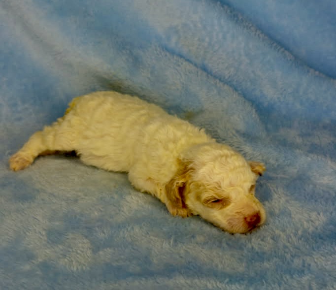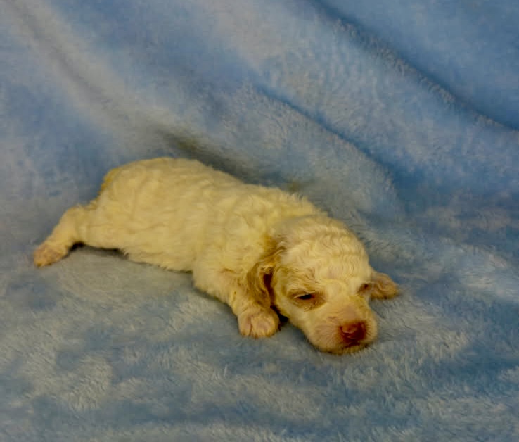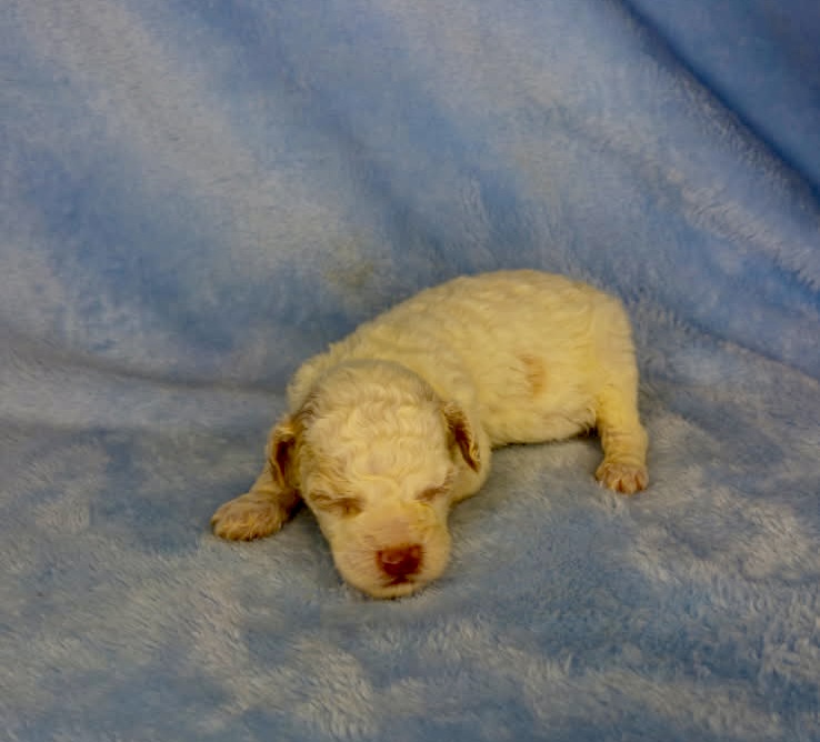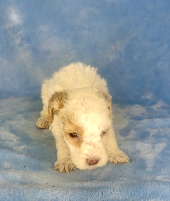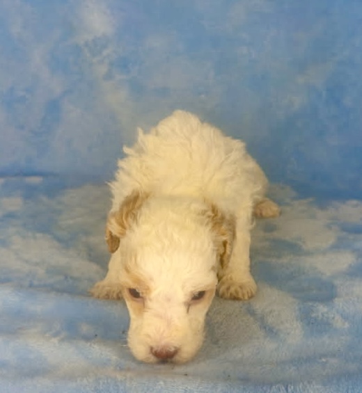 Dots is from our Mahjong Litter. He is a high white parti. He has apricot or golden color spots. He has a curly coat. Both parents are sweet tempered calm dogs and all of these puppies are good choices for allergy suffers. They were born December 5th and ready to go early February.
