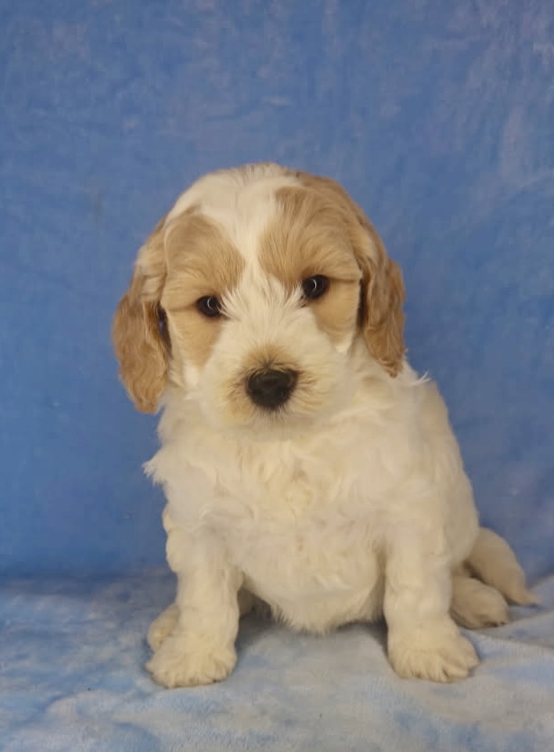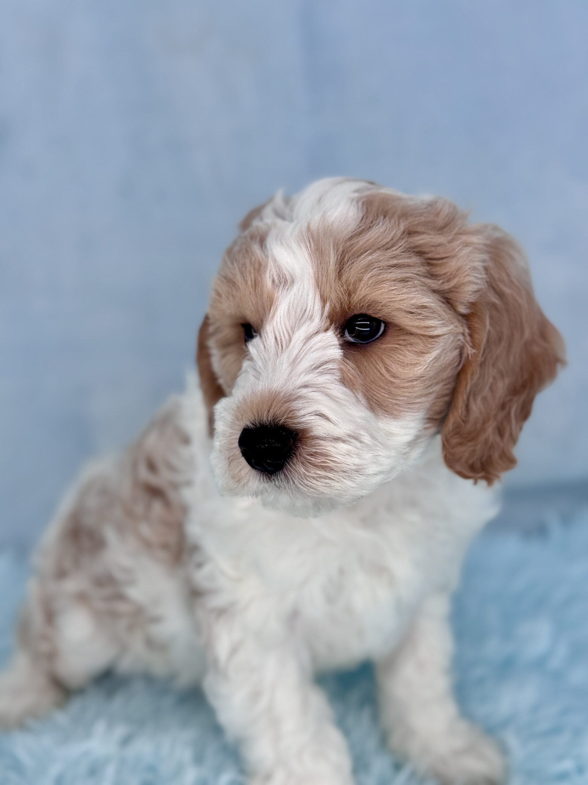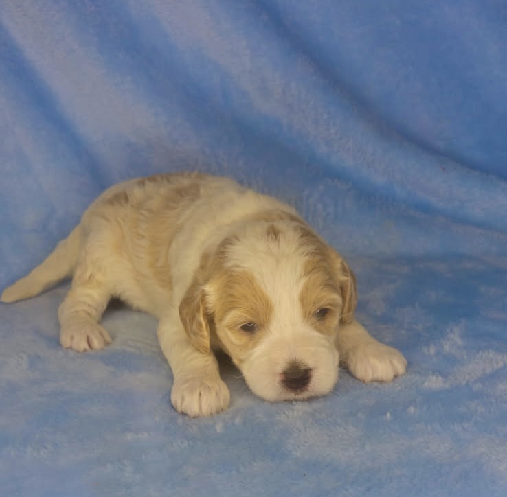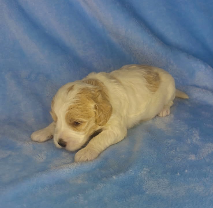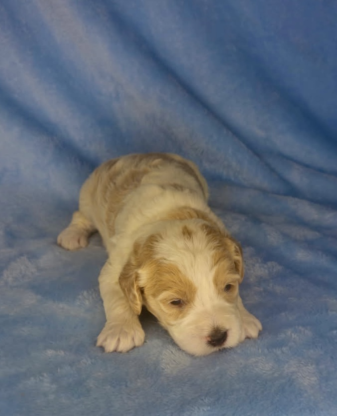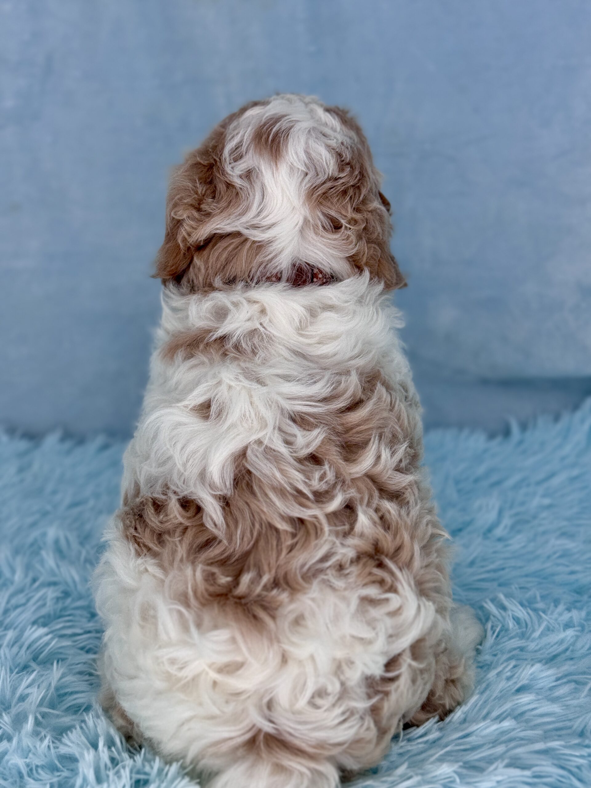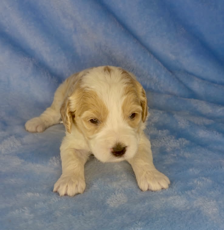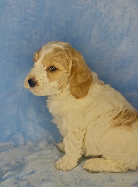 Festive is from our Christmas Spirit Litter. He is a red and white parti mini goldendoodle and will have a wavy coat. Past puppies from these two parents have matured 18-25 pounds.