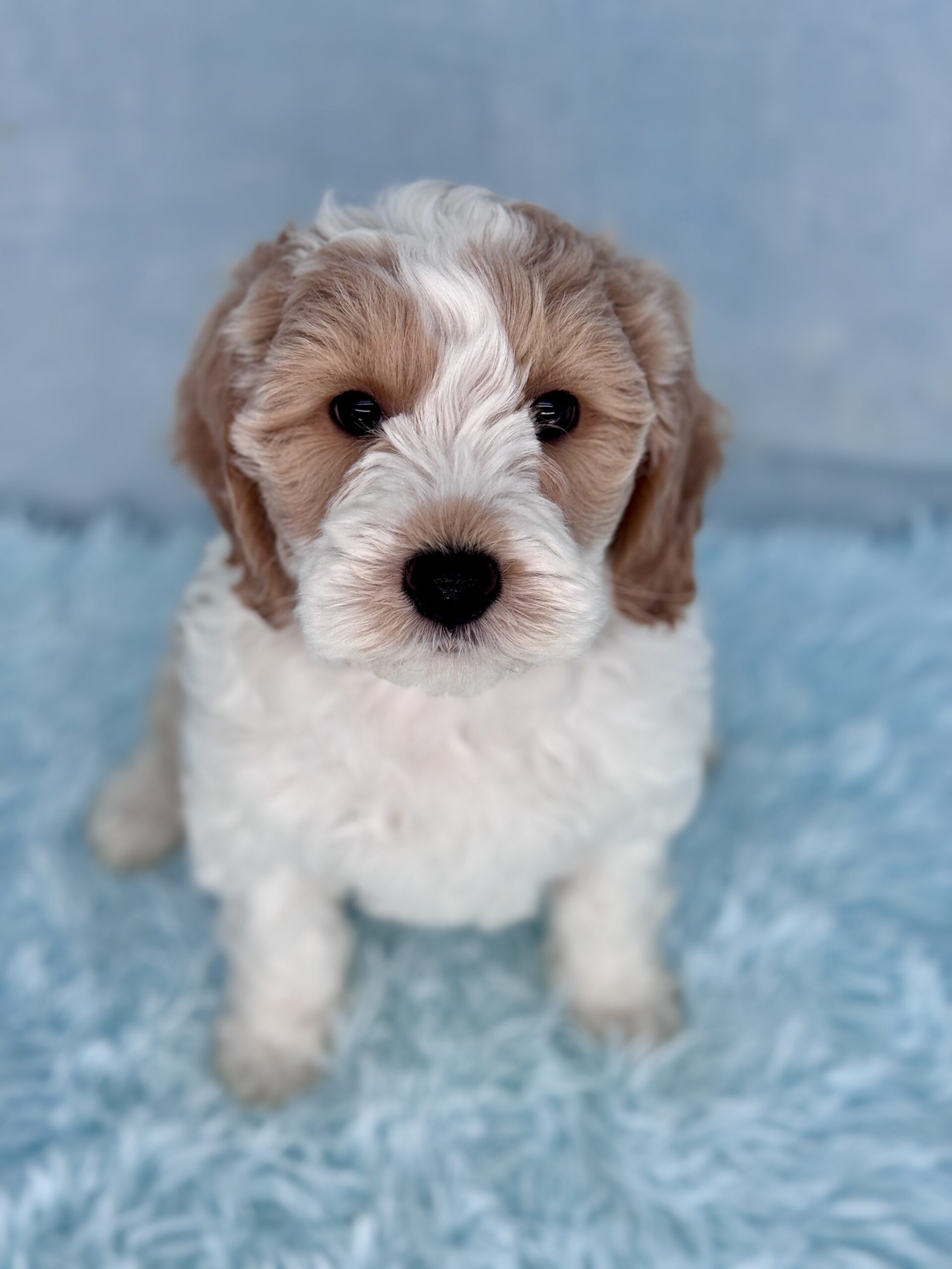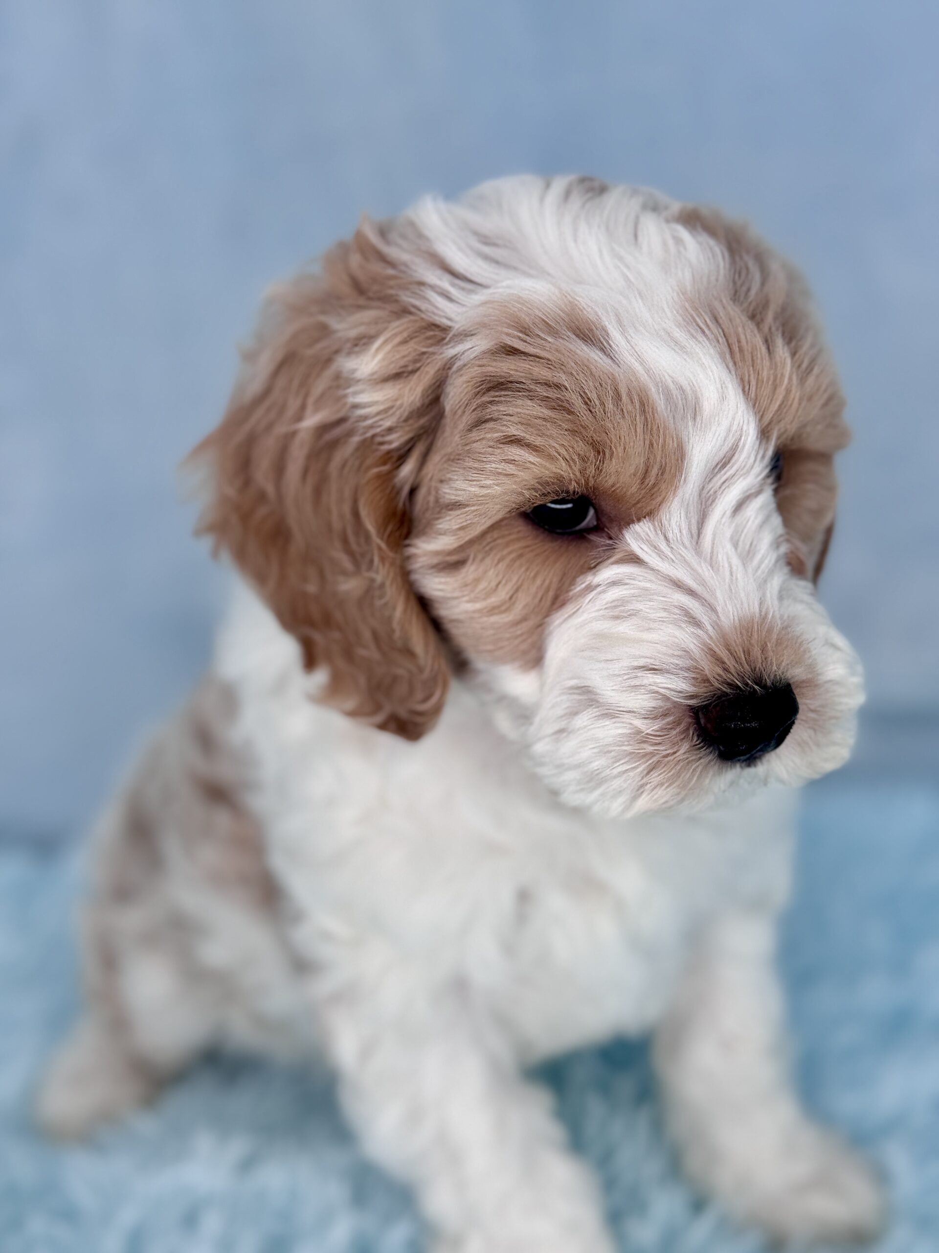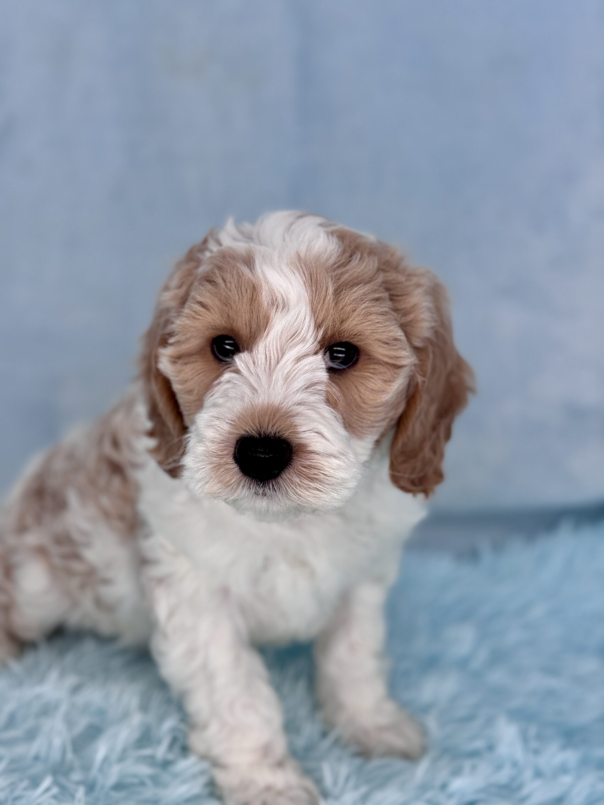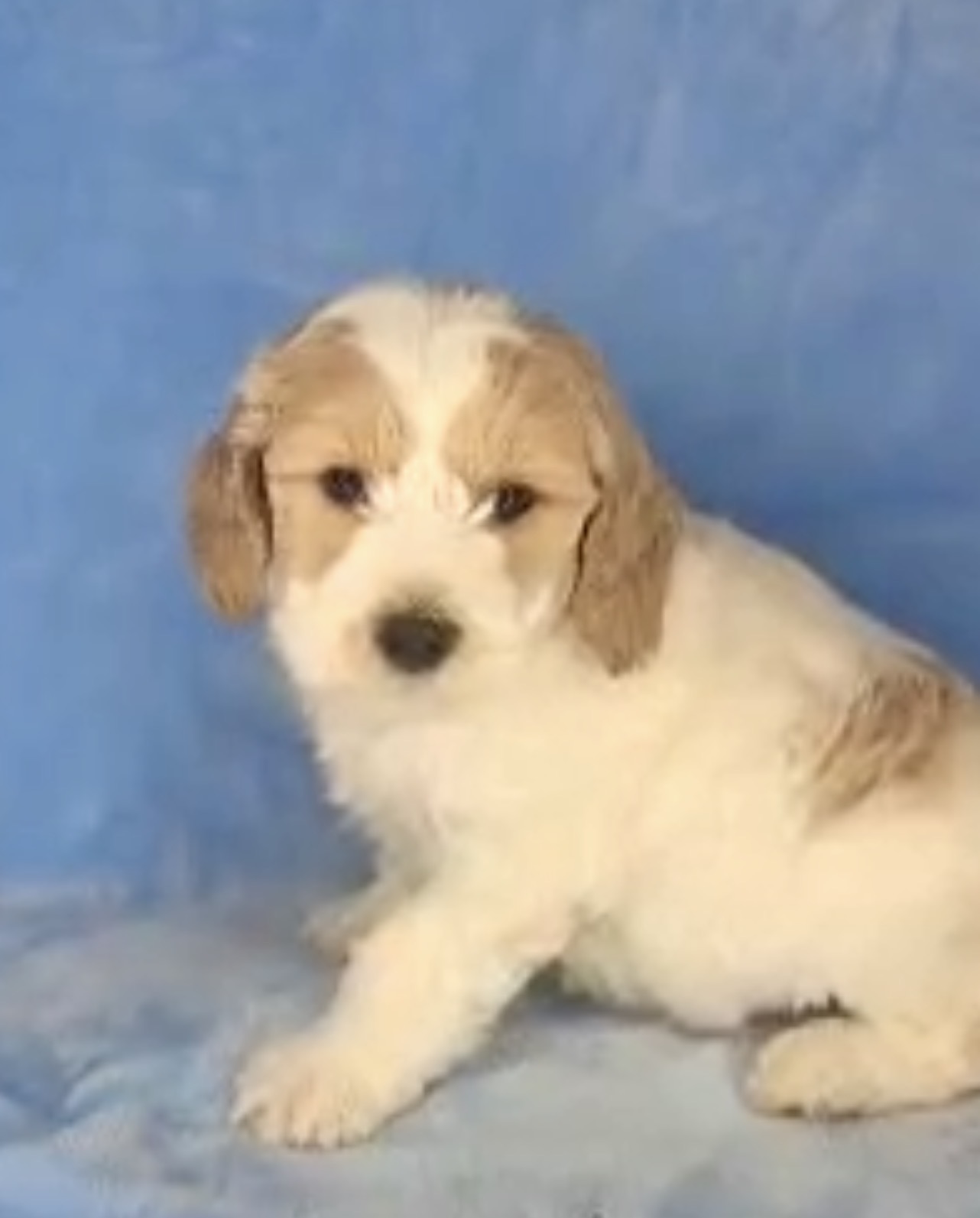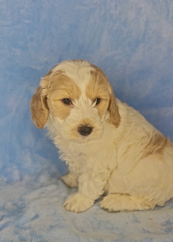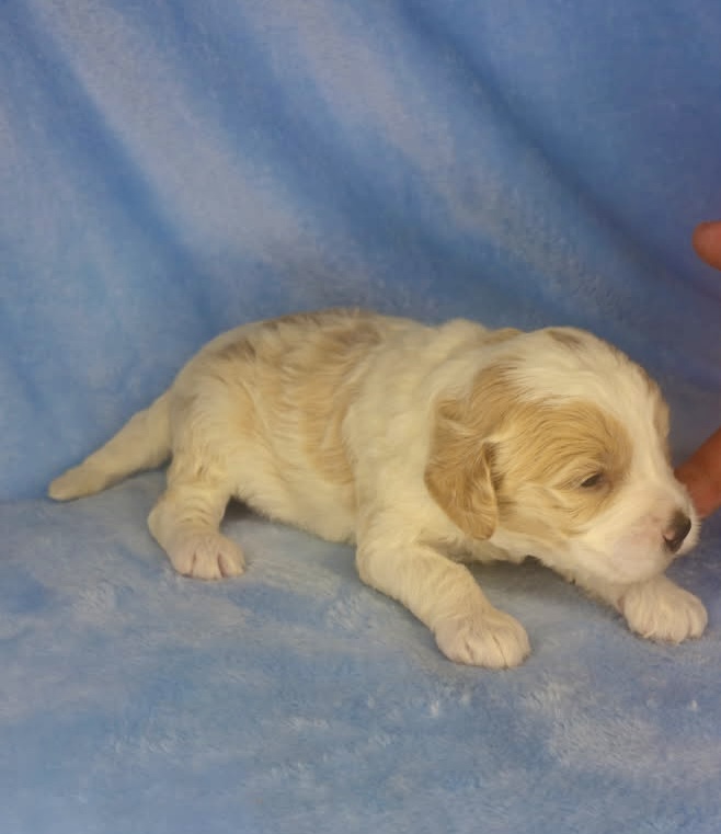 Festive is from our Christmas Spirit Litter. He is a red and white parti mini goldendoodle and will have a wavy coat. Past puppies from these two parents have matured 18-25 pounds.