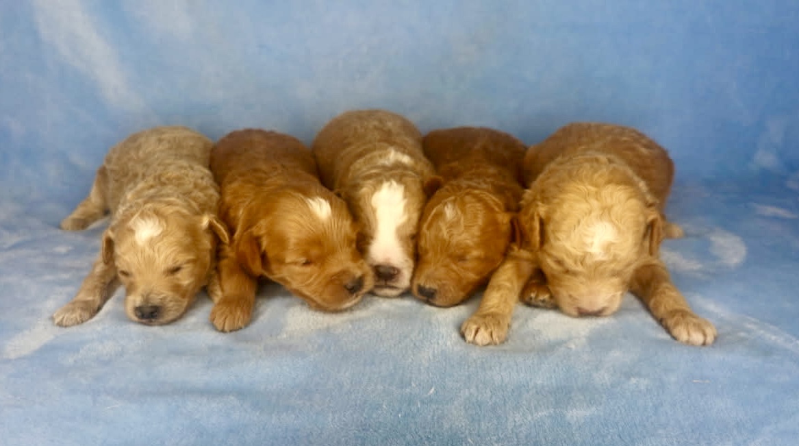 Apricot and red colored mini goldendoodle male puppies born December 23rd and will be 8 weeks old February 17th. Individual photos coming soon.