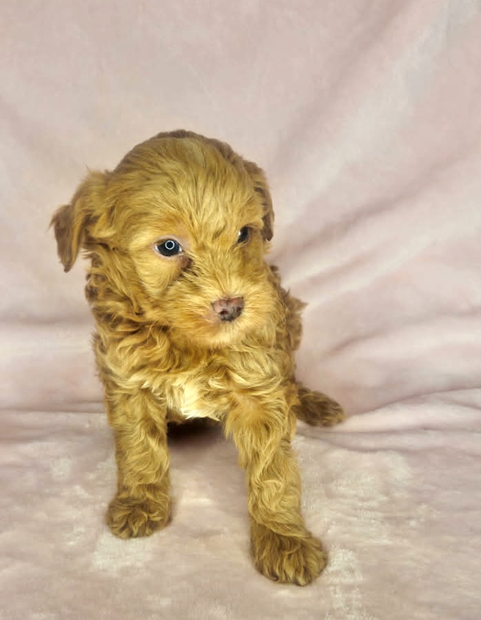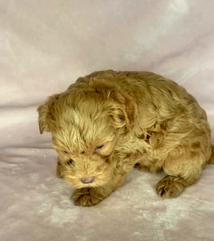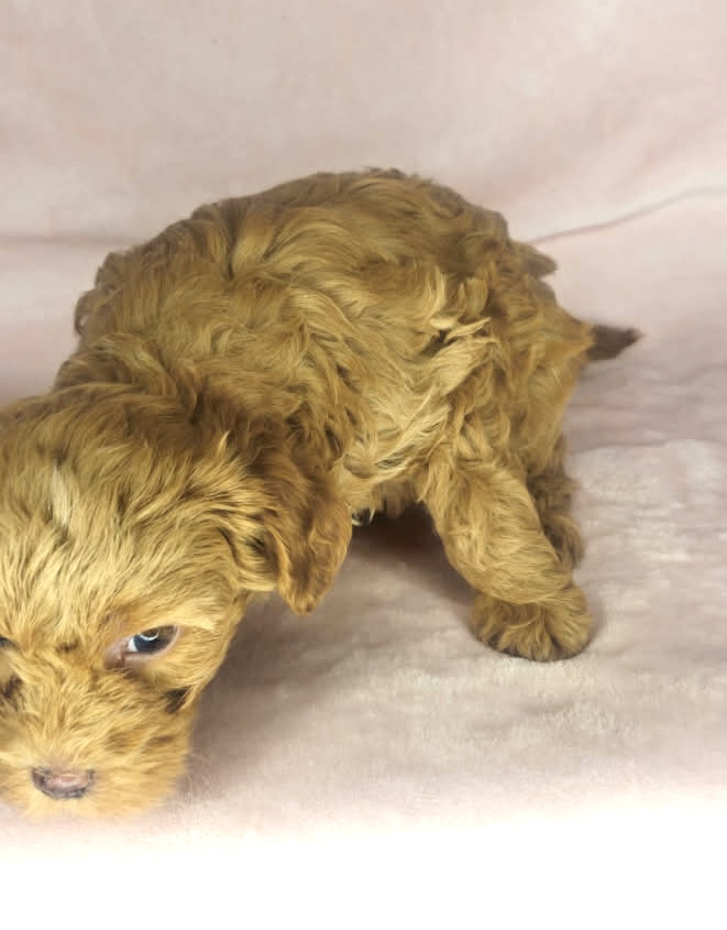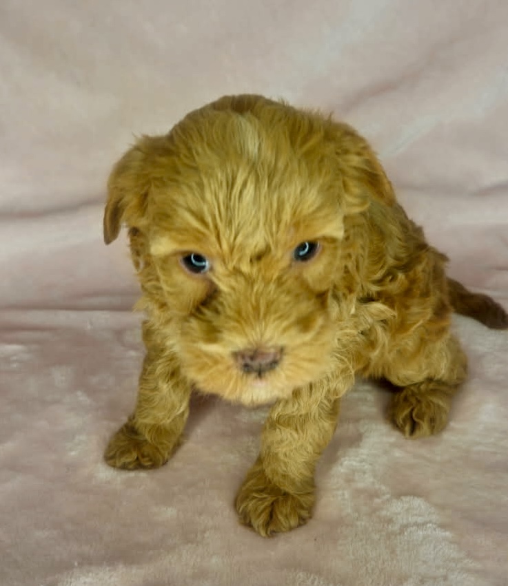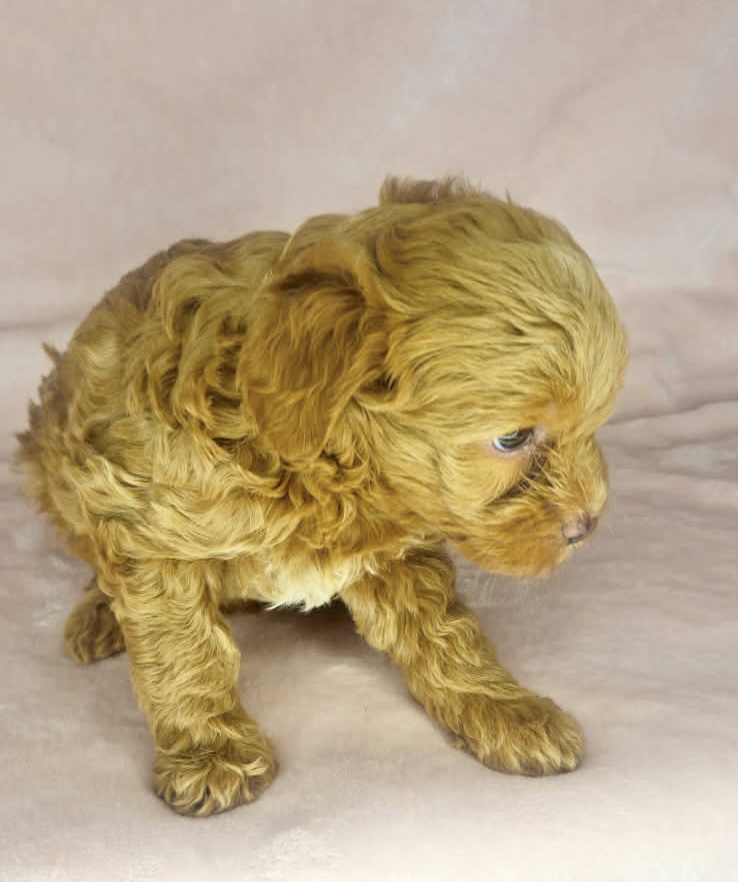 Foundry is from our Tannehill themed F1bb generation litter. She is a red mini Goldendoodle girl with a curly coat. Both parents of this litter have two dominant furnishings so they are all great choices for allergy sufferers and will not shed. They were born February 10th and 8 weeks old April 7th.