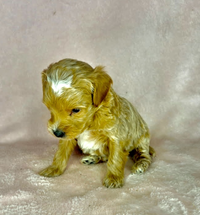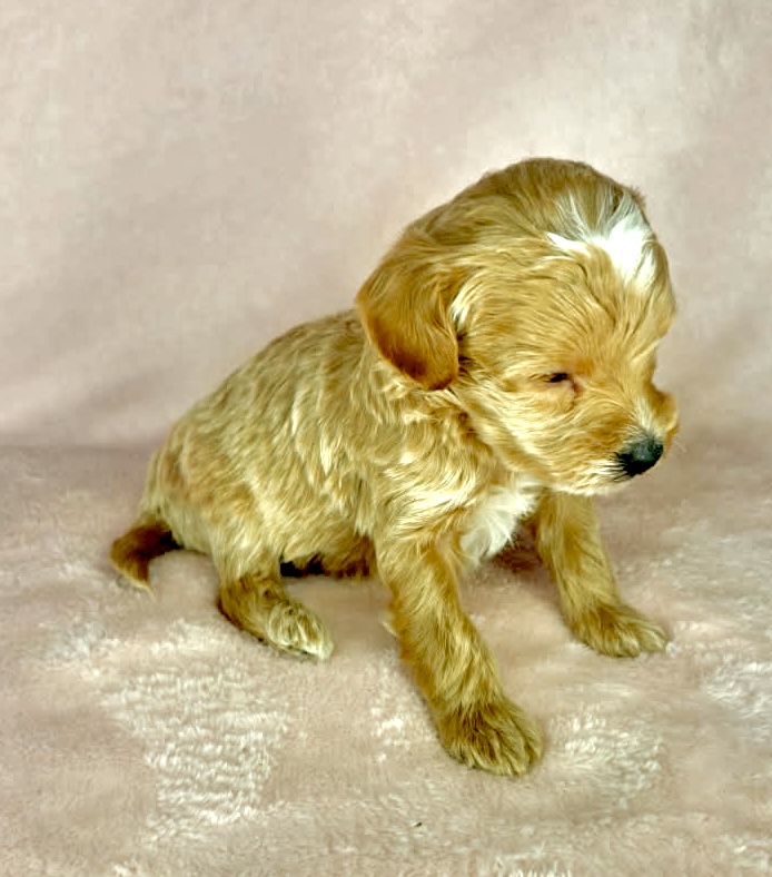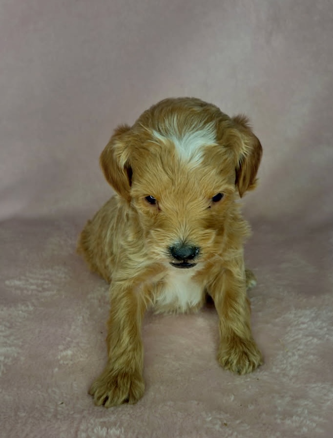 Four Roses is from our Bourbon themed litter. She is an apricot colored mini goldendoodle female puppy. She was born December 23rd and will be 8 weeks old February 17th. She is looking at this point like she will be one of the smaller puppies and mature around 22 pounds with a wavy coat. This litter is F1b generation.