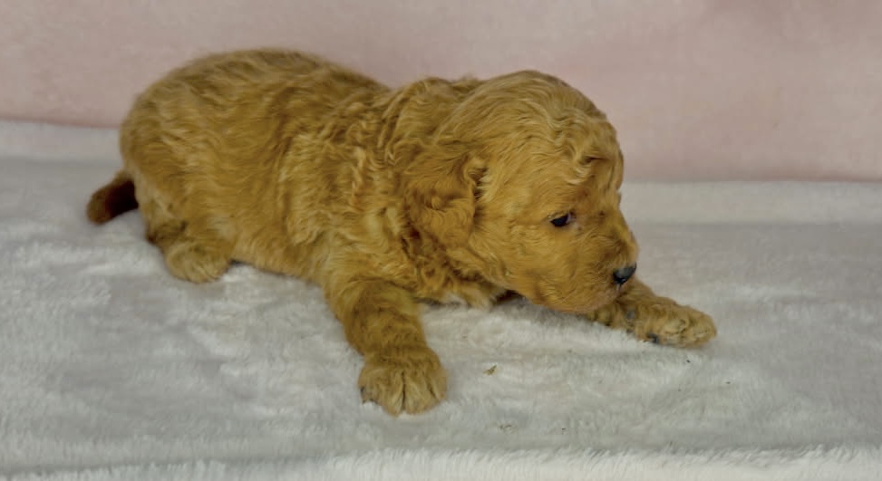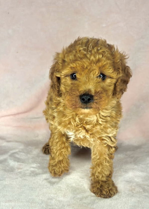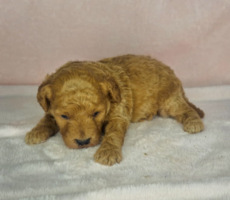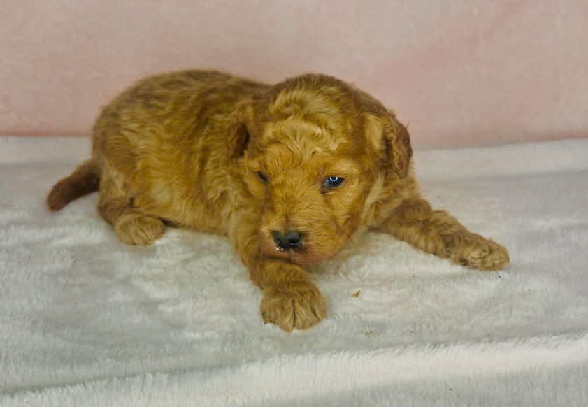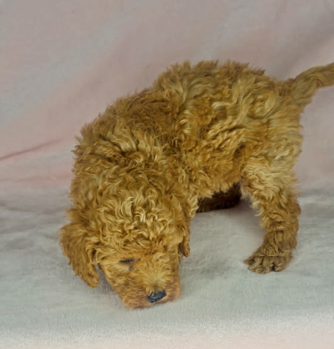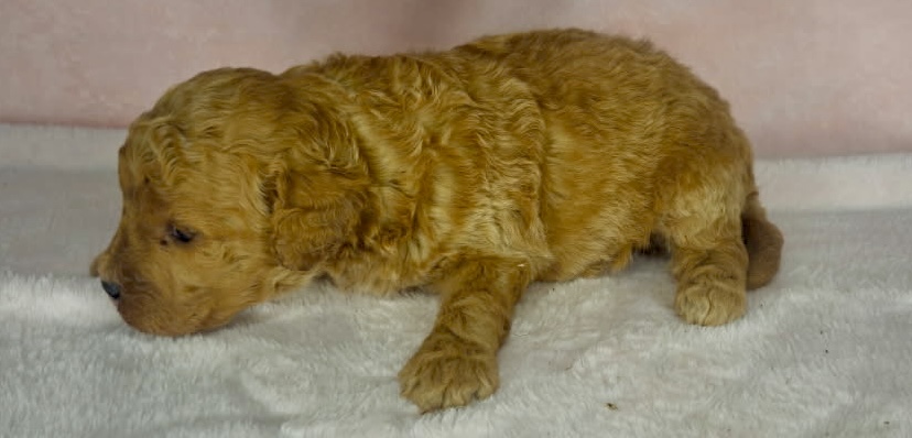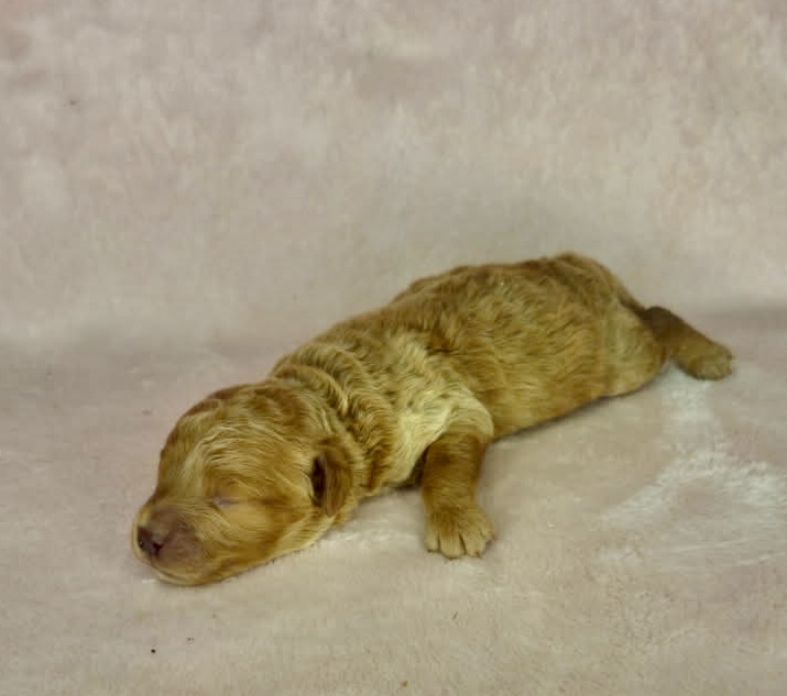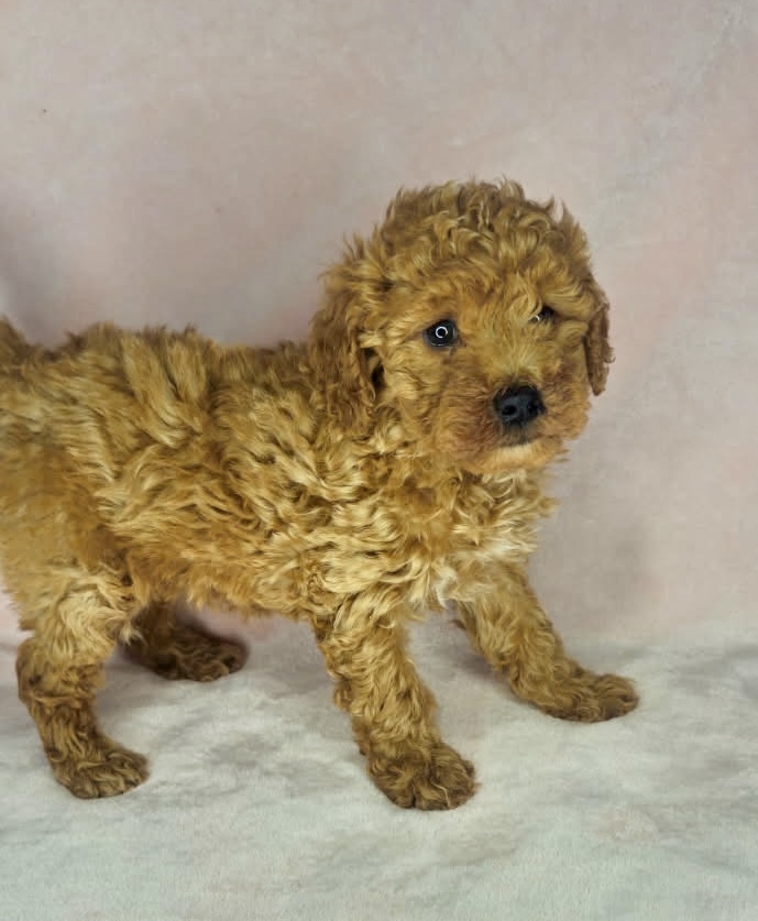 Gin is from our Gin and Tonic Litter. She is a honey carmel color that is called apricot. She has a wavy coat. She is an F1b which is probably the most popular generation of mini goldendoodle and they have good odds of not shedding. They were born December 17th.