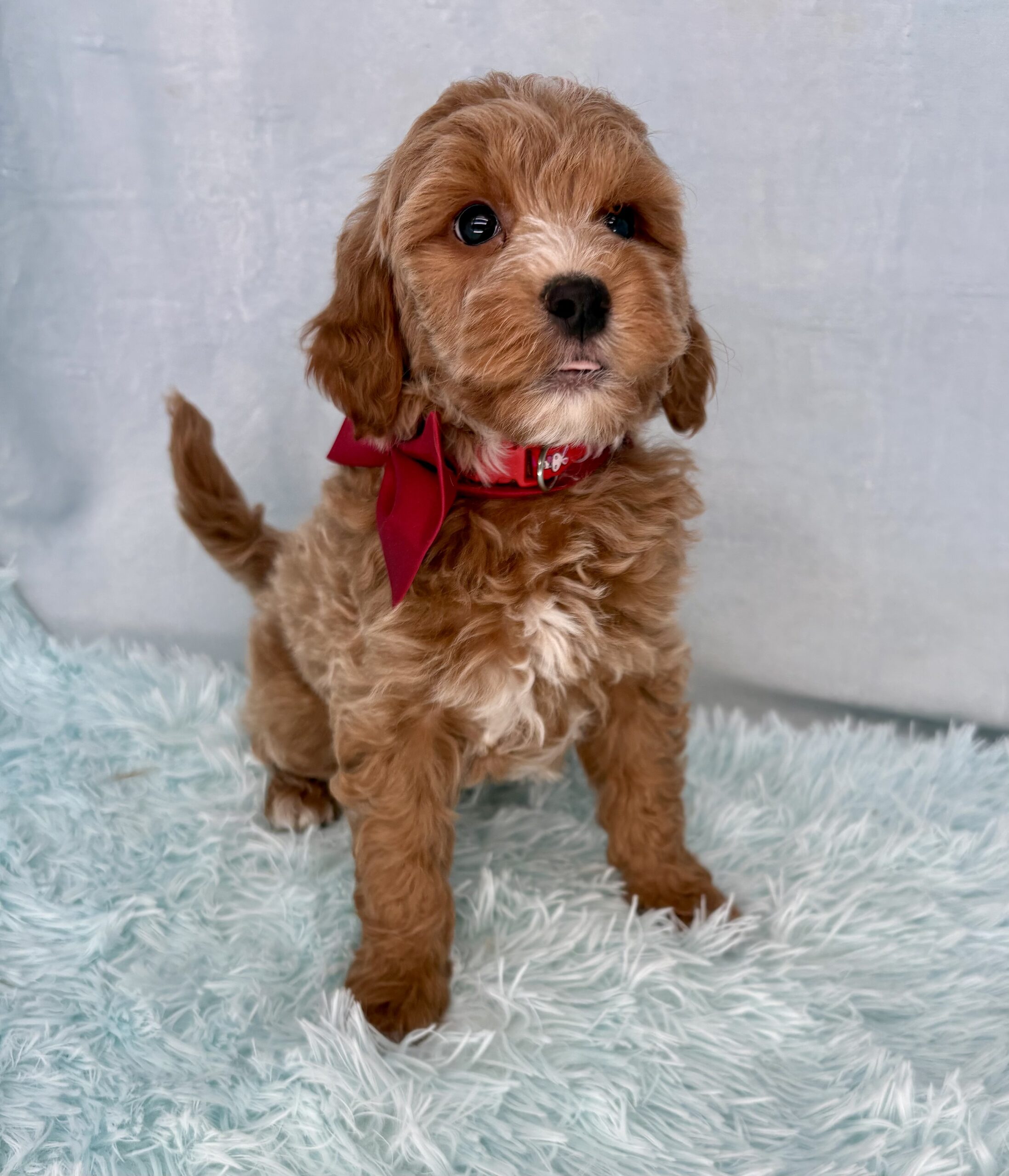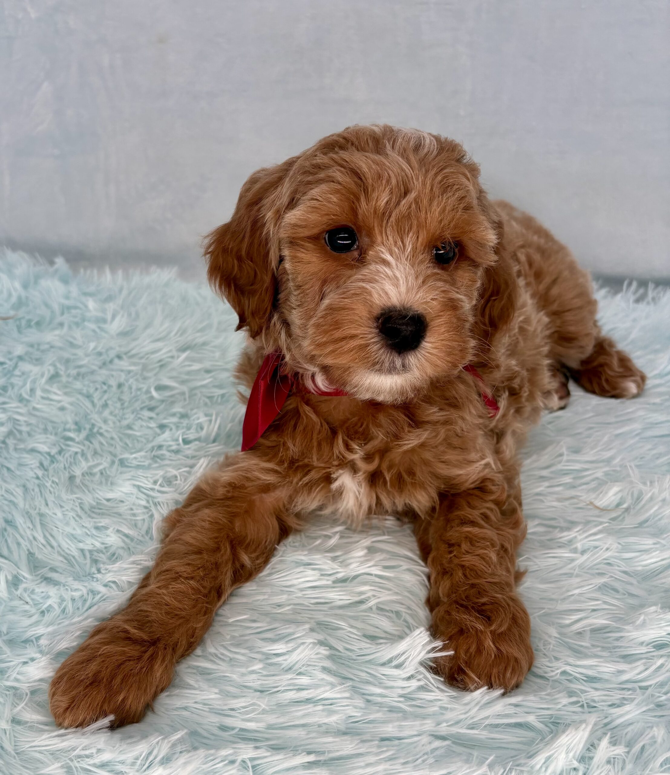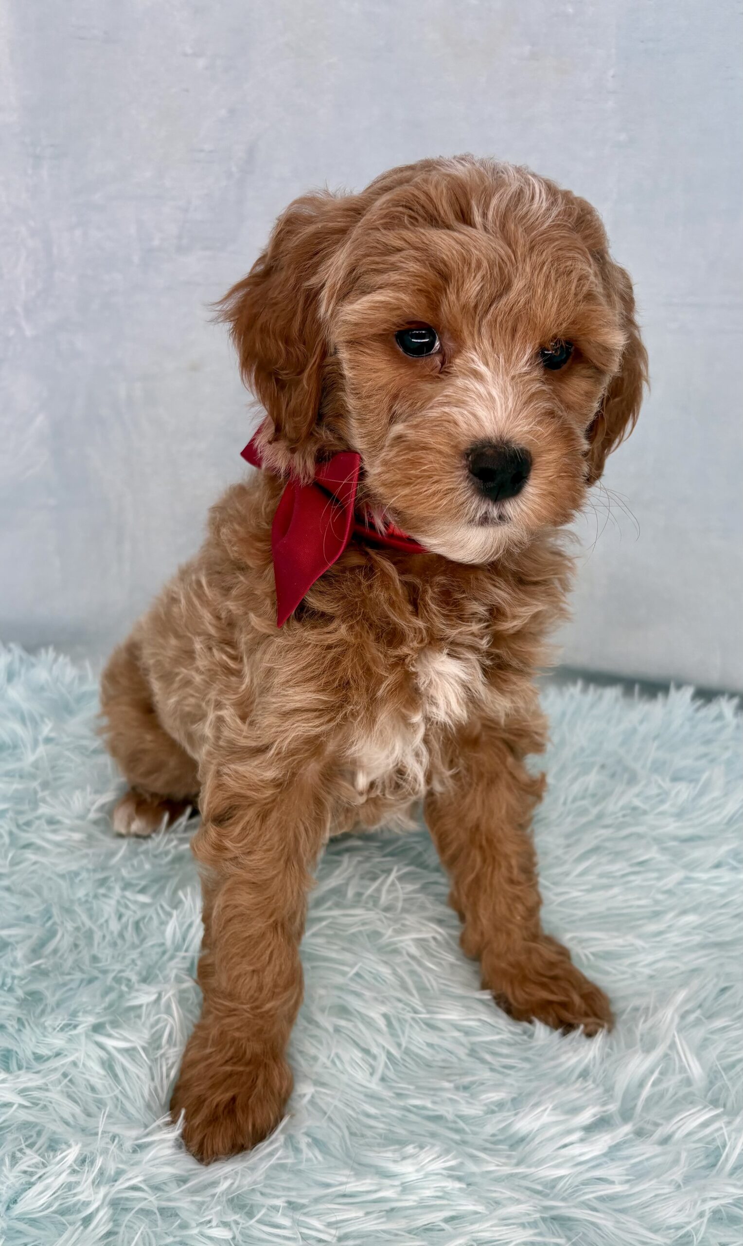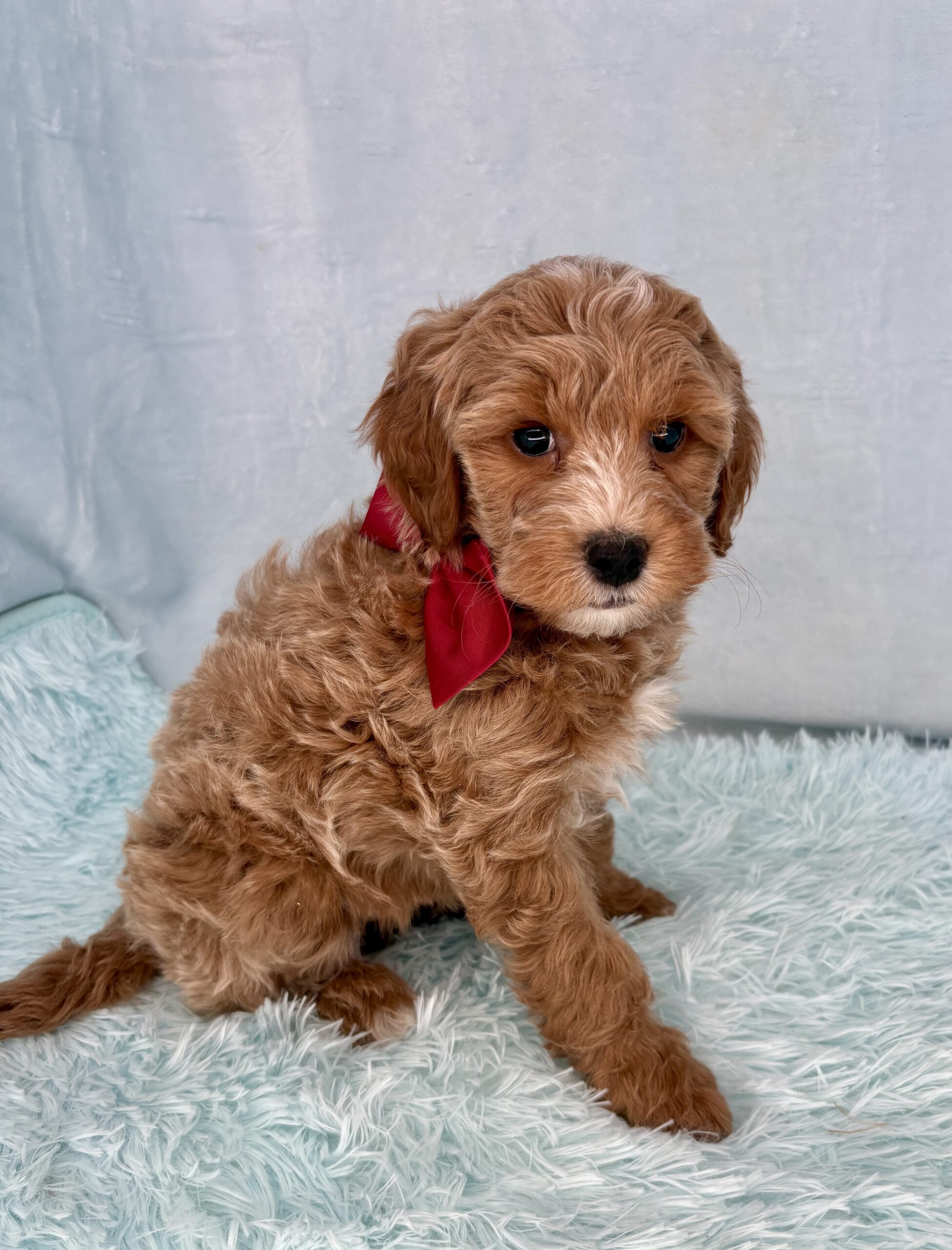 Iron Ore is from our Tannehill themed F1bb generation litter. He is an apricot or dark blonde mini goldendoodle with a curly coat. Both parents of this litter have two dominant furnishings so they are all great choices for allergy sufferers and will not shed. They were born February 10th and 8 weeks old April 7th.