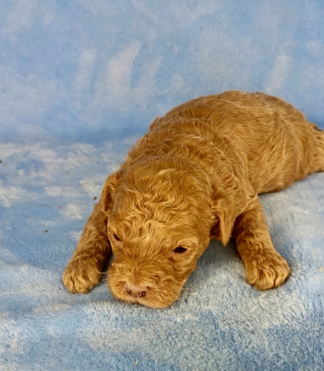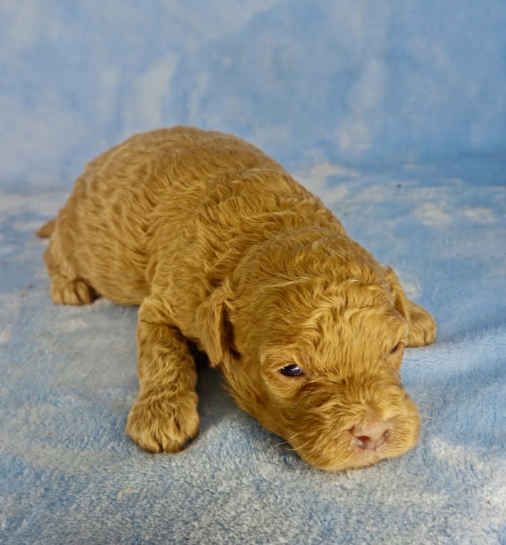 Jinx is from our May-Hem litter and is an F1b Cavapoo. They are a cross of King Charles Cavalier Spaniel and mini Poodle. With this litter mom is a 50/50 mix called F1 and dad is our red mini poodle boy Zake. They will all have curly coats and have good odds of being non-shedding. They will mature in the teens to mid 20’s but be short stocky little dogs. They were born March 18th 2026 and will be ready to go mid to late May.