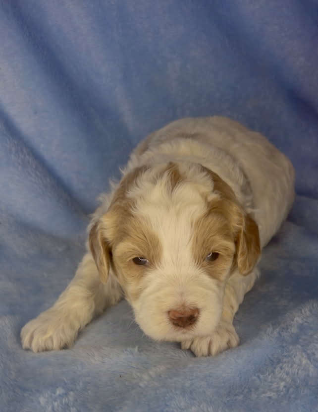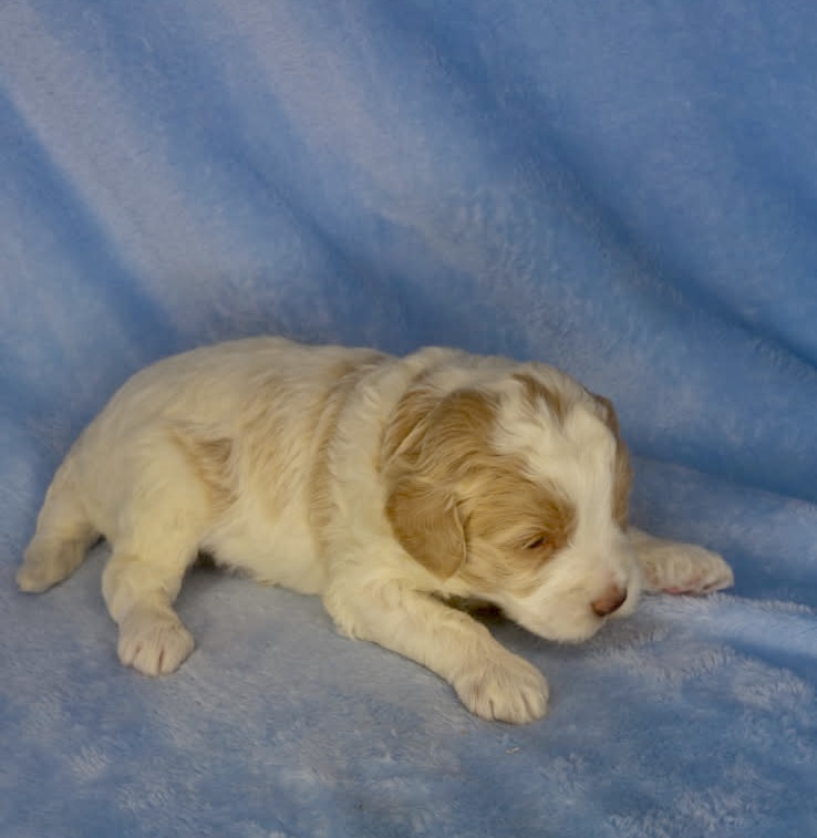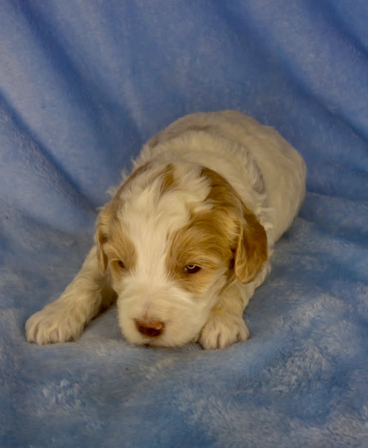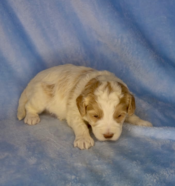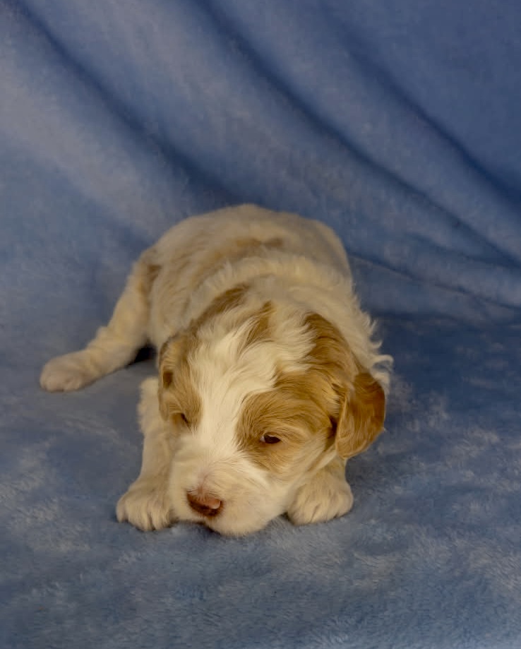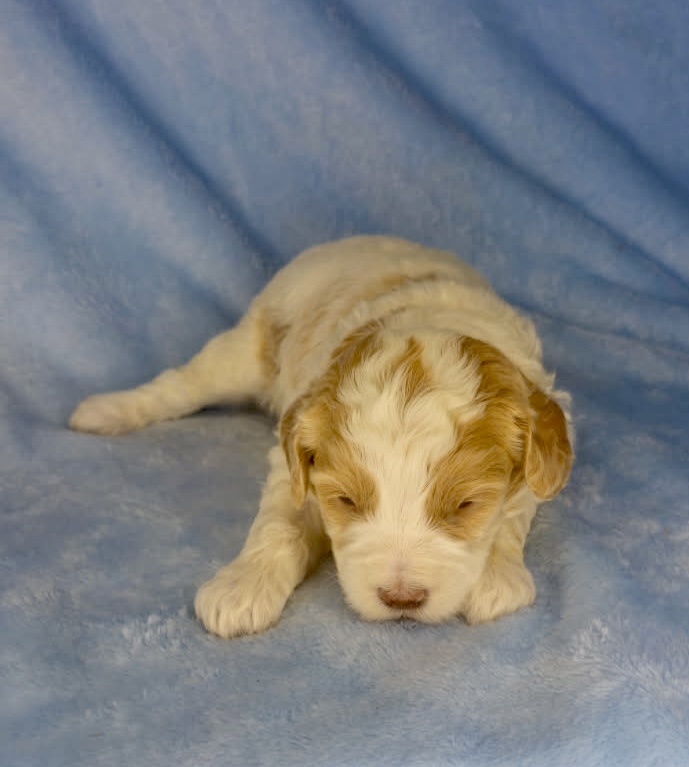Jubilant is from our Christmas Spirit Litter.  He is a red and white parti mini goldendoodle and will have a wavy coat.  Past puppies from these two parents have matured 18-25 pounds.