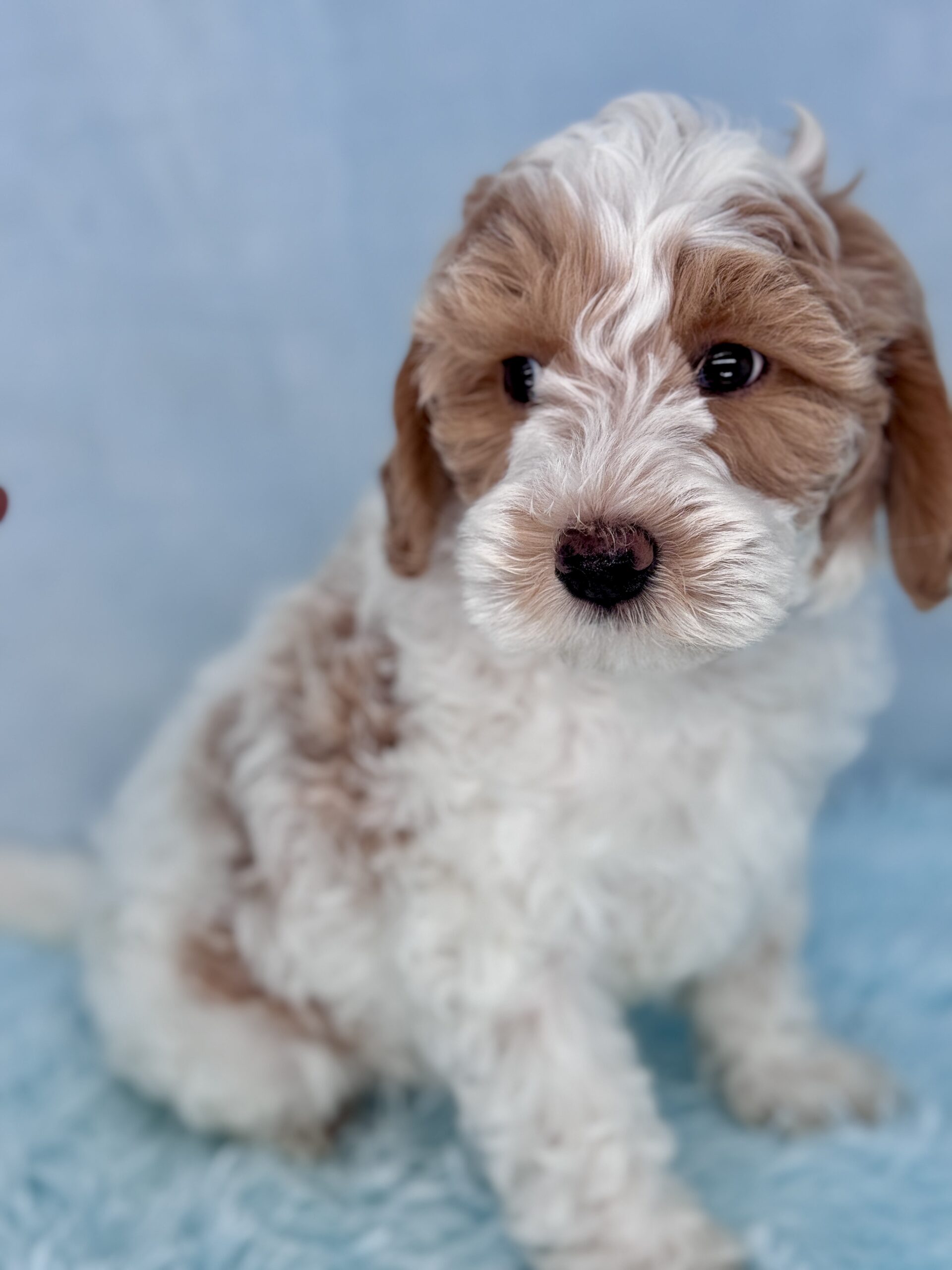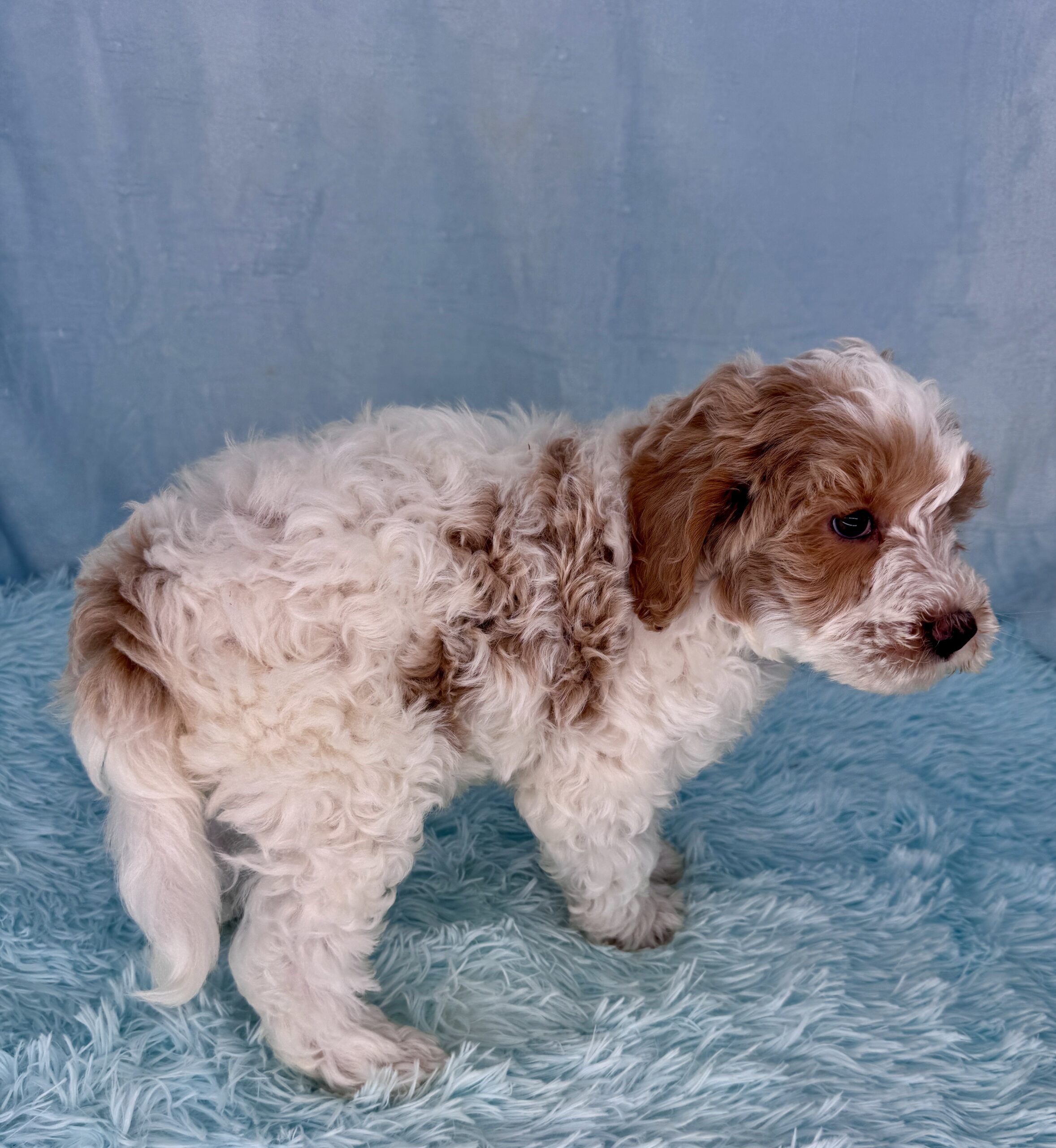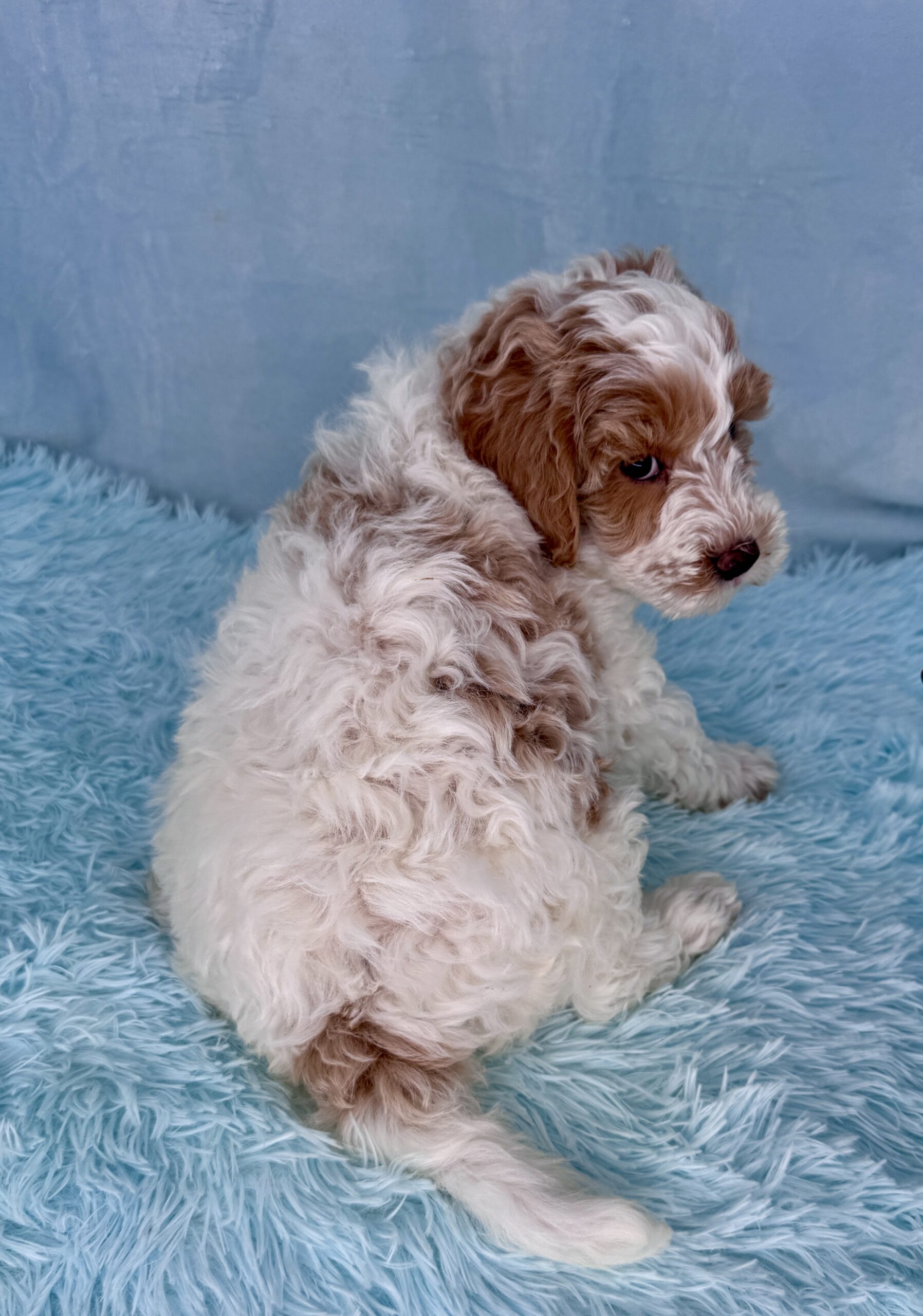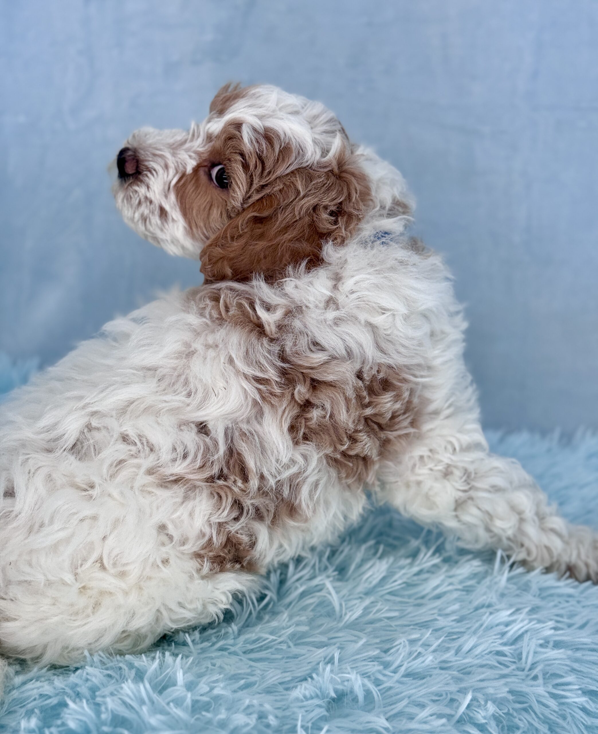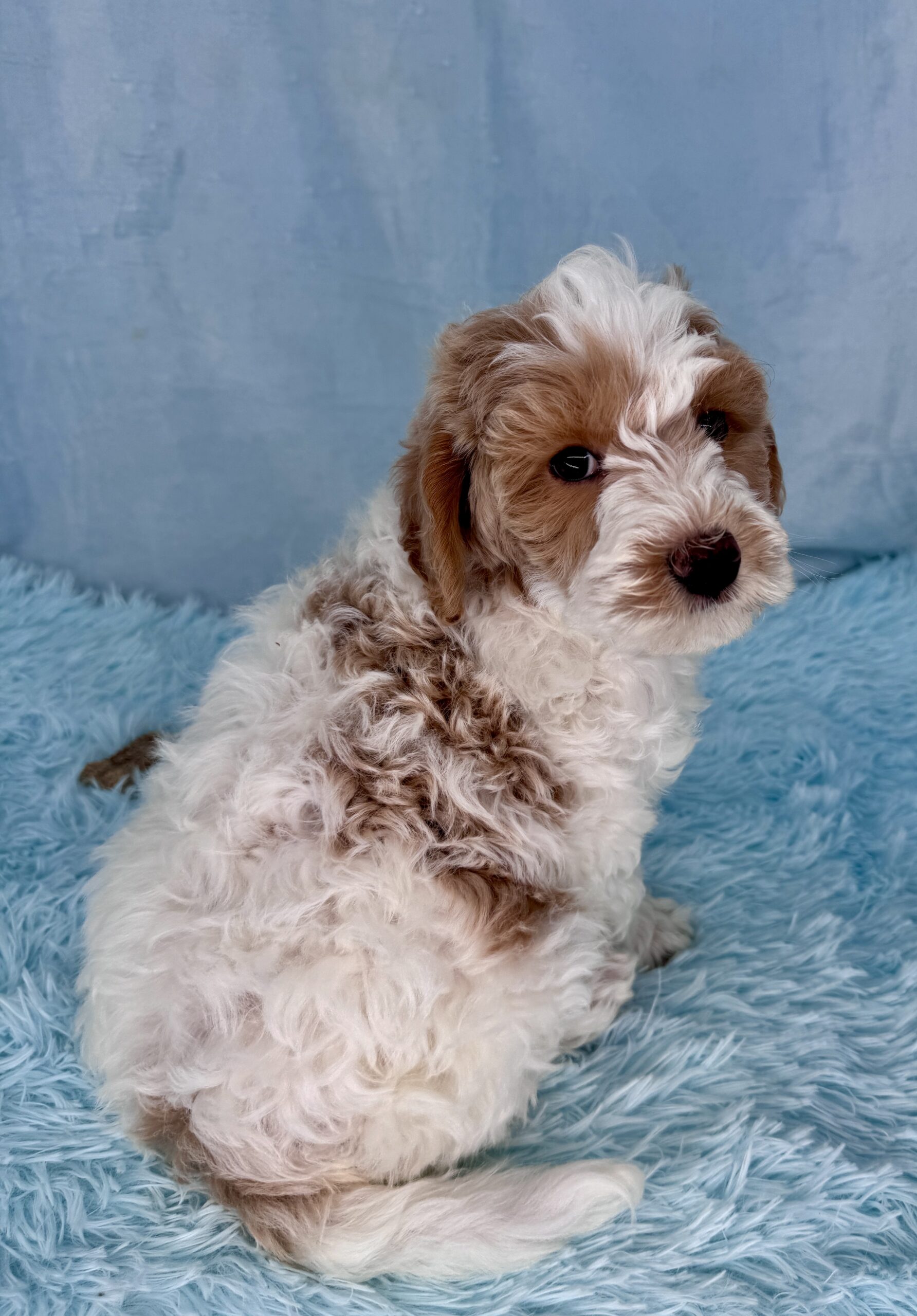 Jubilant is from our Christmas Spirit Litter. He is a red and white parti mini goldendoodle and will have a wavy coat. Past puppies from these two parents have matured 18-25 pounds.