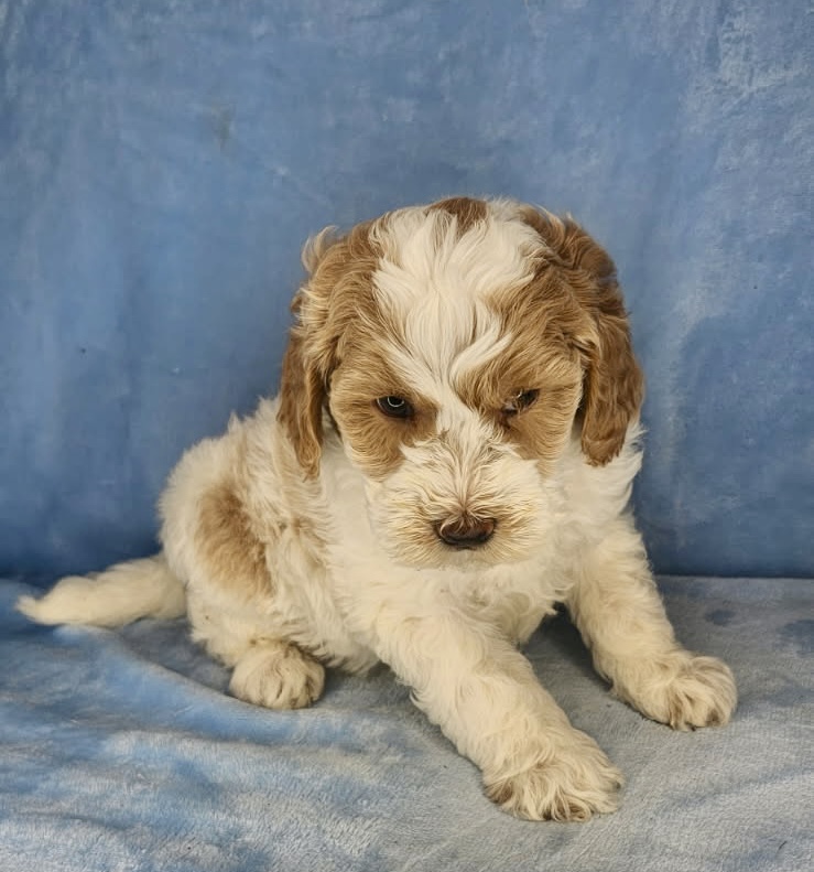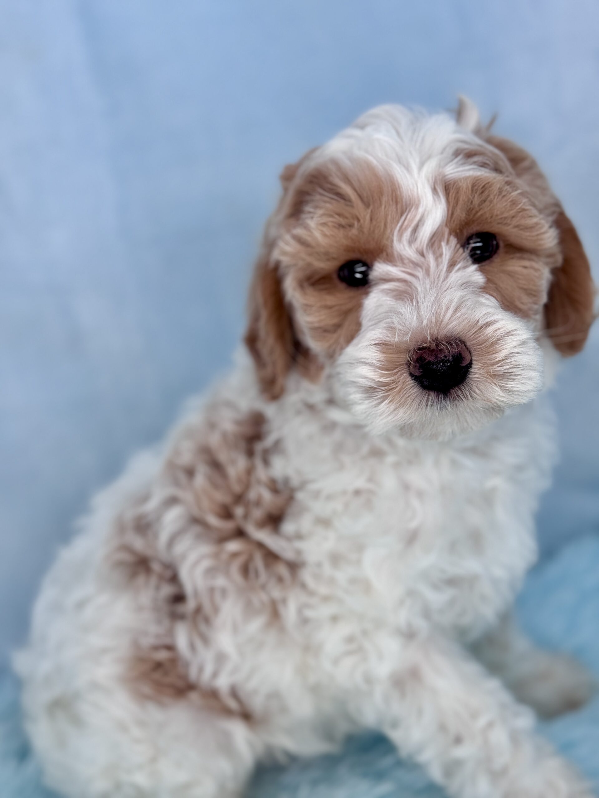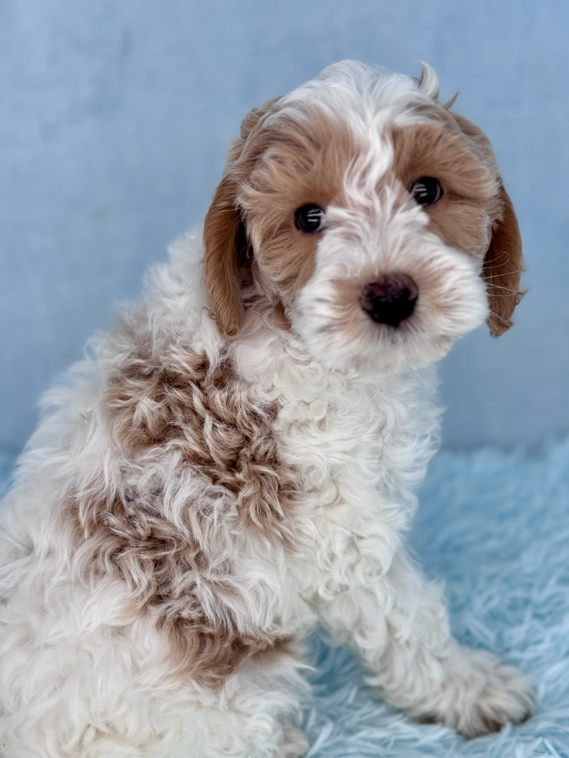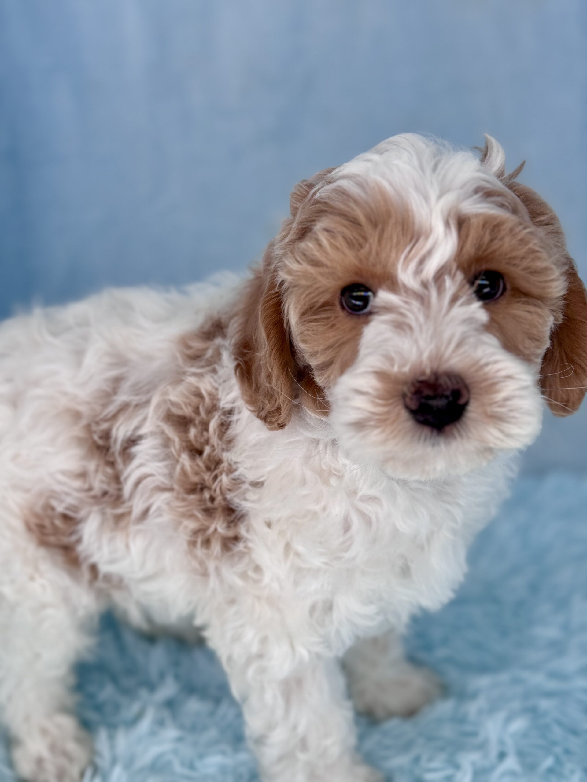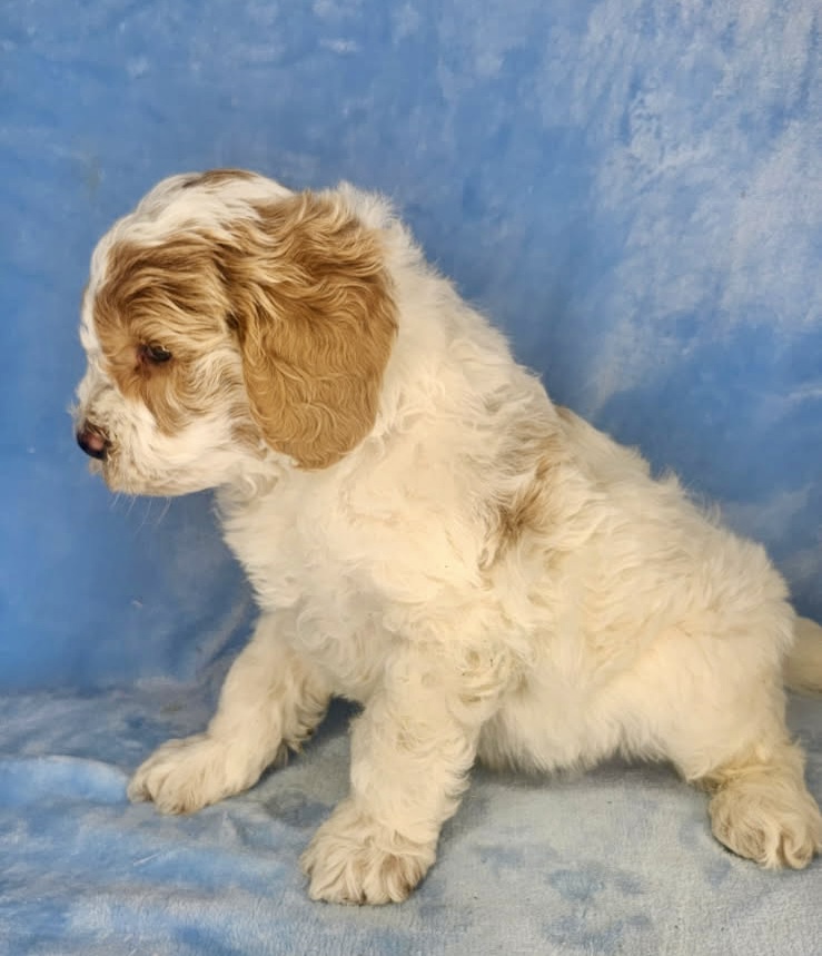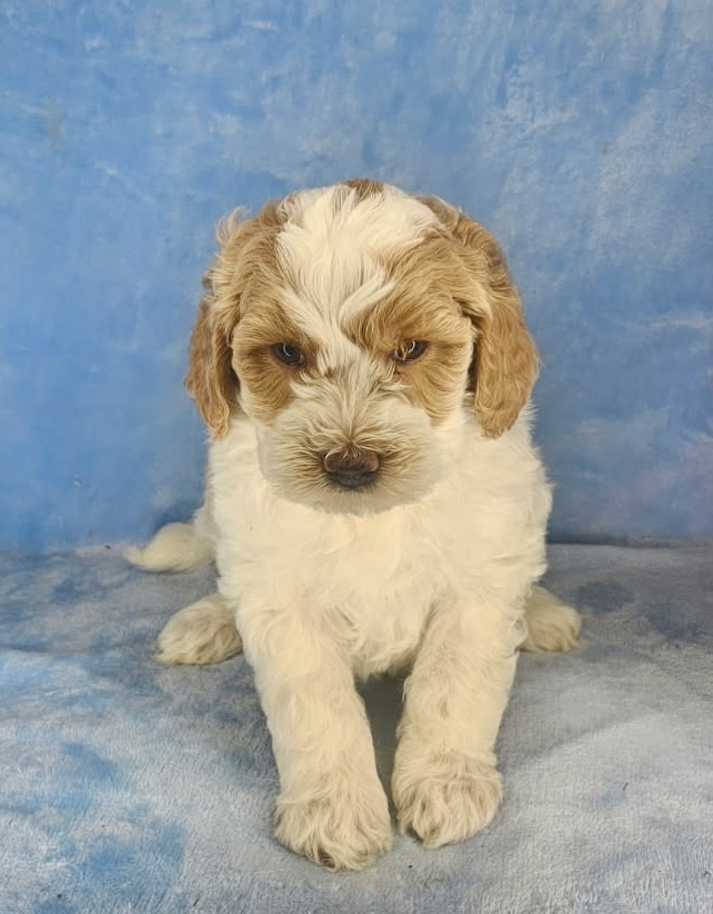 Jubilant is from our Christmas Spirit Litter. He is a red and white parti mini goldendoodle and will have a wavy coat. Past puppies from these two parents have matured 18-25 pounds.