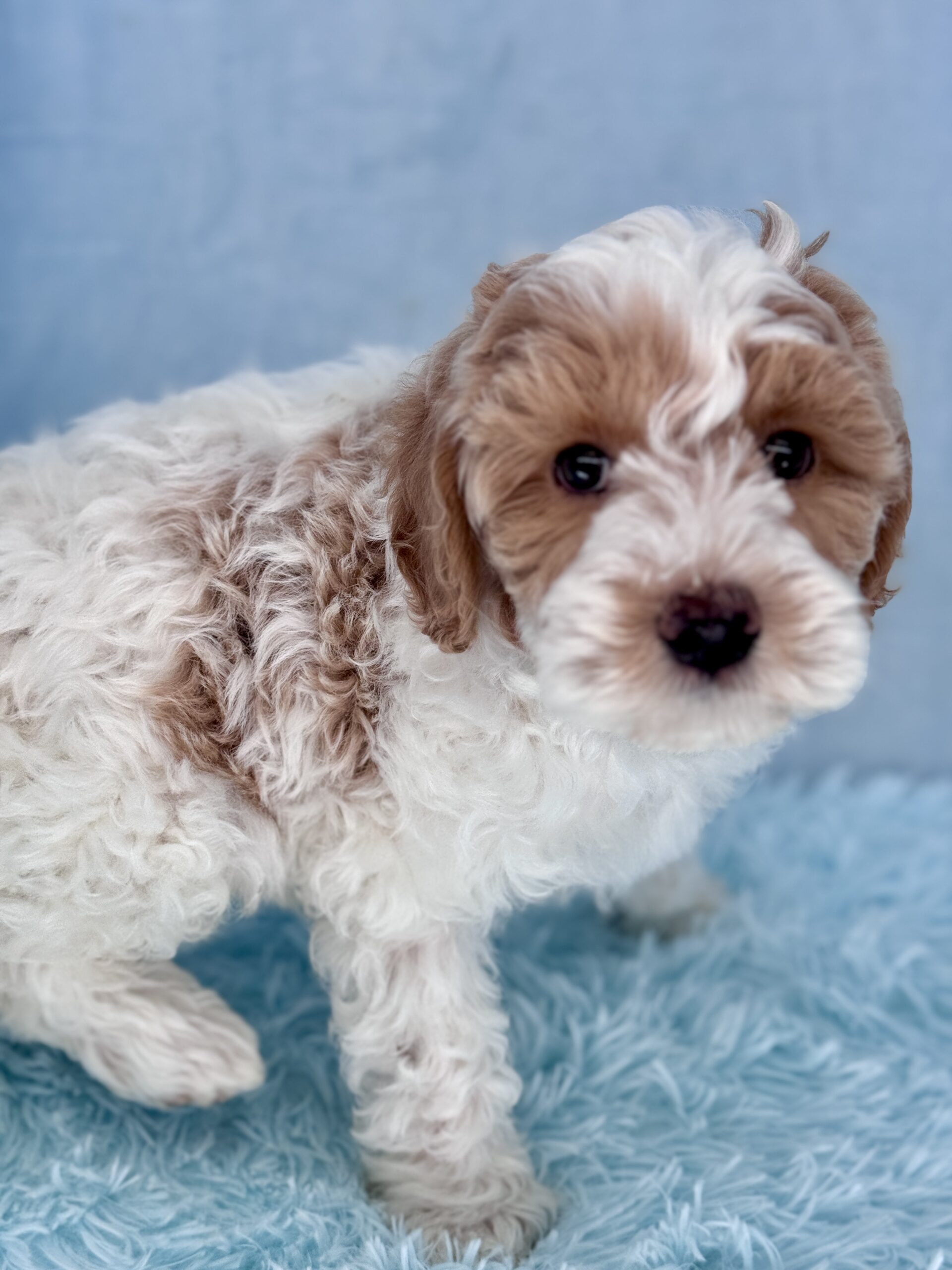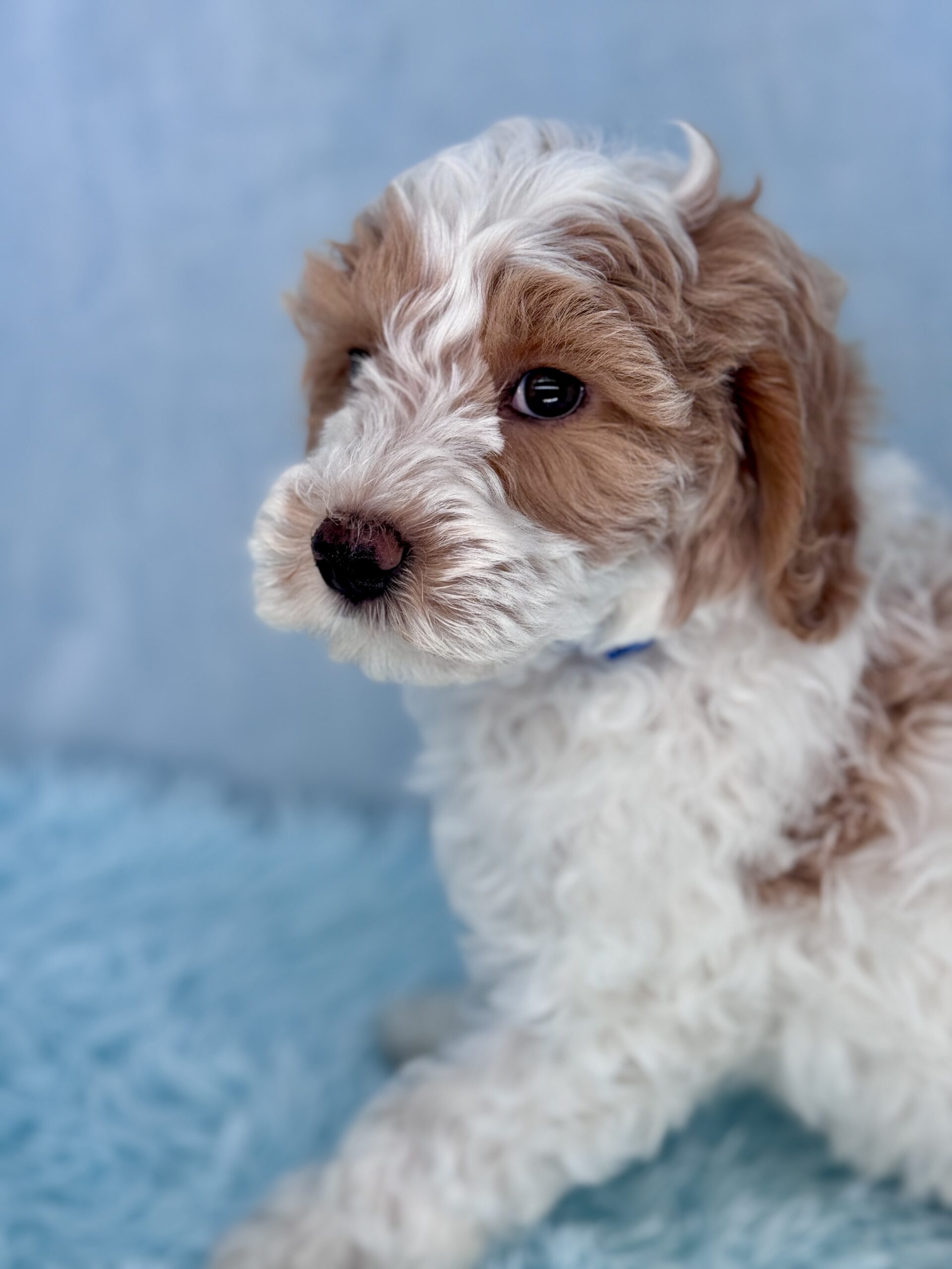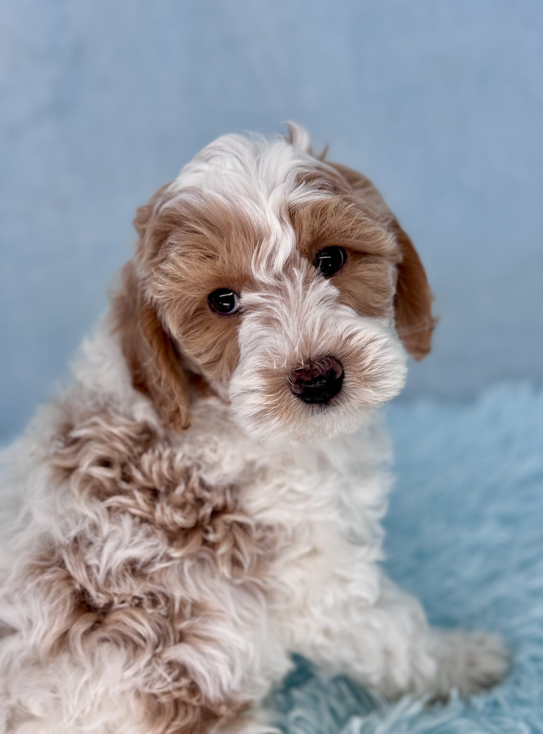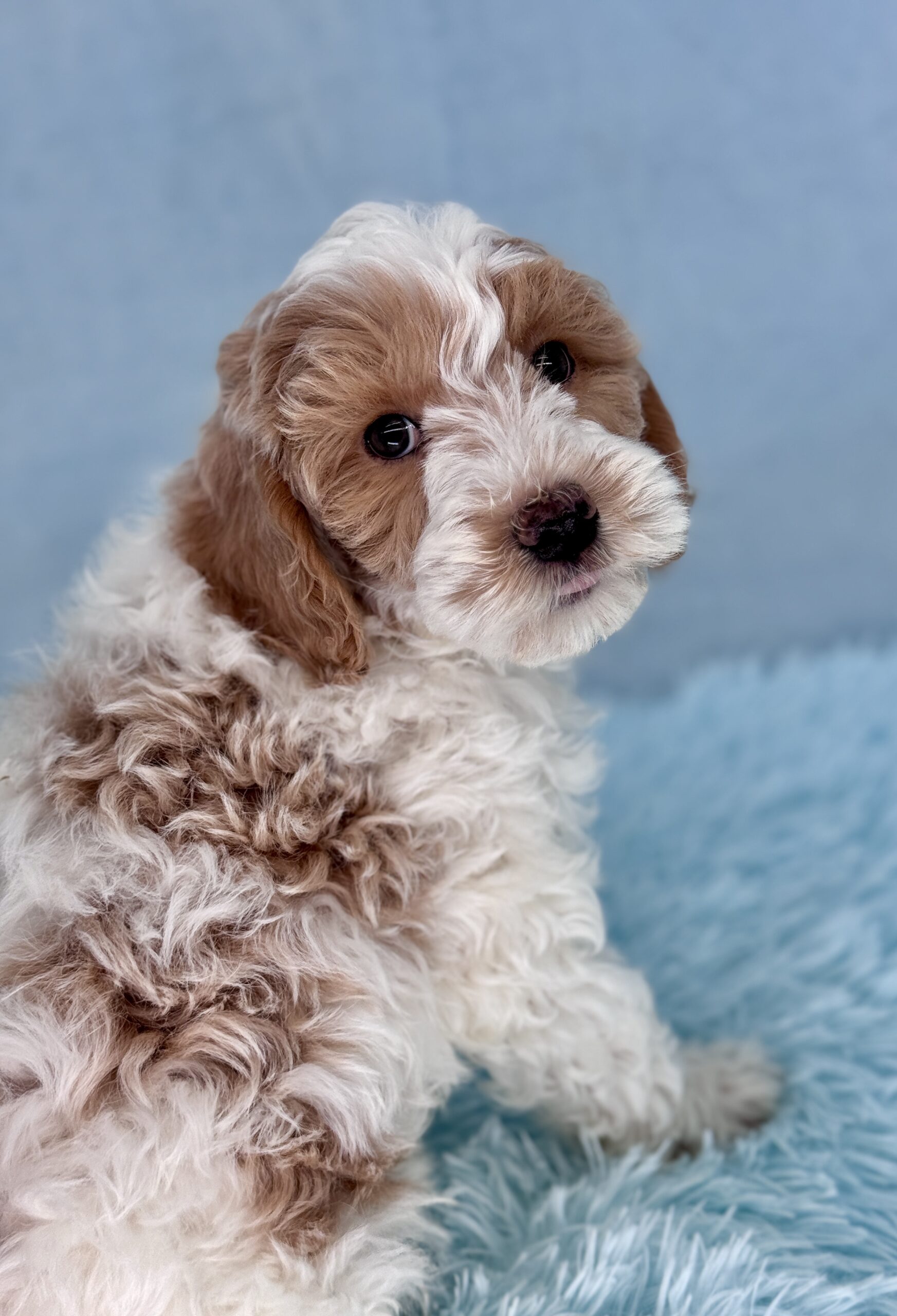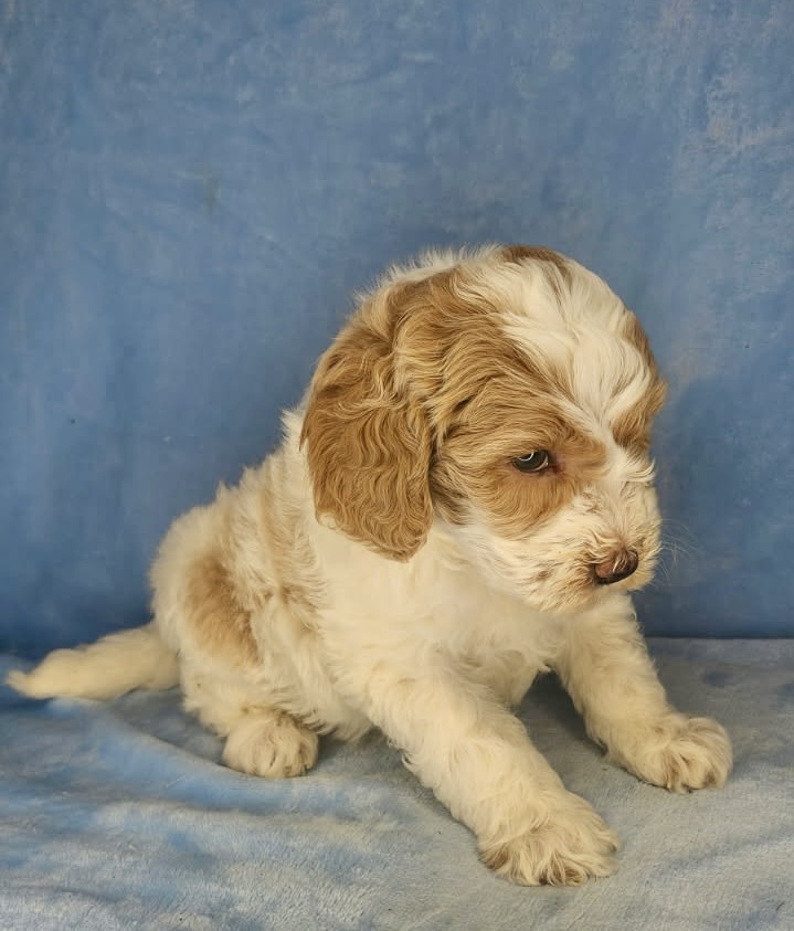 Jubilant is from our Christmas Spirit Litter. He is a red and white parti mini goldendoodle and will have a wavy coat. Past puppies from these two parents have matured 18-25 pounds.