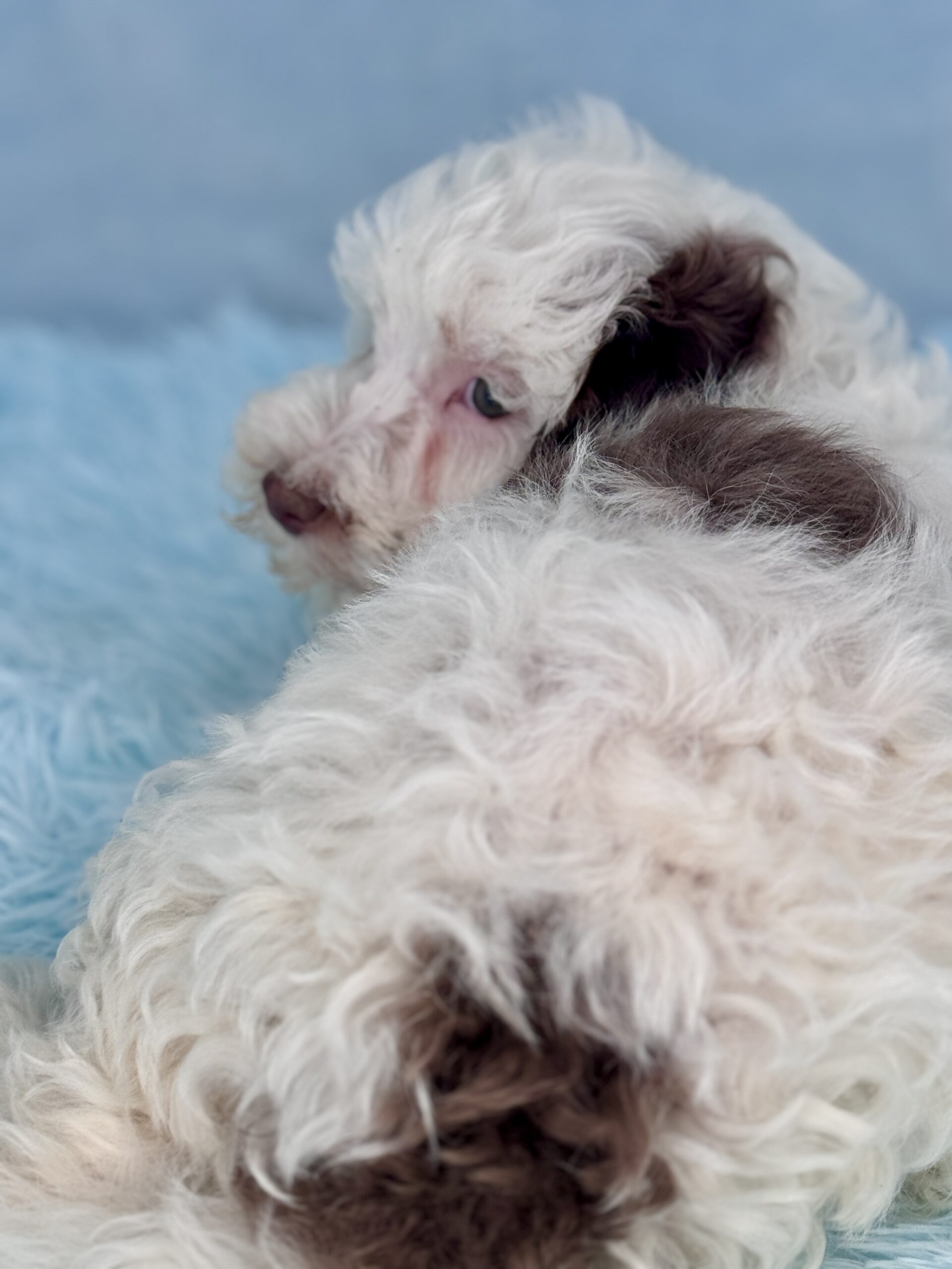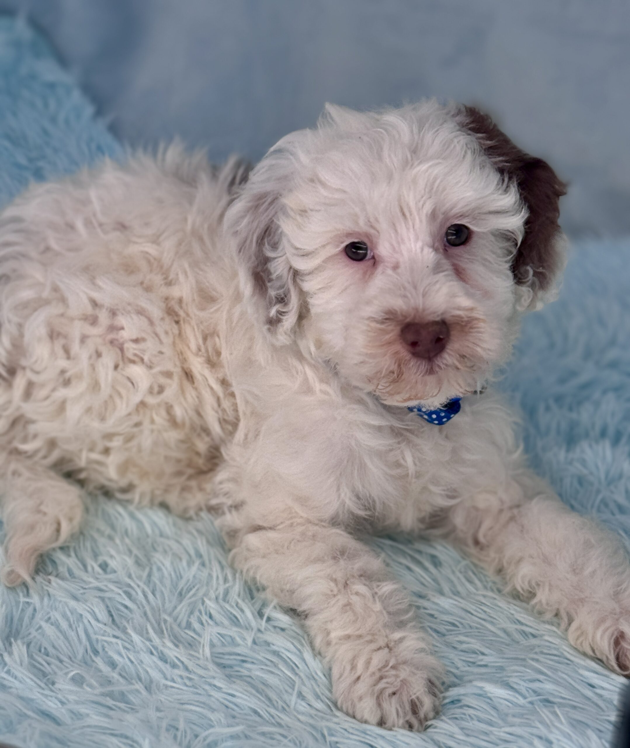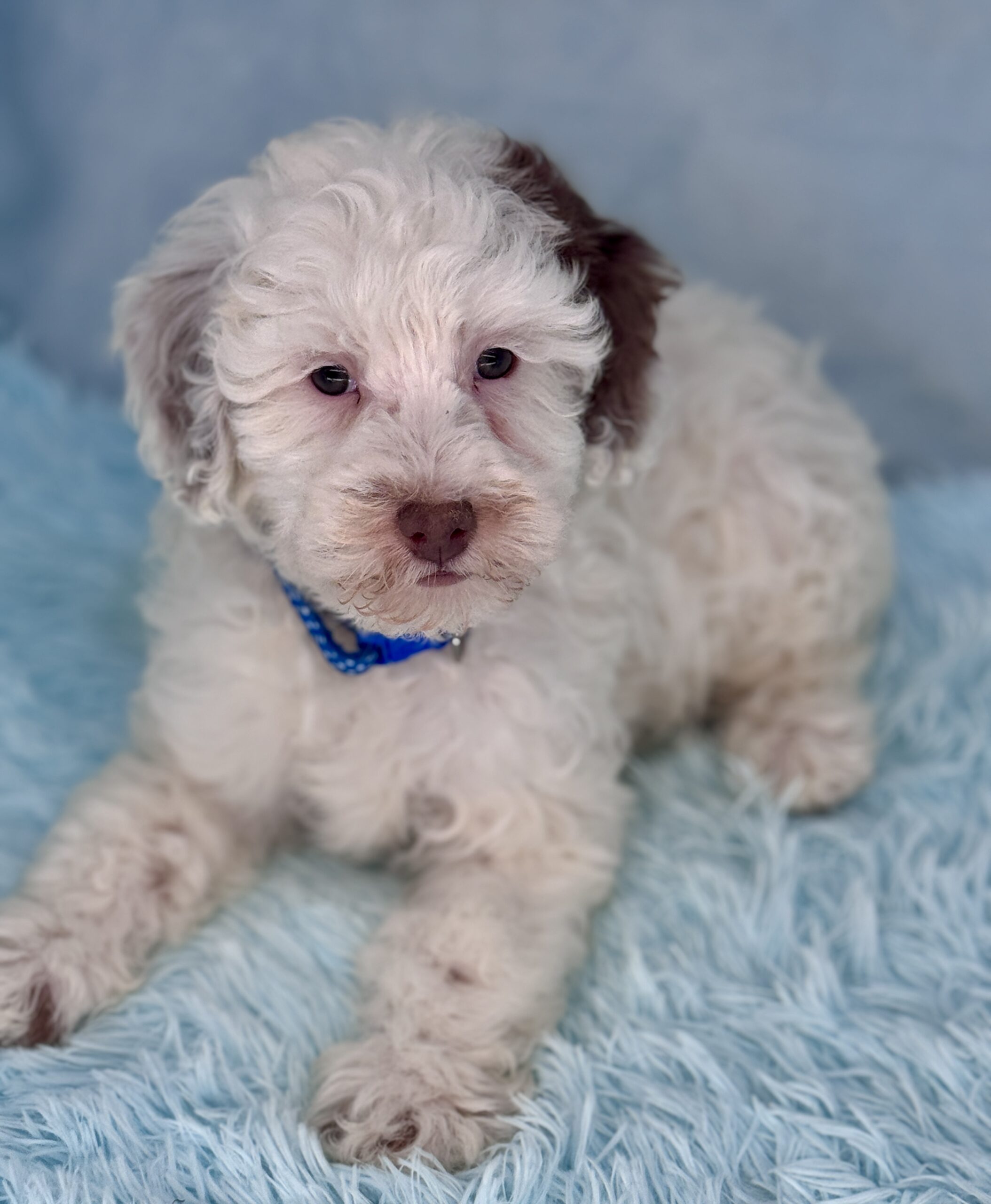 Kong is from our Mahjong Sets Litter. He is a chocolate merle part mini goldendoodle. He will have a nice wavy coat that is non-shedding coat. Past puppies from these two parents have matured 20-25 pounds.
