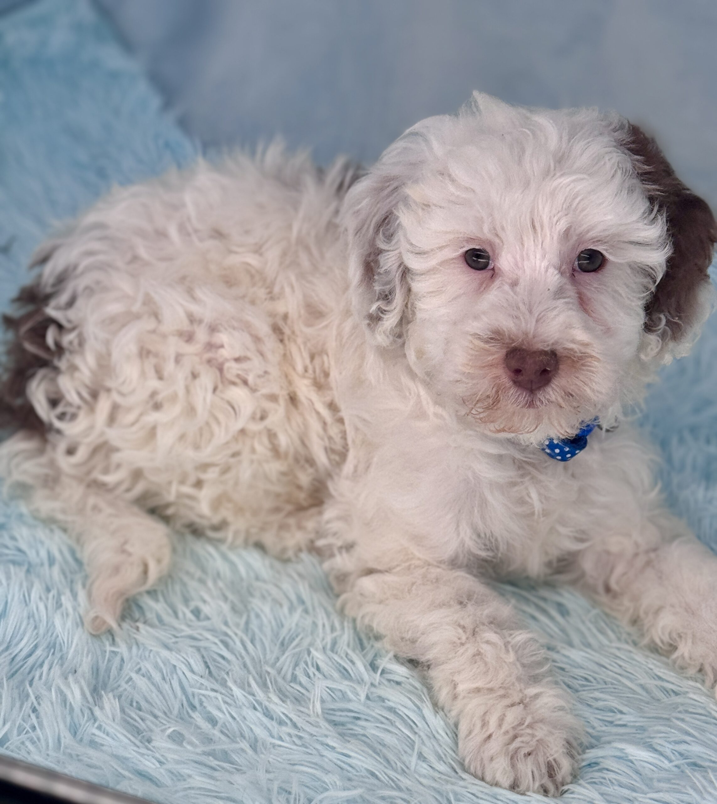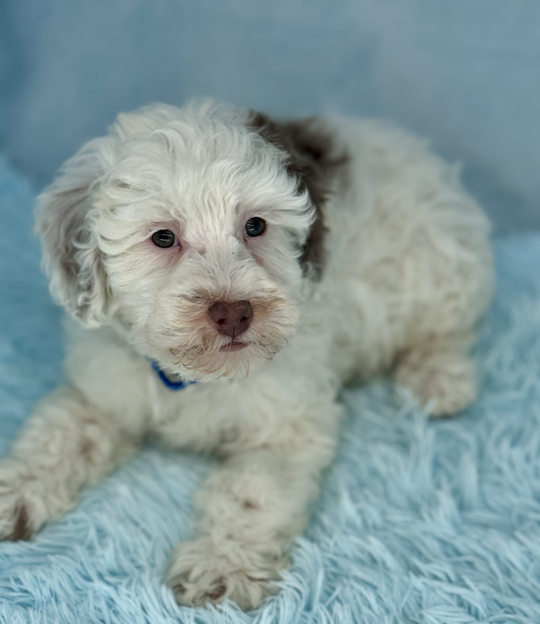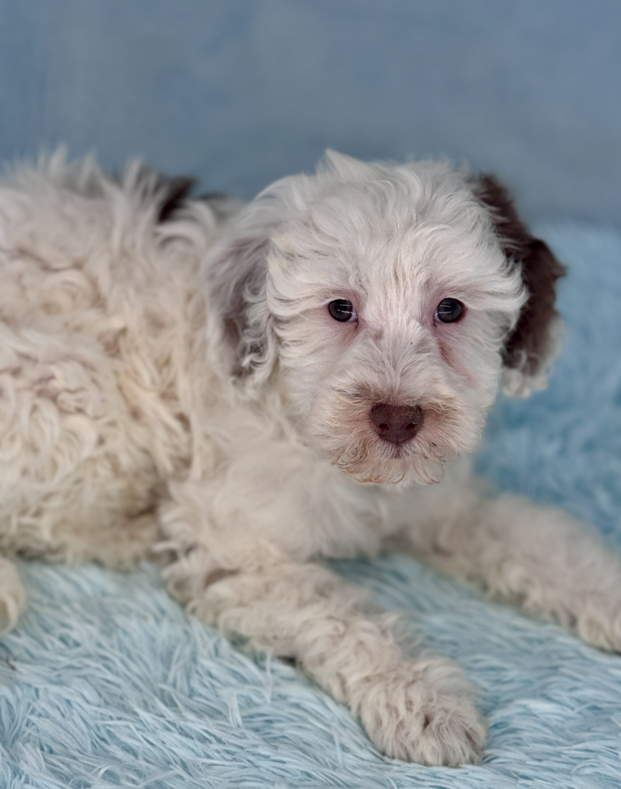 Kong is from our Mahjong Sets Litter. He is a chocolate merle part mini goldendoodle. He will have a nice wavy coat that is non-shedding coat. Past puppies from these two parents have matured 20-25 pounds.