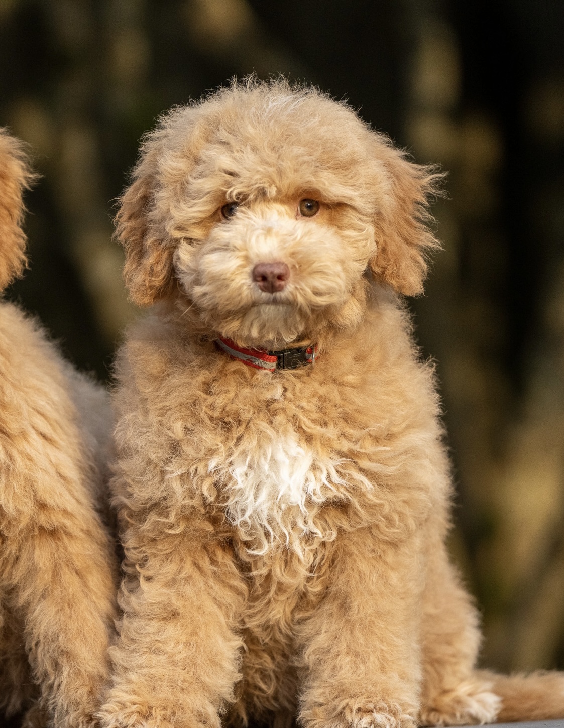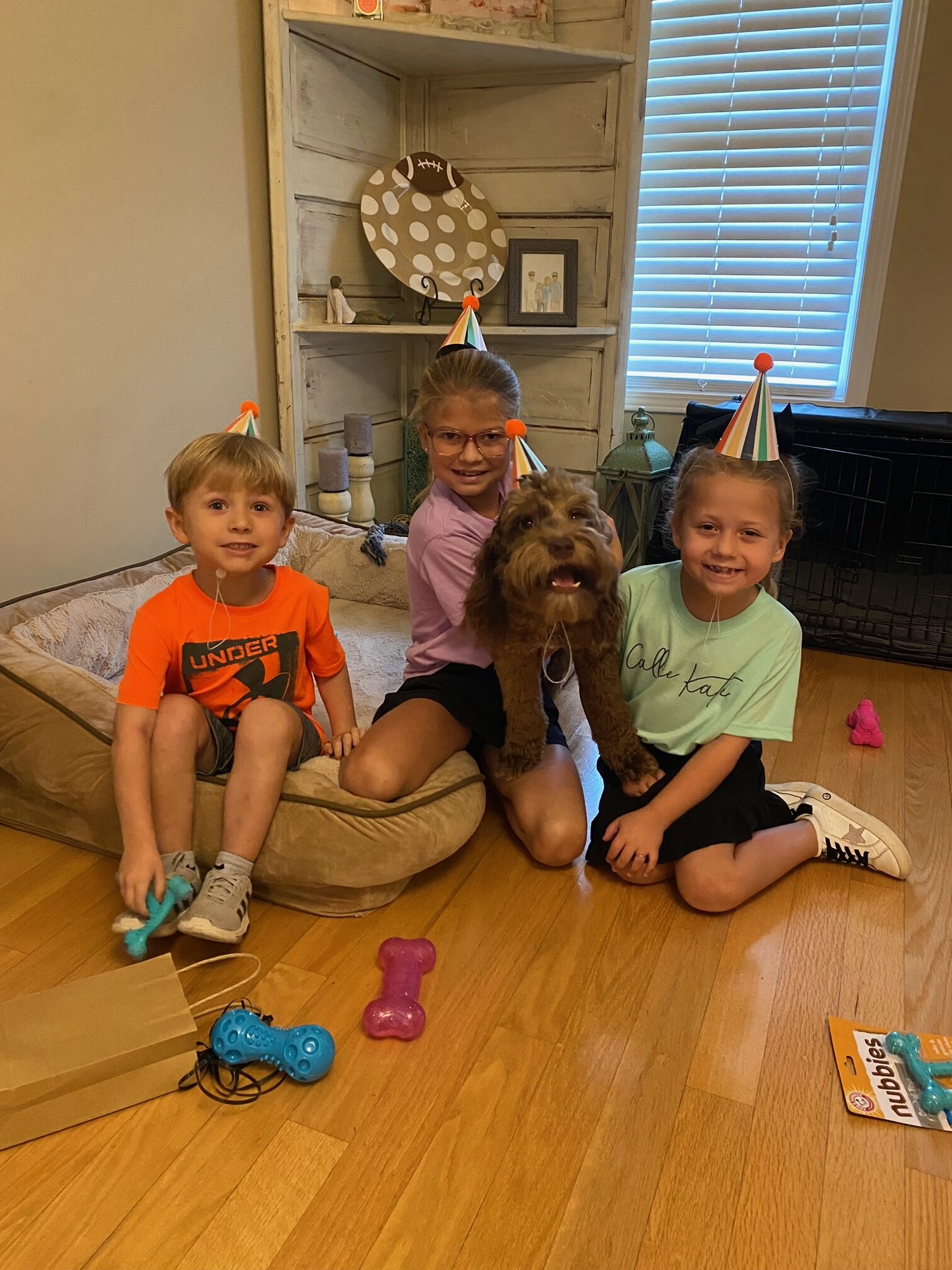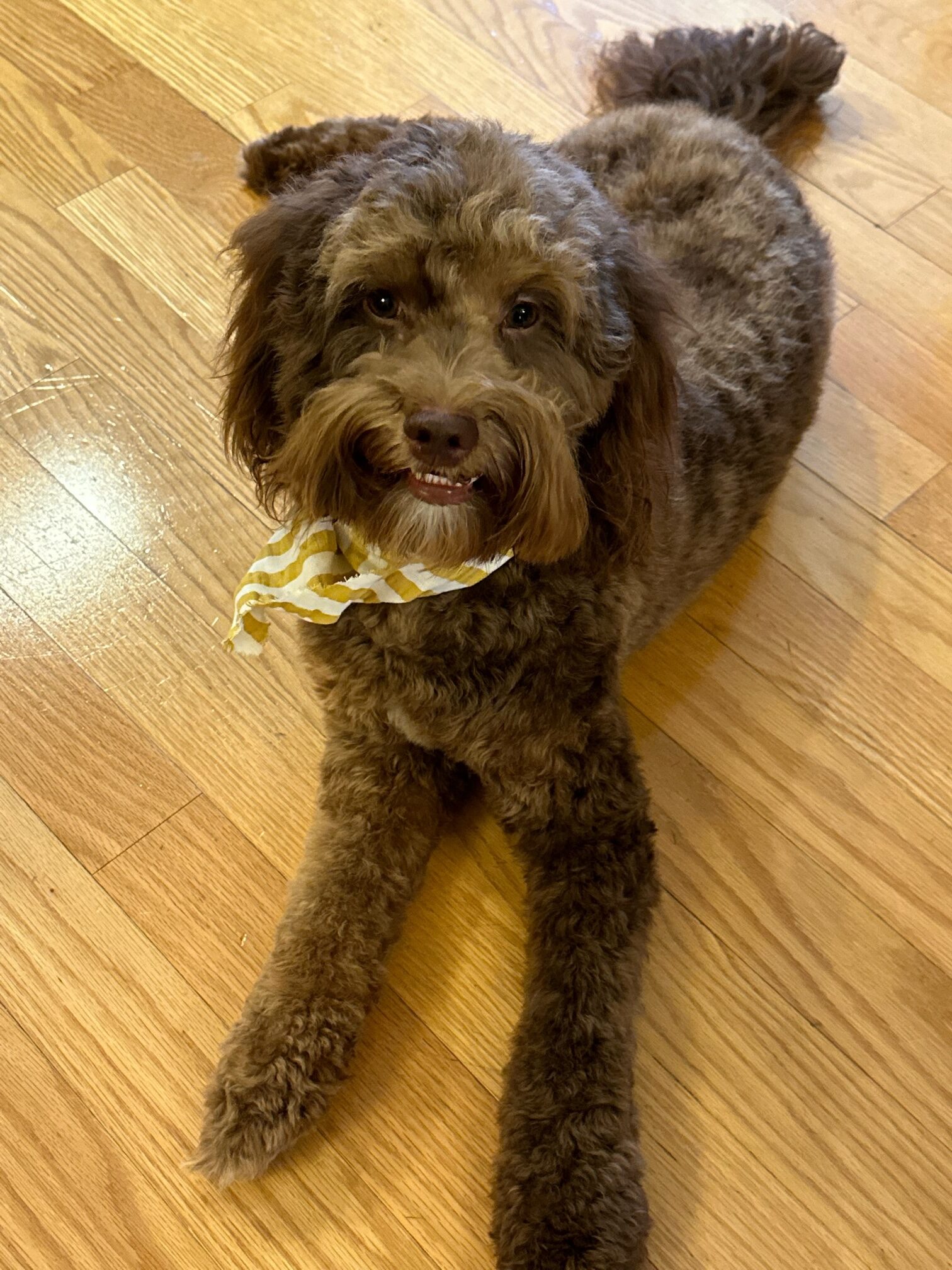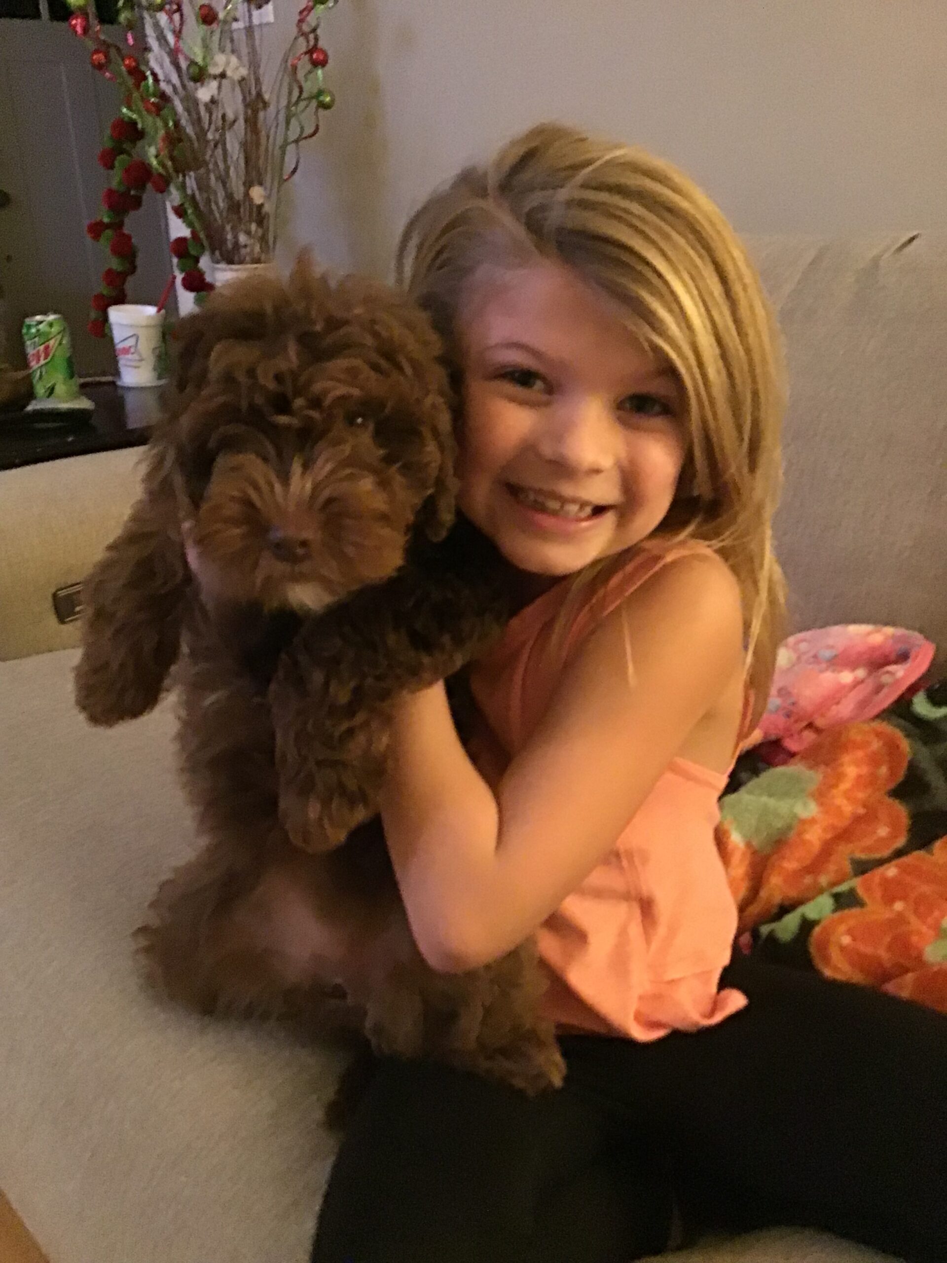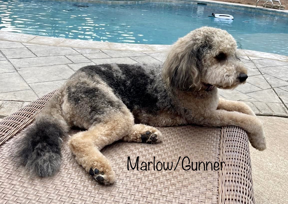 Marlow is a red f1bb mini goldendoodle.  She is the daughter of Rou and Aubie.  She is only about 20 pounds.    Genetically she only has one curl allele but as an adult she looks really curly. Marlow is a snuggly little girl that loves her human mom and grandma!  We only tested a few traits for Marlow because she is clear through parentage.