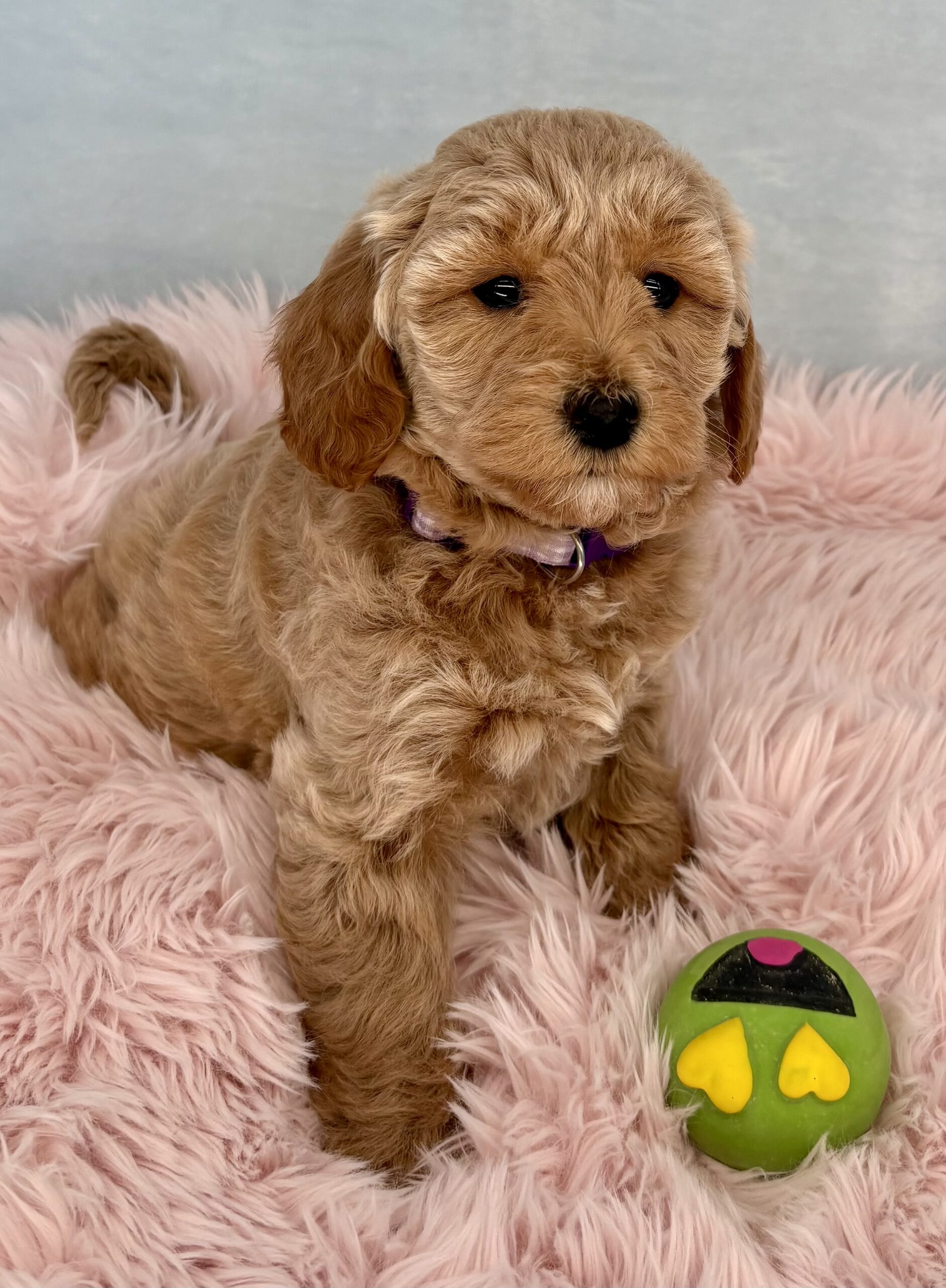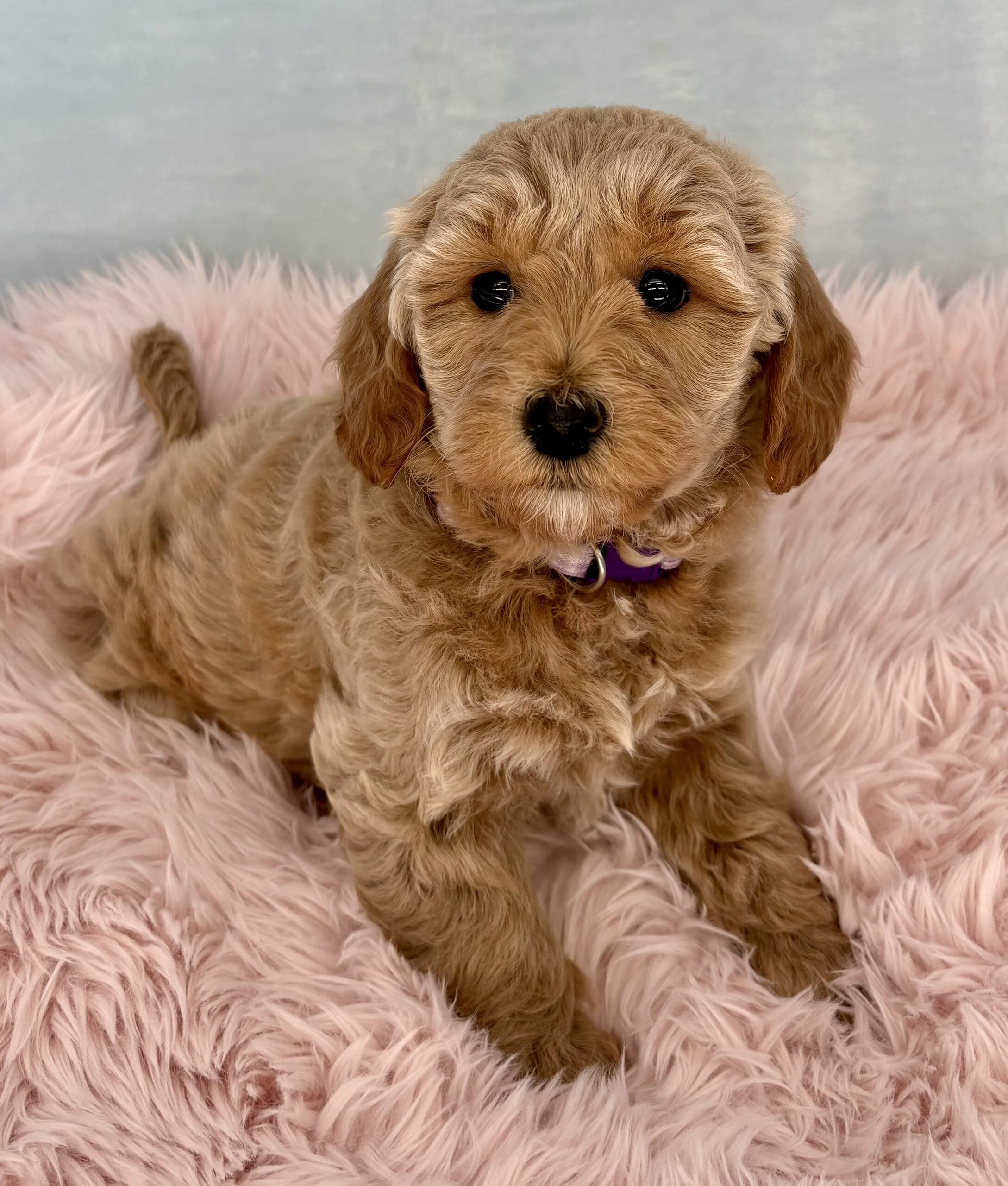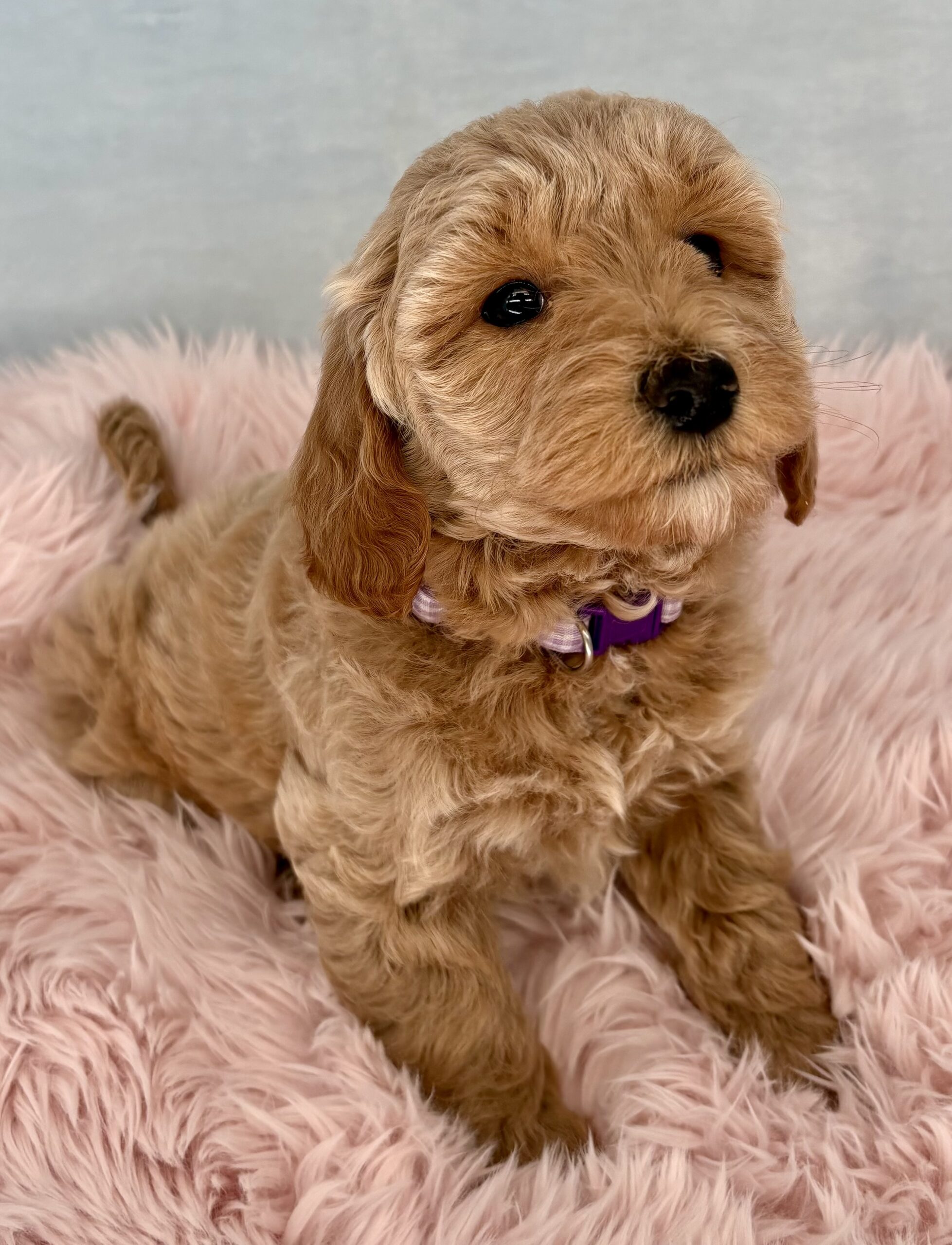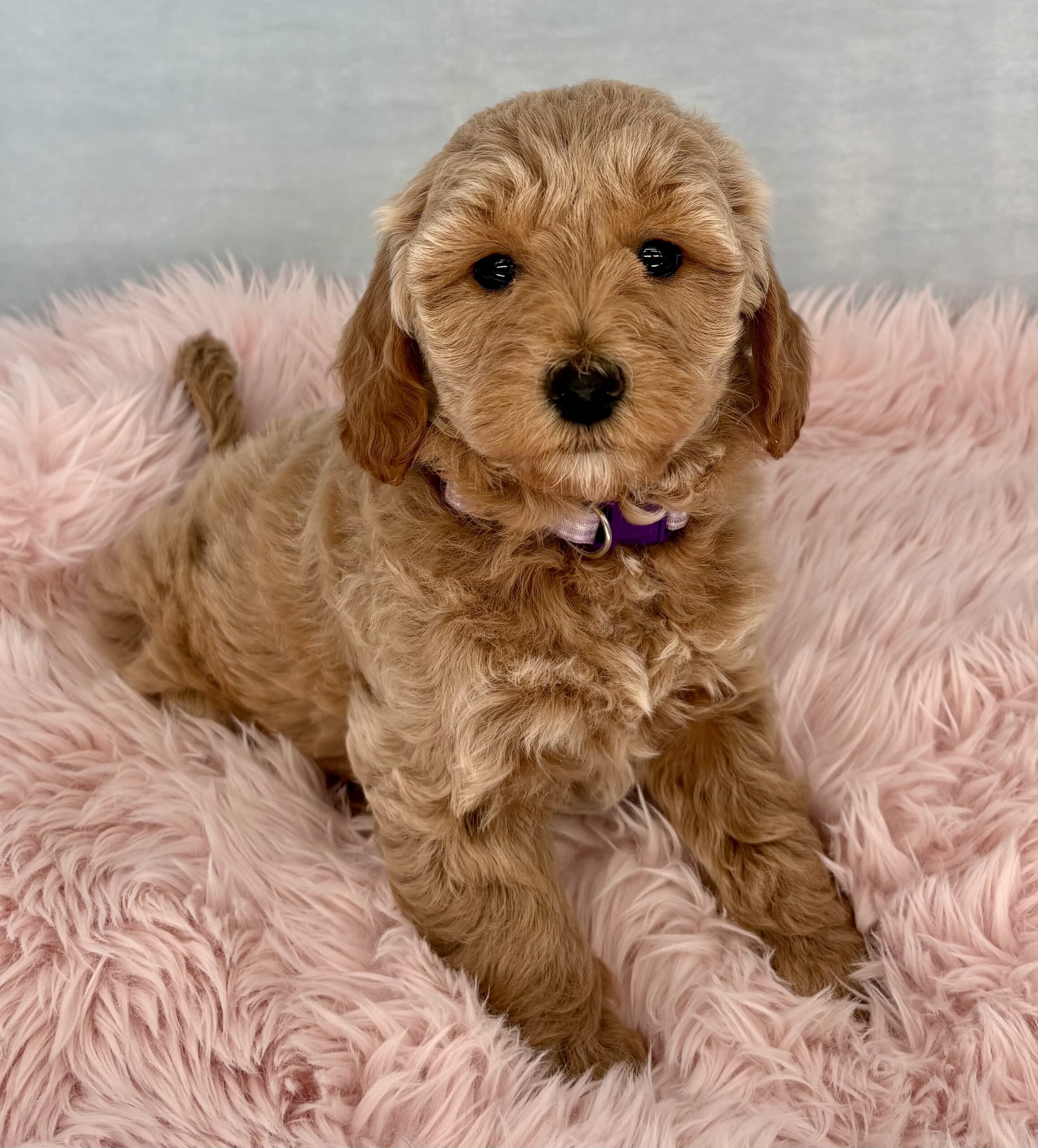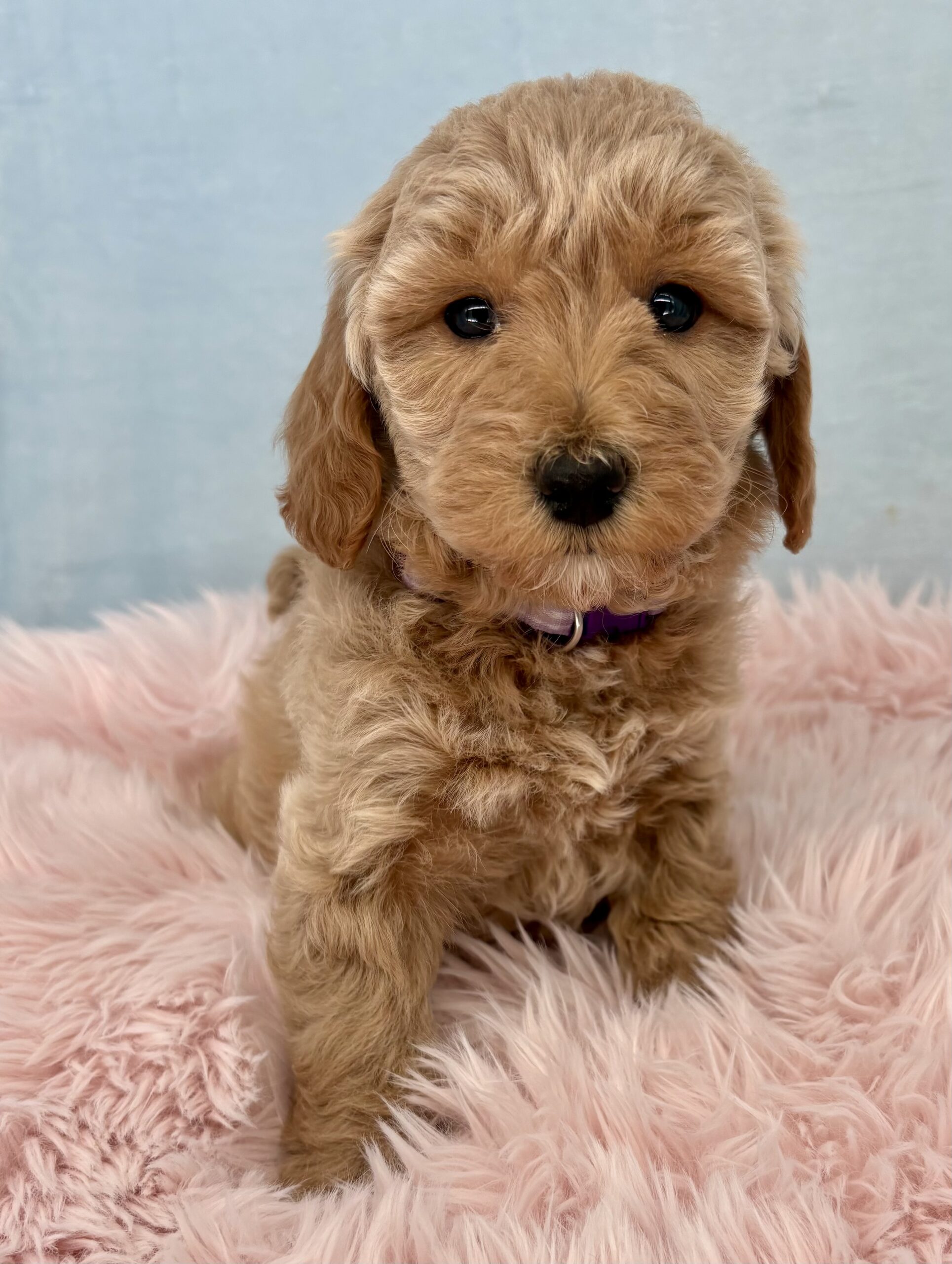 Mayflower is from the Thanksgiving Litter and she has a beautiful silky blonde coat. This litter will be 8 weeks old just before Thanksgiving. We will have wavy and possibly no curl coats (Aubie the poodle dad is unusual in that he only has one copy for curl). With both parents being small dogs, they will mature 15-20 pounds and will all have non-shedding coats. They were born September 19th.
