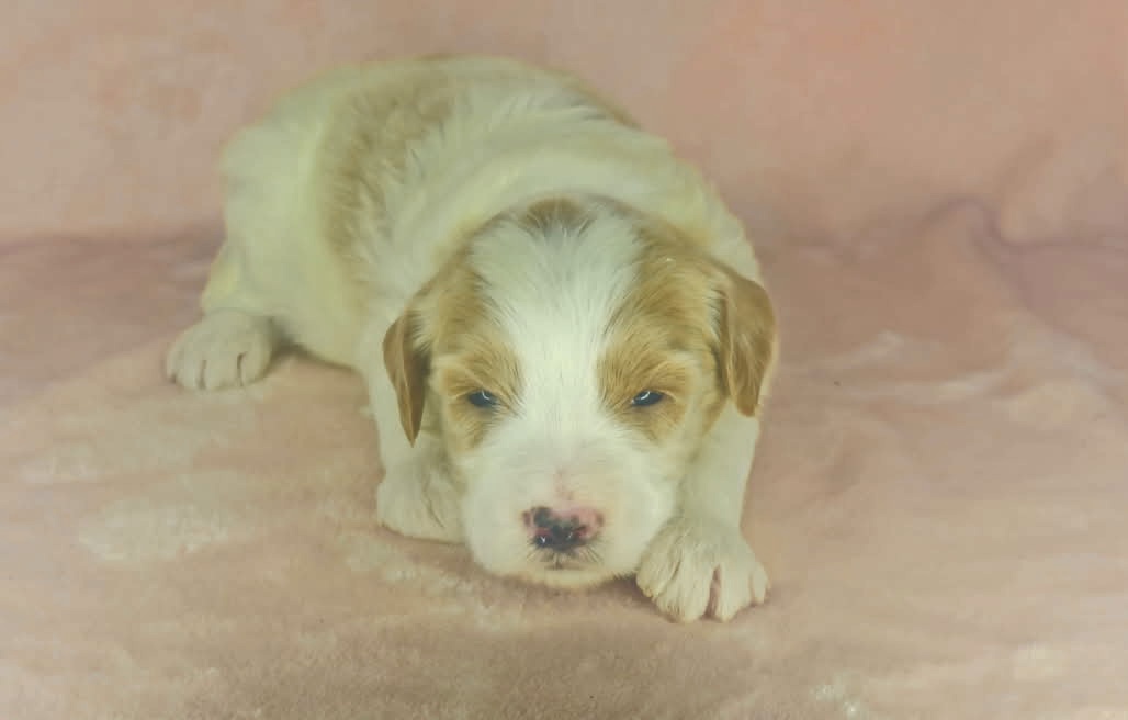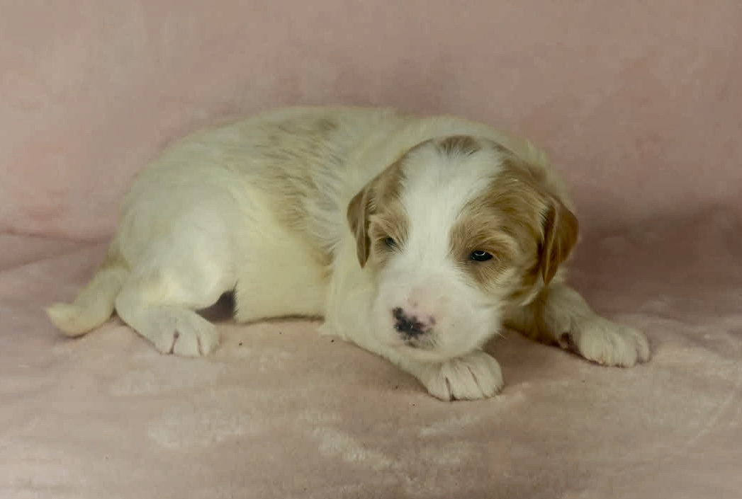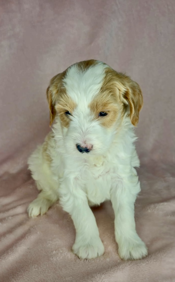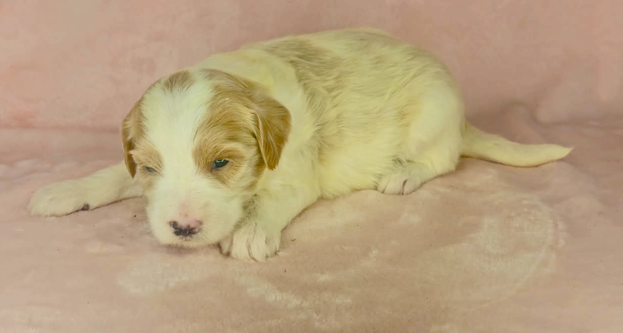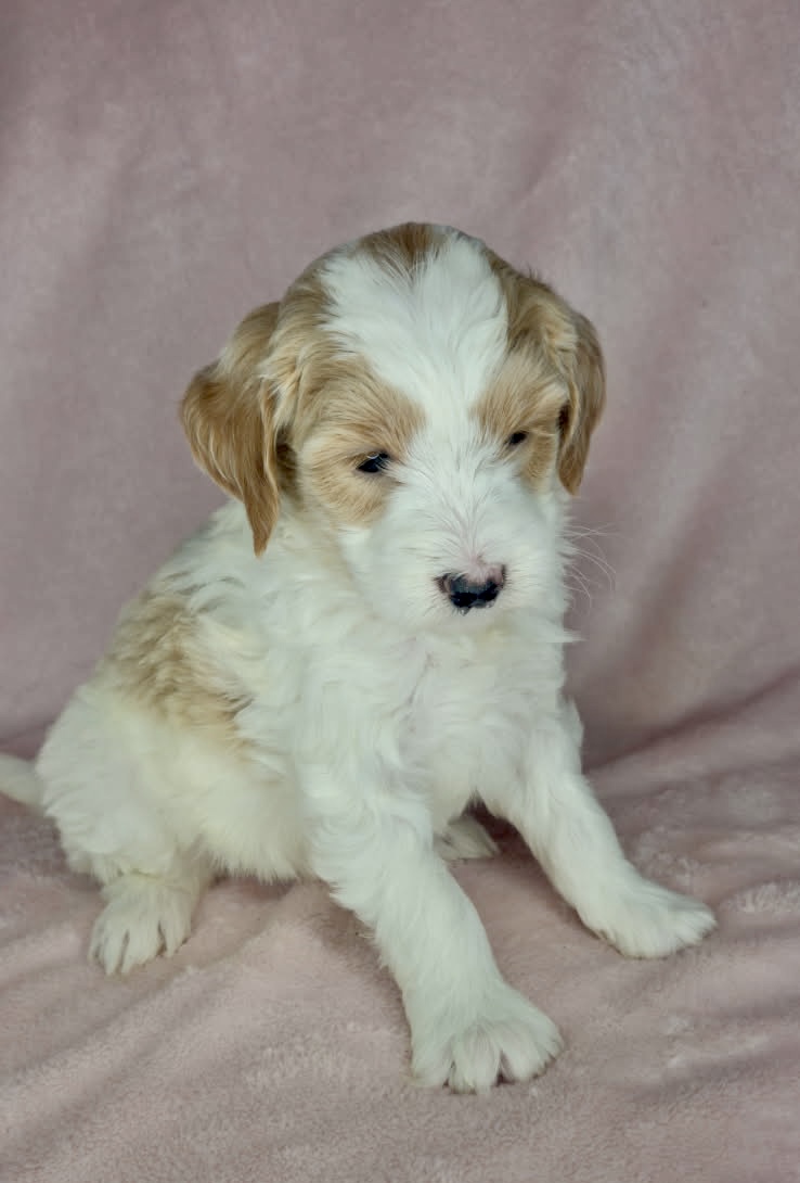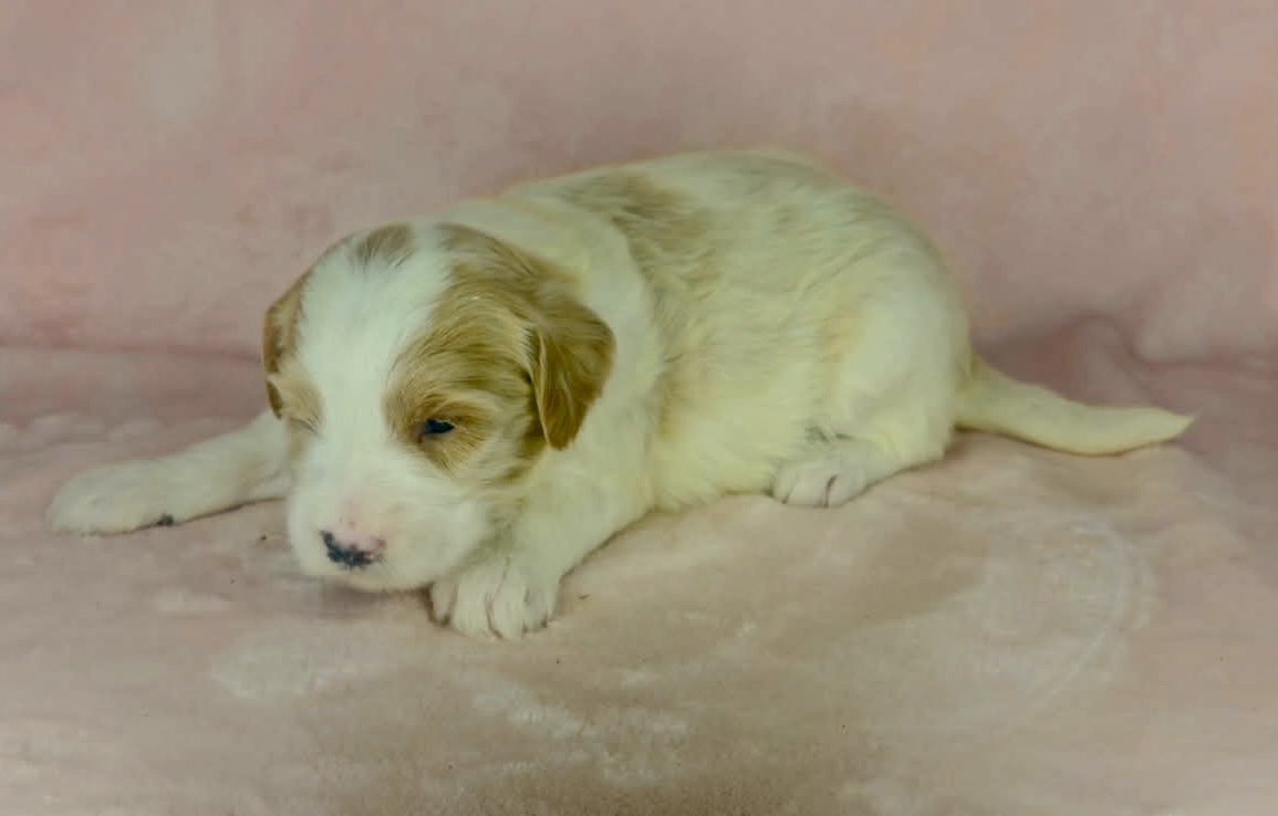 Optics is a parti color mini goldendoodle. Parti means she is white with in her case apricot or golden spots. She looks to have a wavy coat and will mature around 25 pounds. As an F2b that means her mom is an f1 generation and her dad is F1b or higher. That will give her a higher percentage of golden retriever, which equals great dog! She will still be low shedding. This litter was born December 17th and will be 8 weeks old February 11th.