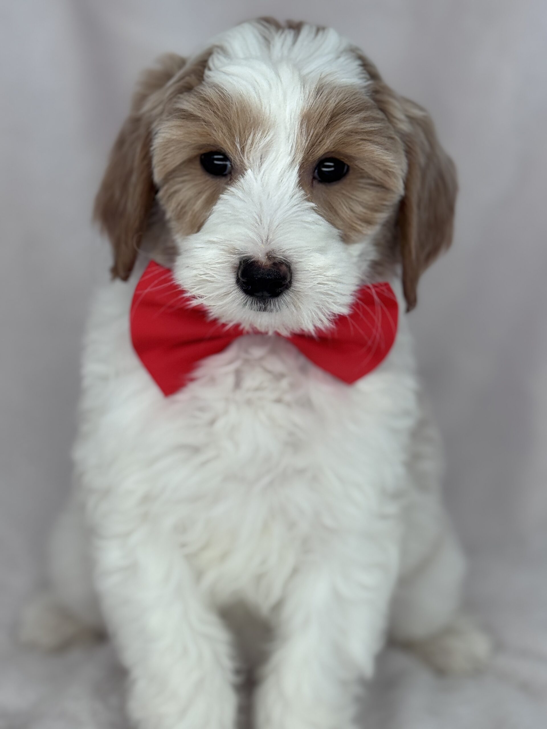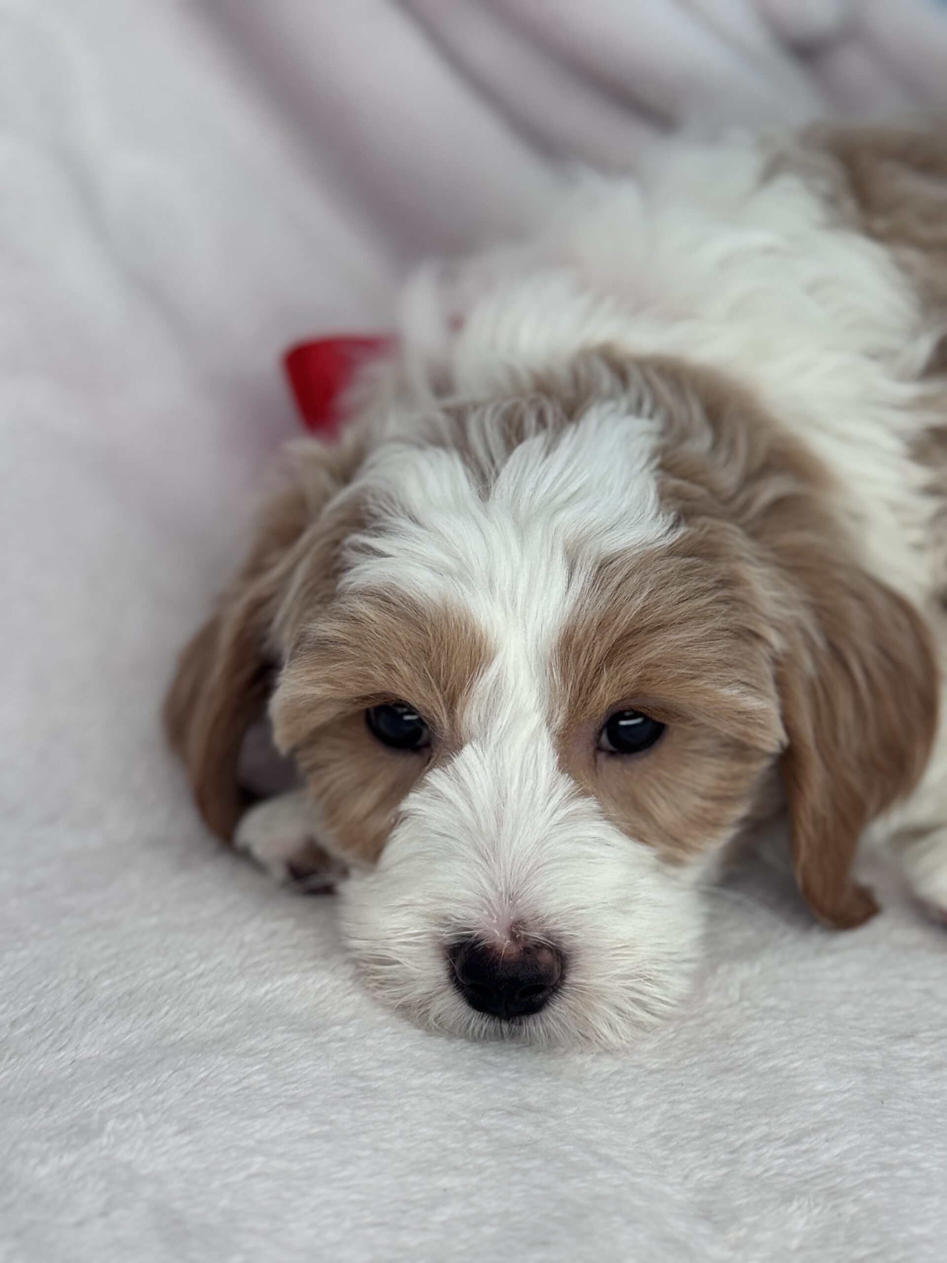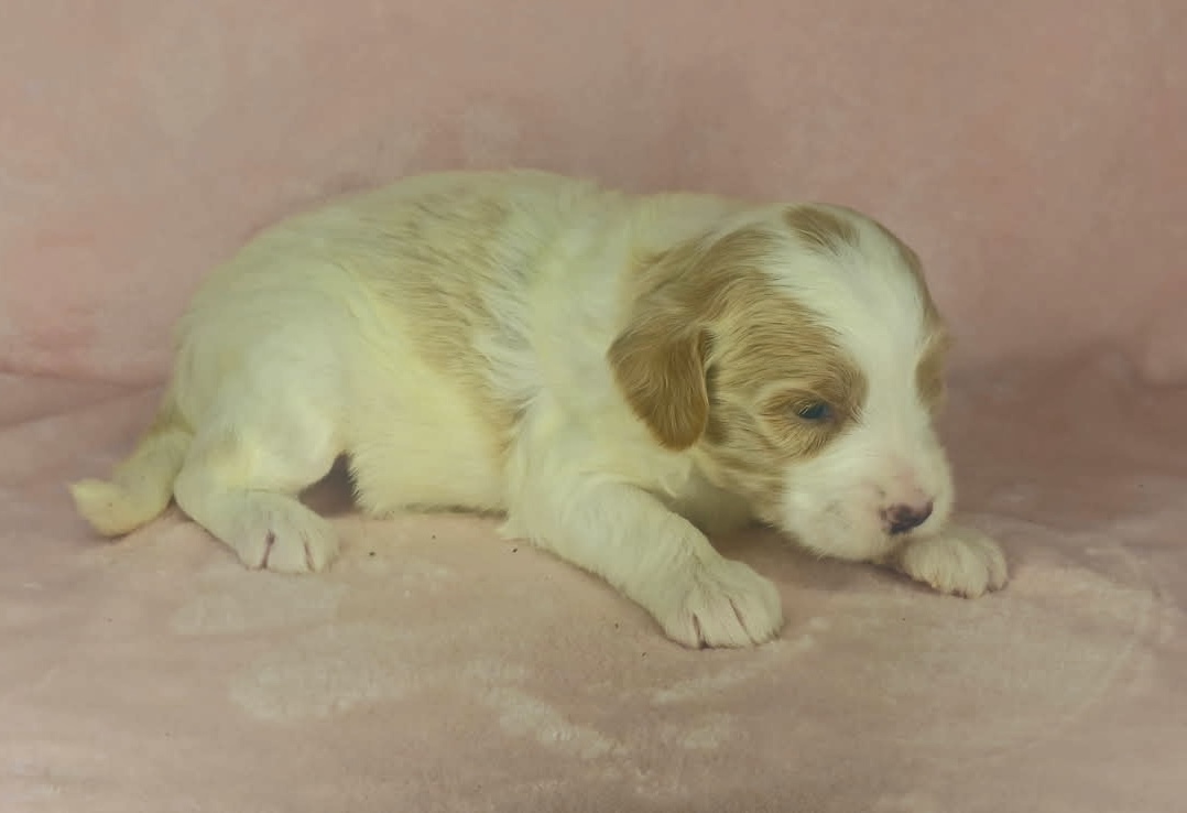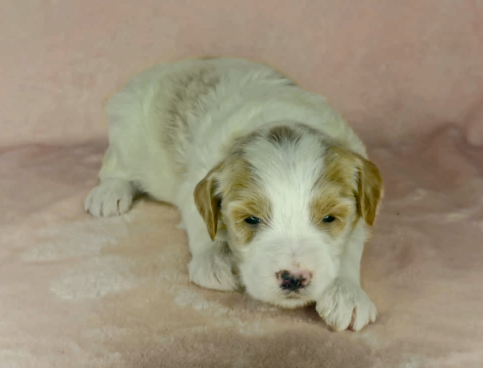 Optics is a parti color mini goldendoodle. Parti means she is white with in her case apricot or golden spots. She looks to have a wavy coat and will mature around 25 pounds. As an F2b that means her mom is an f1 generation and her dad is F1b or higher. That will give her a higher percentage of golden retriever, which equals great dog! She will still be low shedding. This litter was born December 17th and will be 8 weeks old February 11th.