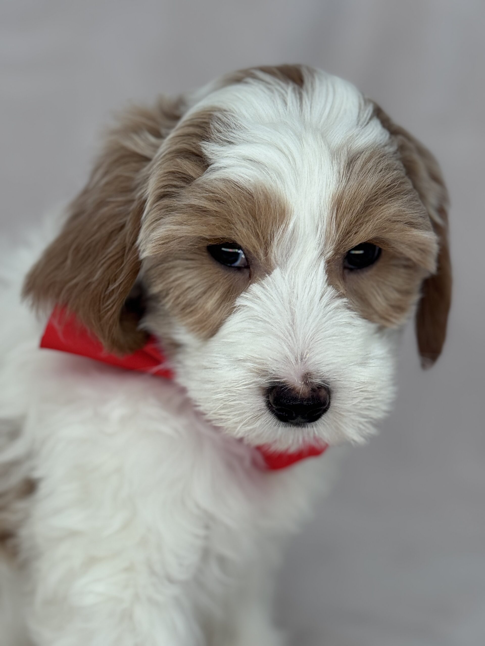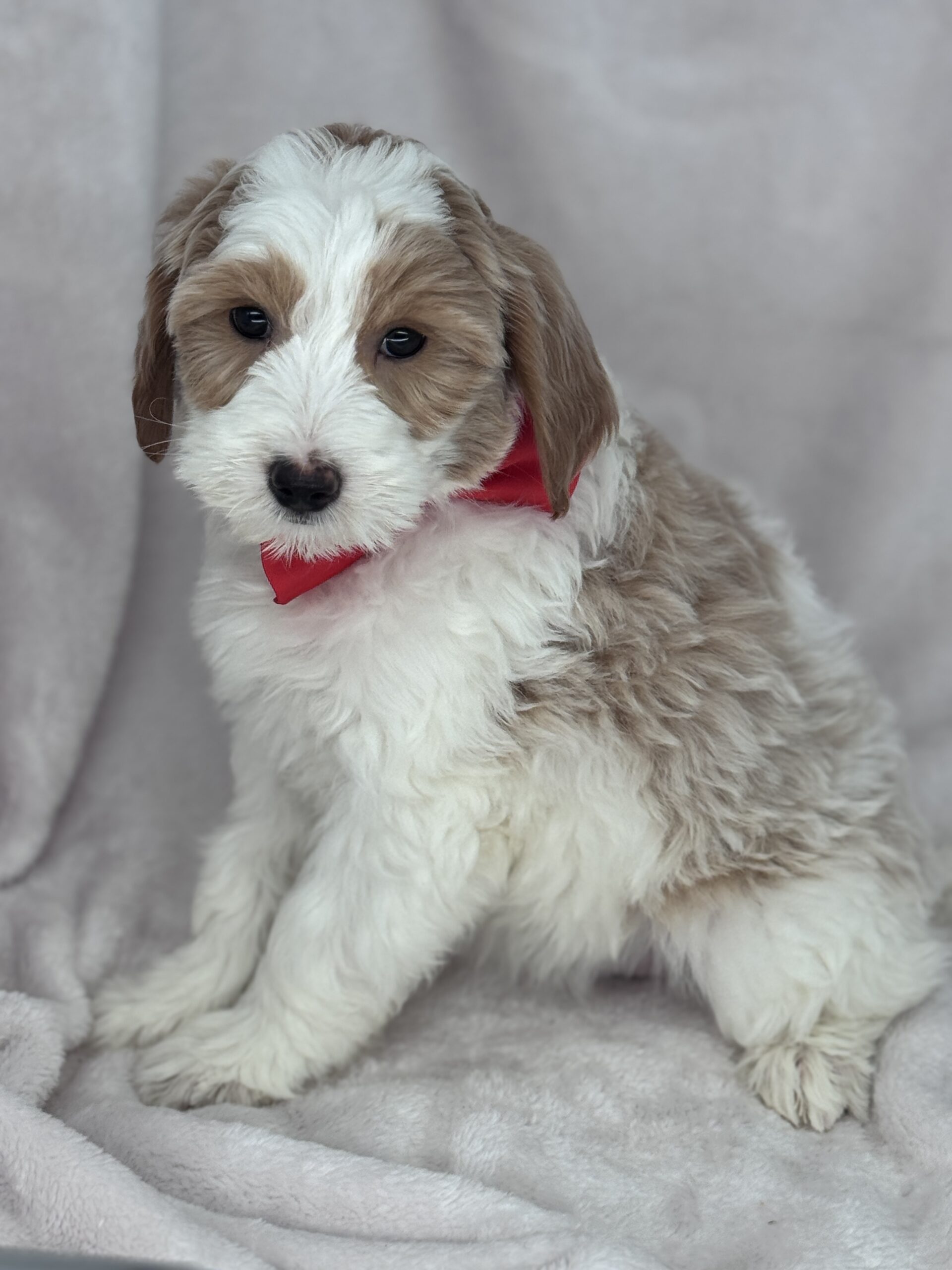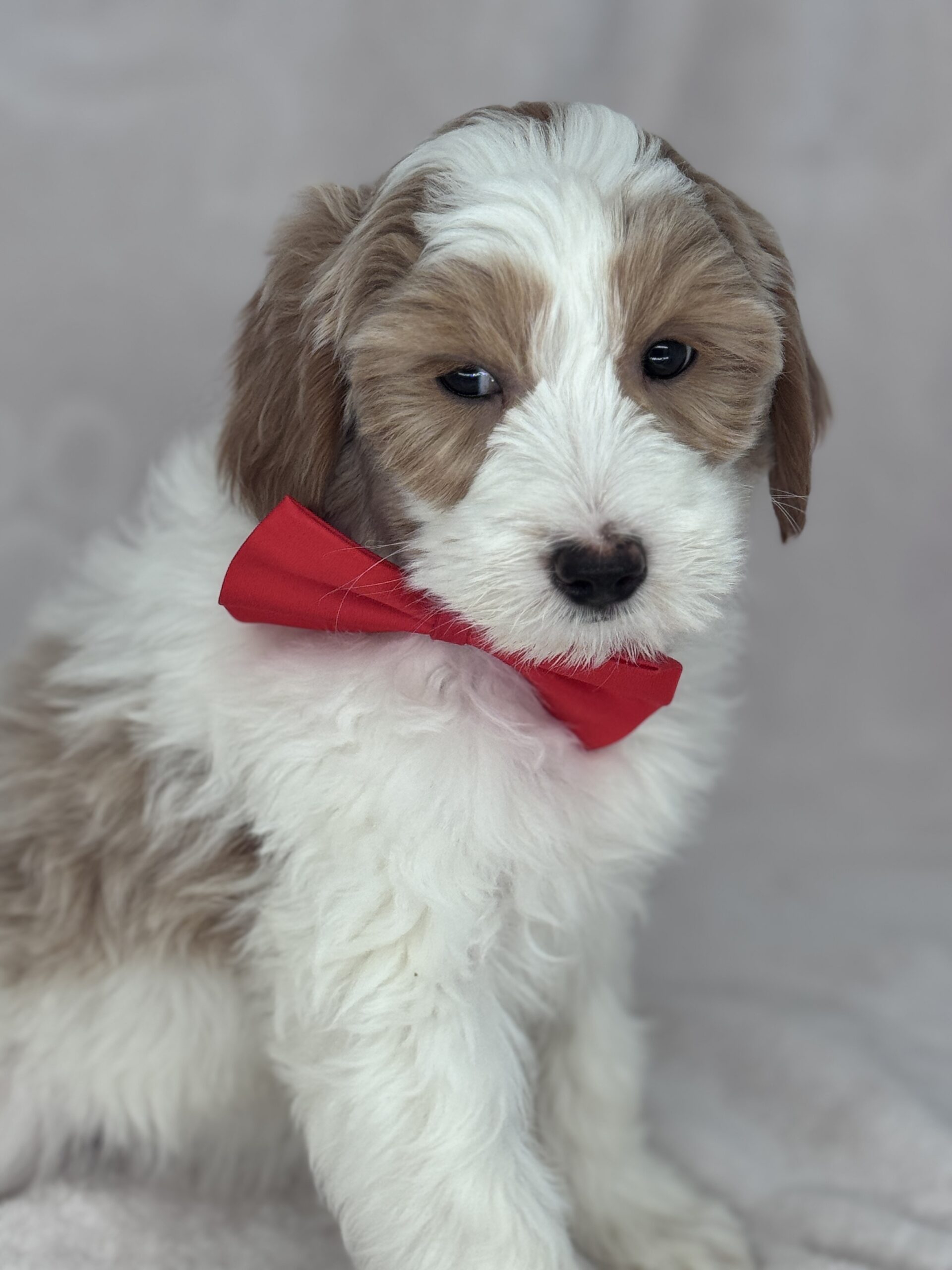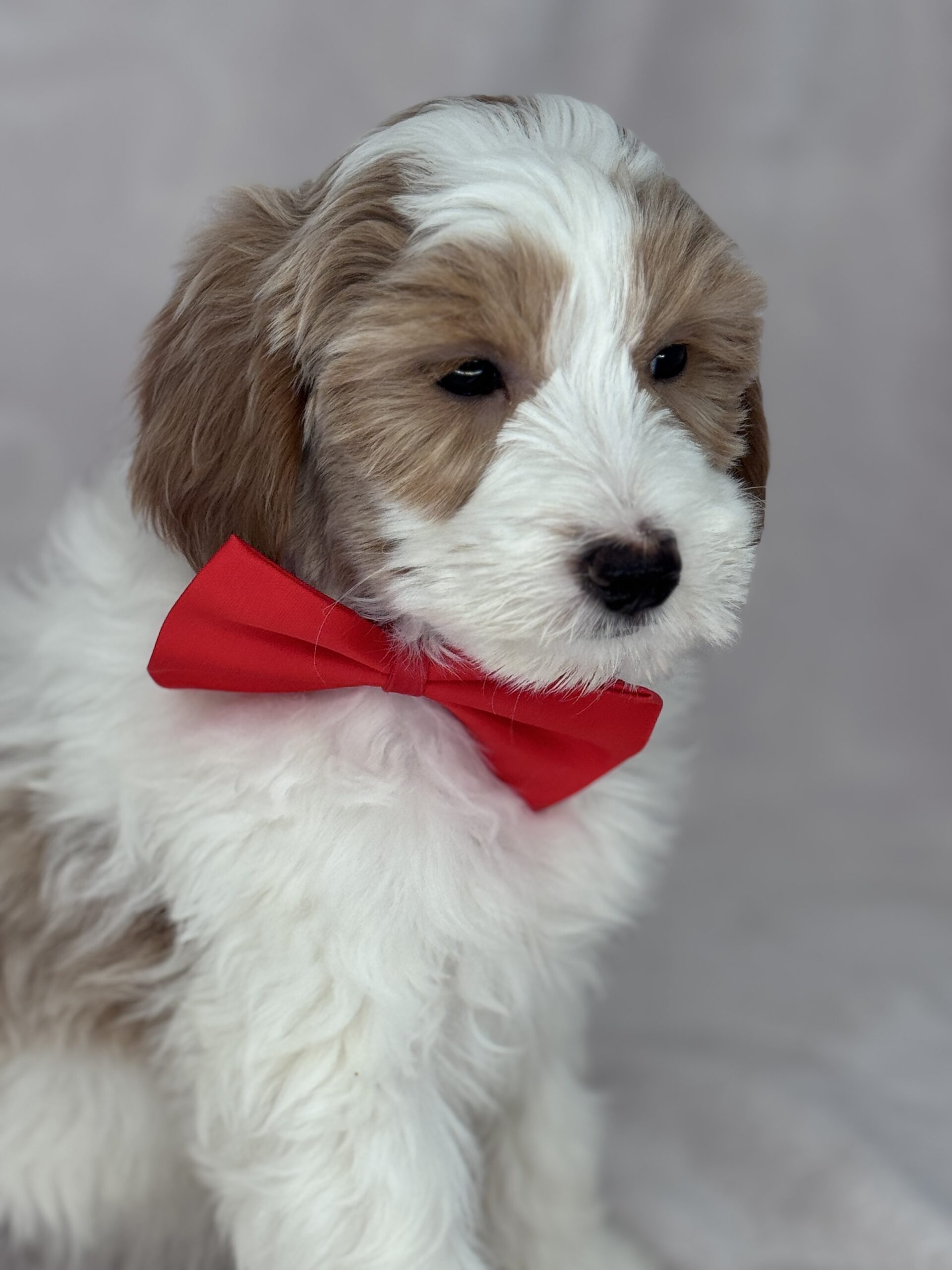 Optics is a parti color mini goldendoodle. Parti means she is white with in her case apricot or golden spots. She looks to have a wavy coat and will mature around 25 pounds. As an F2b that means her mom is an f1 generation and her dad is F1b or higher. That will give her a higher percentage of golden retriever, which equals great dog! She will still be low shedding. This litter was born December 17th and will be 8 weeks old February 11th.