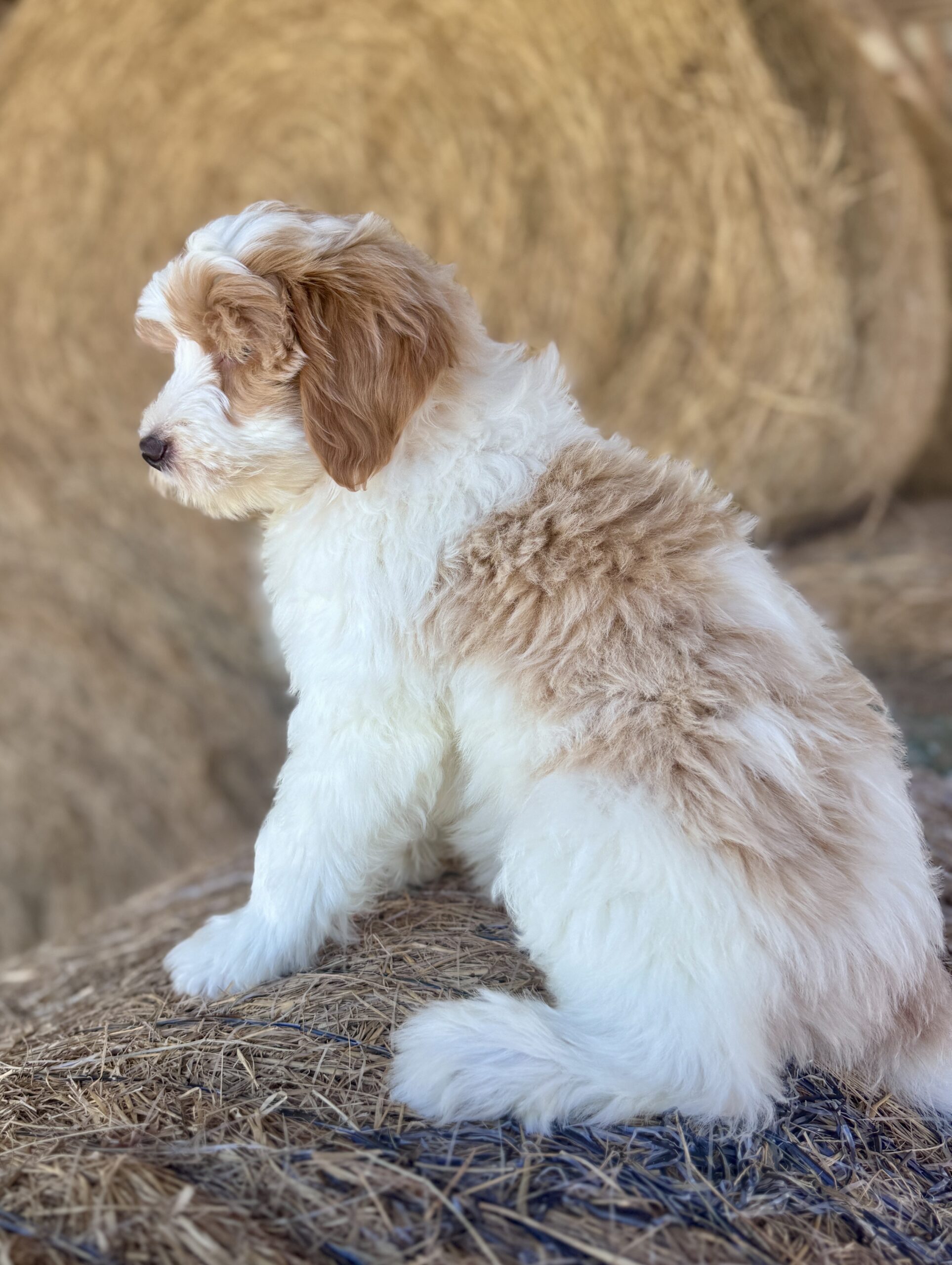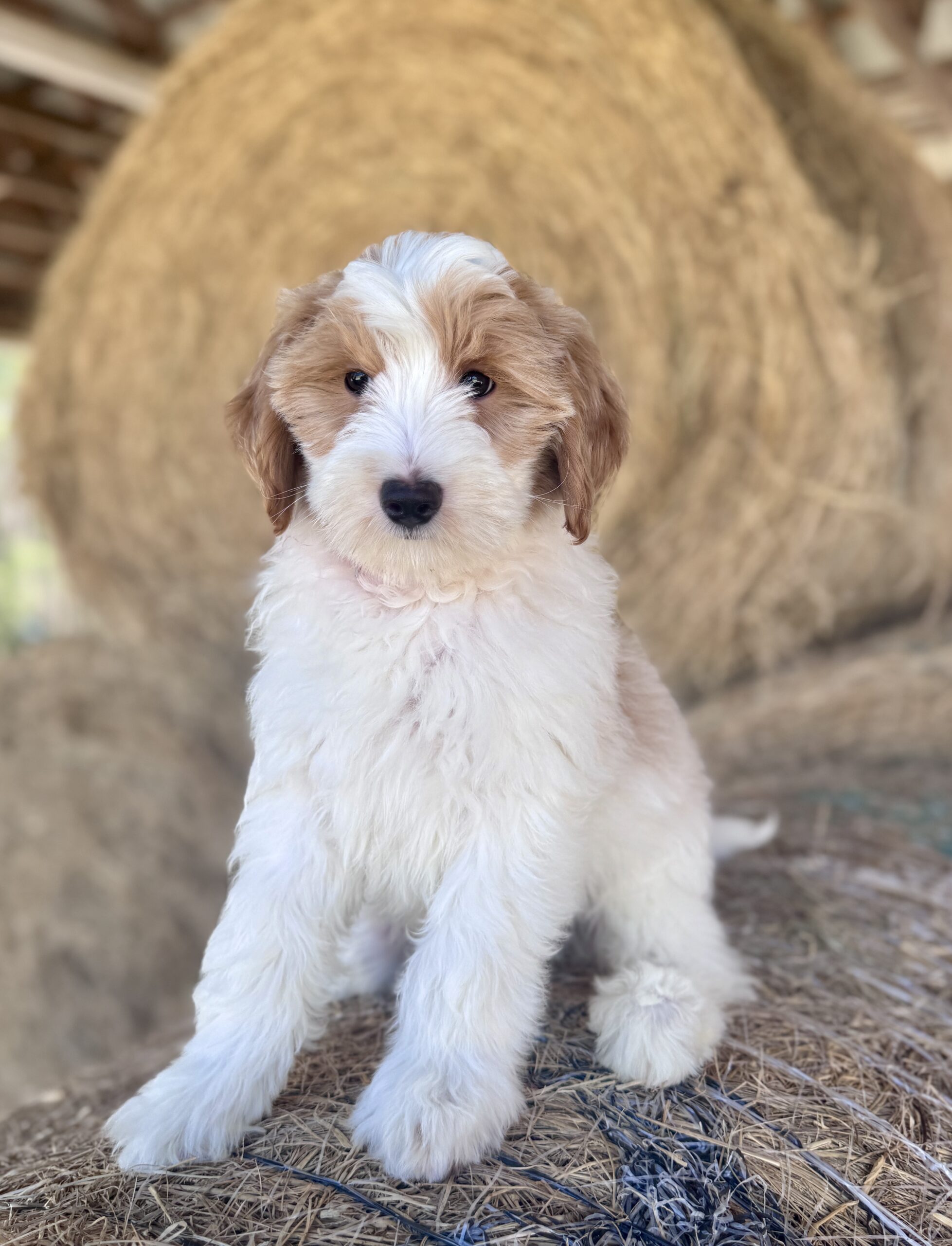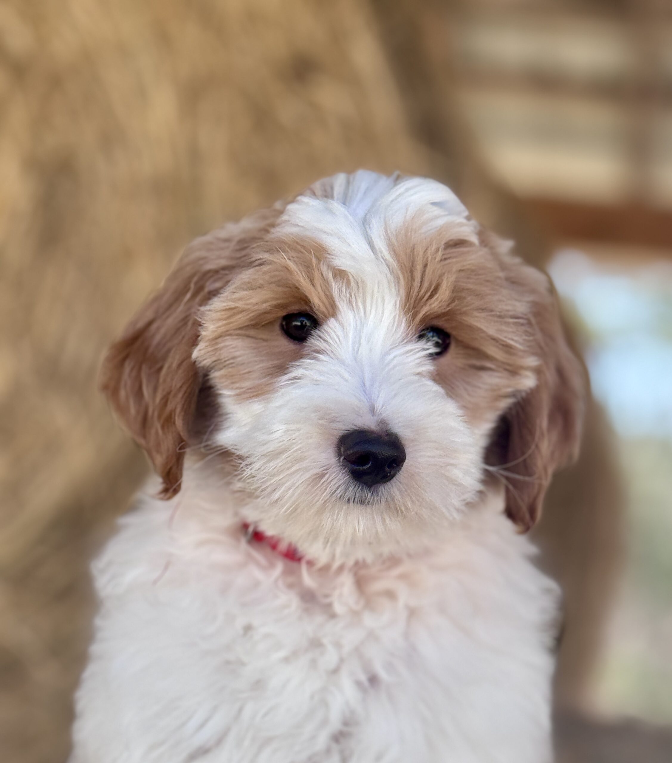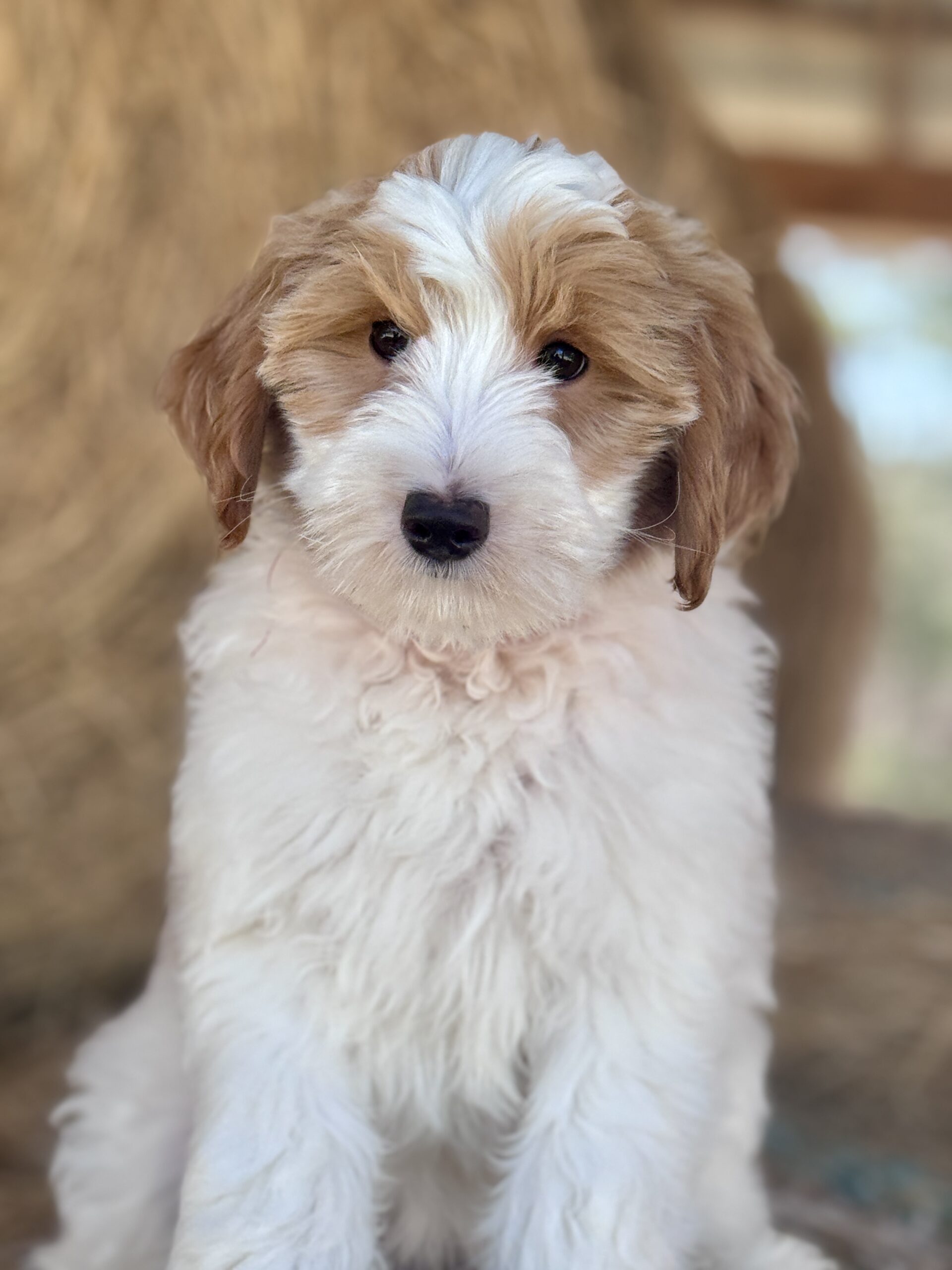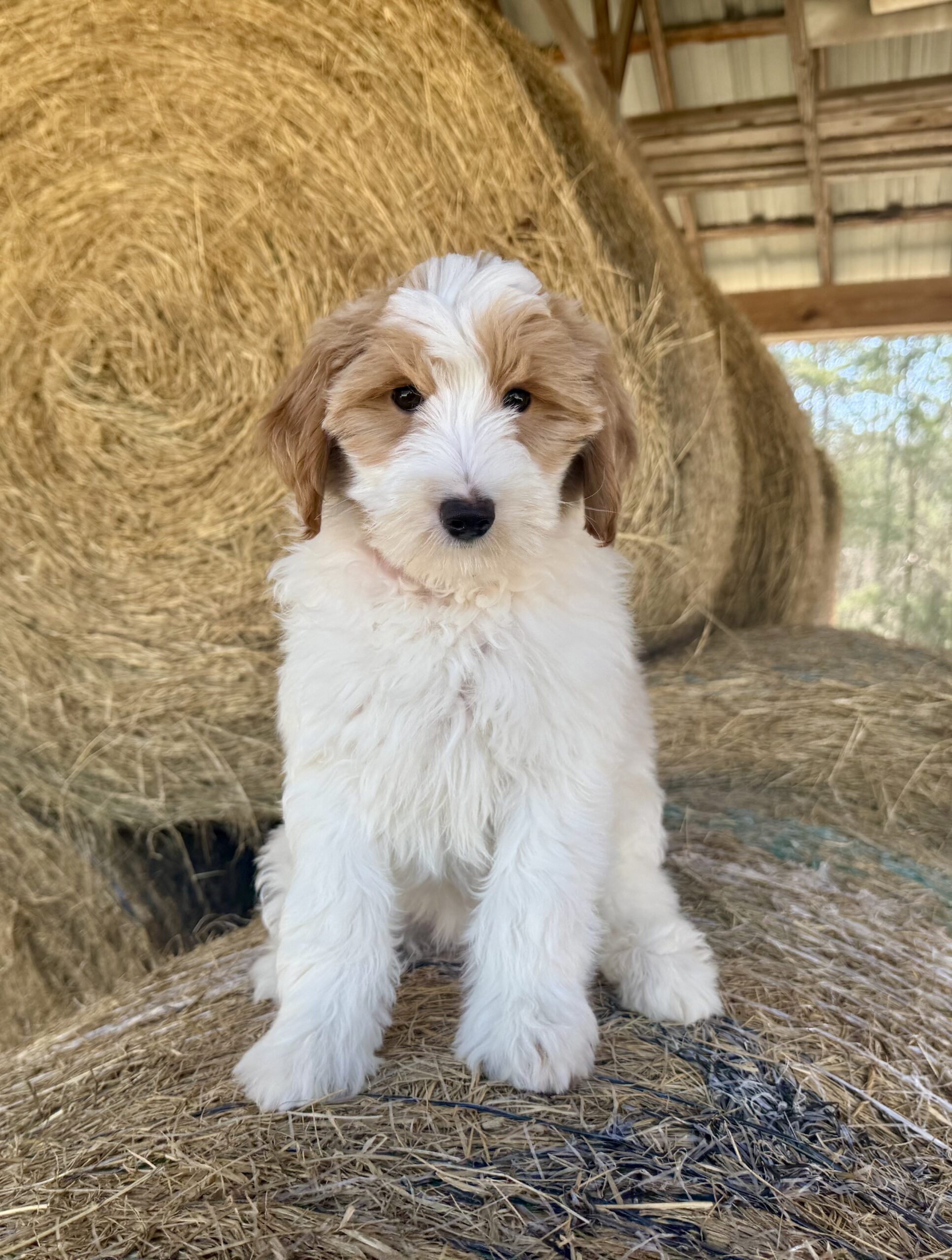 Optics is a parti color mini goldendoodle.  Parti means she is white with in her case red spots.  She is a mild mannered girl with an awesome no-curl coat and will mature around 25 pounds.  She is a beautiful girl with a nice square athletic build.  Her coat will be amazingly soft and silky.    As an F2b that means her mom is an f1 generation and her dad is F1b or higher.  This litter of puppies will have about 39-40% golden retriever and be great dogs!  This litter was born December 17th and she is ready to go at any time.
