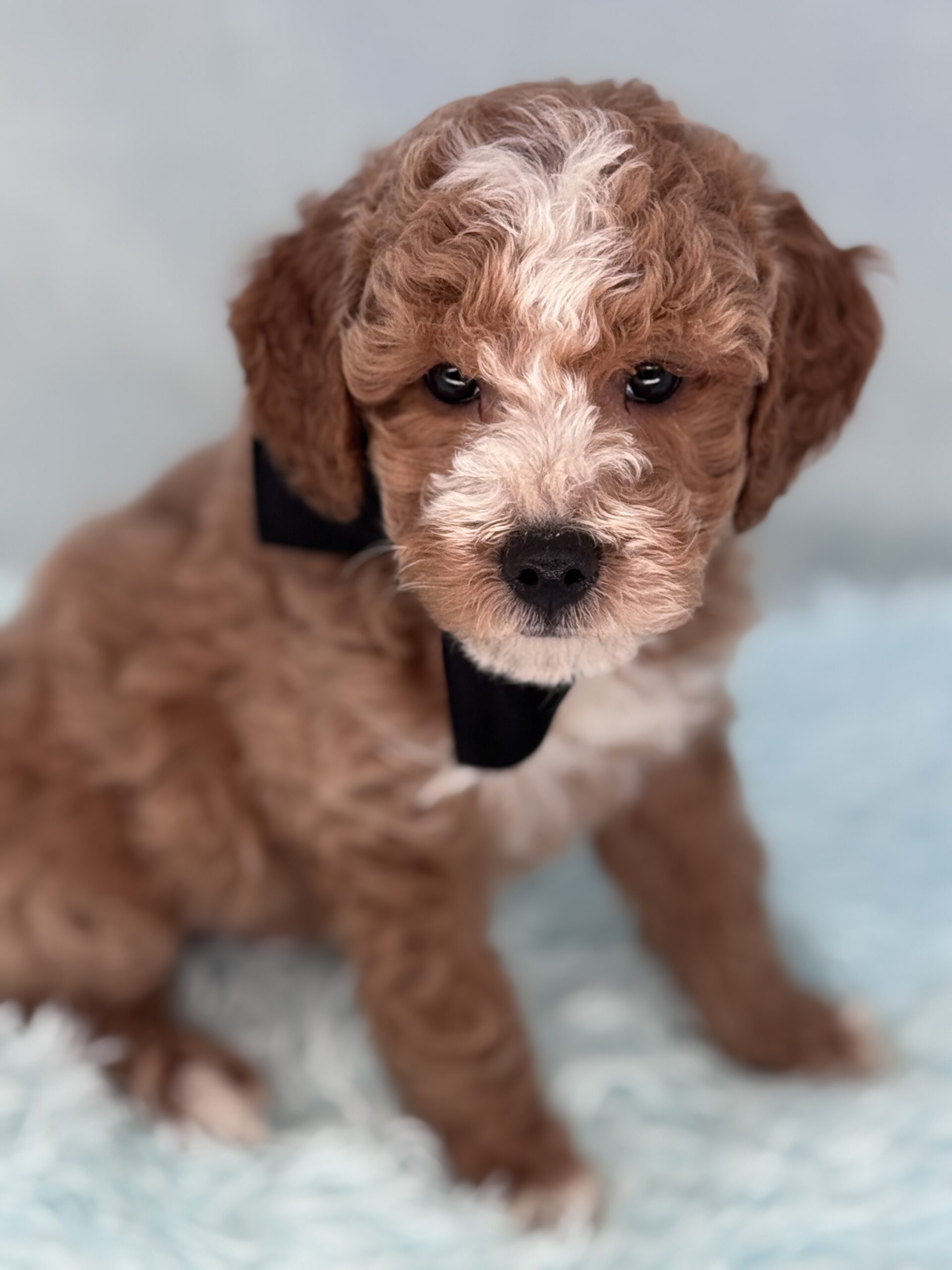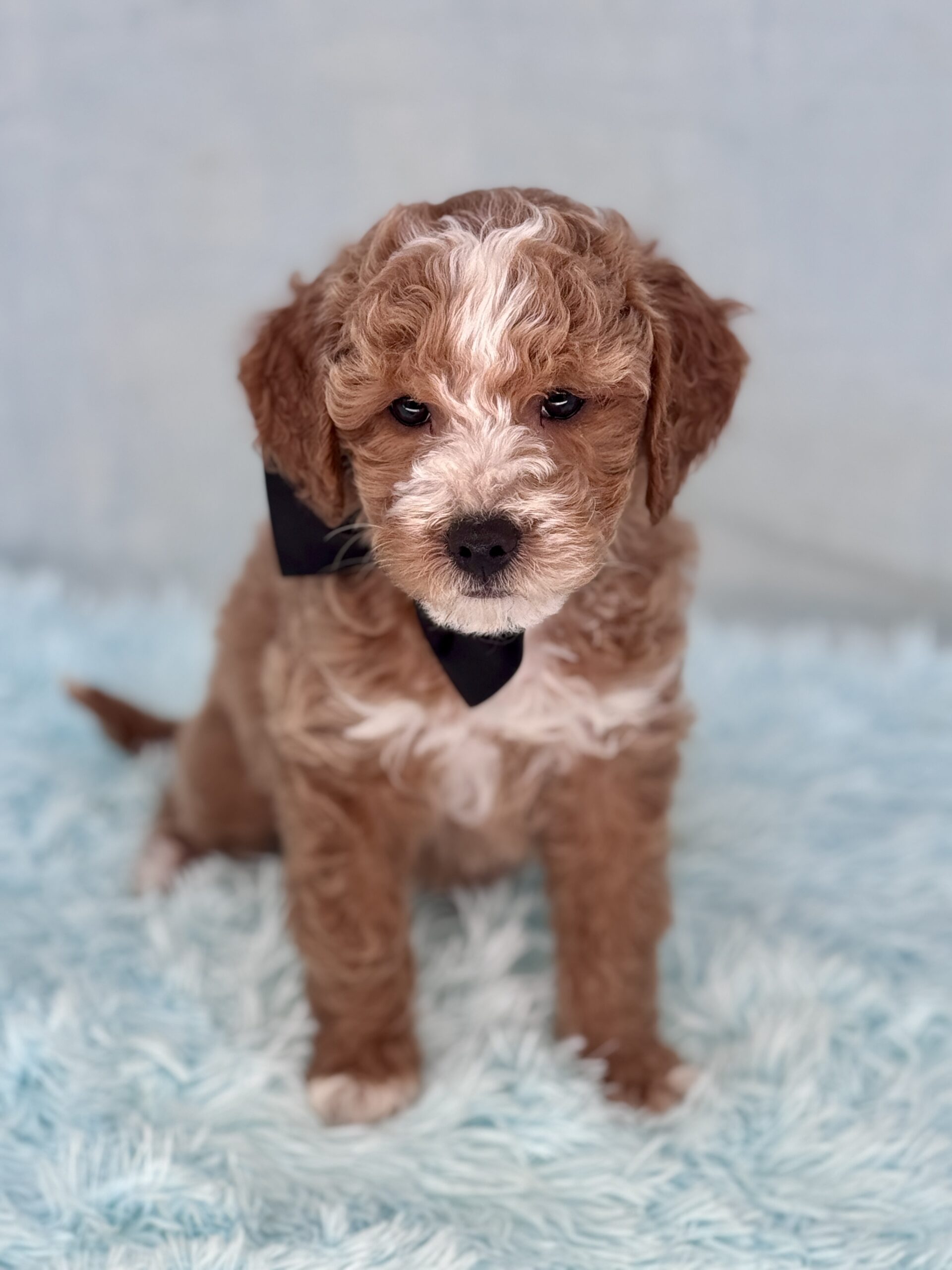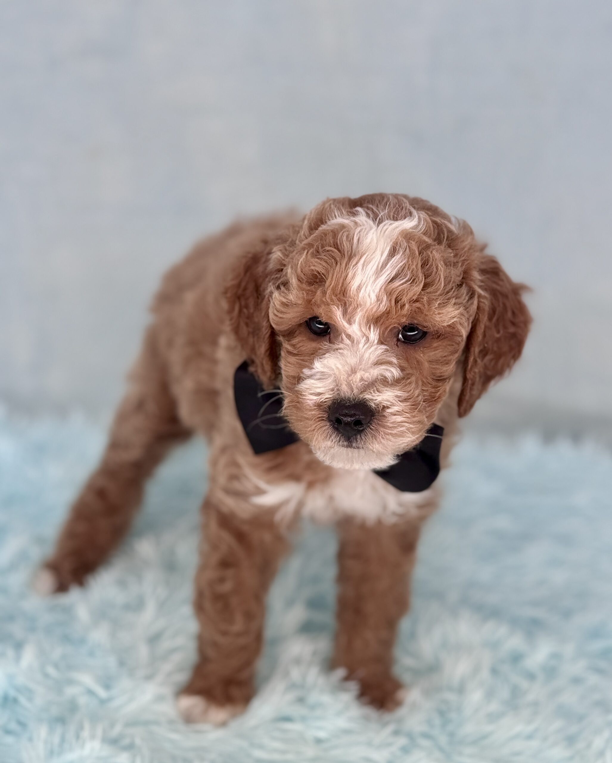 Pappy is from our Bourbon themed F1b generation litter. His color pattern is called red tuxedo and is very popular! I love that wide blaze face. He was born December 23rd and will be 8 weeks old February 17th. He has a curly coat and should mature 25-30 pounds.