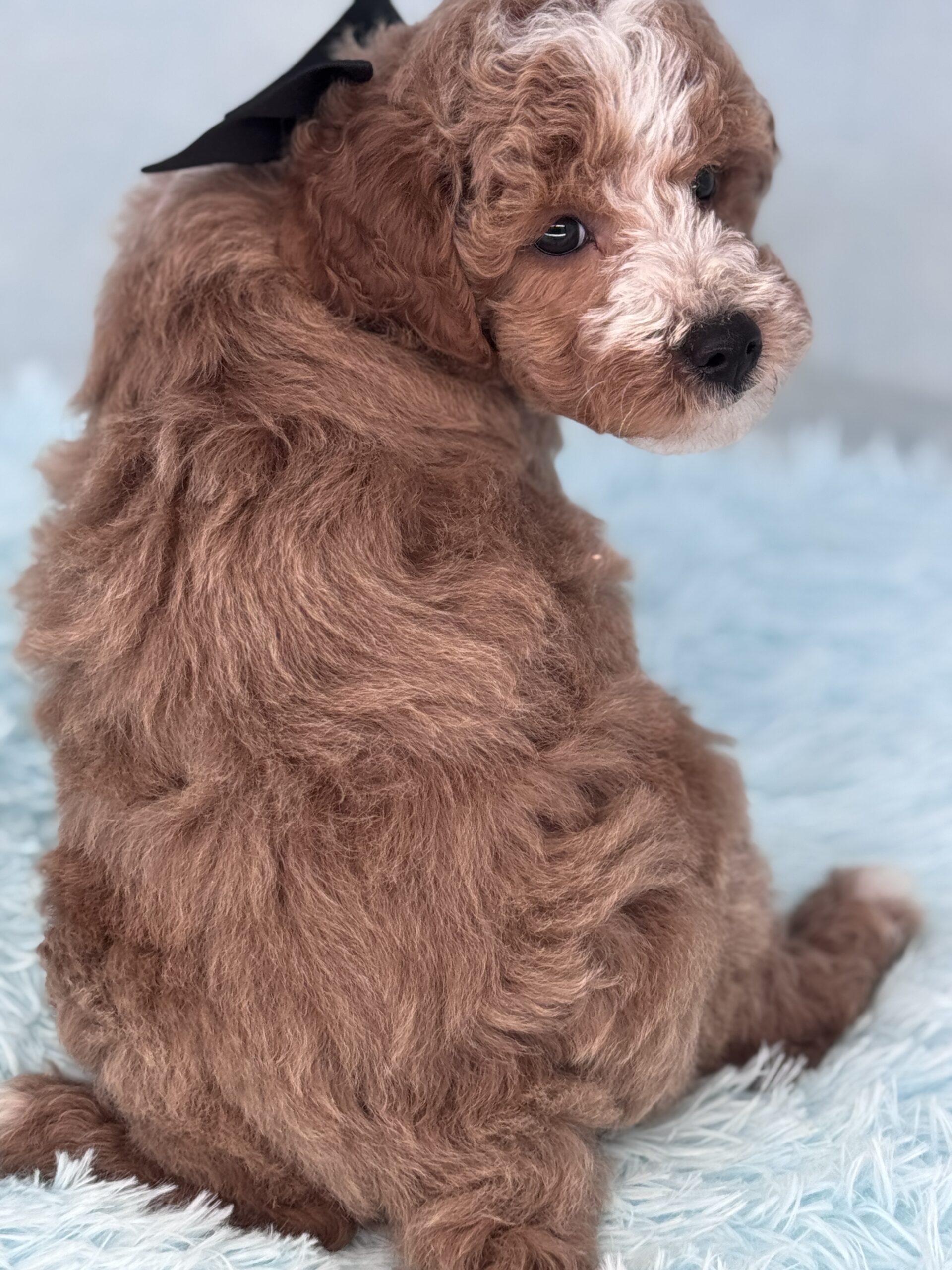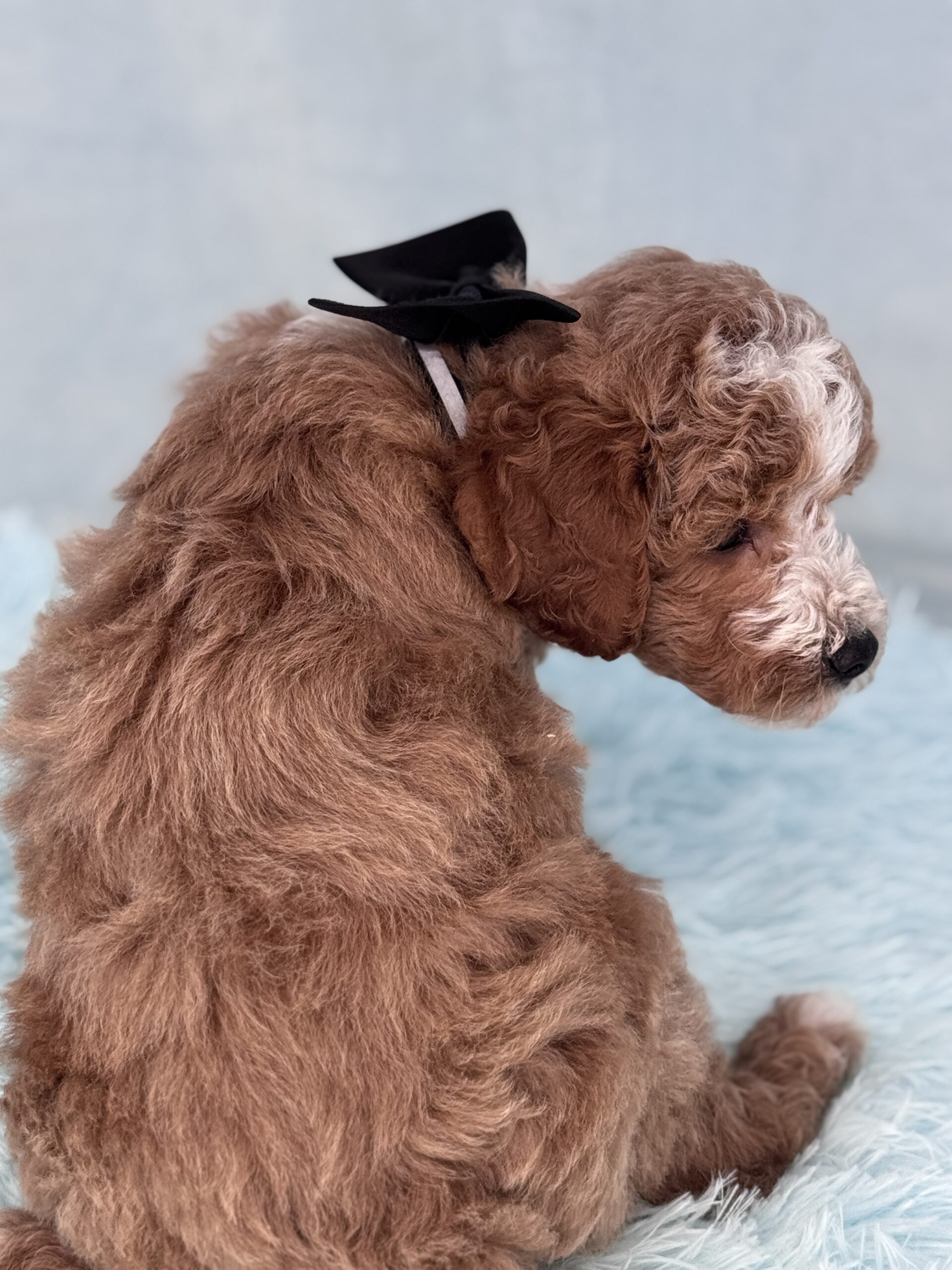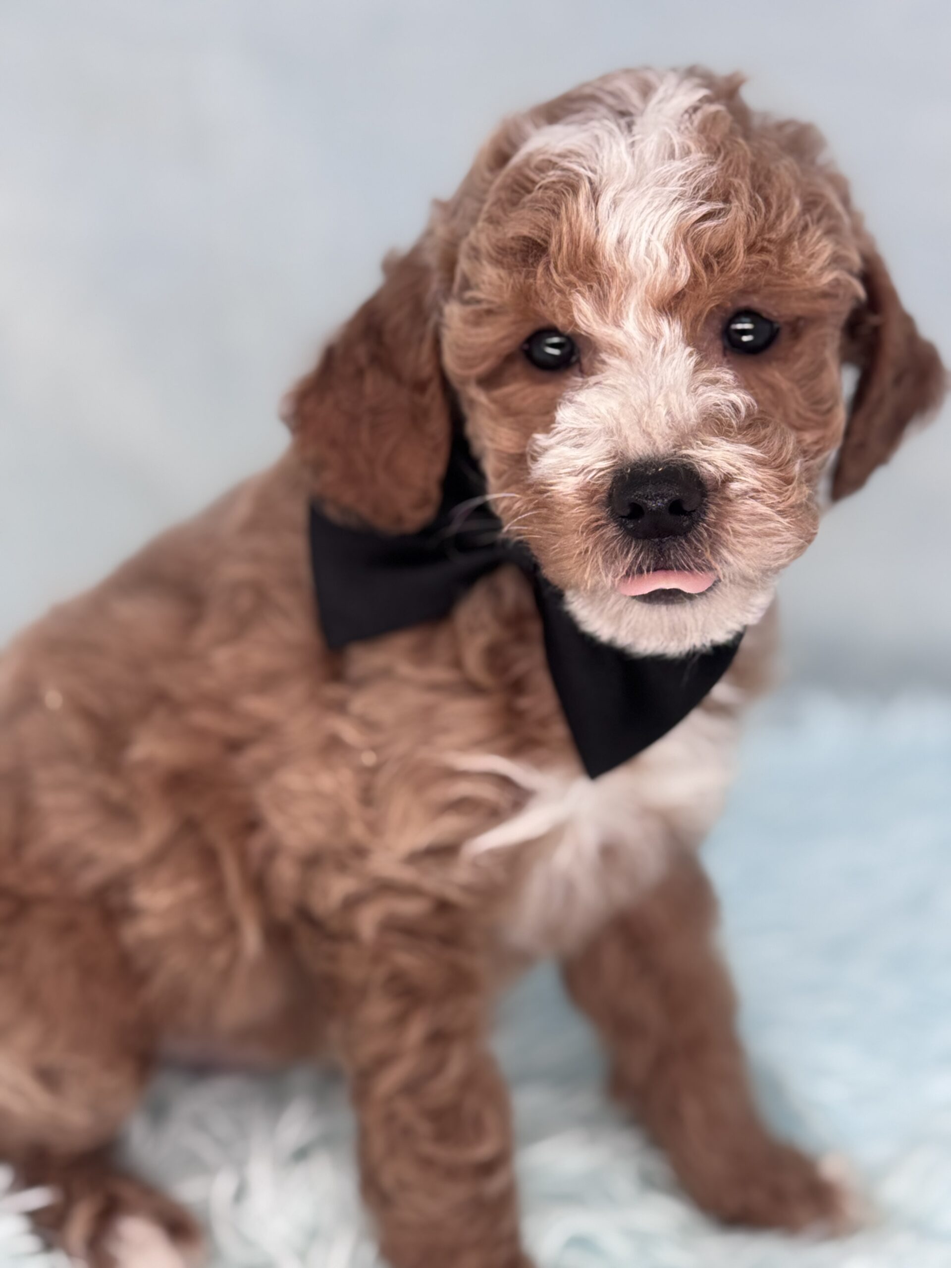 Pappy is from our Bourbon themed F1b generation litter. His color pattern is called red tuxedo and is very popular! I love that wide blaze face. He was born December 23rd and will be 8 weeks old February 17th. He has a curly coat and should mature 25-30 pounds.
