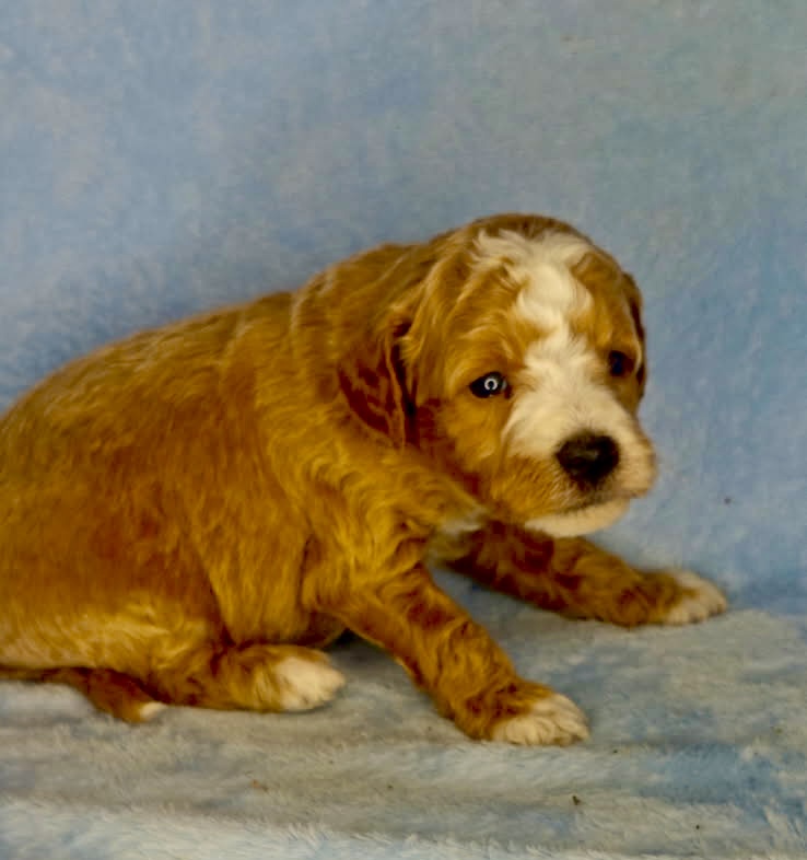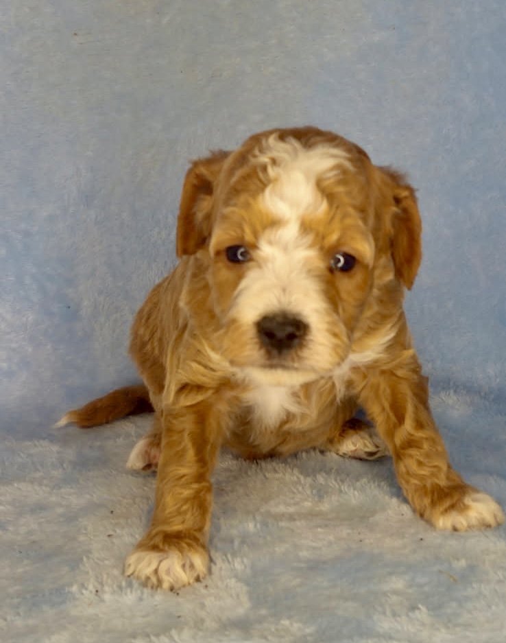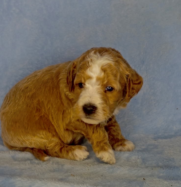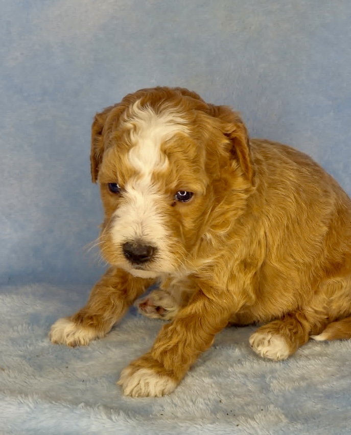 Pappy is from our Bourbon themed F1b generation litter. His color pattern is called red tuxedo and is very popular! He was born December 23rd and will be 8 weeks old February 17th. He has a curly coat and should mature 25-30 pounds but we will update that as he grows.