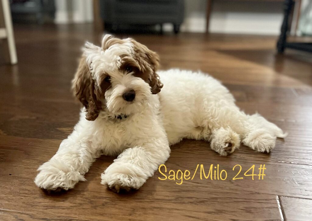 Piper is a colorful red and white parti with my favorite coat. She has two dominant furnishings and does not shed but does not genetically have curl. Her coat still has a loose curl to it because of the furnishings. Parti means white with spots and in her case that is bright red. Her mom is Sage a retired mom from our program. Like her mom Sage, Piper loves her human mom intensely and sticks close by.