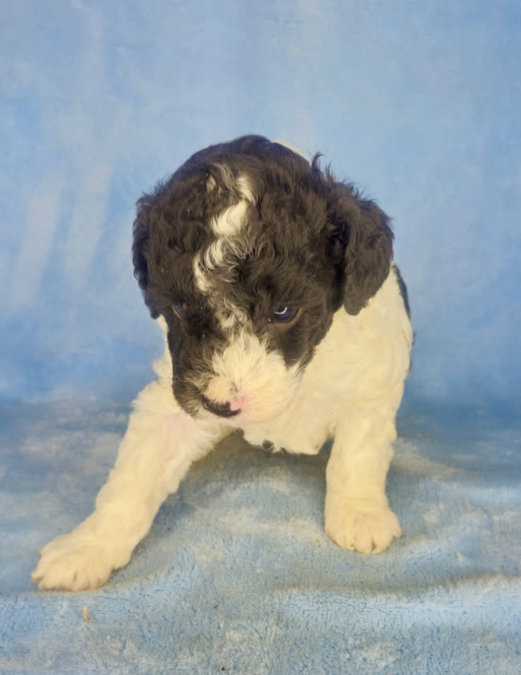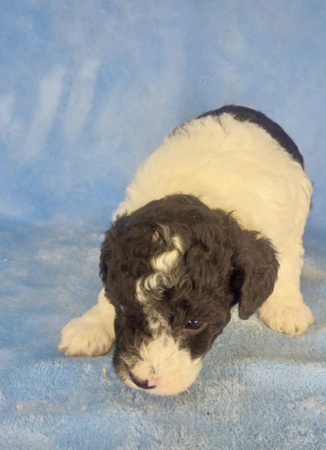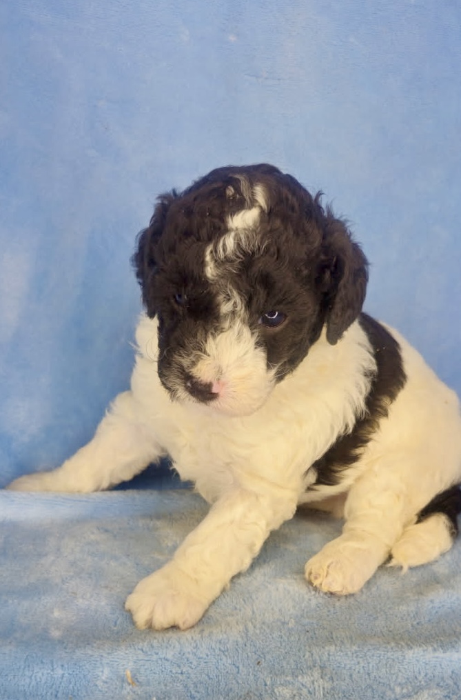 Jasmine and Jarad have tiny puppies that have matured in the past from 11-19 pounds. They are considered micro mini goldendoodles. The litter was born March 9th and would be 8 weeks May 4th. We can have both curly and wavy coats in this litter. Poncho has a curly coat and is an unusual ti-color parti. That means he has all three colors brown, black and white.