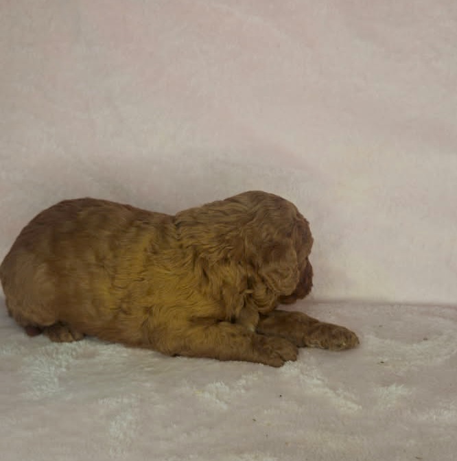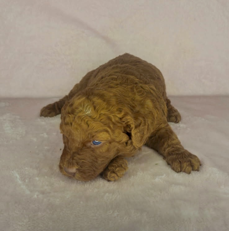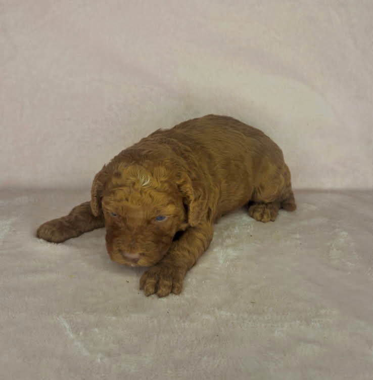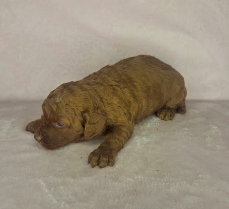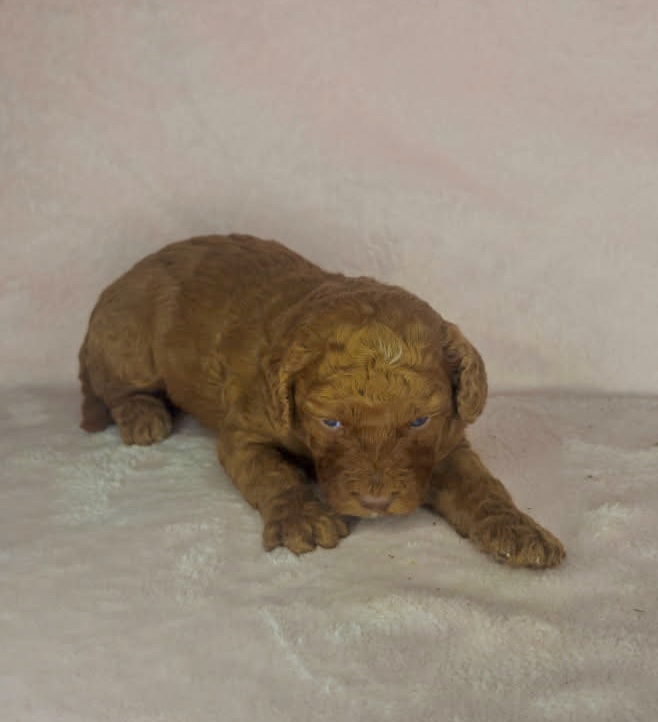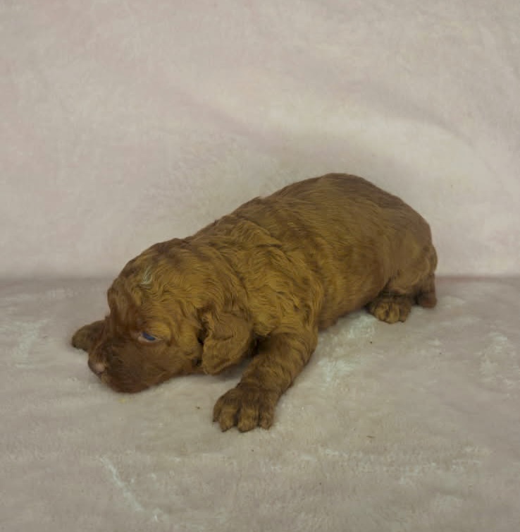 Pung is from our Mahjong Sets Litter. She is a dark red mini goldendoodle with blue eyes. She will have a curly coat that is non-shedding coat. Past puppies from these two parents have matured 20-25 pounds.