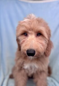 Dutton has an excellent disposition and is cherished by her guardian parents.  She accompanies them on most trips.  She is a 25 pound f1b mini goldendoodle with a nice high percentage of golden retriever at 27.6%.  She has a cream wavy coat.  Aubie our Russian linage mini poodle is the father of this litter.  He also has a great temperament.  With both parents having two dominant furnishings we know that all of the puppies are great choices for allergy sufferers and will not shed.  They were born July 26th and are now ready for new homes.