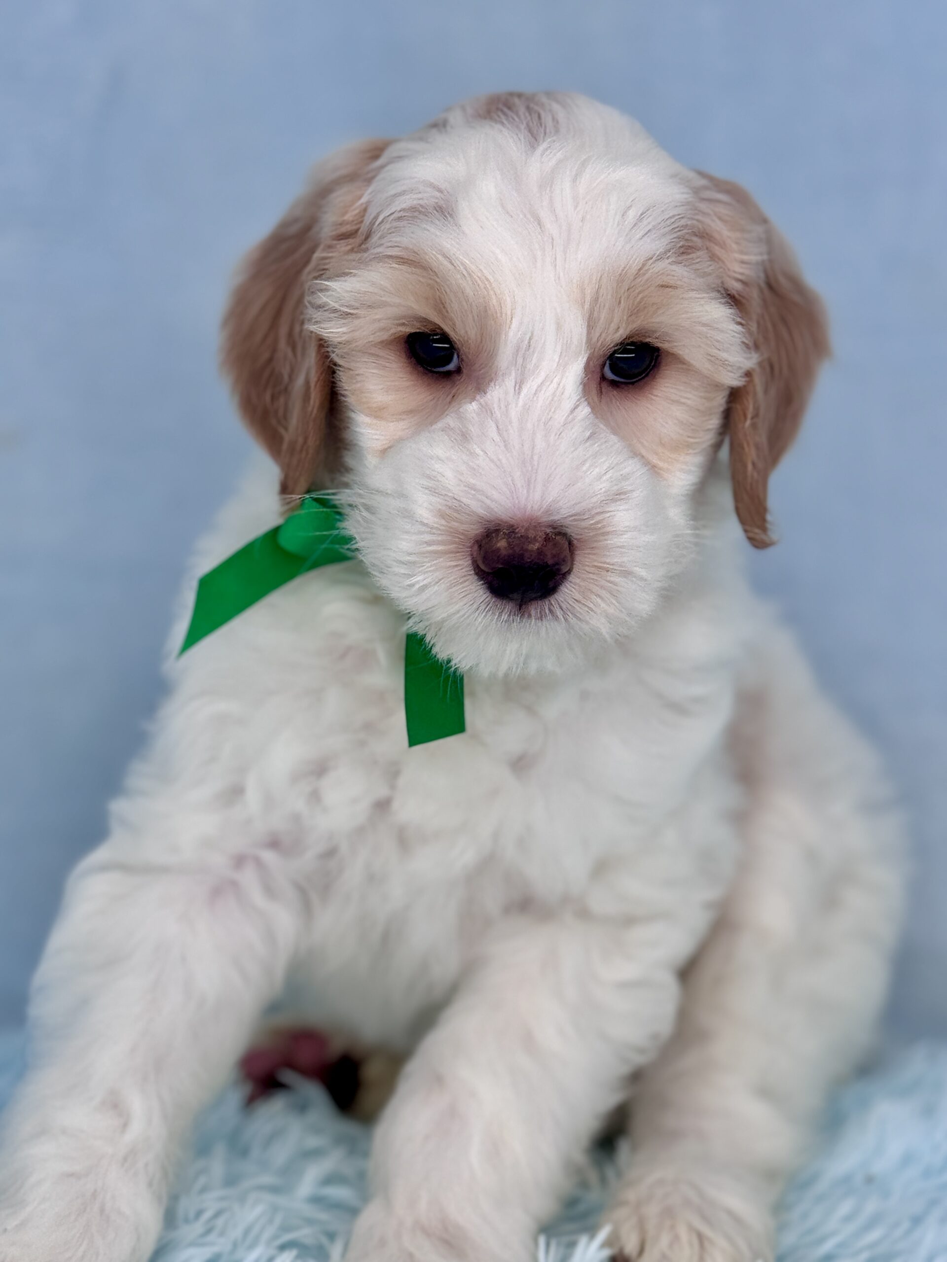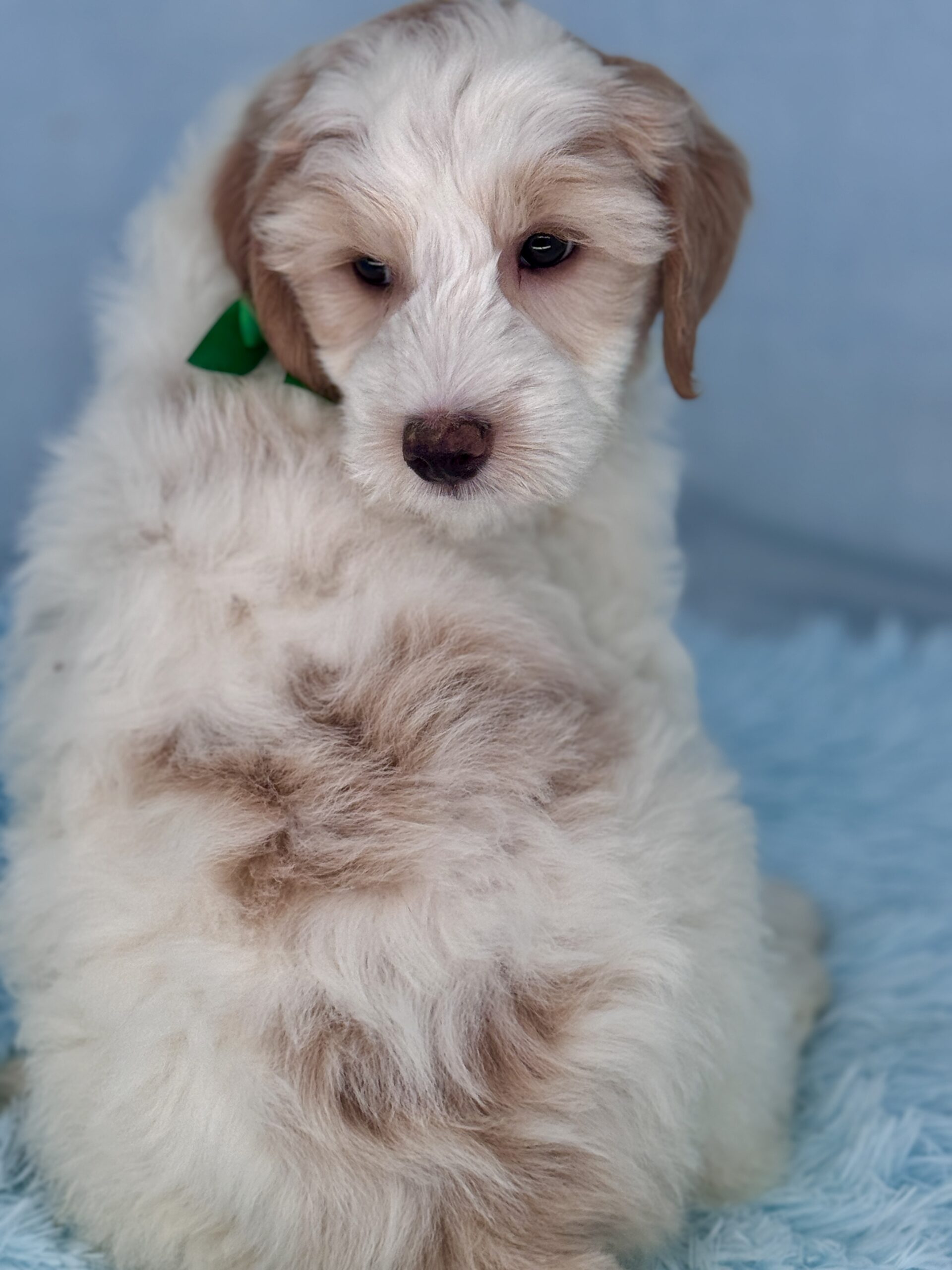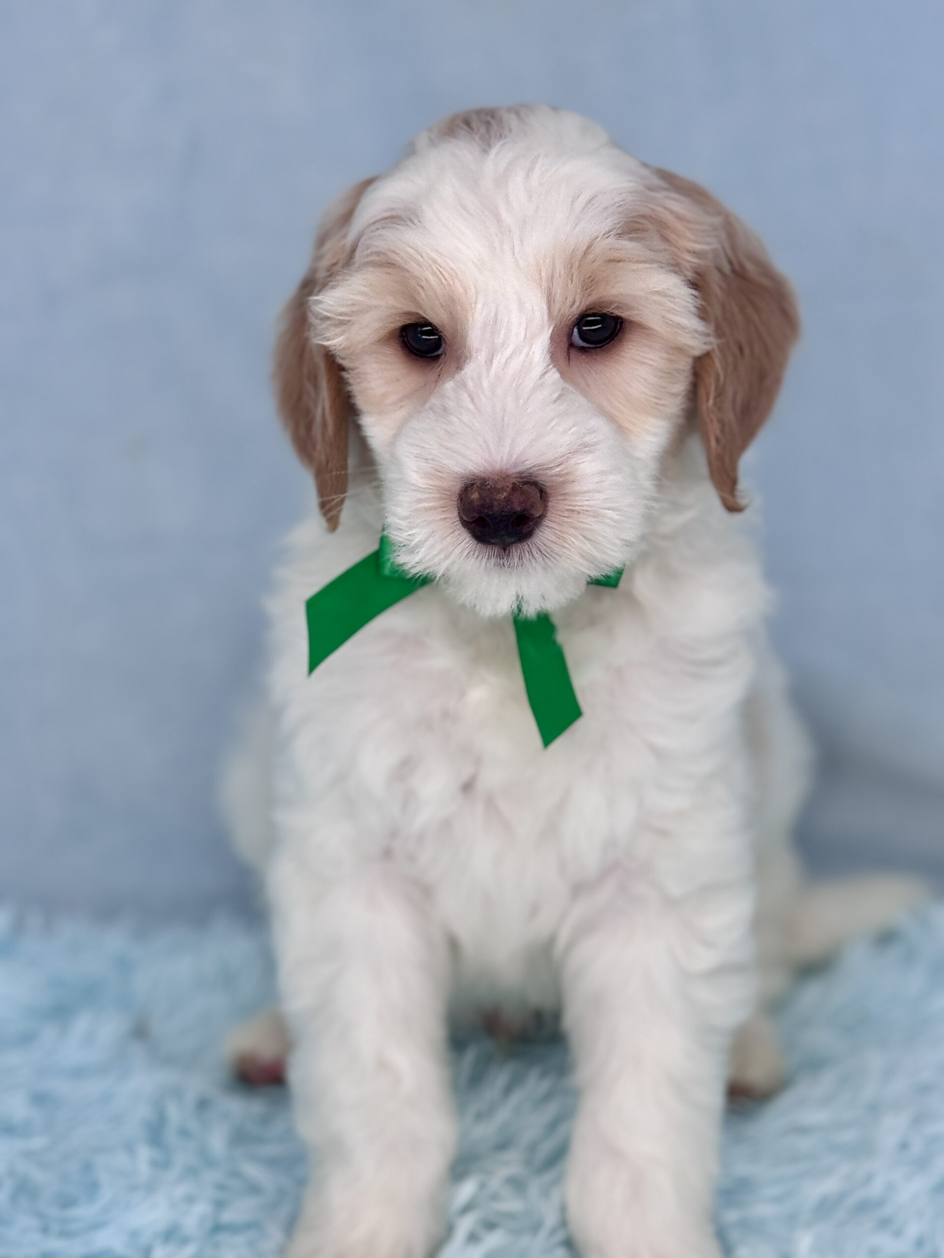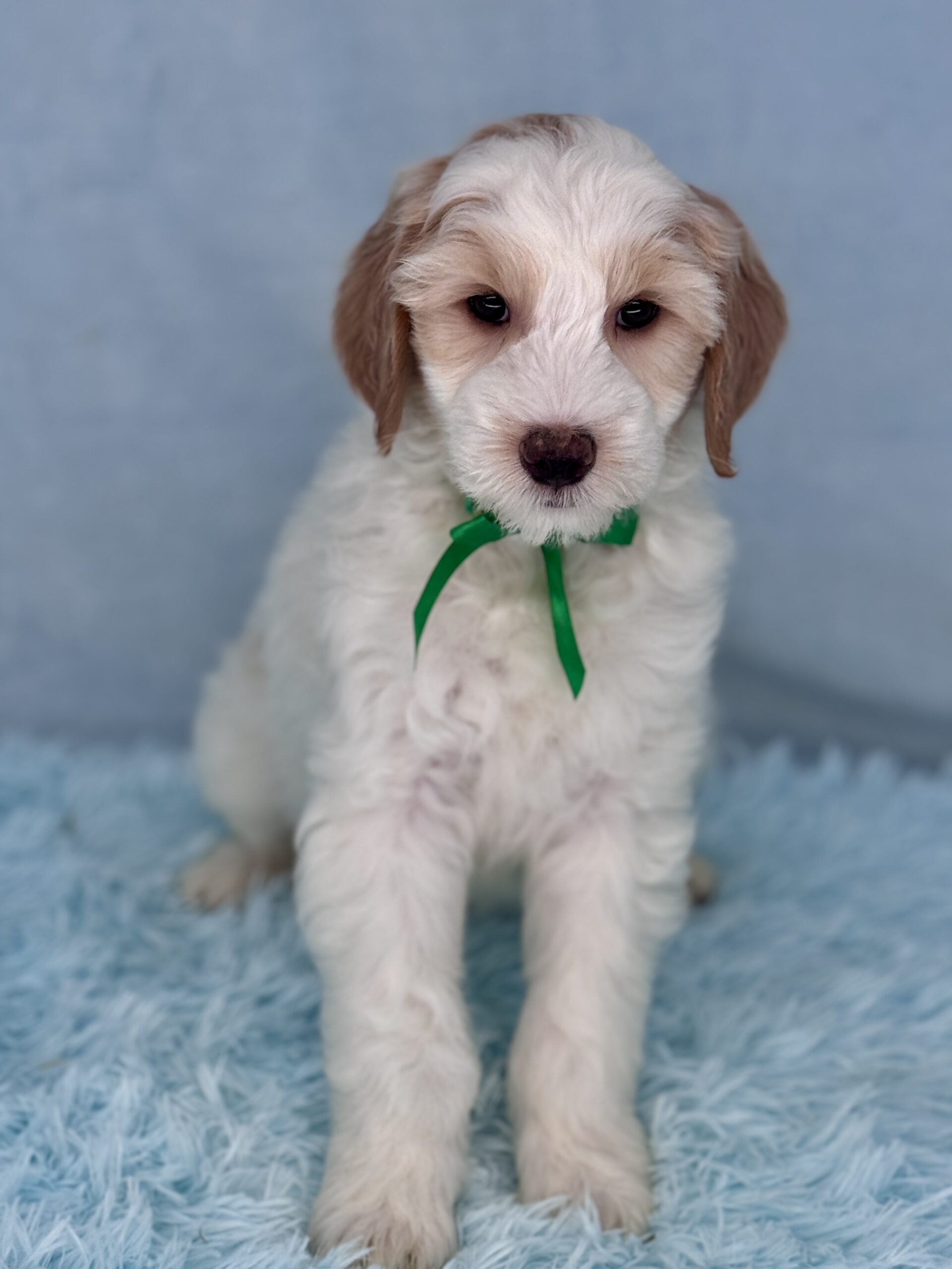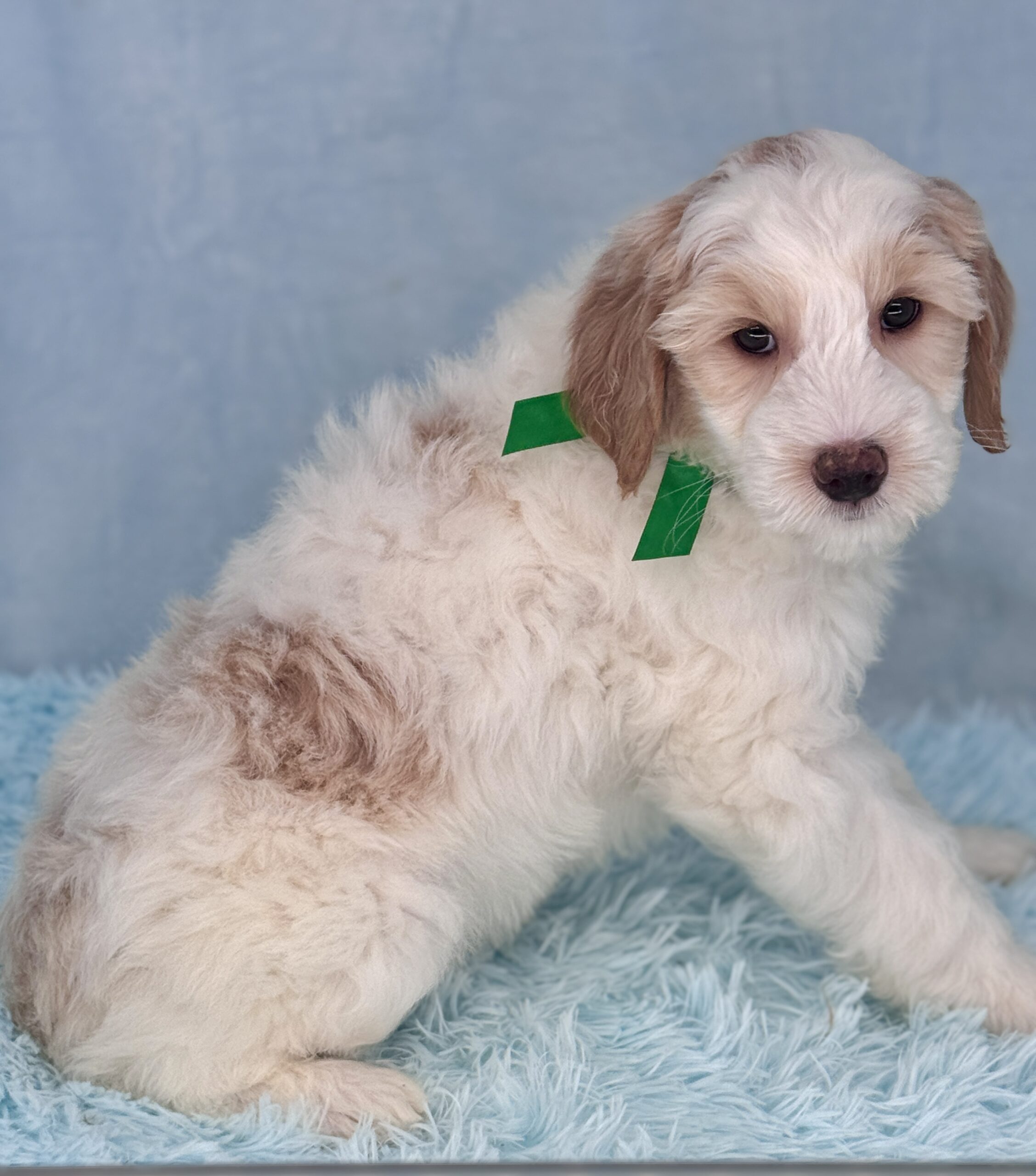 Remington is a parti color mini goldendoodle. Parti means he is white with in his case apricot or golden spots. He is a sweet mild mannered boy with an awesome no-curl coat and will mature in the medium range around 30-35 pounds. He will have full face and feet with a loose wave to his hair. It will be soft and silky and lower maintenance than a curly dog. We would need to do a genetics test for furnishings to know if he will be non-shedding but he will definitely be low shedding. As an F2b that means his mom is an f1 generation and his dad is F1b or higher. This litter of puppies will have about 39-40% golden retriever and be great dogs! This litter was born December 17th and will be 8 weeks old February 11th.