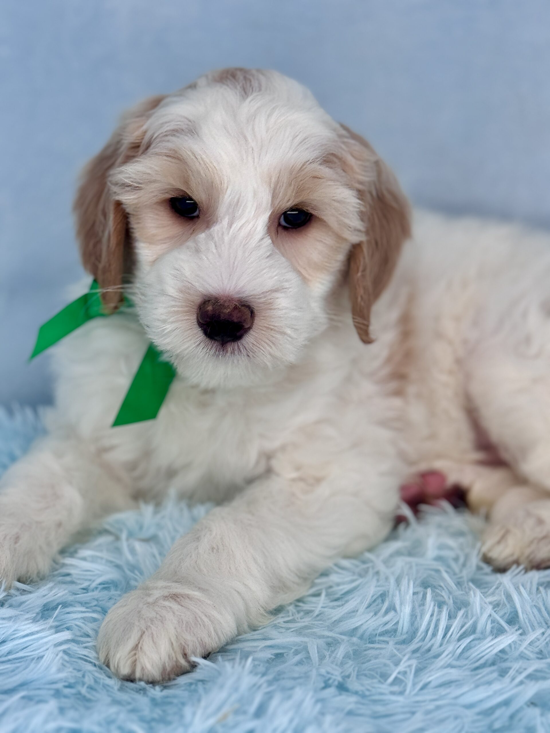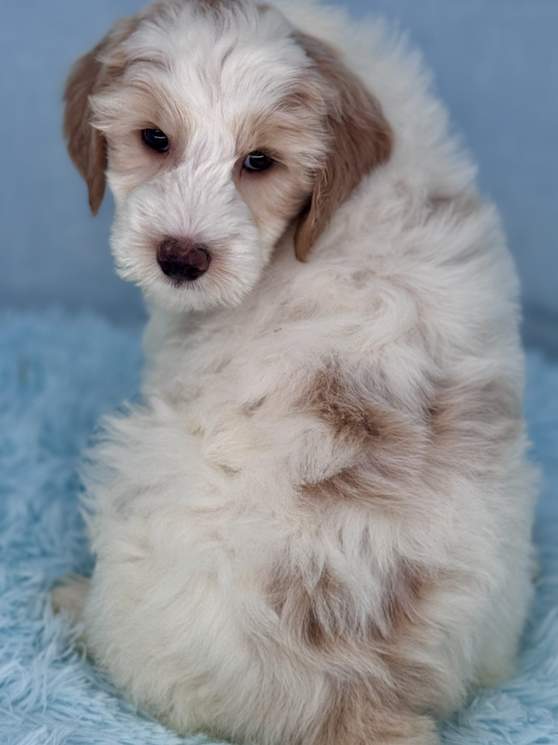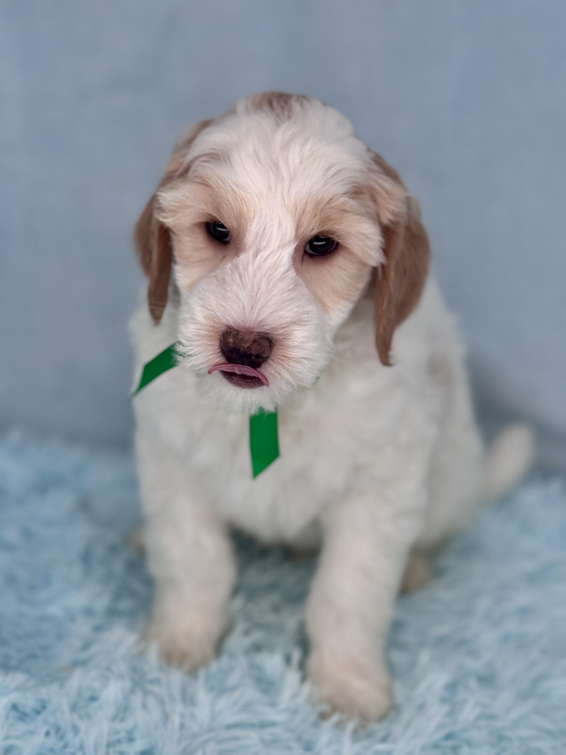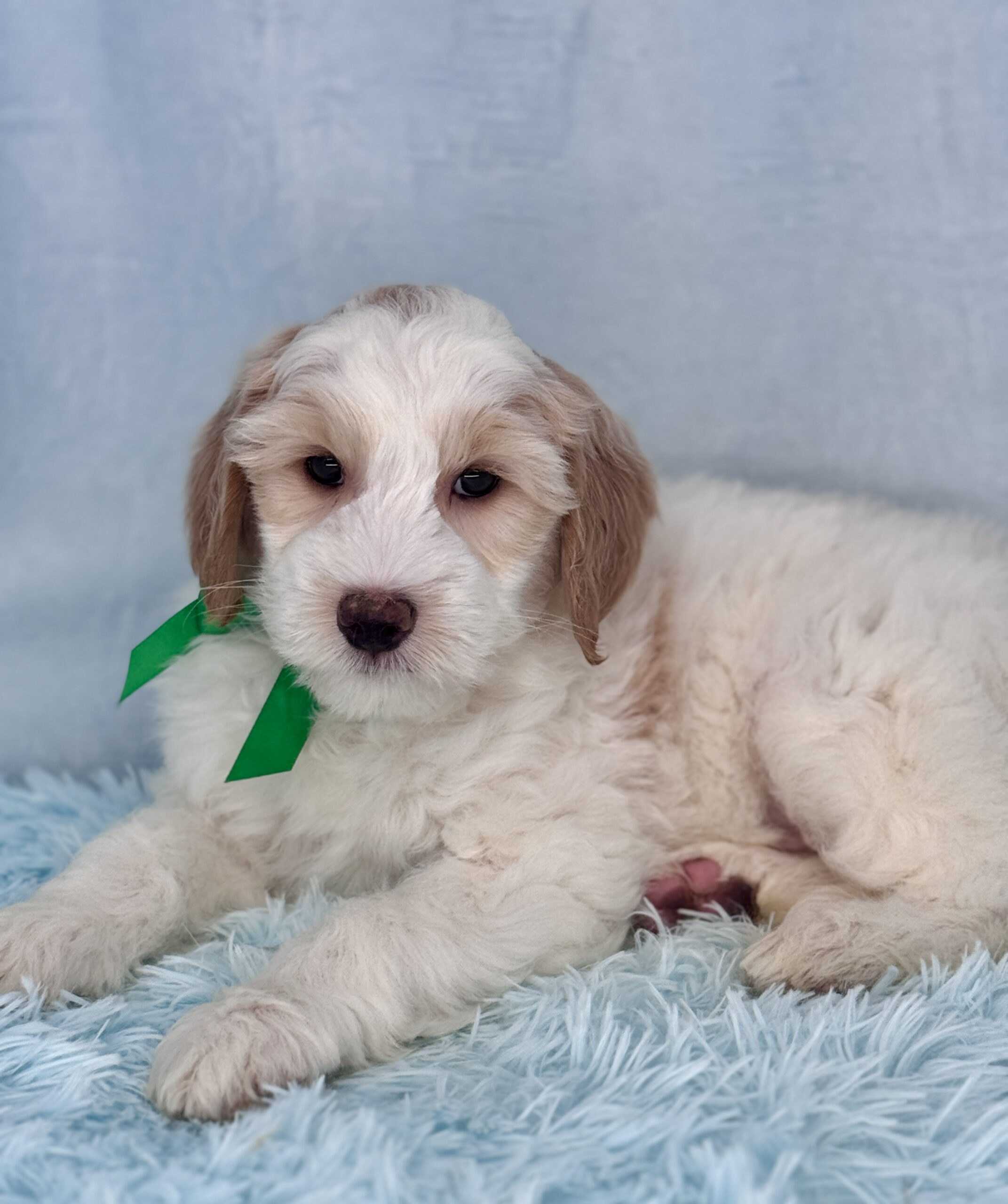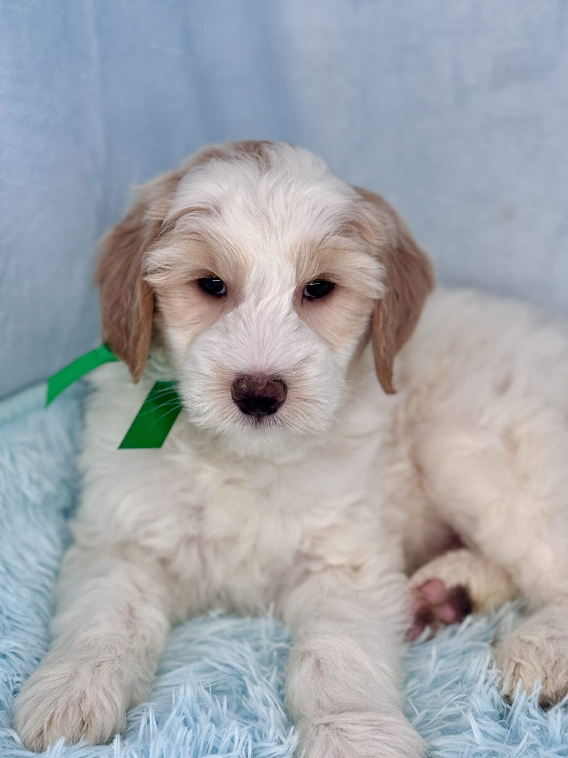 Remington is a parti color mini goldendoodle. Parti means he is white with in his case apricot or golden spots. He is a sweet mild mannered boy with an awesome no-curl coat and will mature in the medium range around 30-35 pounds. He will have full face and feet with a loose wave to his hair. It will be soft and silky and lower maintenance than a curly dog. We would need to do a genetics test for furnishings to know if he will be non-shedding but he will definitely be low shedding. As an F2b that means his mom is an f1 generation and his dad is F1b or higher. This litter of puppies will have about 39-40% golden retriever and be great dogs! This litter was born December 17th and will be 8 weeks old February 11th.