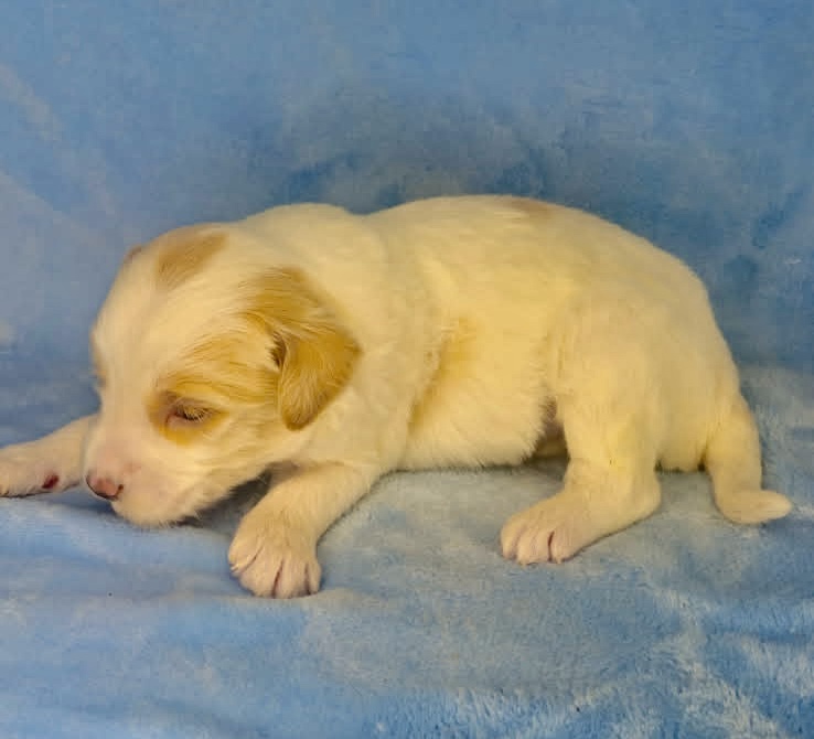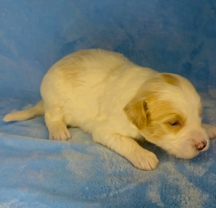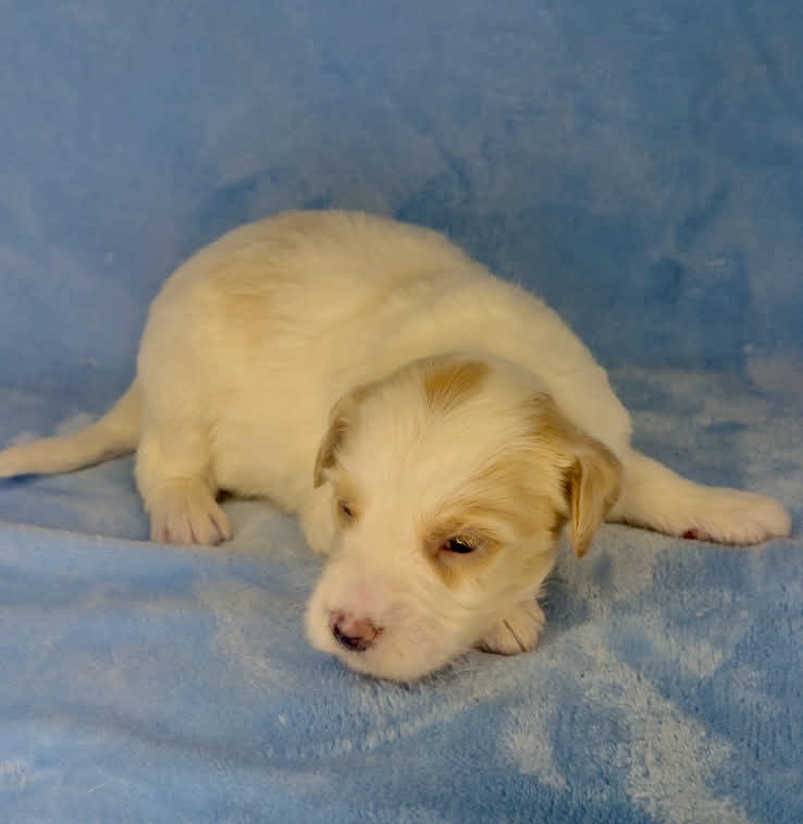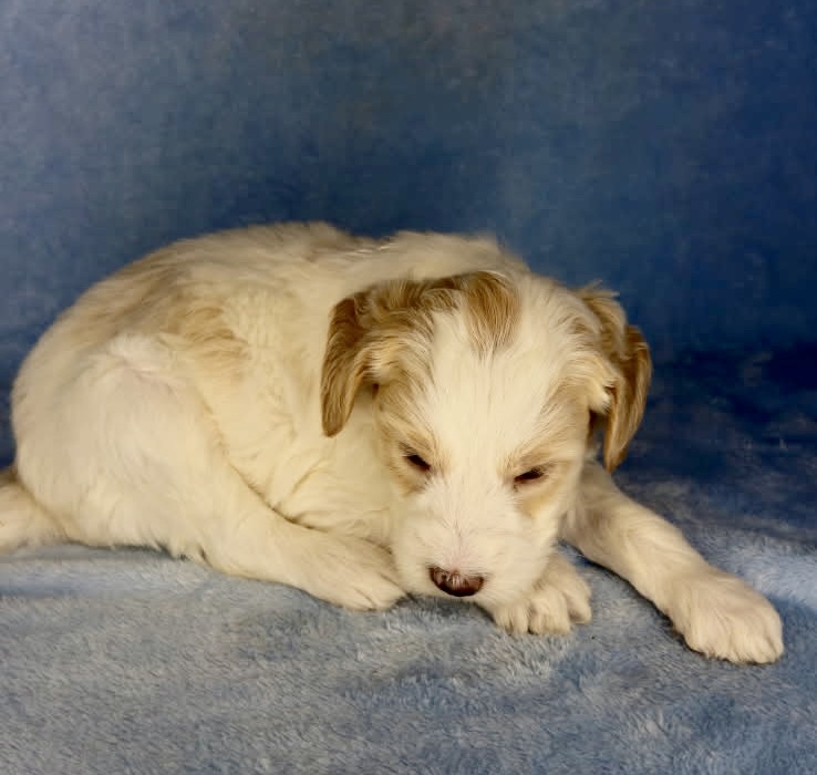 Remington is a parti color mini goldendoodle. Parti means he is white with in his case apricot or golden spots. He looks to have my favorite no-curl coat and will mature around 25-30 pounds. He will have full face and feet with a loose wave to his hair. It will be soft and silky and lower maintenance than a curly dog. We would need to do a genetics test for furnishings to know if he will be non-shedding but he will definitely be low shedding. As an F2b that means his mom is an f1 generation and his dad is F1b or higher. This litter of puppies will have about 39-40% golden retriever and be great dogs! This litter was born December 17th and will be 8 weeks old February 11th.