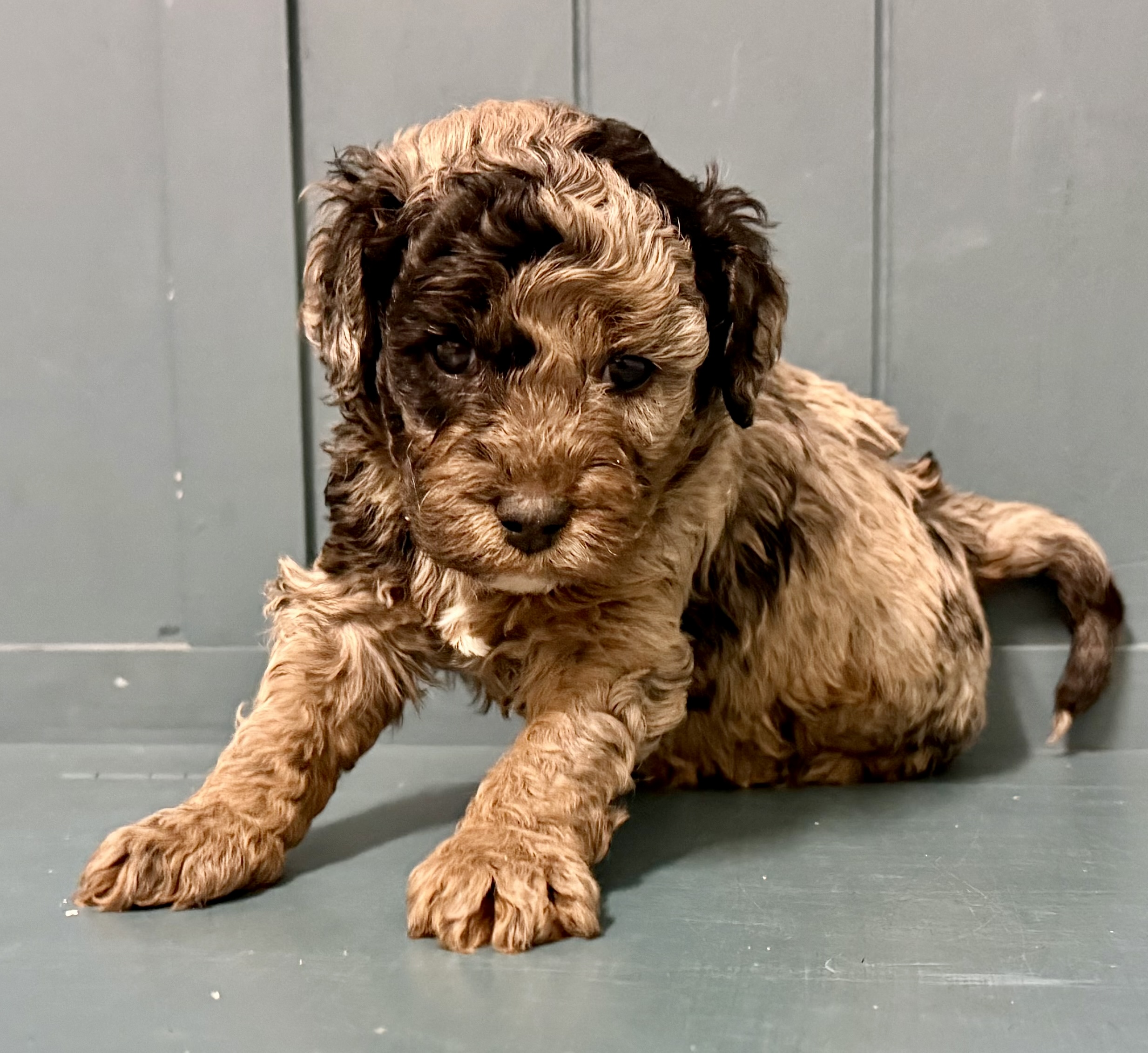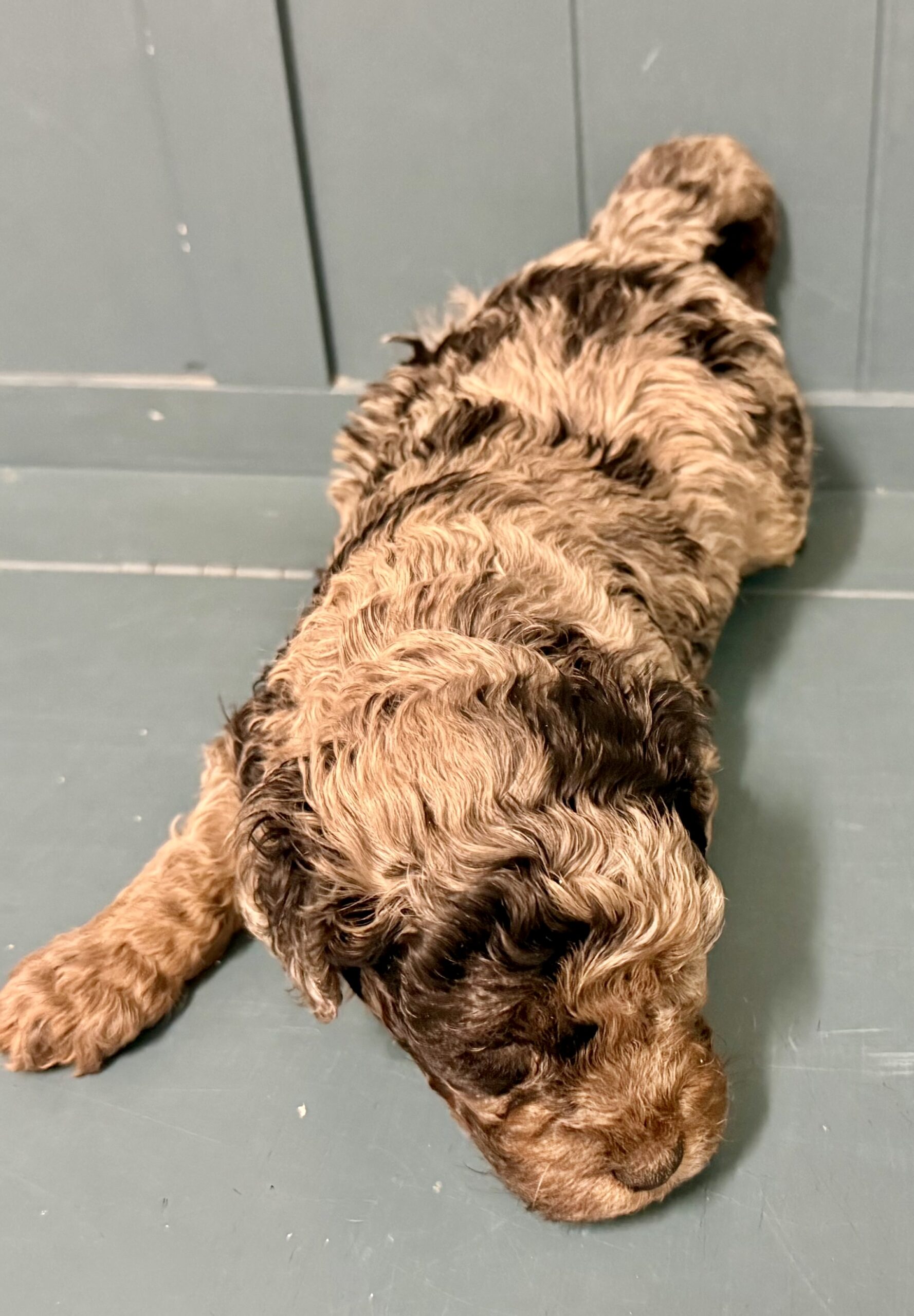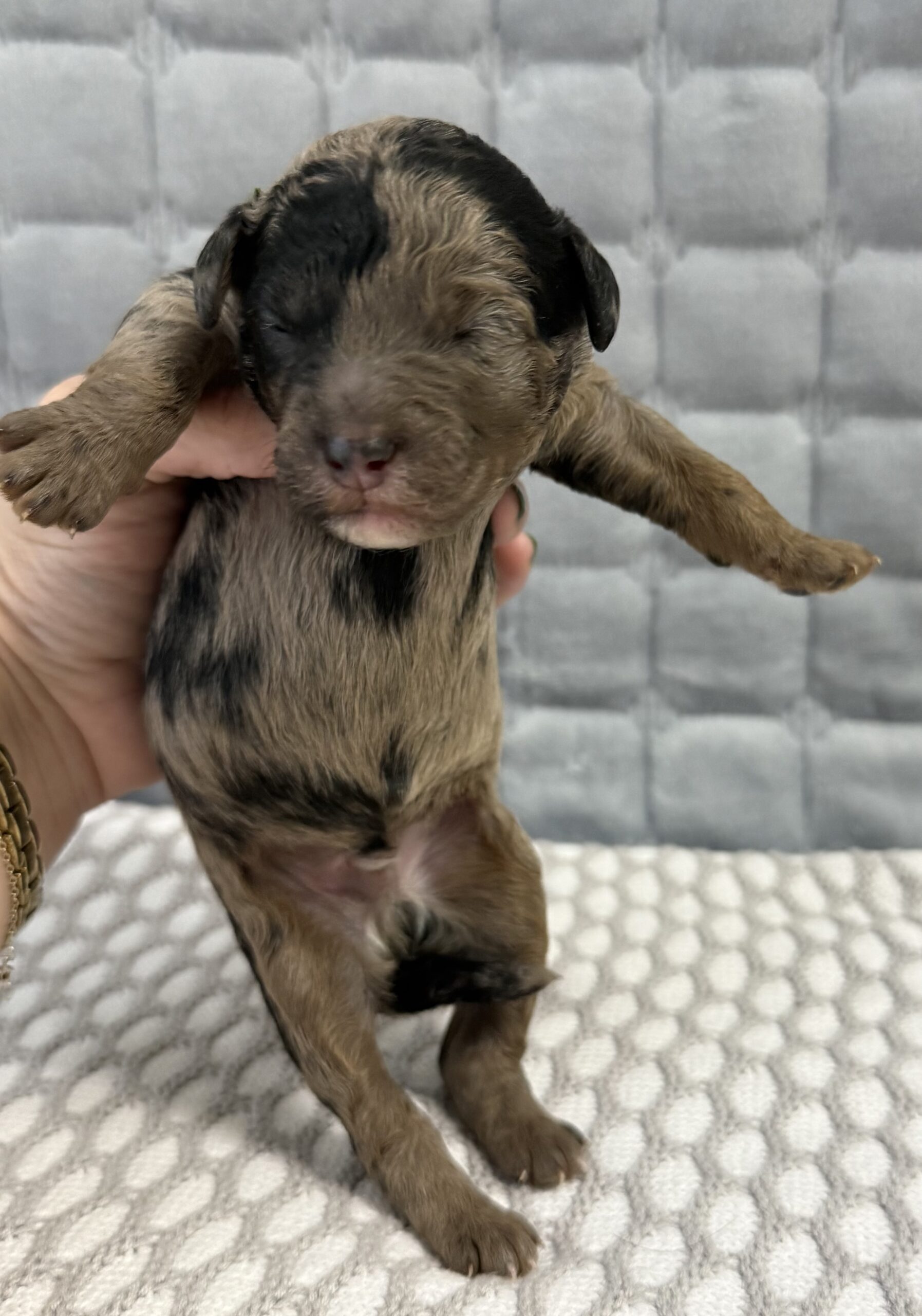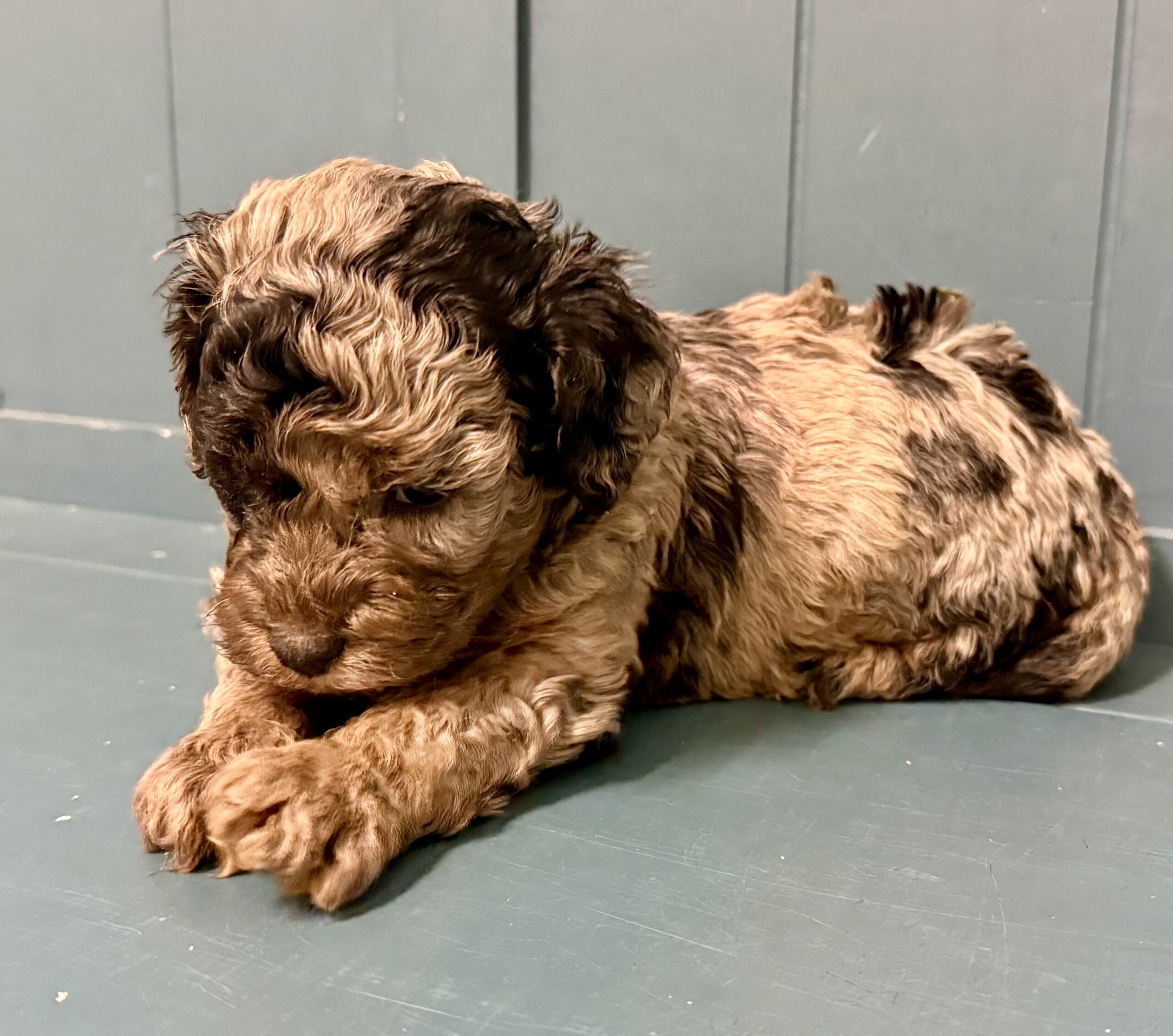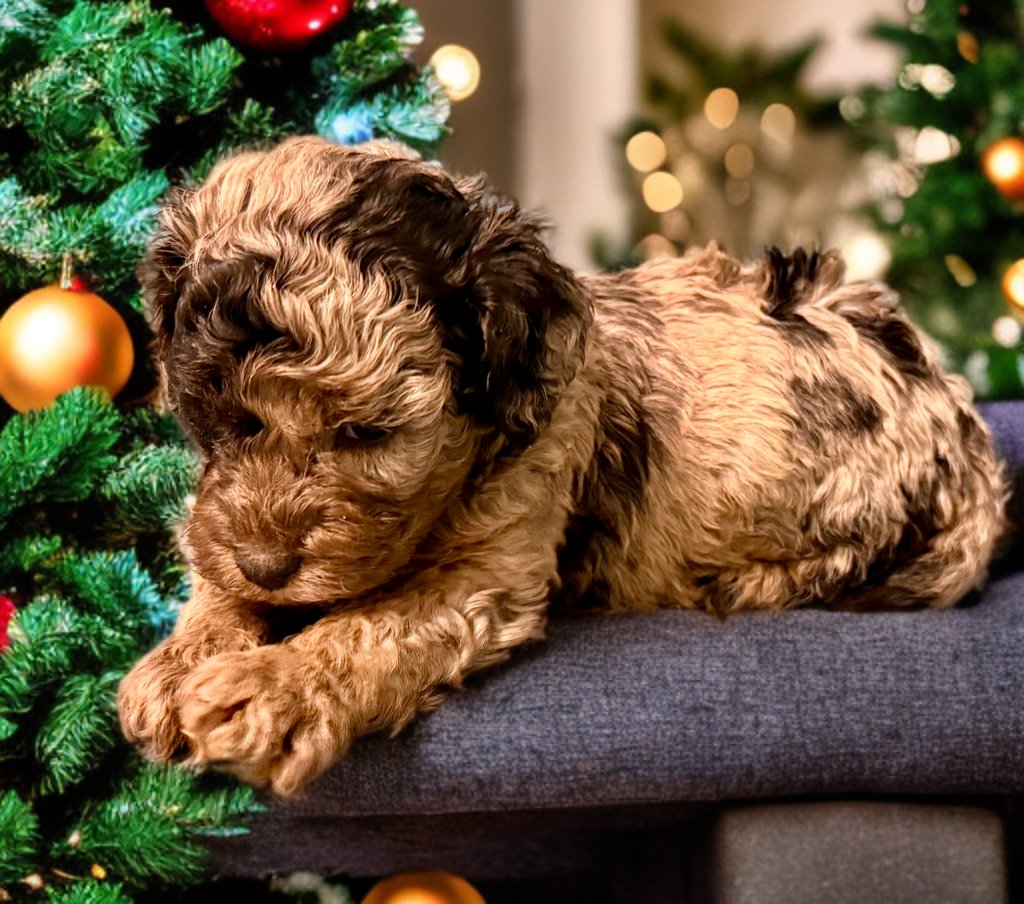 Rocky is from our Paw Patrol litter. He is a beautiful blue merle color with a wavy coat. He does look brown now but he will become more silvery blue with black spots. All of the puppies in this litter will be non-shedding. This litter was born November 18th and will be 8 weeks old January 13th. We will have a better idea as they grow but we expect them to be in the 20-25 range based on the parents.