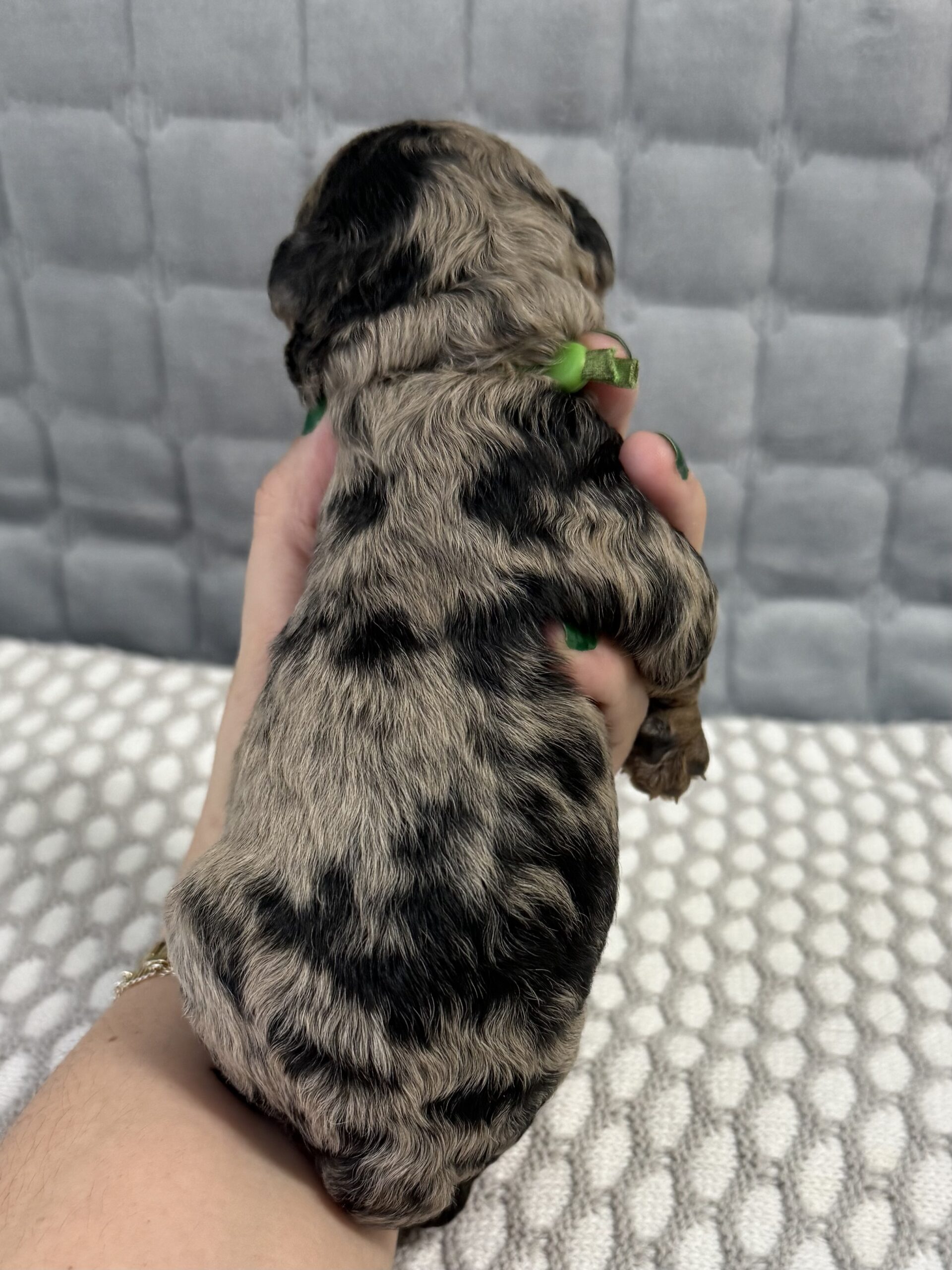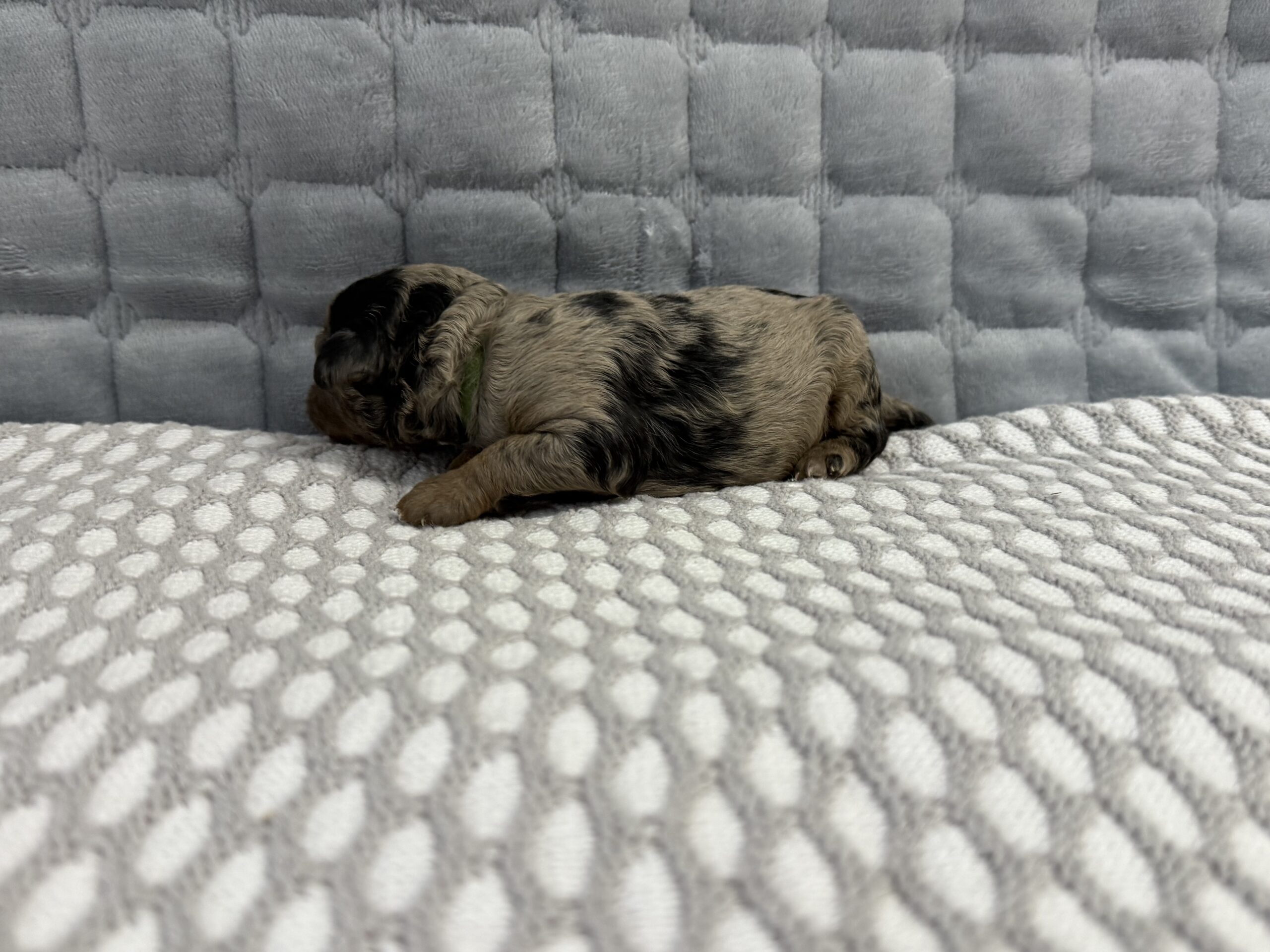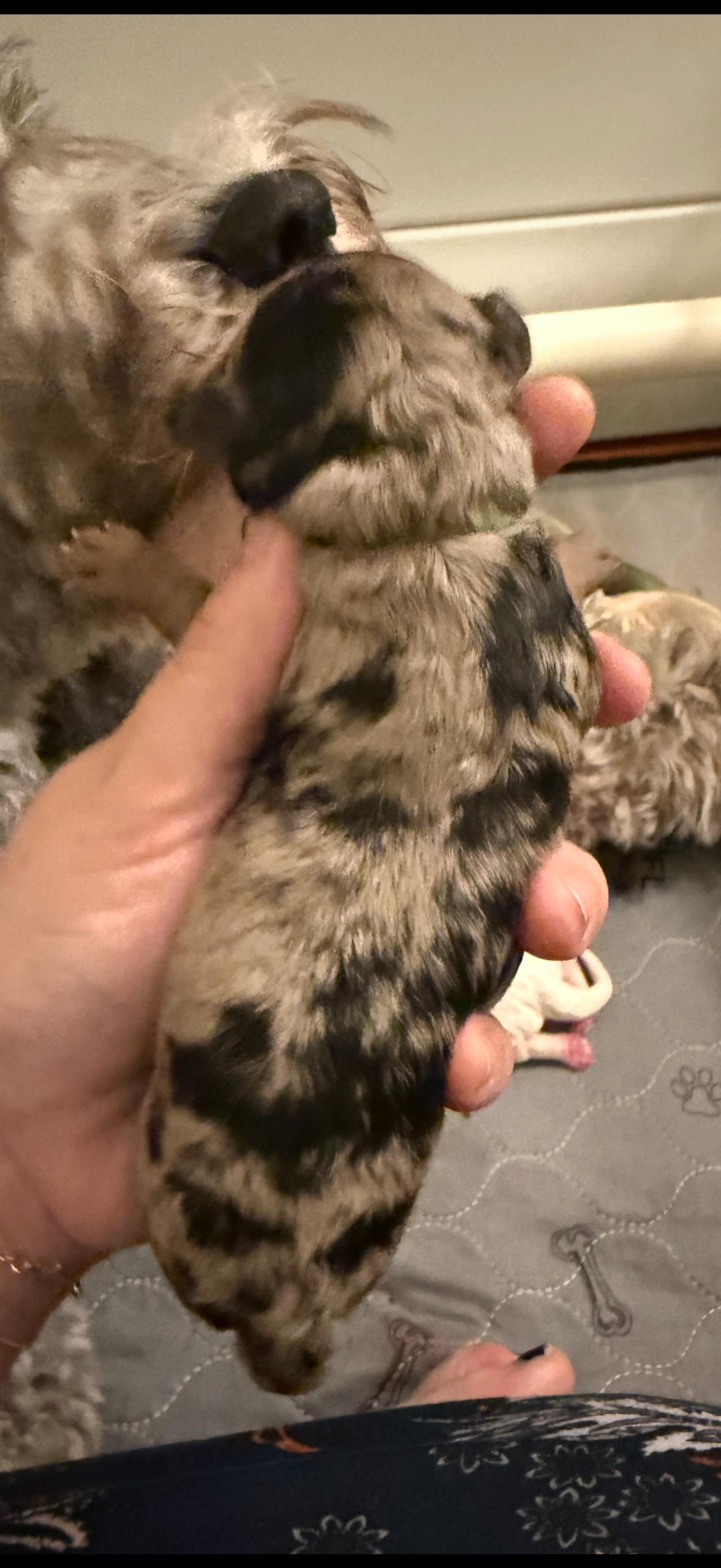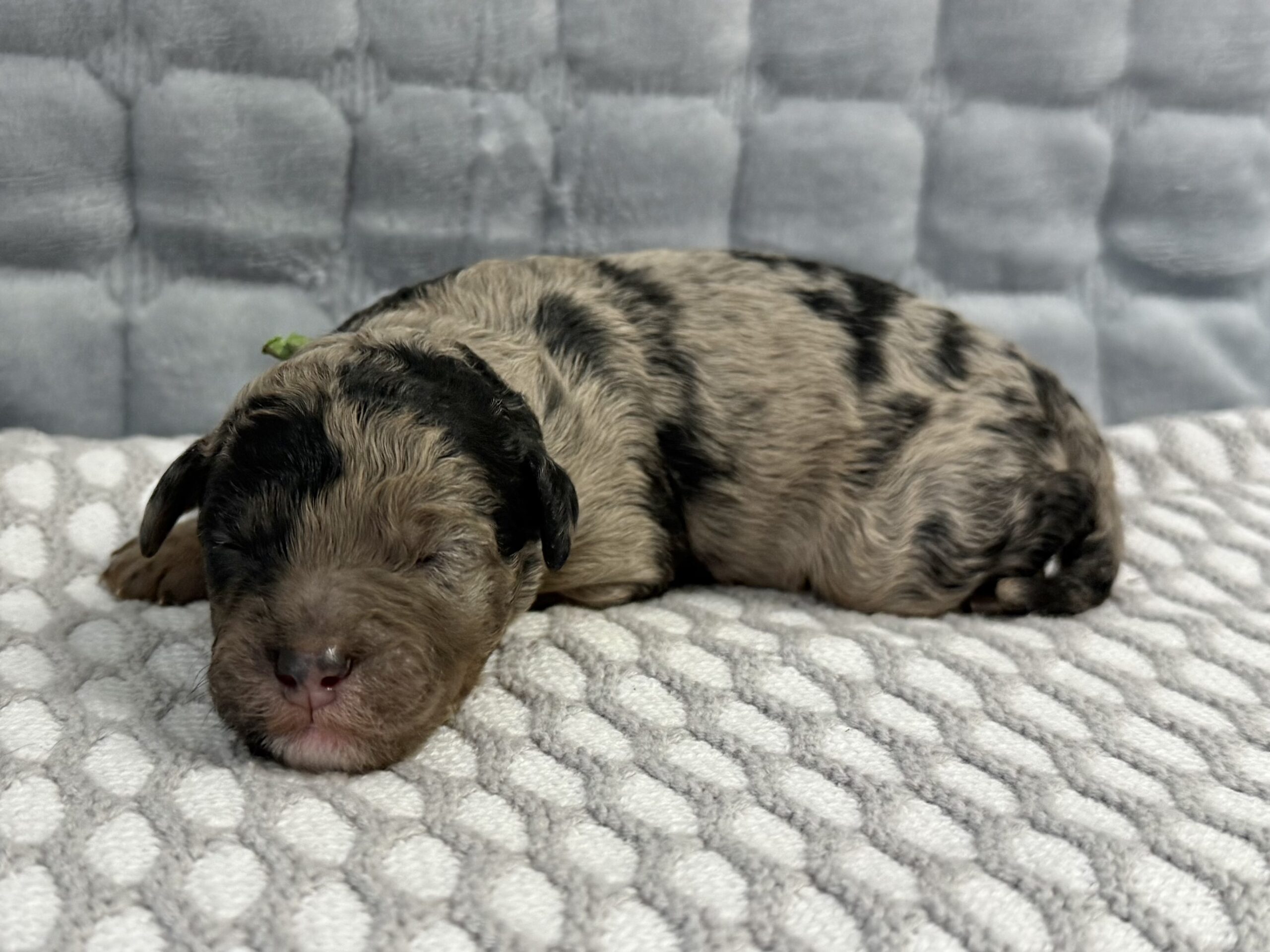 Rocky is from our Paw Patrol litter. He is a beautiful blue merle color with a wavy coat. He does look brown now but he will become more silvery blue with black spots. All of the puppies in this litter will be non-shedding. This litter was born November 18th and will be 8 weeks old January 13th. We will have a better idea as they grow but we expect them to be in the 20-25 range based on the parents.