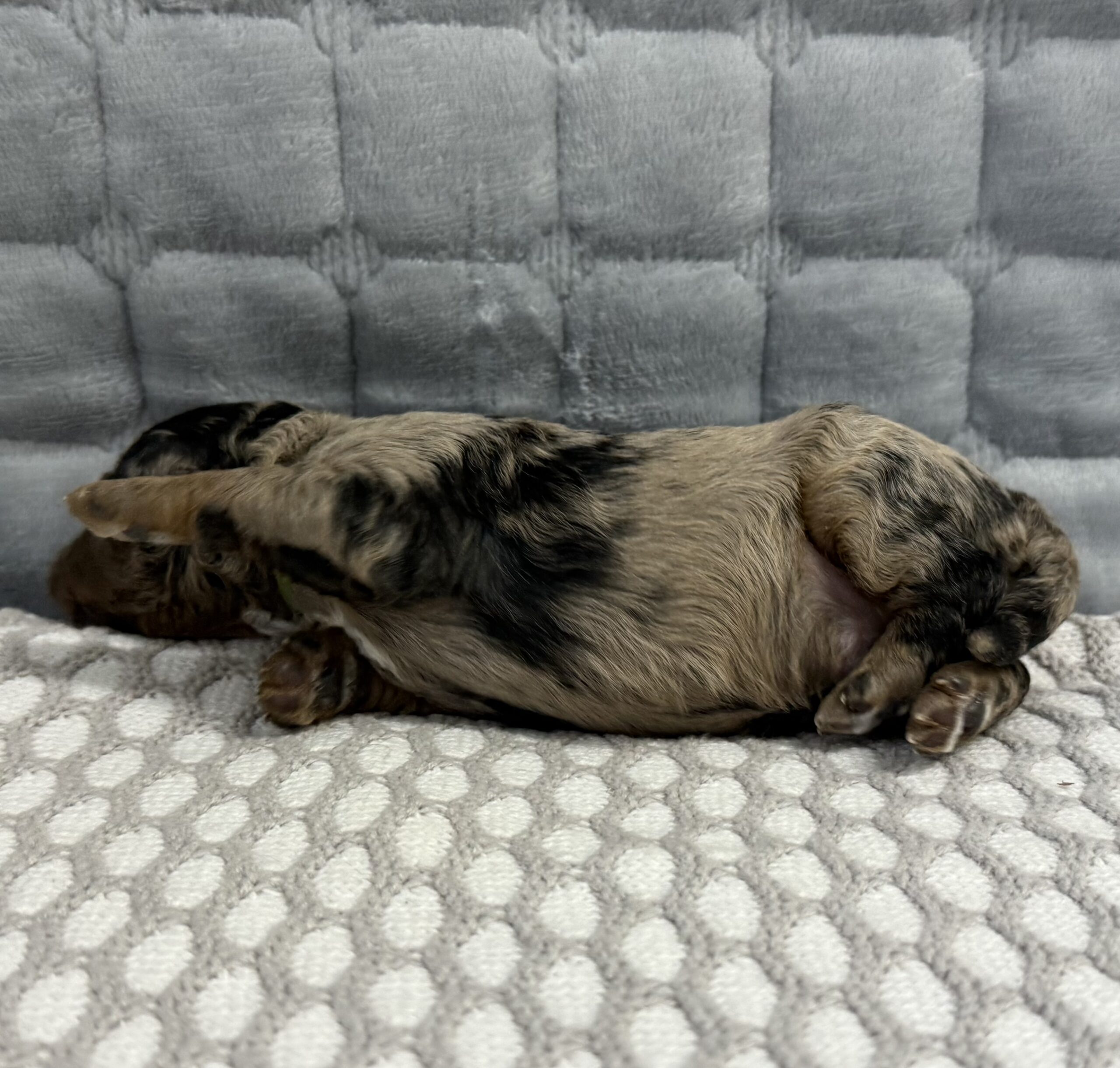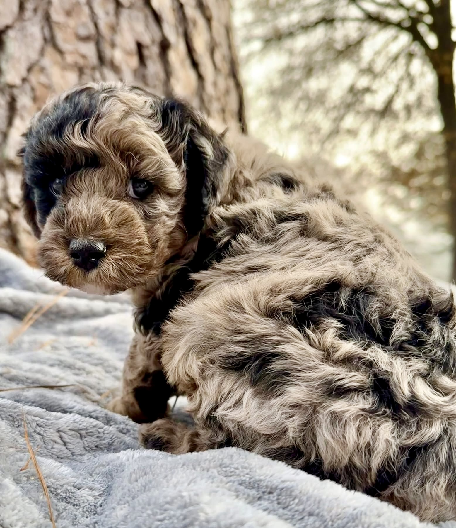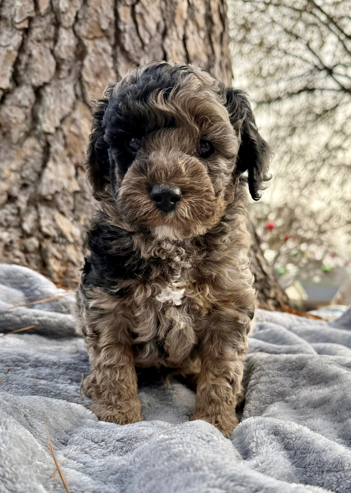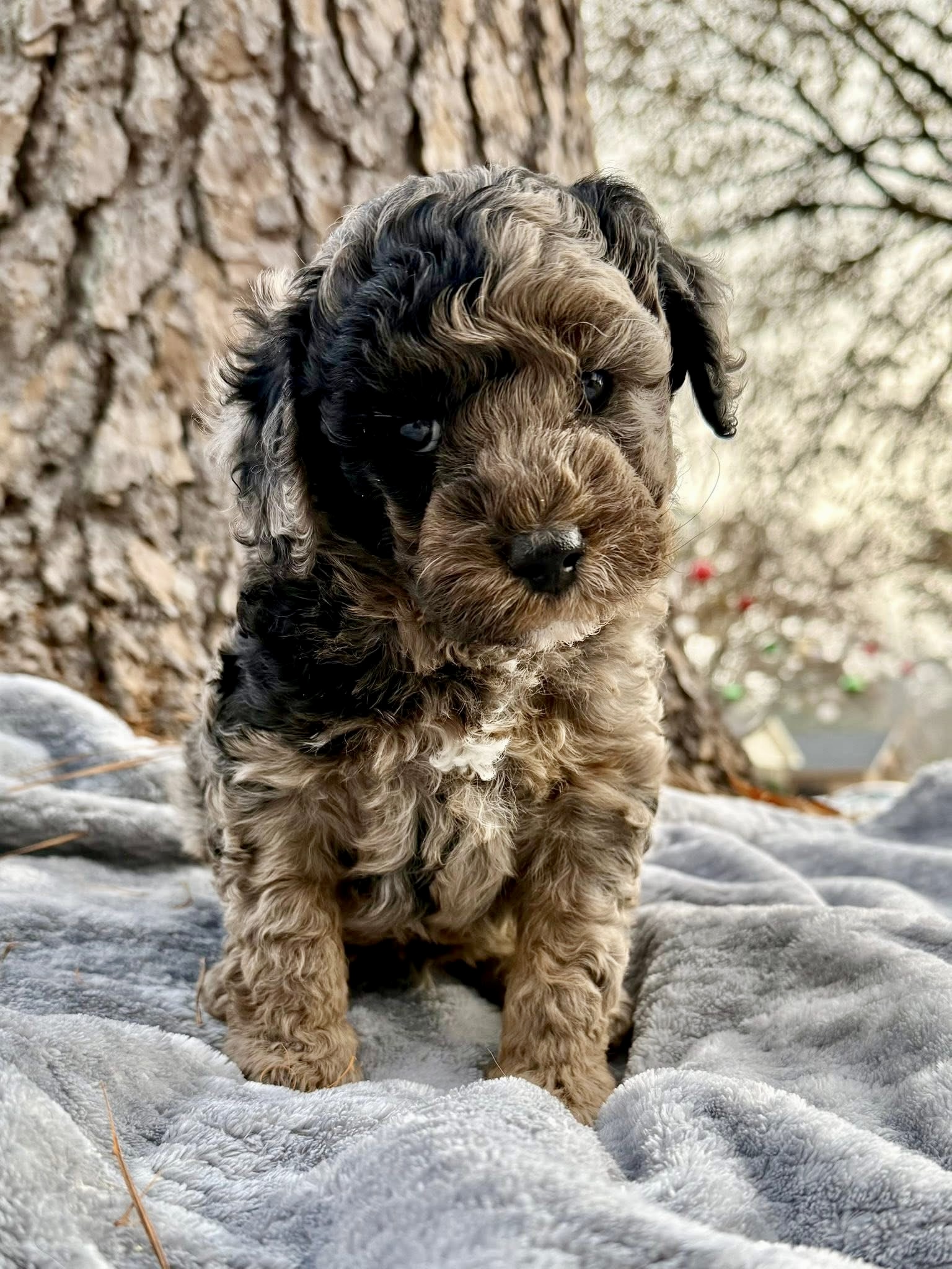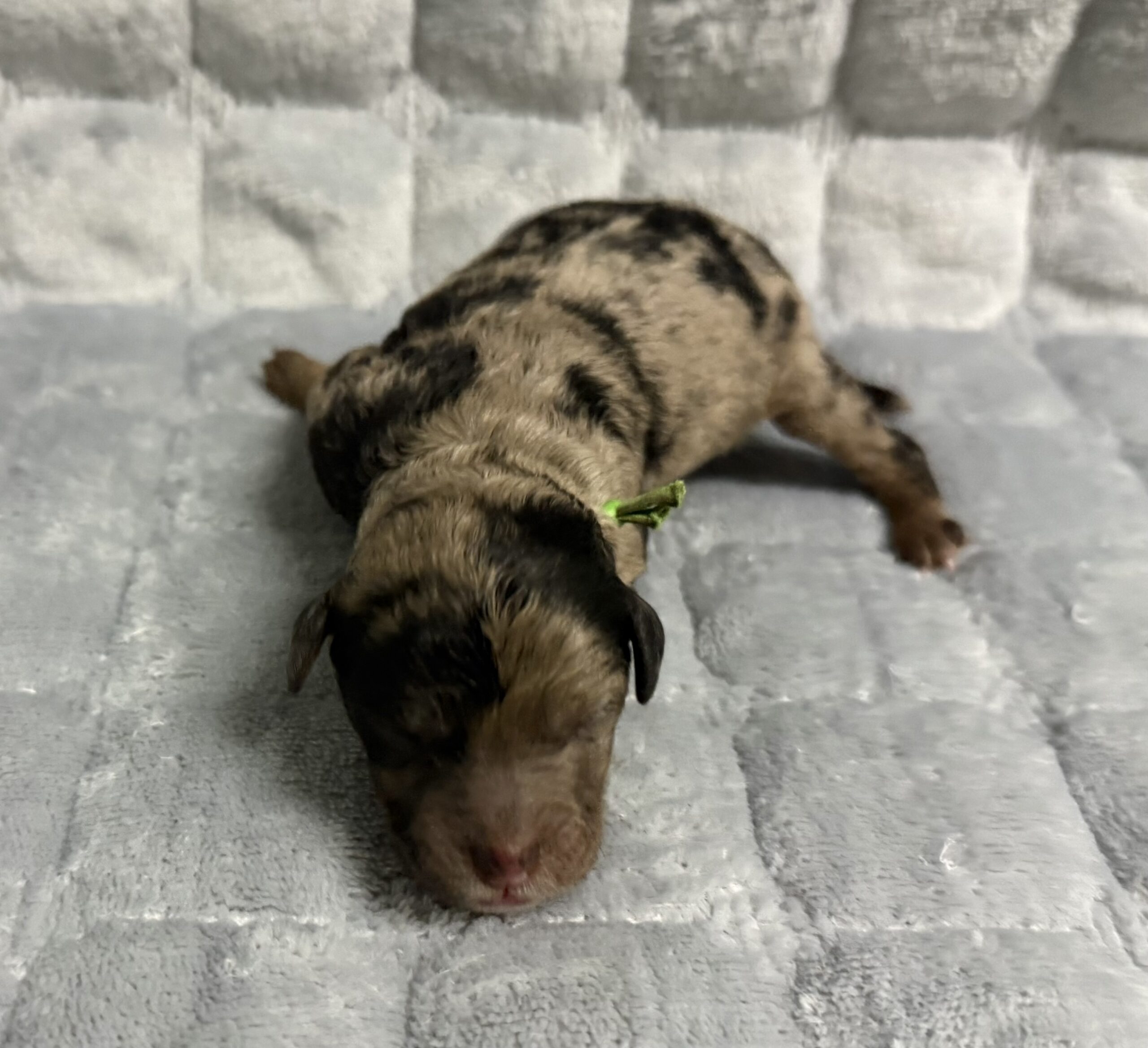 Rocky is from our Paw Patrol litter. He is a beautiful blue merle color with a wavy coat. He does look brown now but he will become more silvery blue with black spots. All of the puppies in this litter will be non-shedding. This litter was born November 18th and will be 8 weeks old January 13th. We will have a better idea as they grow but we expect them to be in the 20-25 range based on the parents.