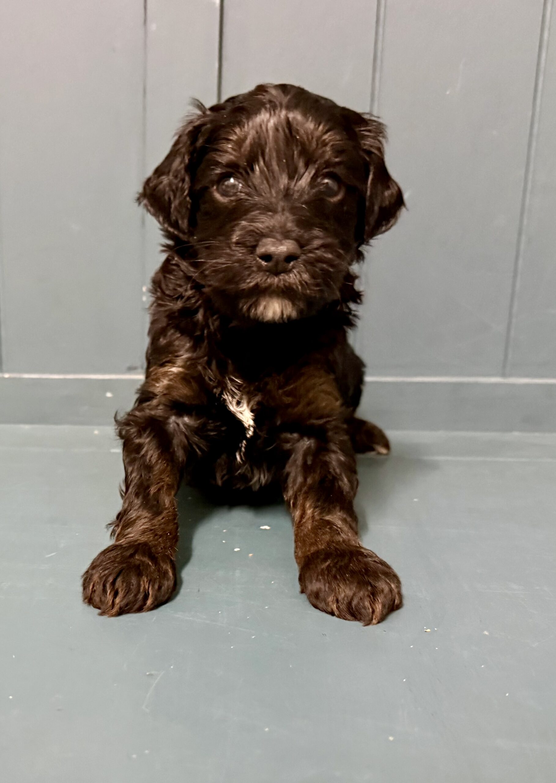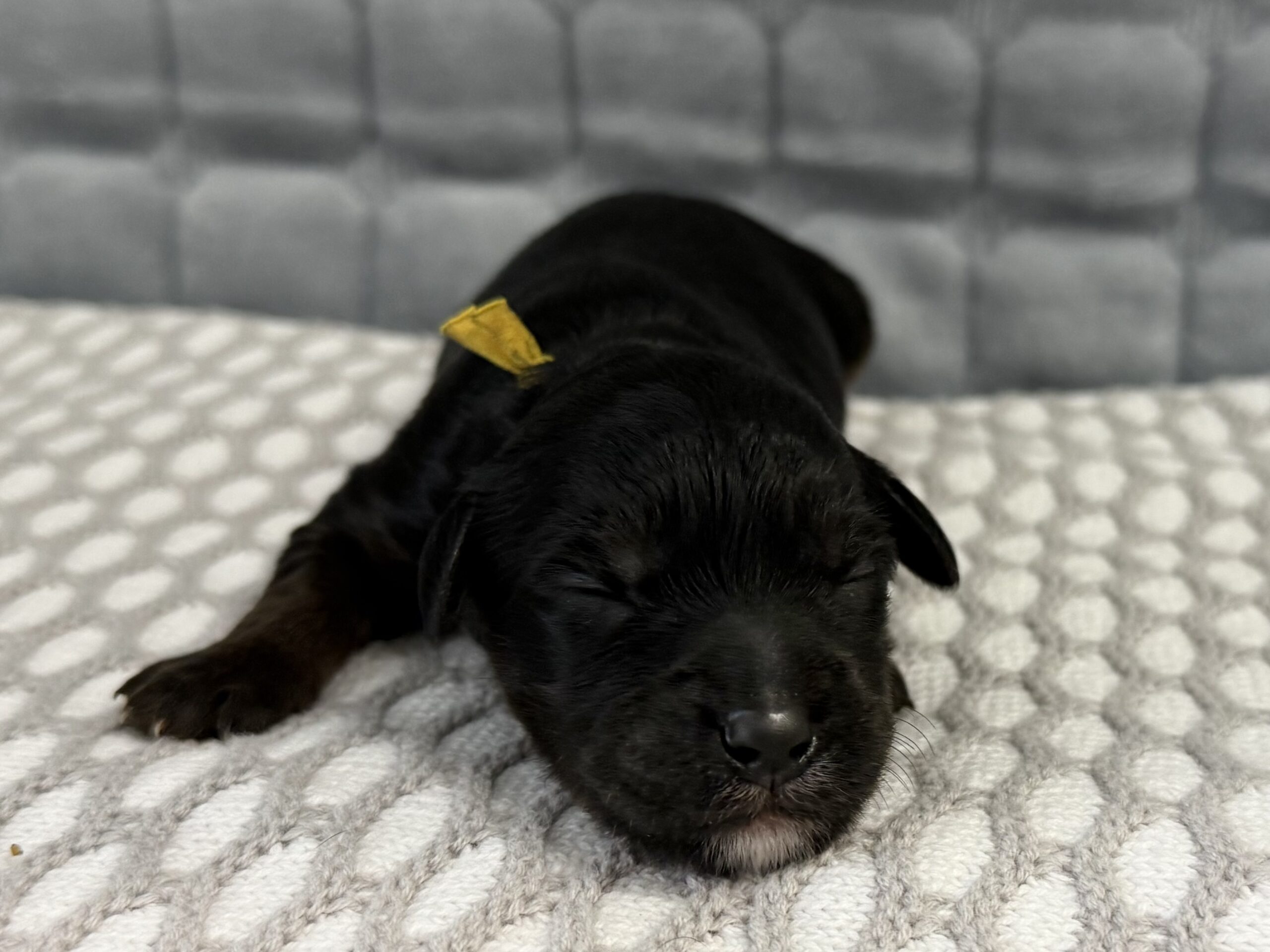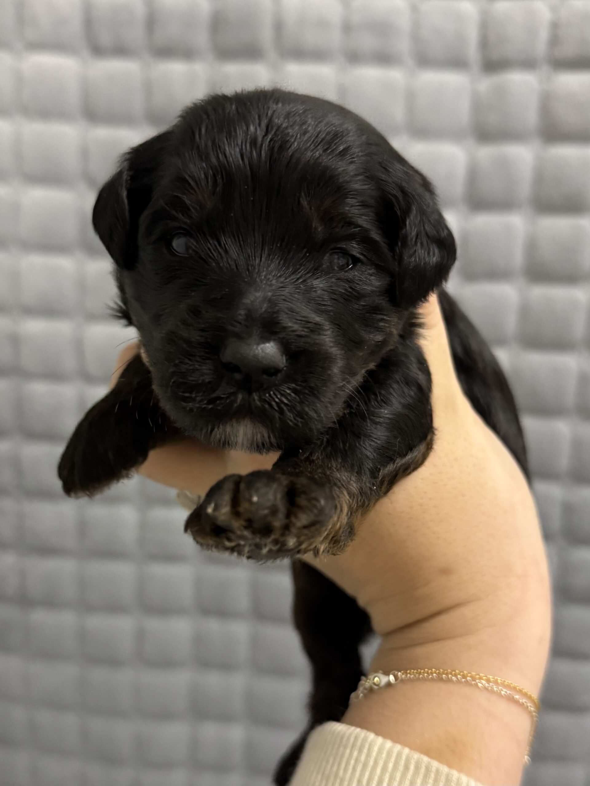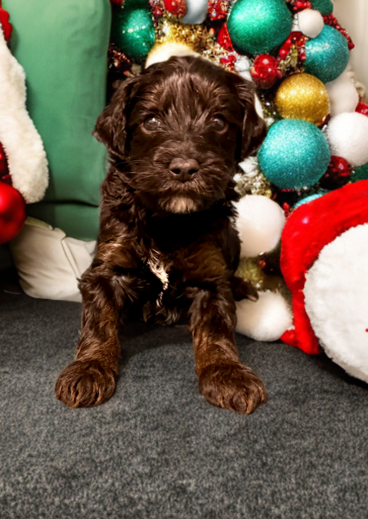 Rubble is from our Paw Patrol litter. I see faint brown markings on his legs and eye brows so I think those will become more obvious and that he is a black phantom color. He looks to have a wavy coat but we know it will be non-shedding. This litter was born November 18th and will be 8 weeks old January 13th. We will have a better idea as they grow but we expect them to be in the 20-25 range based on the parents.